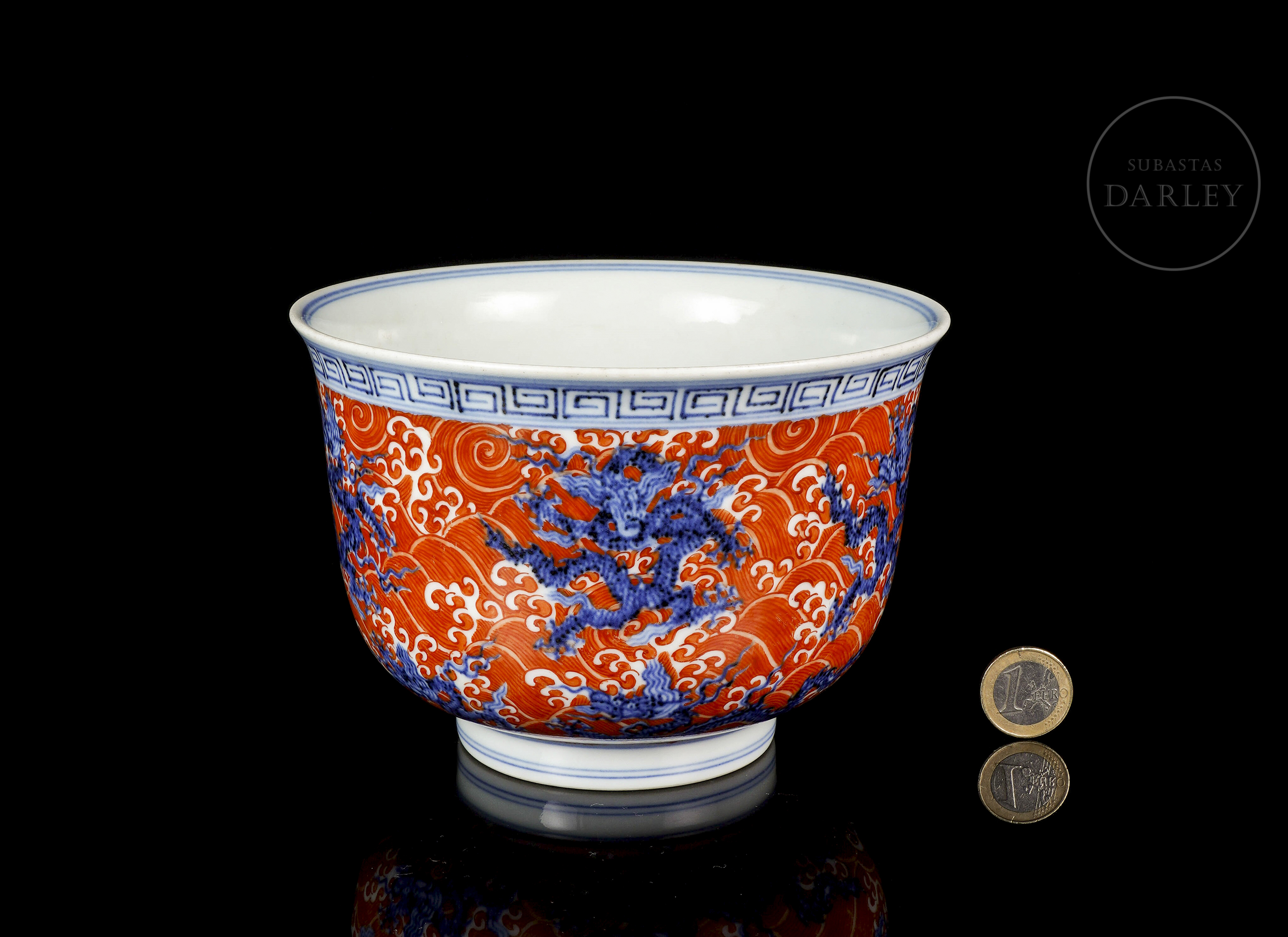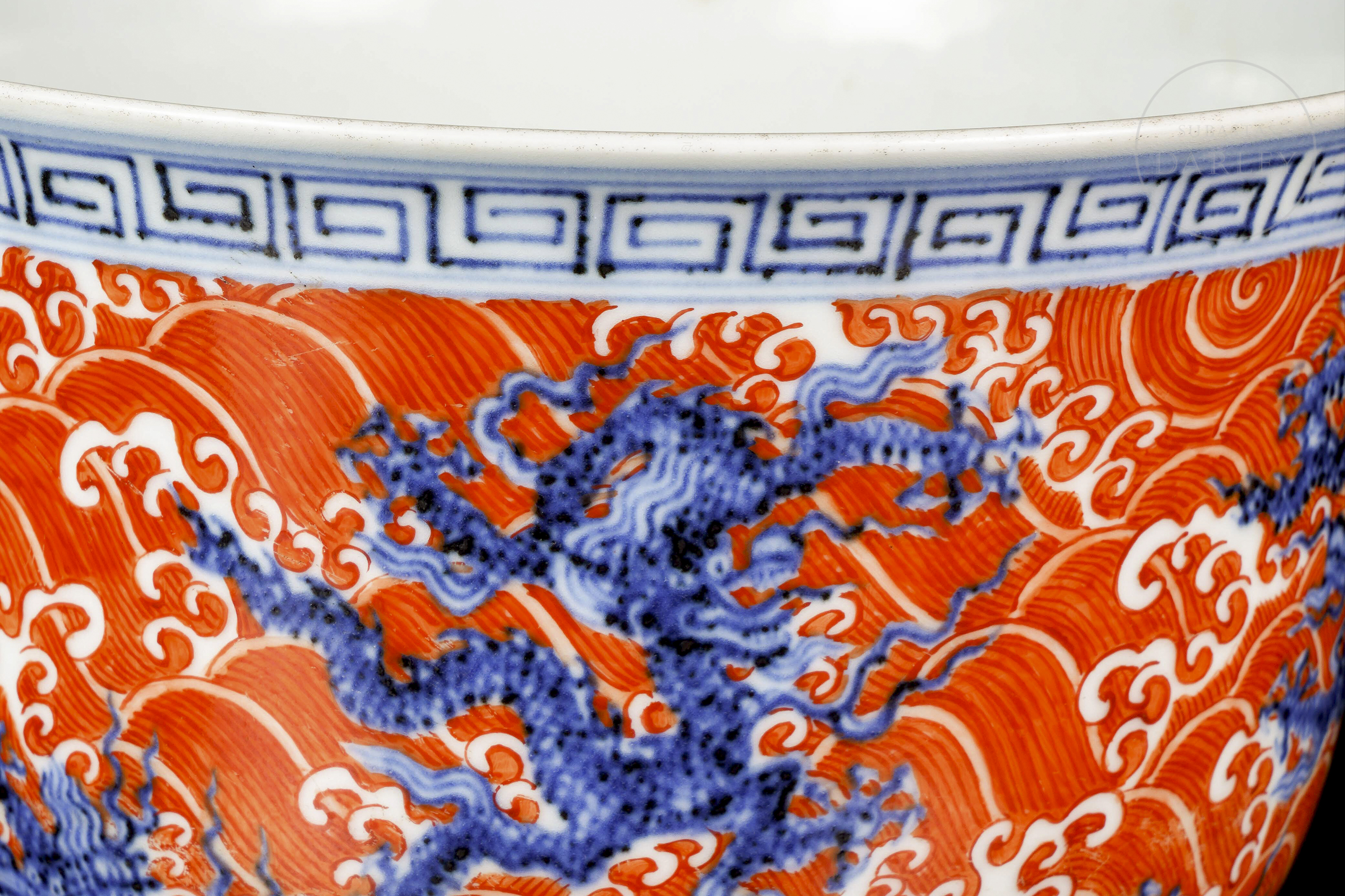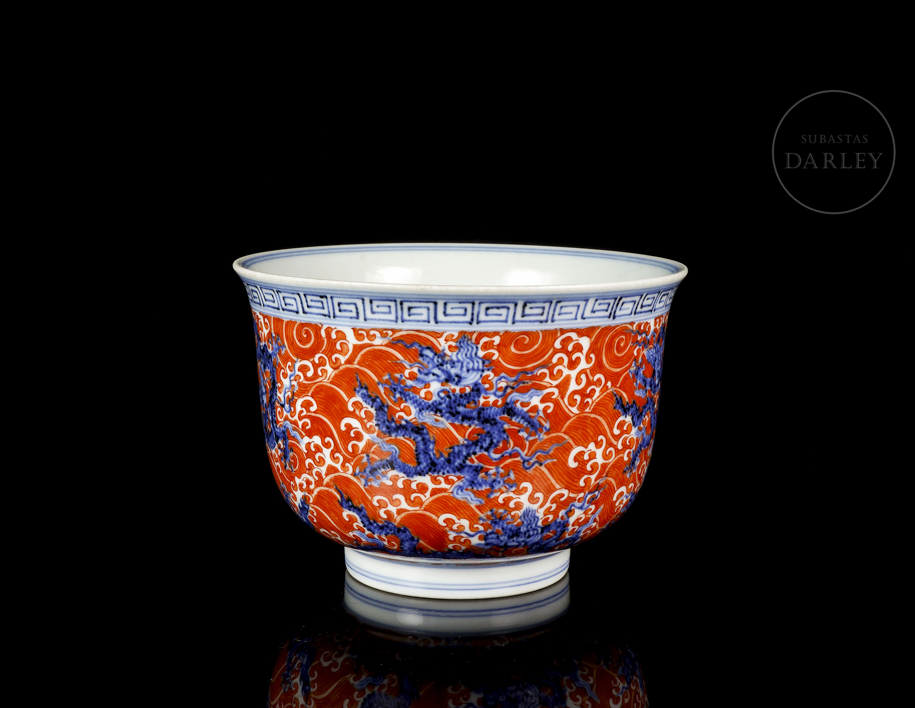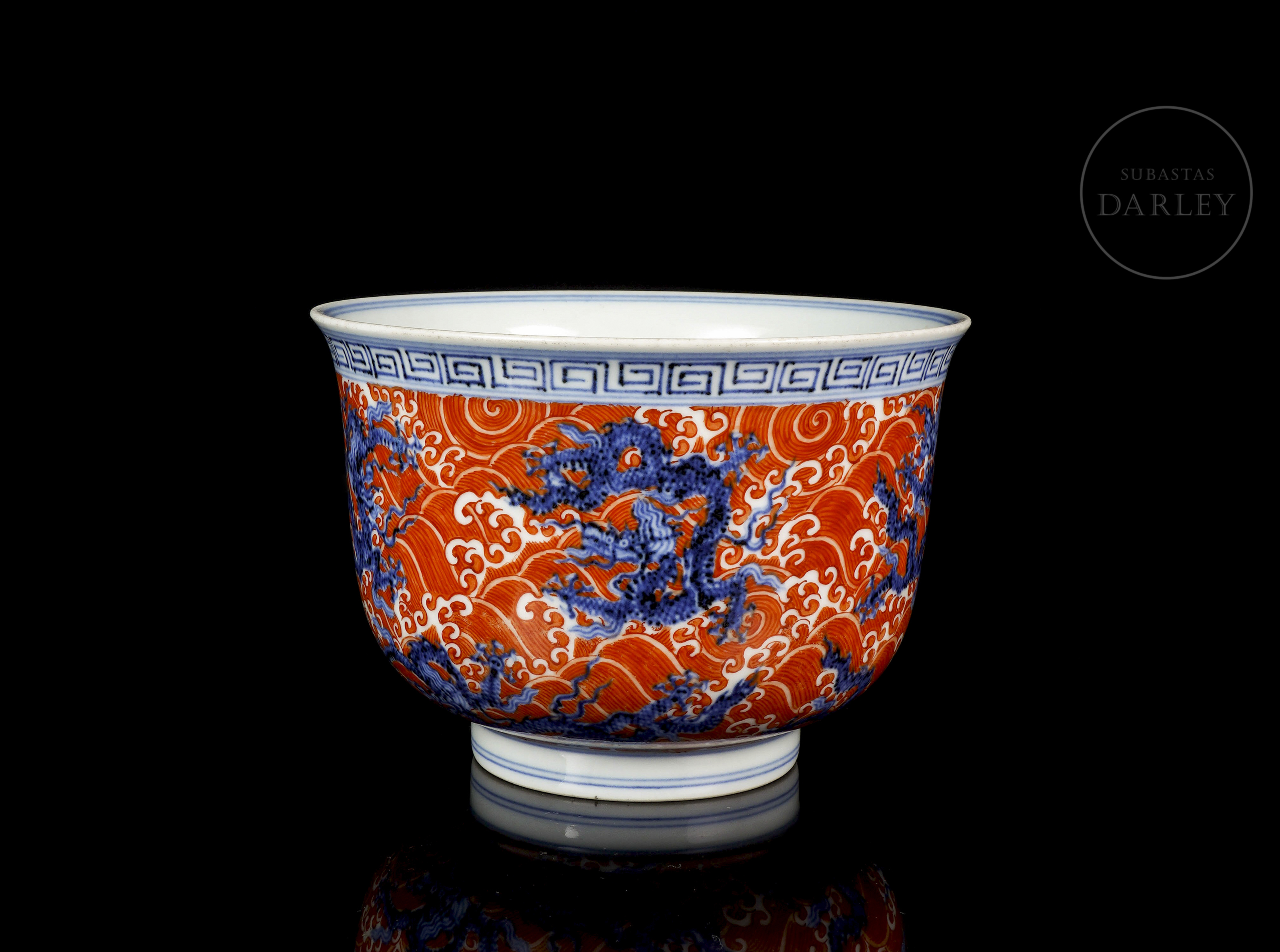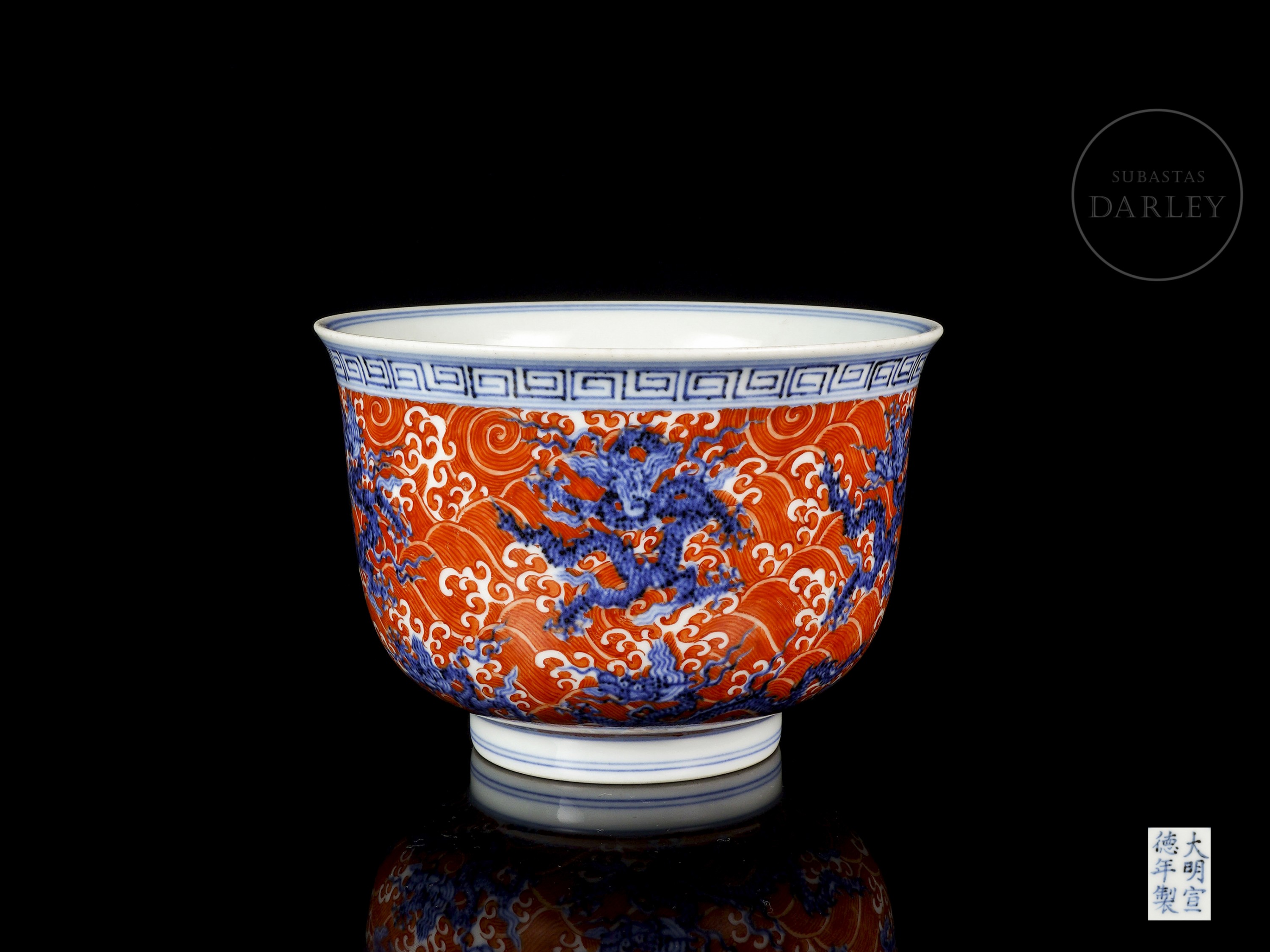 Molded porcelain bowl with a short circular foot, deep body, and curved profile that widens toward the rim. Both the exterior and the central medallion on the interior are decorated with a scene of five-clawed dragons, rendered in underglaze blue, set against a background of ocean waves painted in red iron enamel. The upper rim features a blue fretwork pattern. On the base, inside a double circle, there is a six-character seal “大明宣德年制” in underglaze blue.