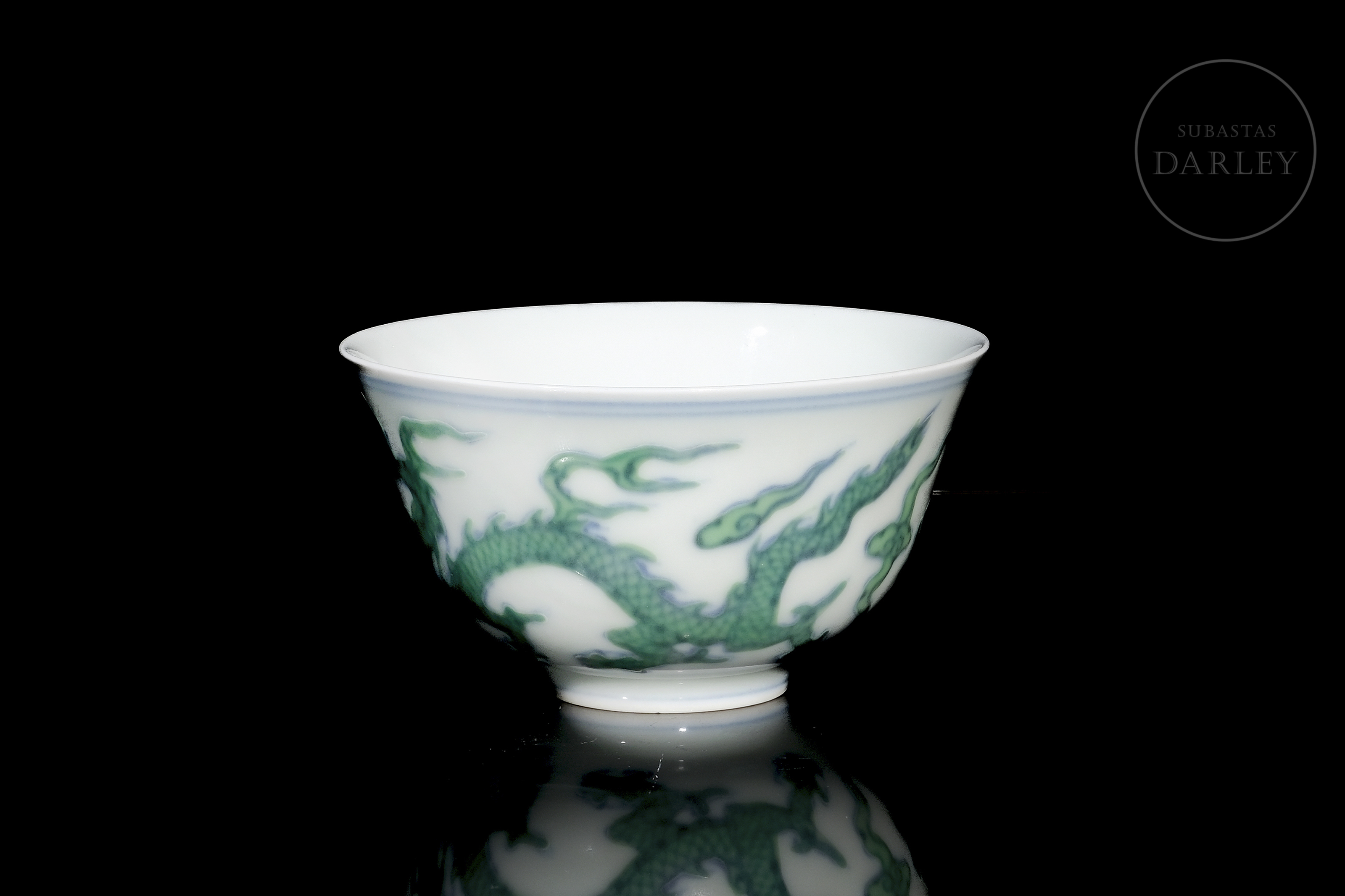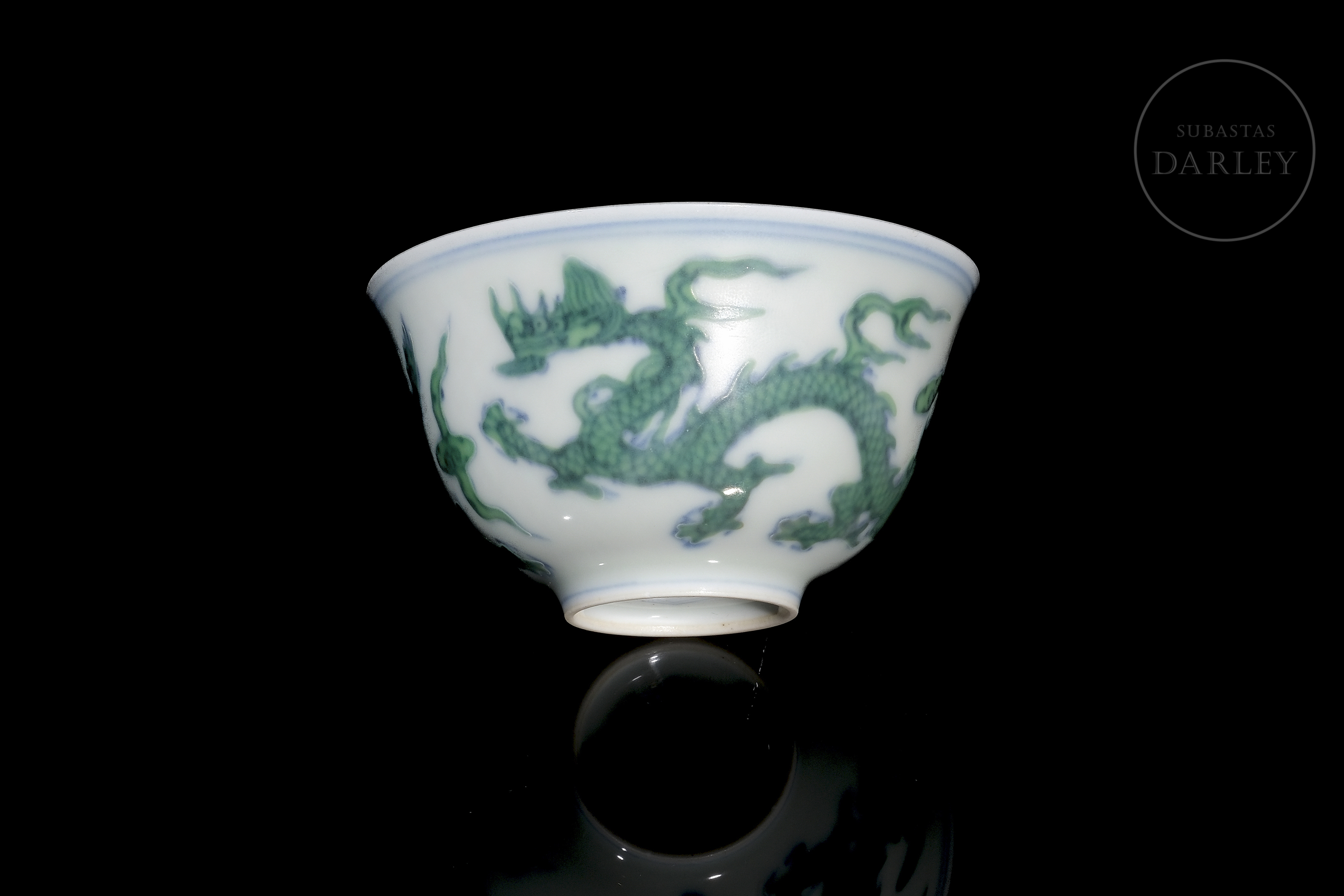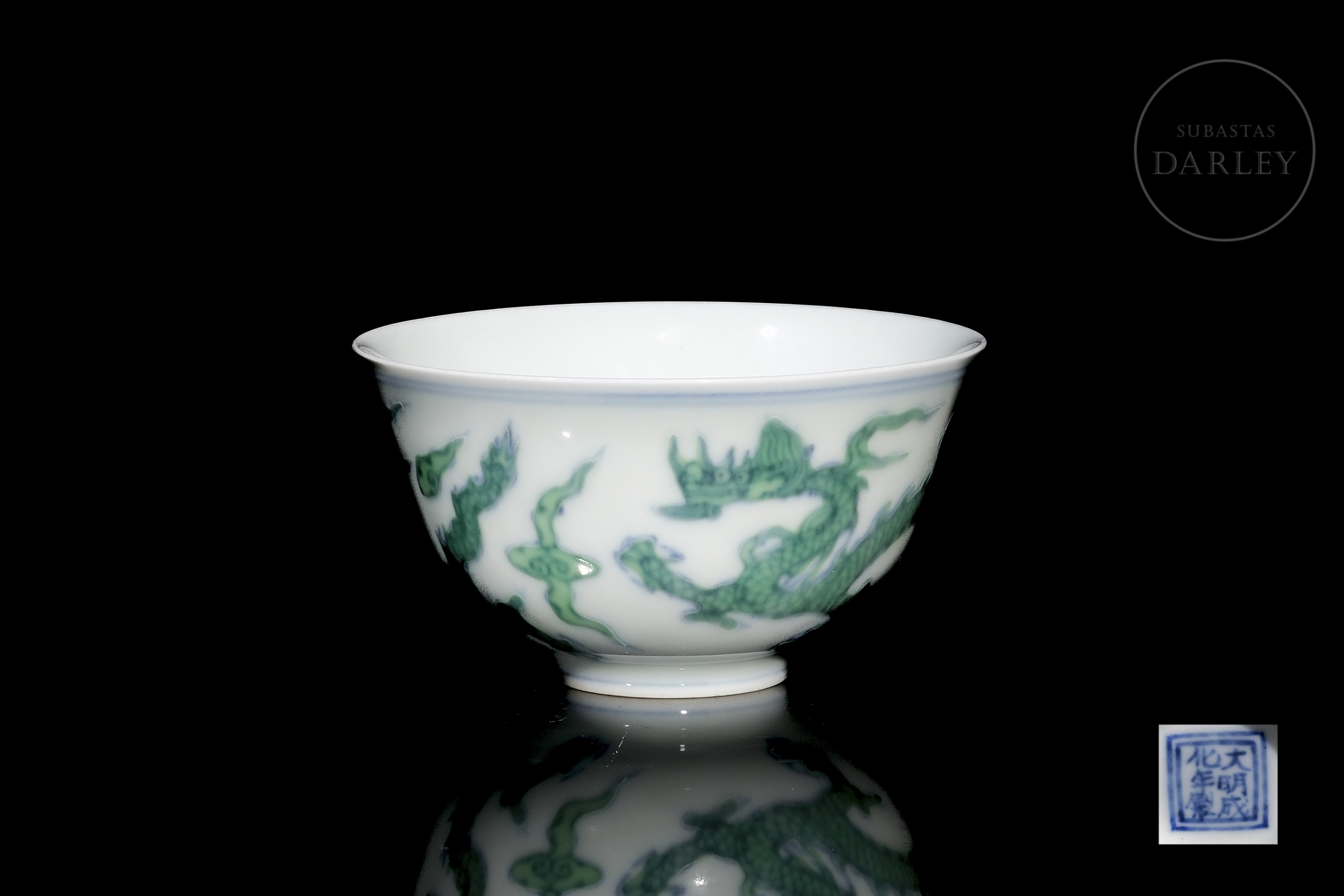 Conical porcelain cup. The exterior is decorated with five-clawed dragons chasing flaming pearls among clouds. The decoration is made with underglaze blue enamel on the contours, coloured with overglaze green enamel. The base bears a six-character mark ‘大明成化年制’ in underglaze blue.