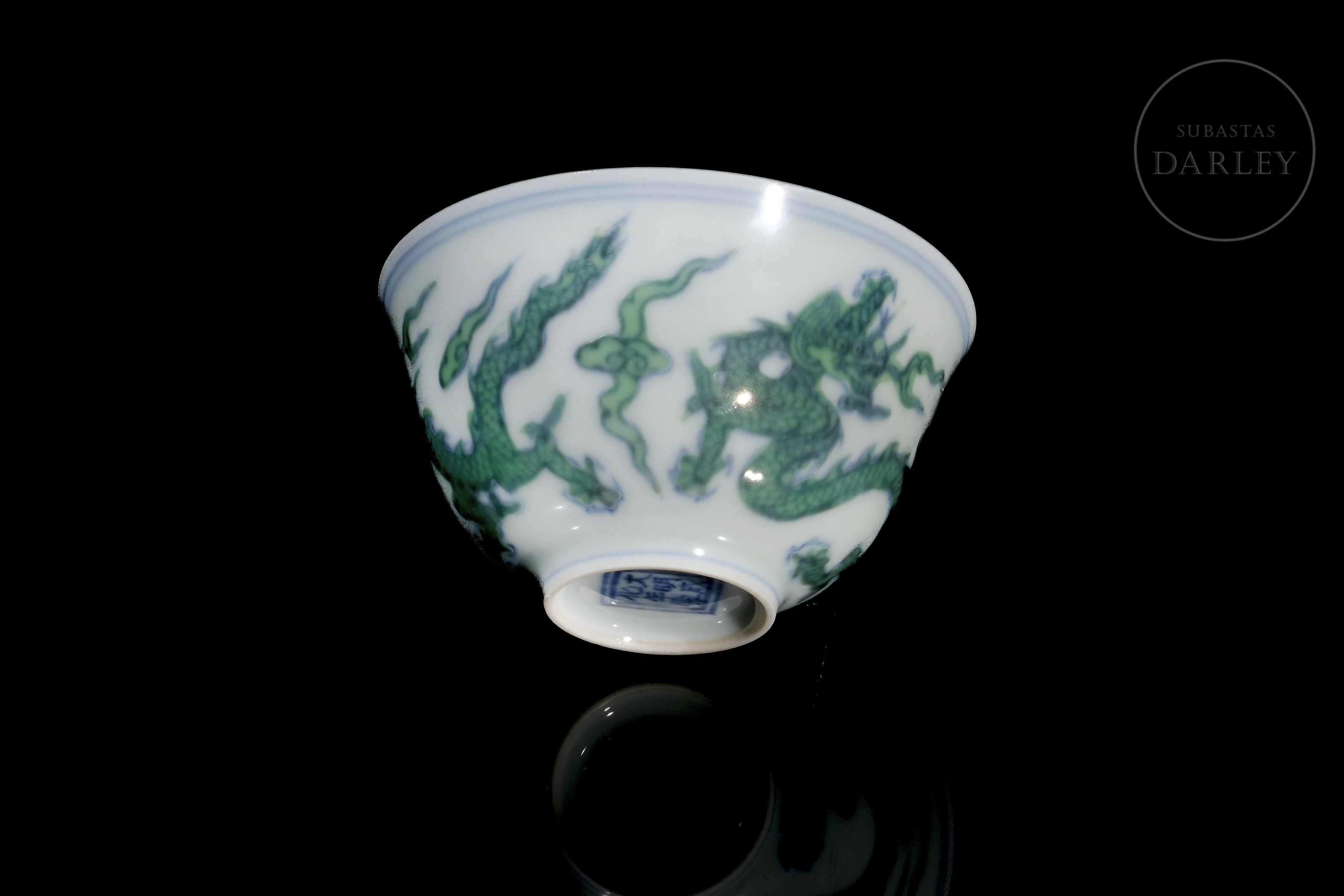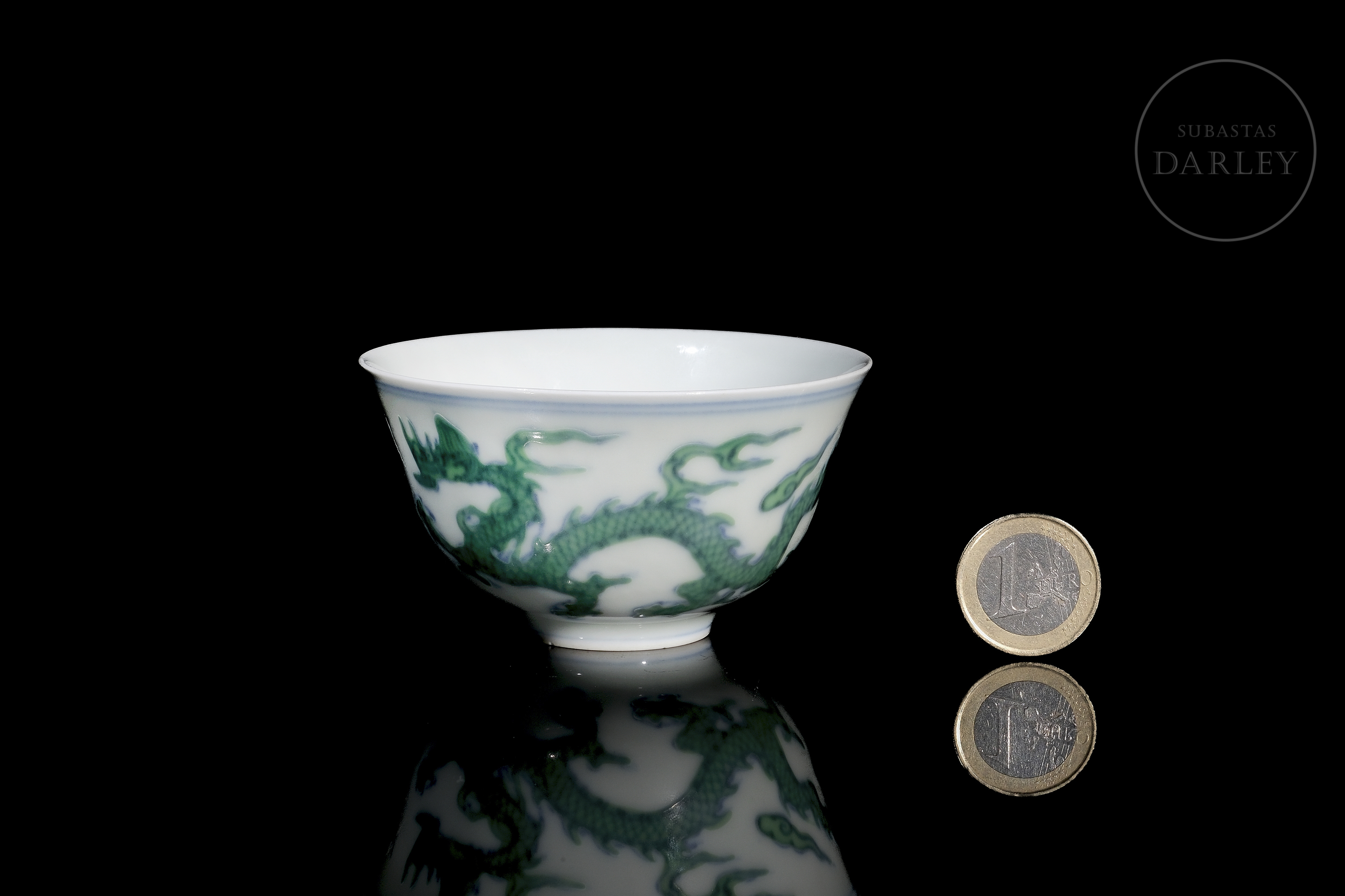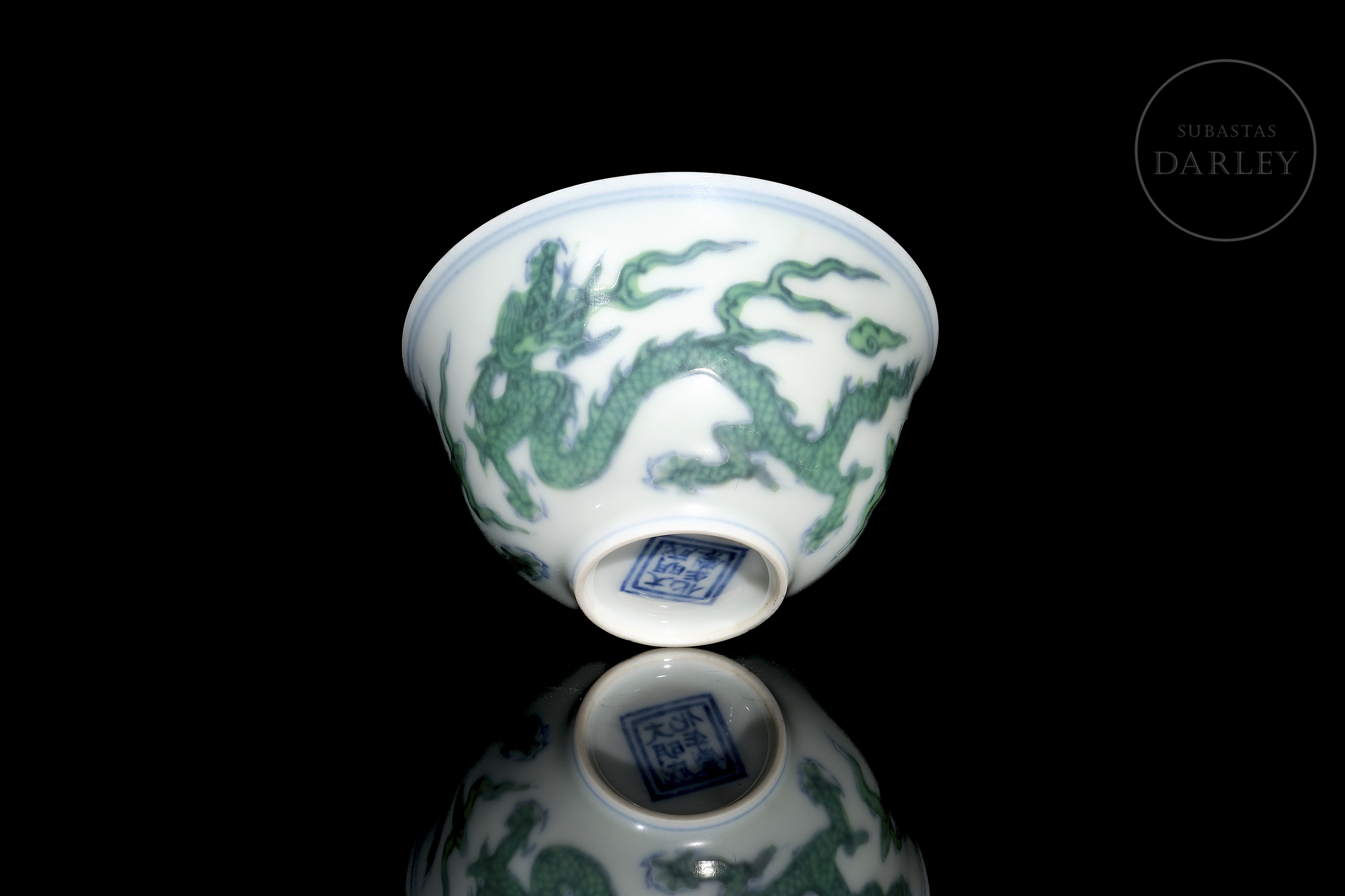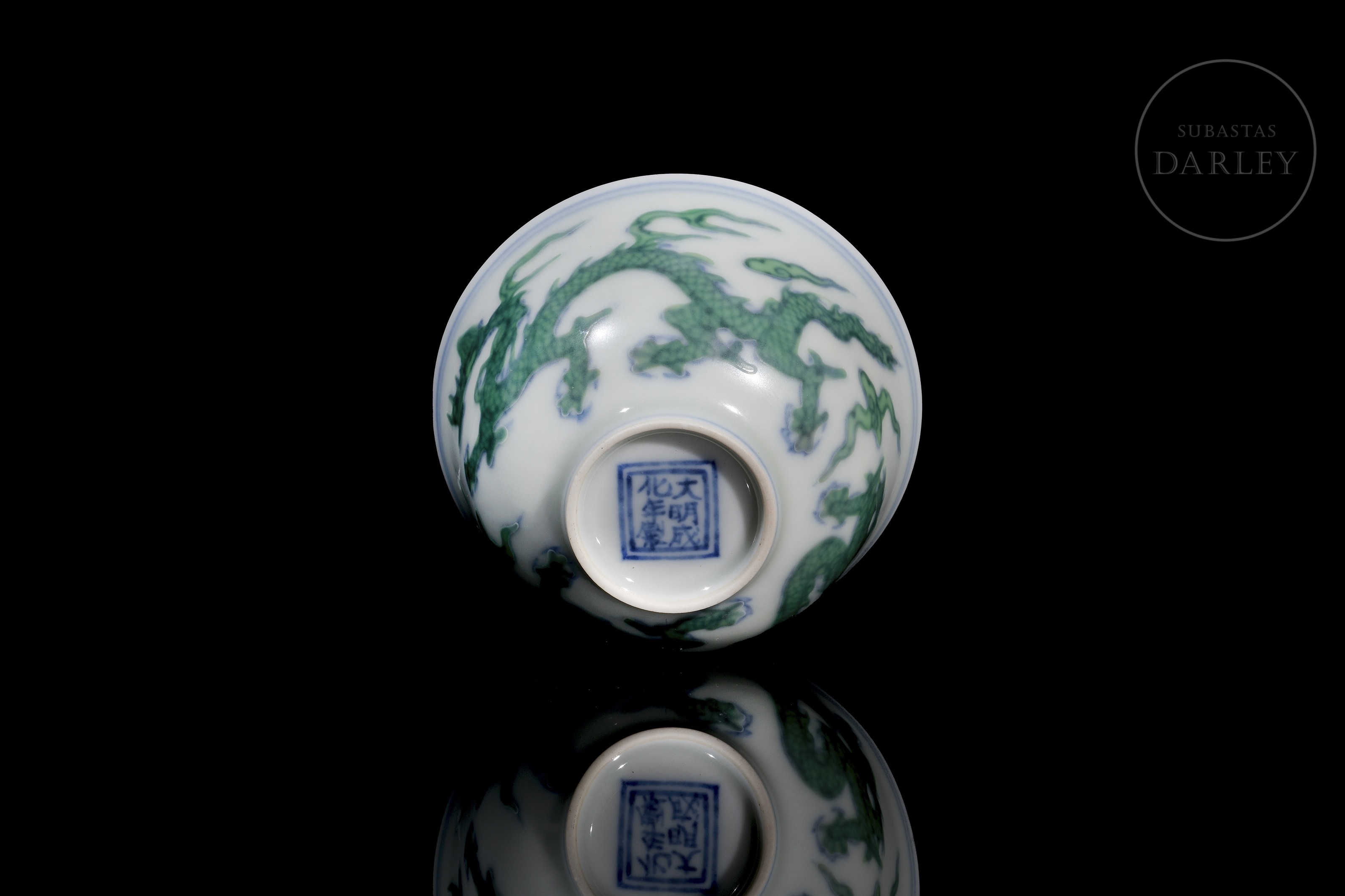 Conical porcelain cup. The exterior is decorated with five-clawed dragons chasing flaming pearls among clouds. The decoration is made with underglaze blue enamel on the contours, coloured with overglaze green enamel. The base bears a six-character mark ‘大明成化年制’ in underglaze blue.