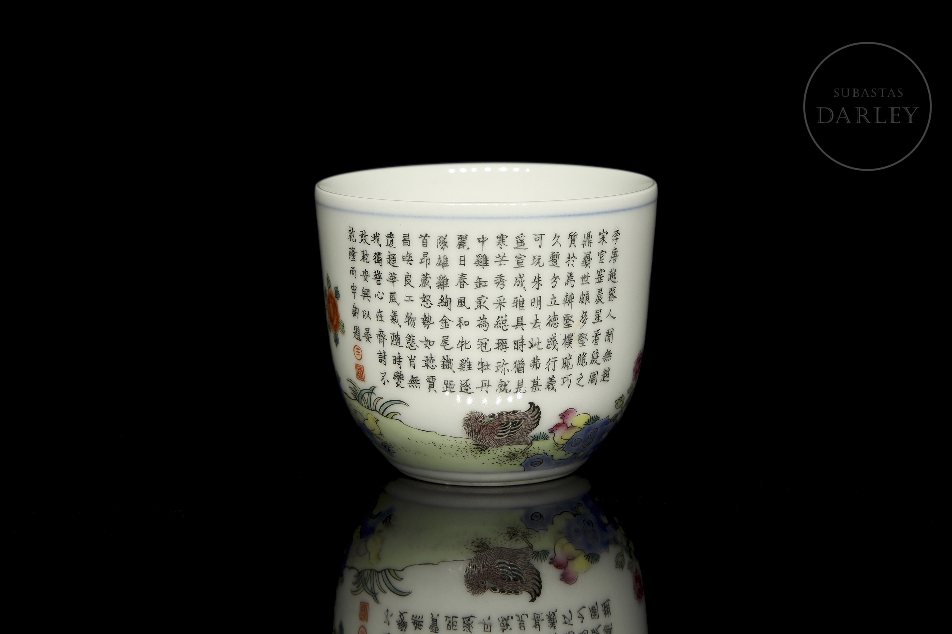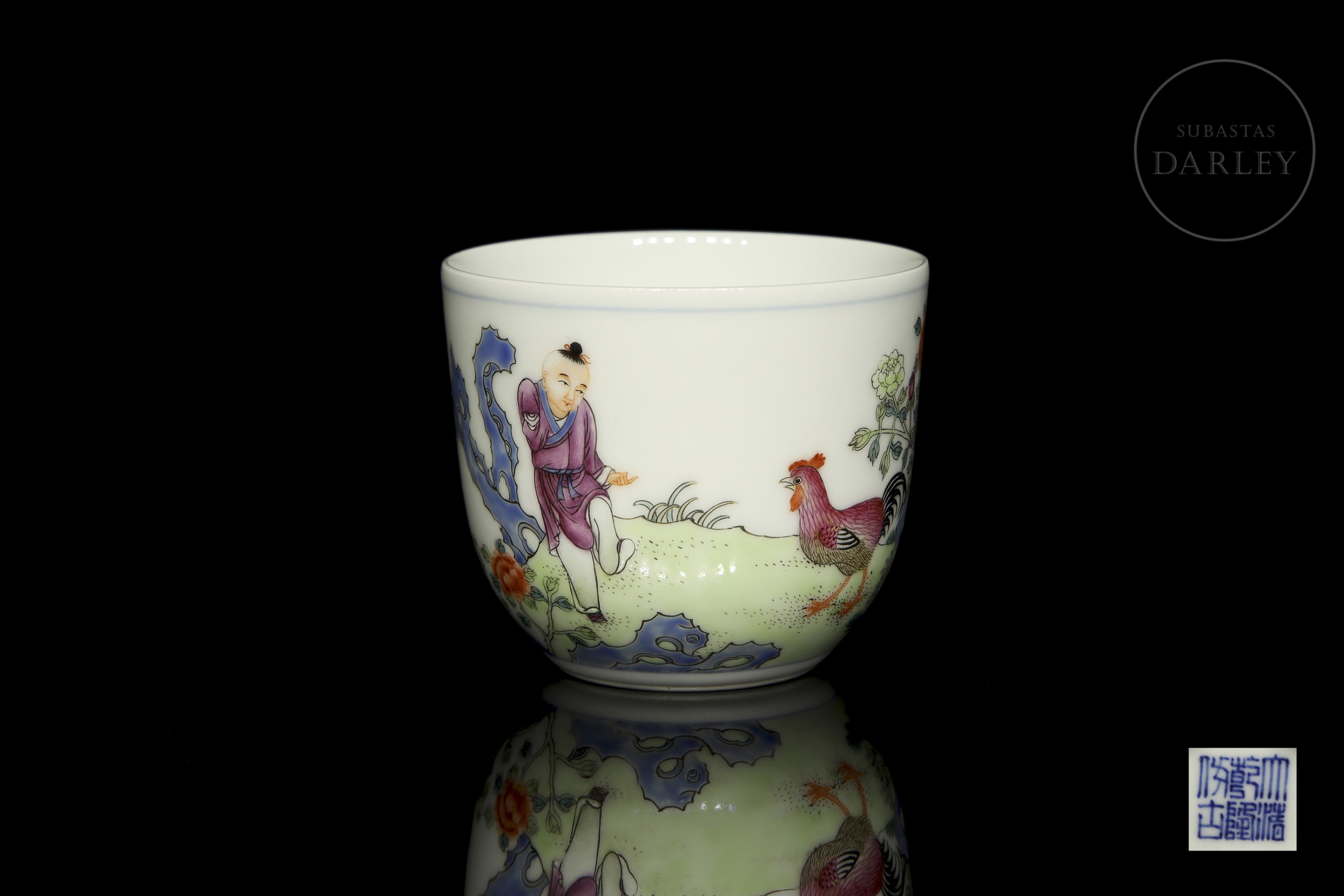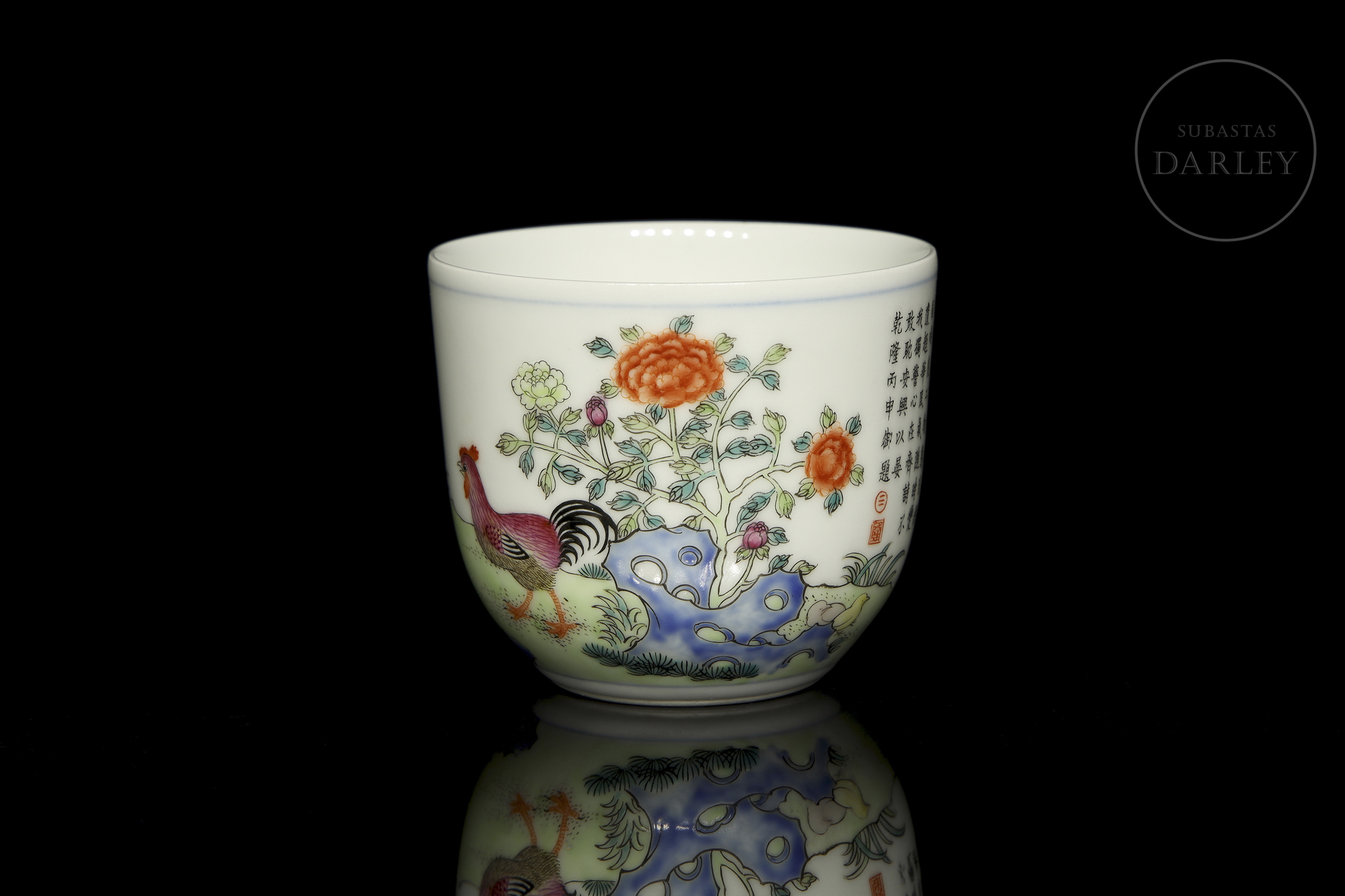 Porcelain cup decorated with pink glaze enamels, overglaze, depicting a scene in a beautiful garden with a child, roosters, rocks and flowers. On the reverse side, there is a long poem alongside two red stamps. On the base, there is a six-character stamp ‘大清乾隆仿古’ in blue underglaze.