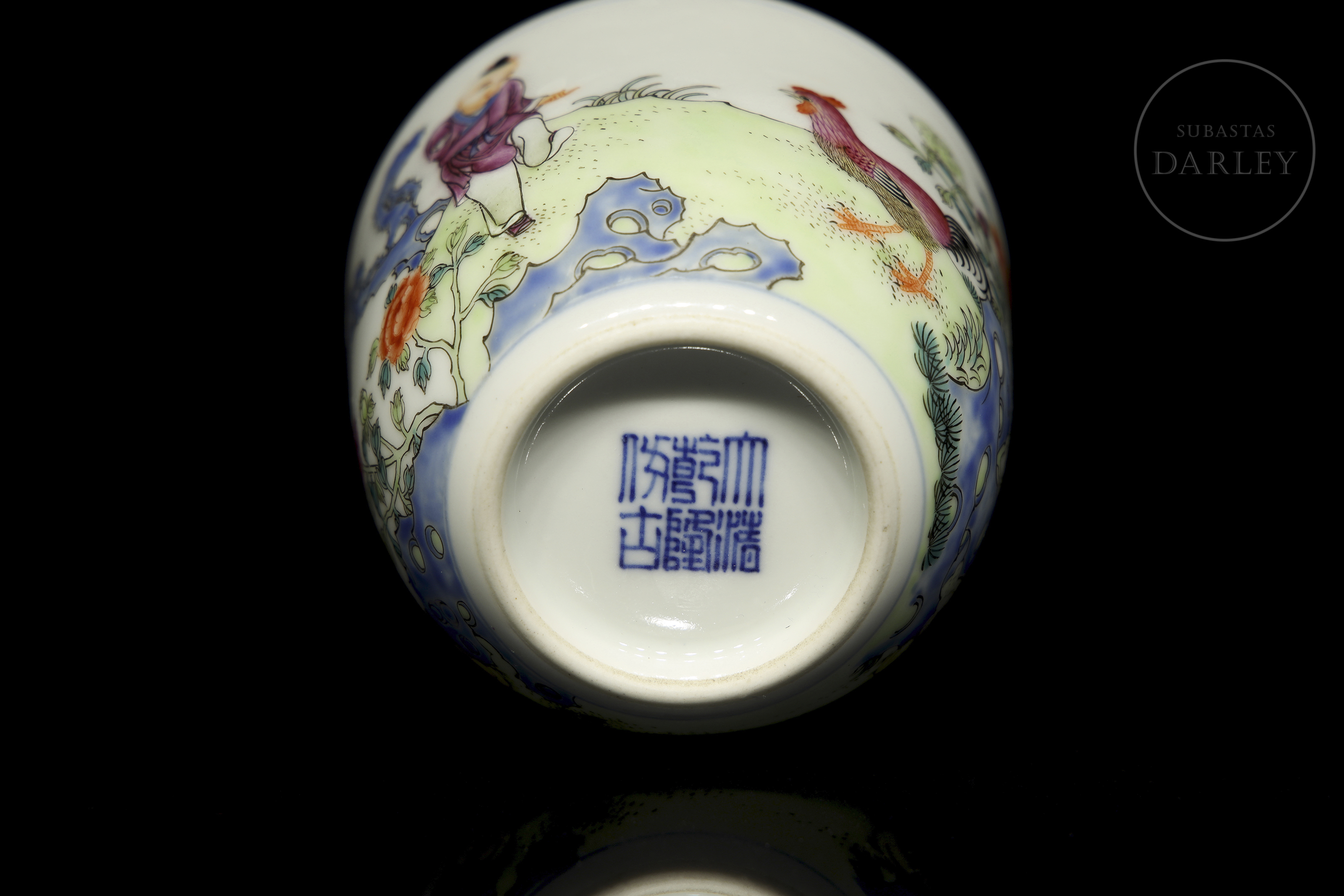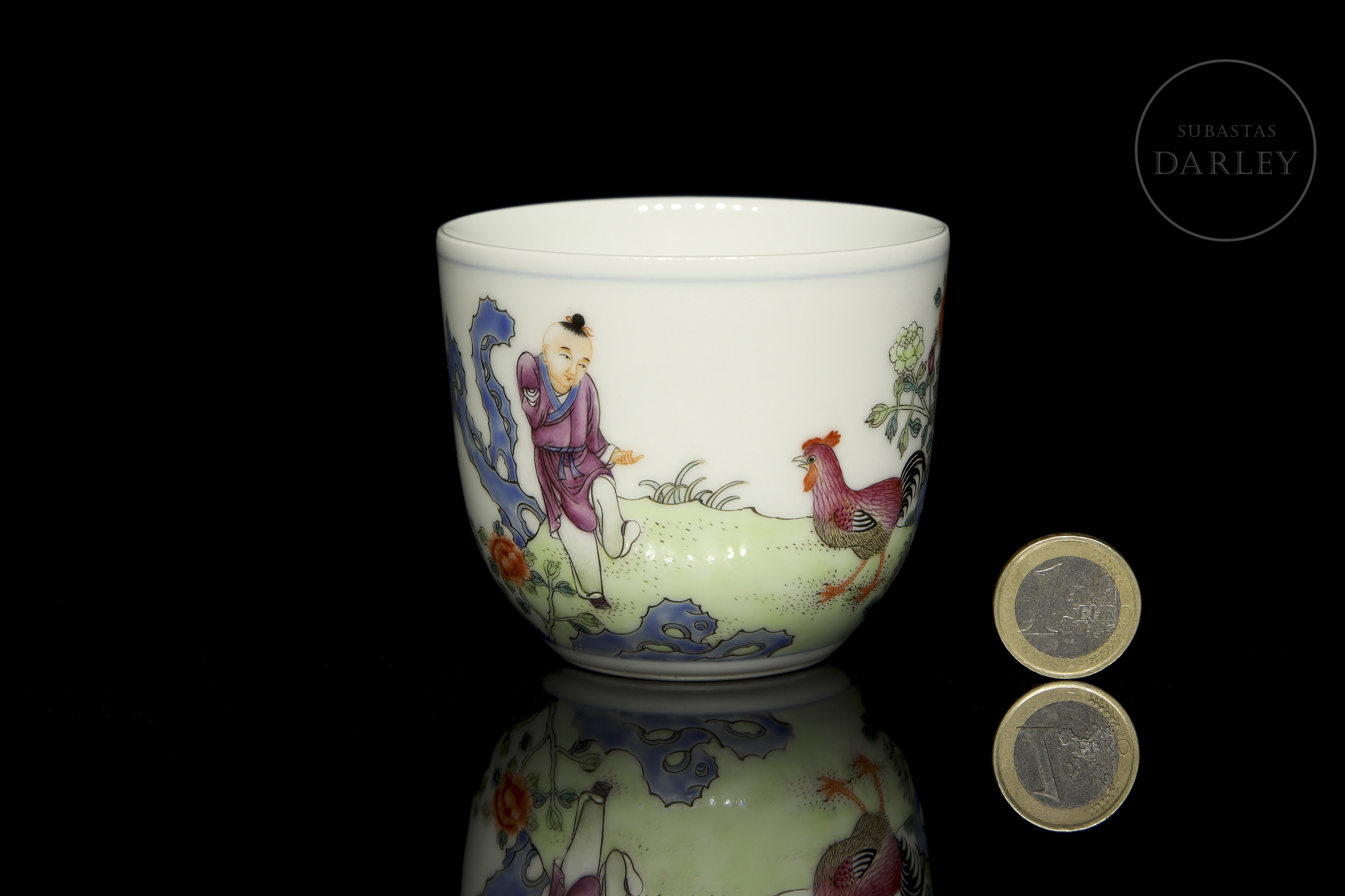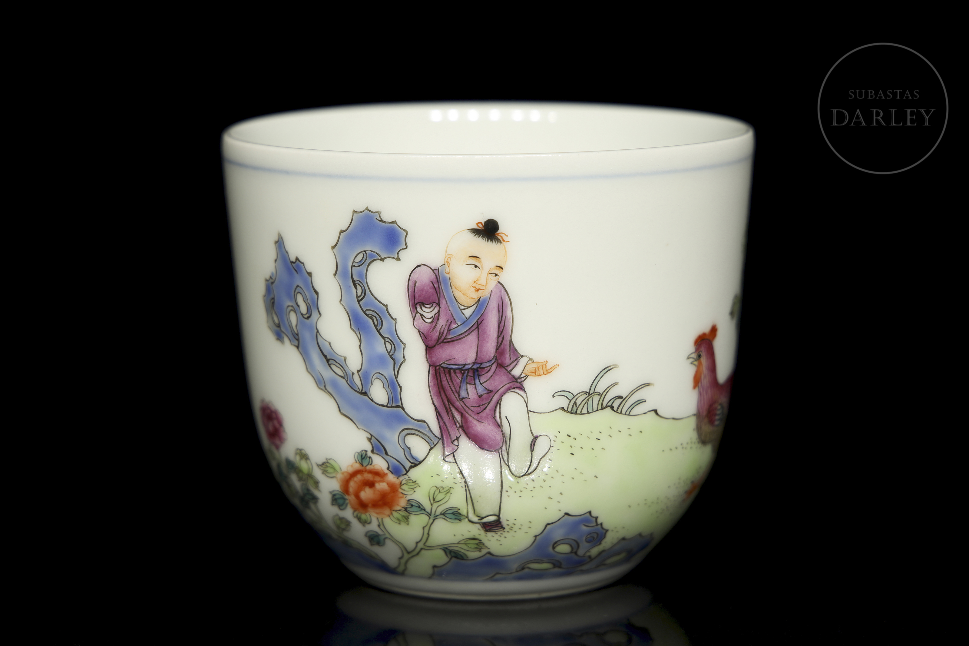 Porcelain cup decorated with pink glaze enamels, overglaze, depicting a scene in a beautiful garden with a child, roosters, rocks and flowers. On the reverse side, there is a long poem alongside two red stamps. On the base, there is a six-character stamp ‘大清乾隆仿古’ in blue underglaze.