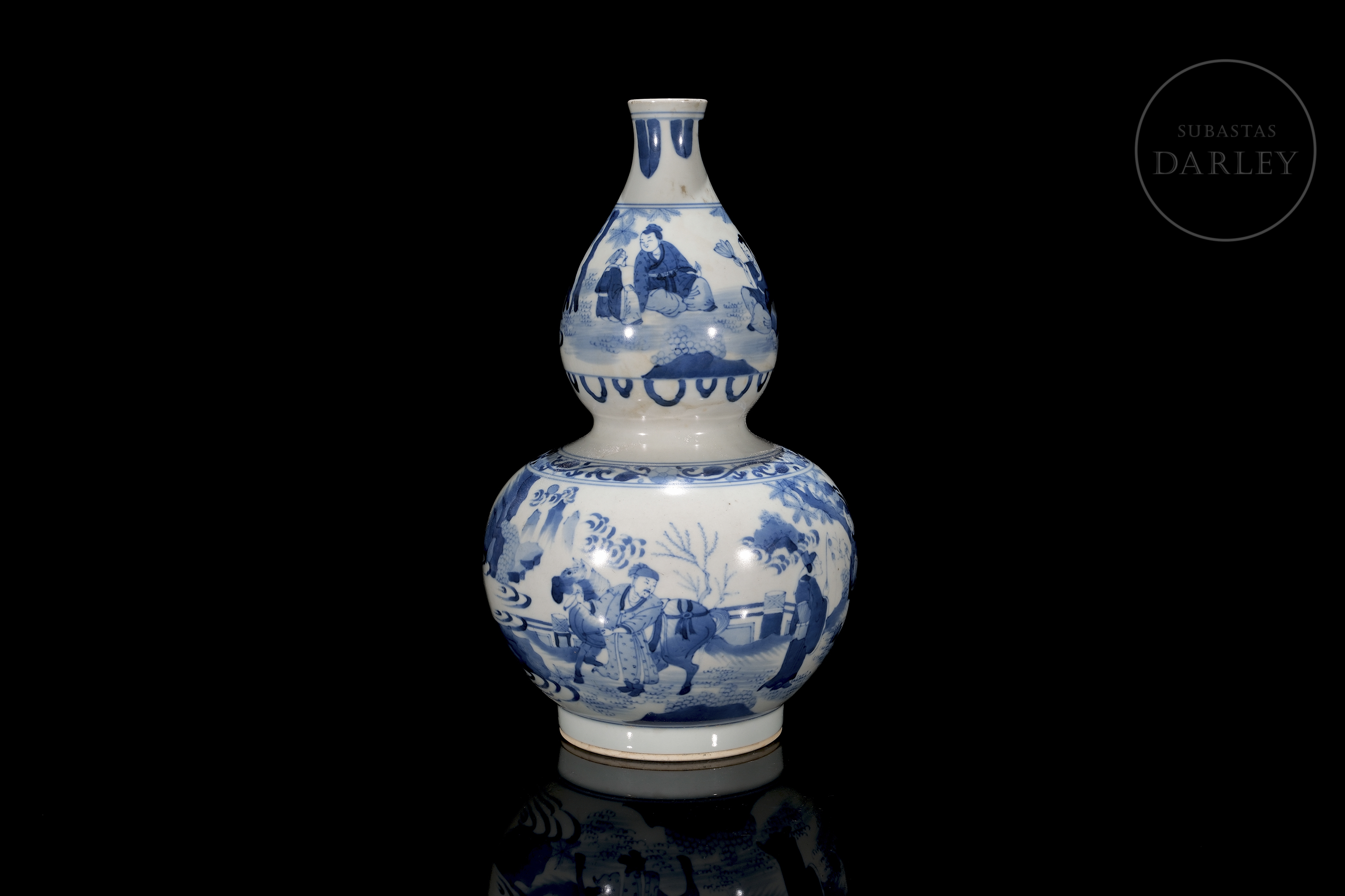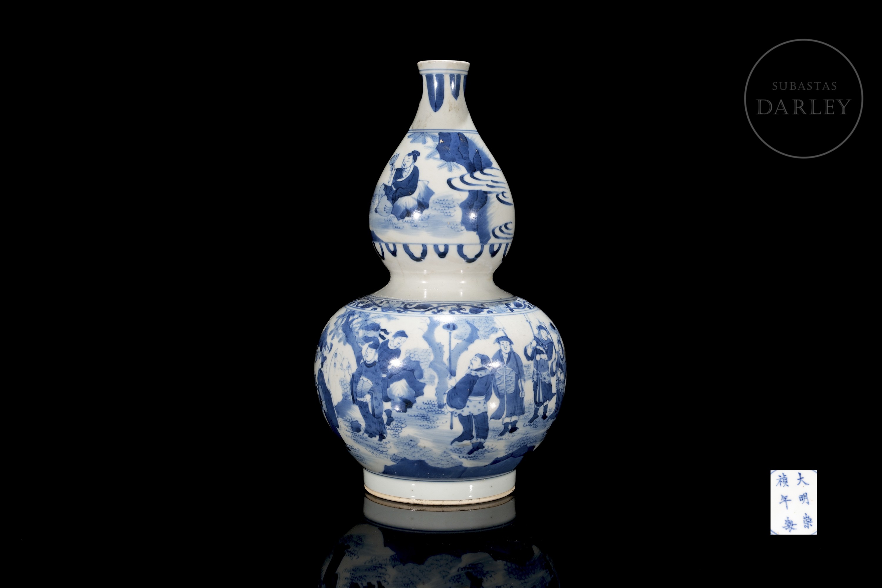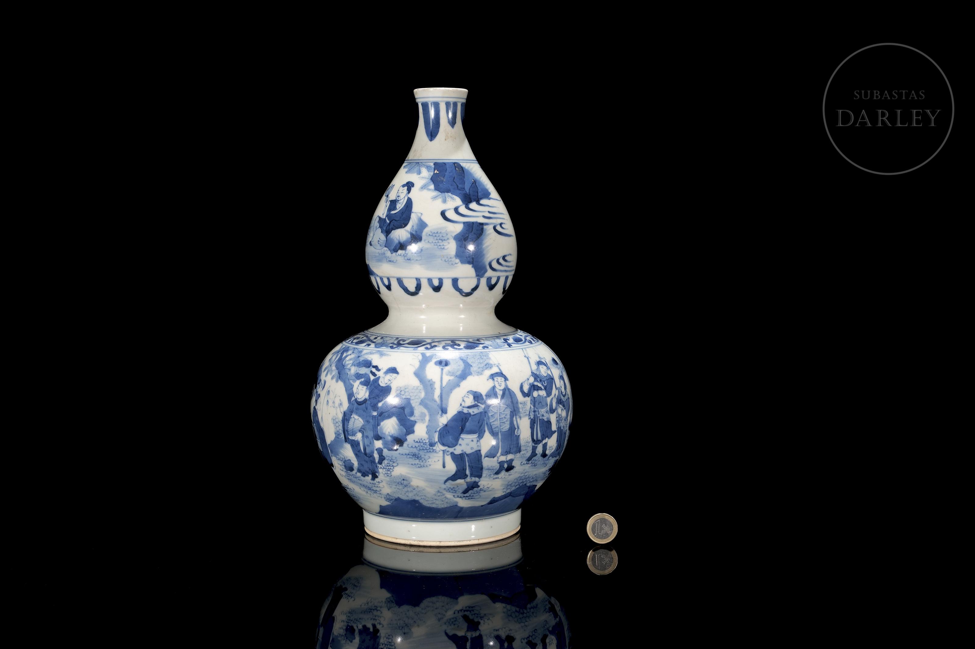 Porcelain vase in the shape of a double gourd, painted in cobalt blue. The two bulbs are decorated with continuous scenes. The lower bulb, which is larger, depicts a crowded scene of scholars and dignitaries in a garden landscape. The upper bulb shows an immortal among clouds. The base bears a six-character mark ‘大明崇禎年制’ within a double circle.