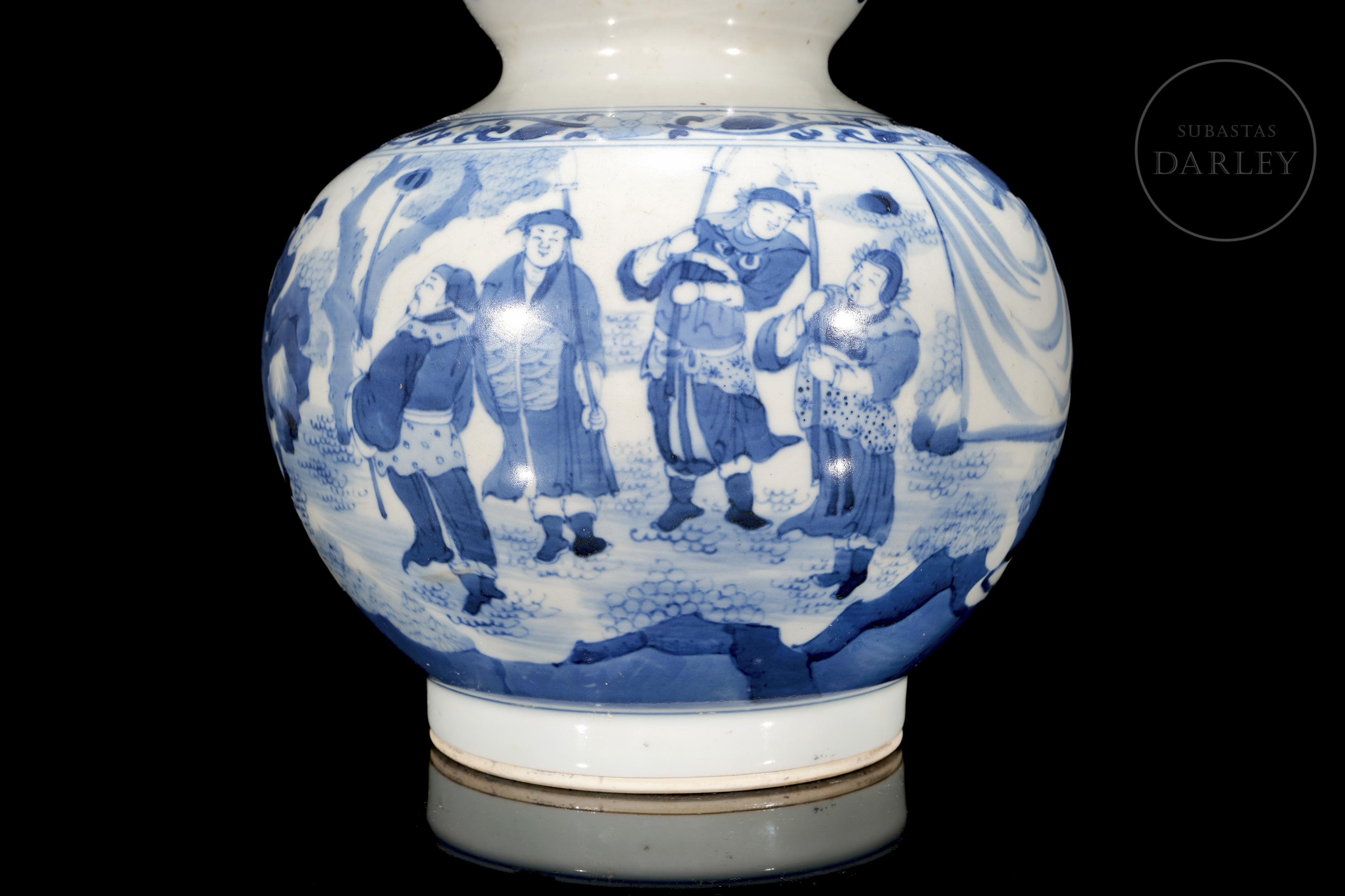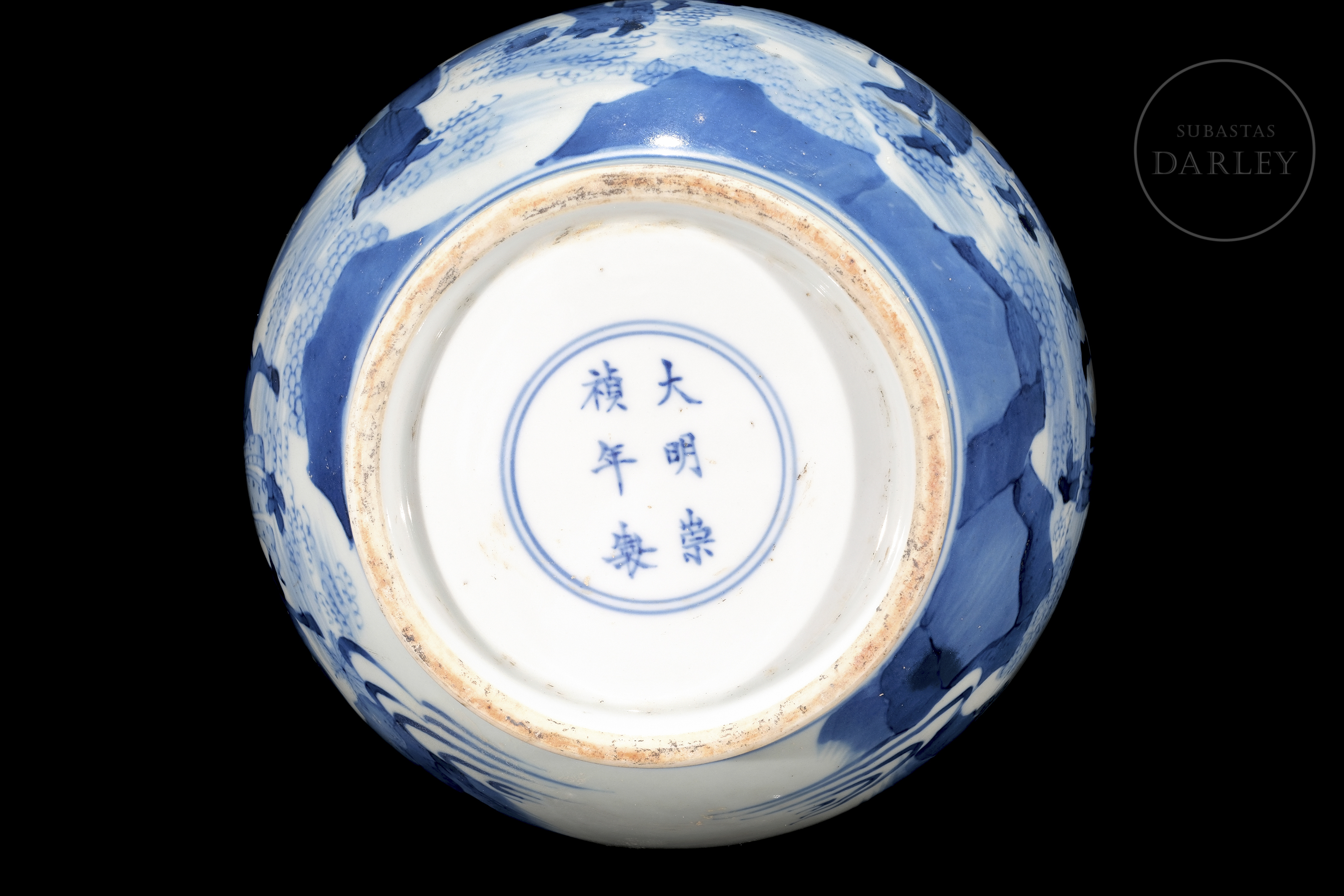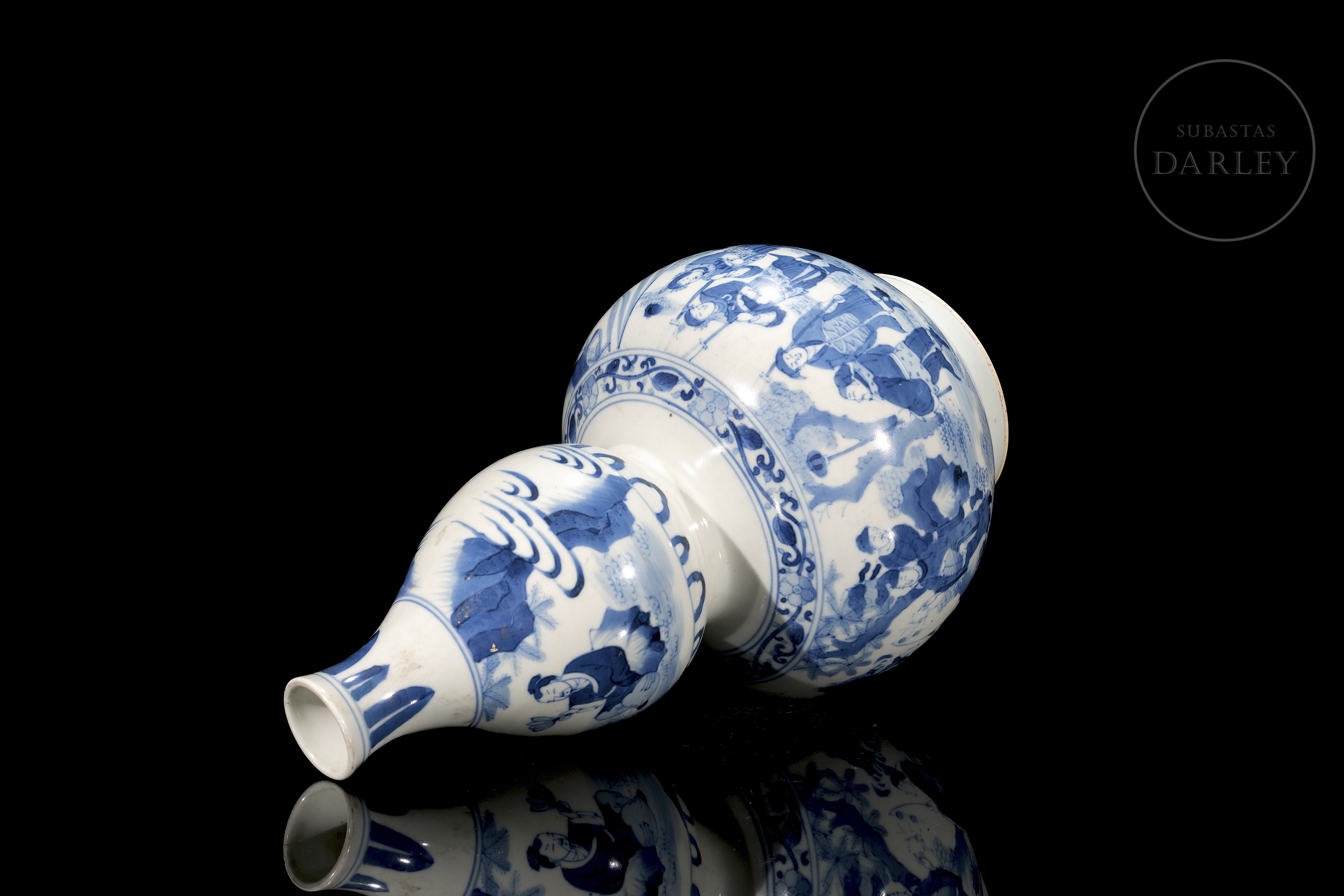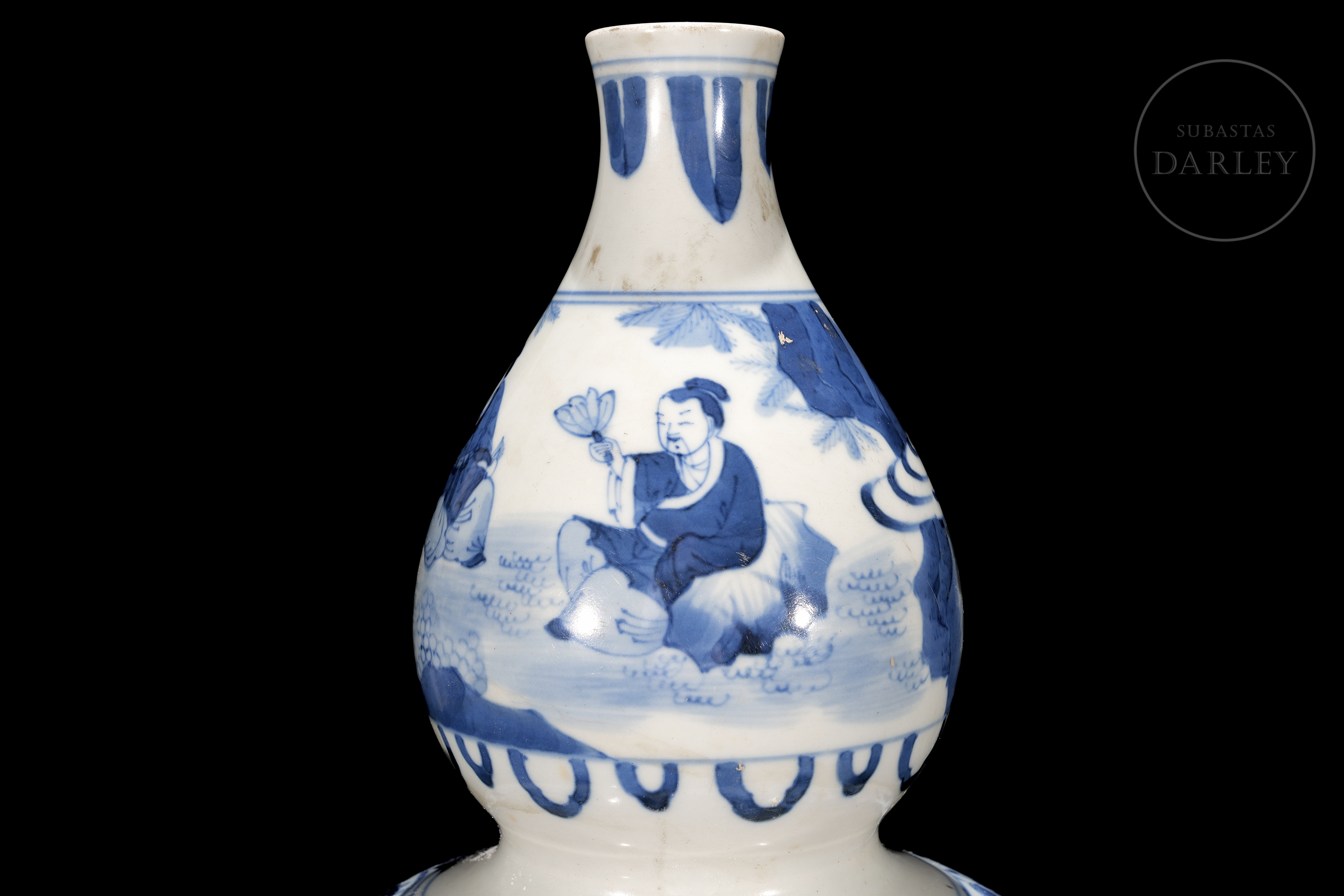 Porcelain vase in the shape of a double gourd, painted in cobalt blue. The two bulbs are decorated with continuous scenes. The lower bulb, which is larger, depicts a crowded scene of scholars and dignitaries in a garden landscape. The upper bulb shows an immortal among clouds. The base bears a six-character mark ‘大明崇禎年制’ within a double circle.