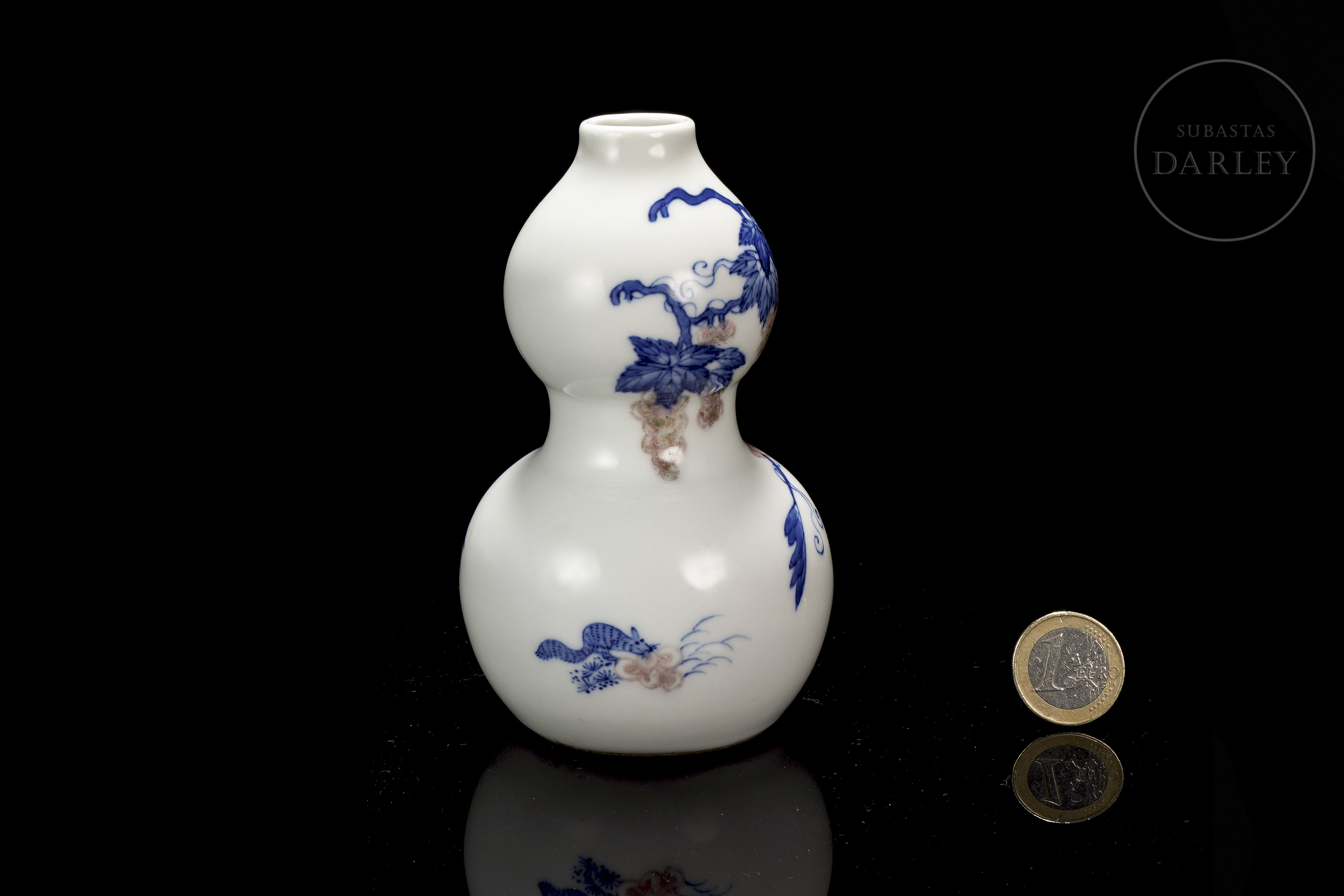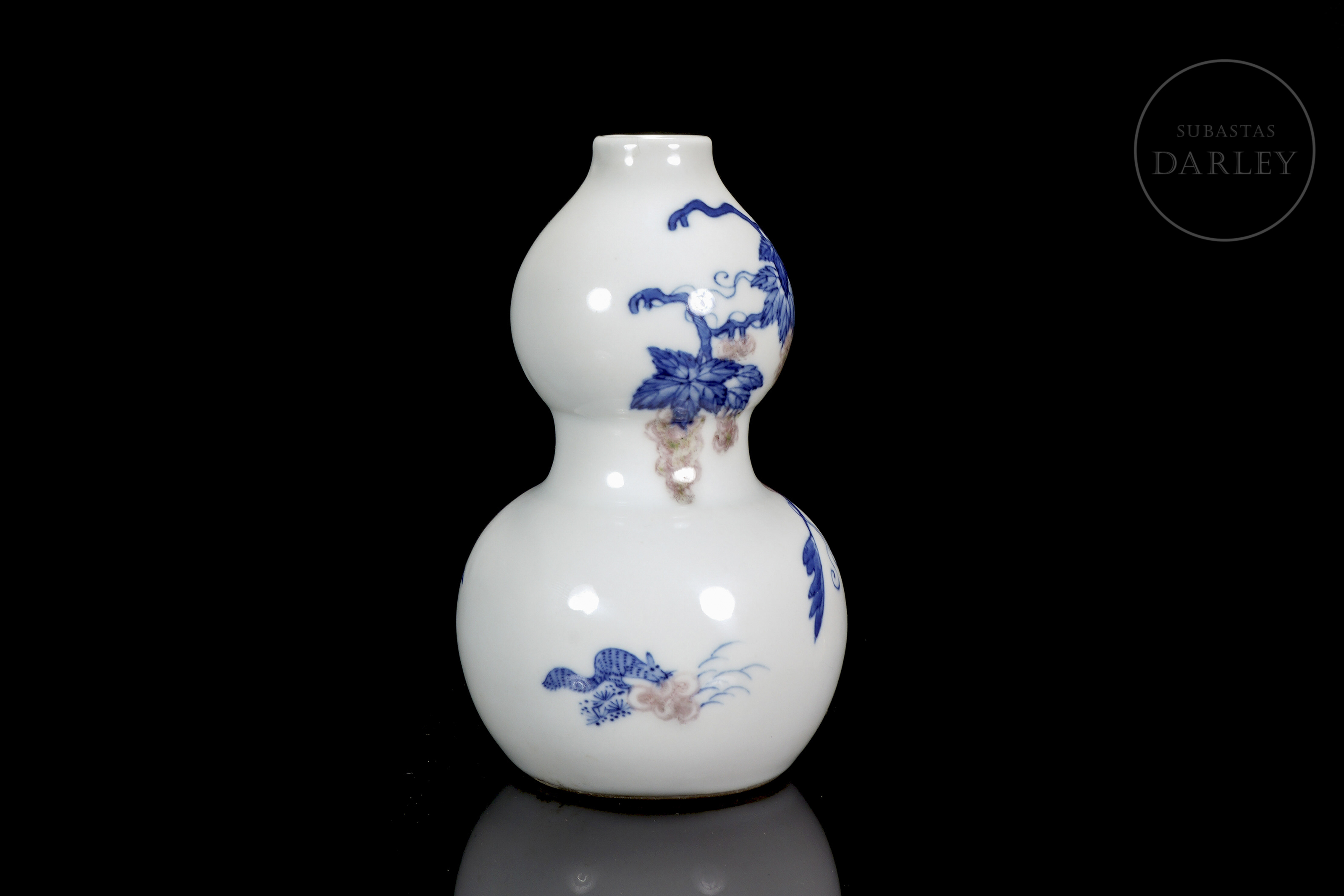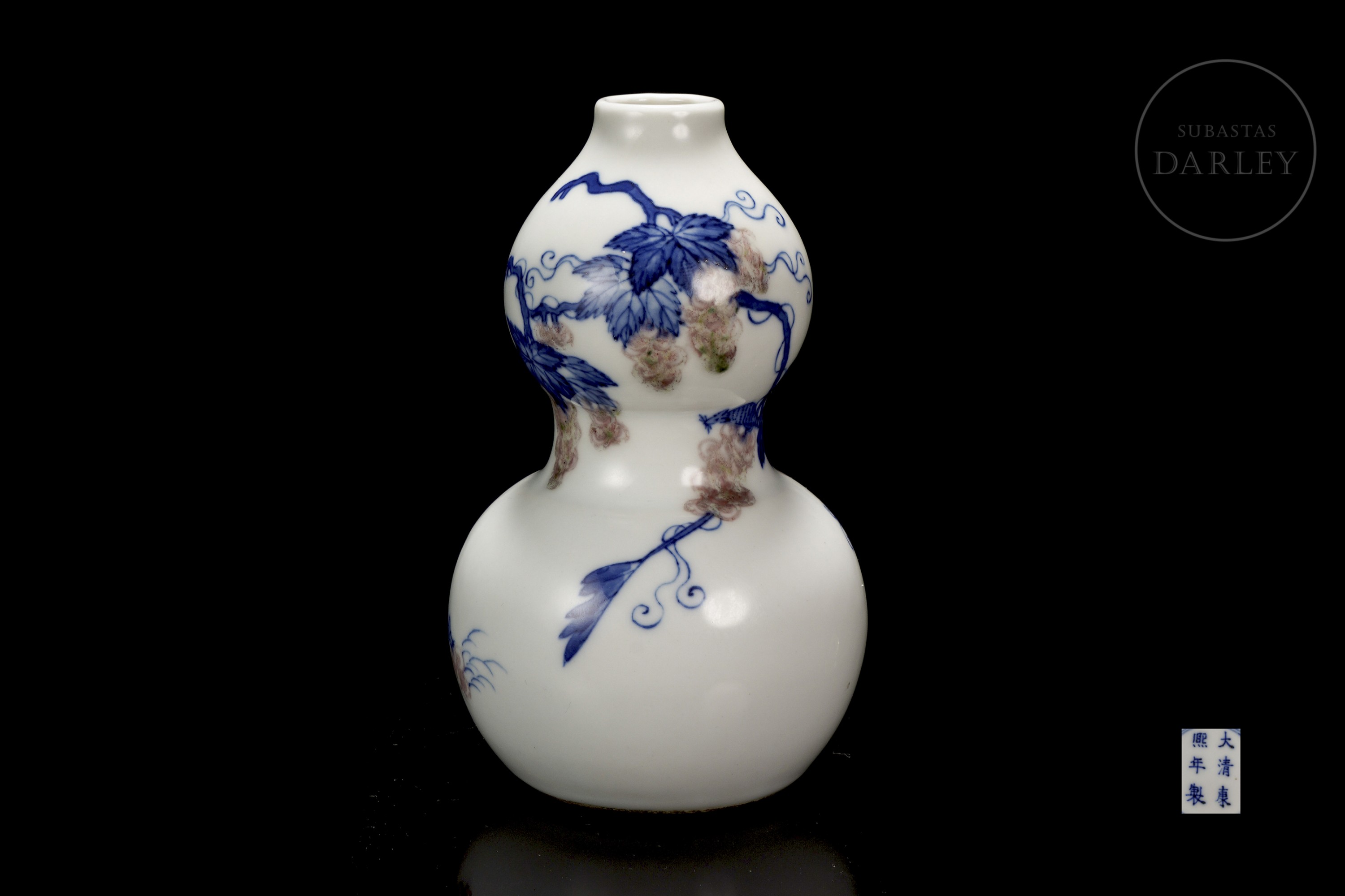 Porcelain vase in the shape of a double gourd. Against a white background, a vine with cobalt blue leaves and tendrils winds around the piece, dotted with clusters of copper-red grapes. Small blue squirrels enliven the scene. On the base is the six-character mark ‘大清康熙年製’ in underglaze blue, framed by a double circle.