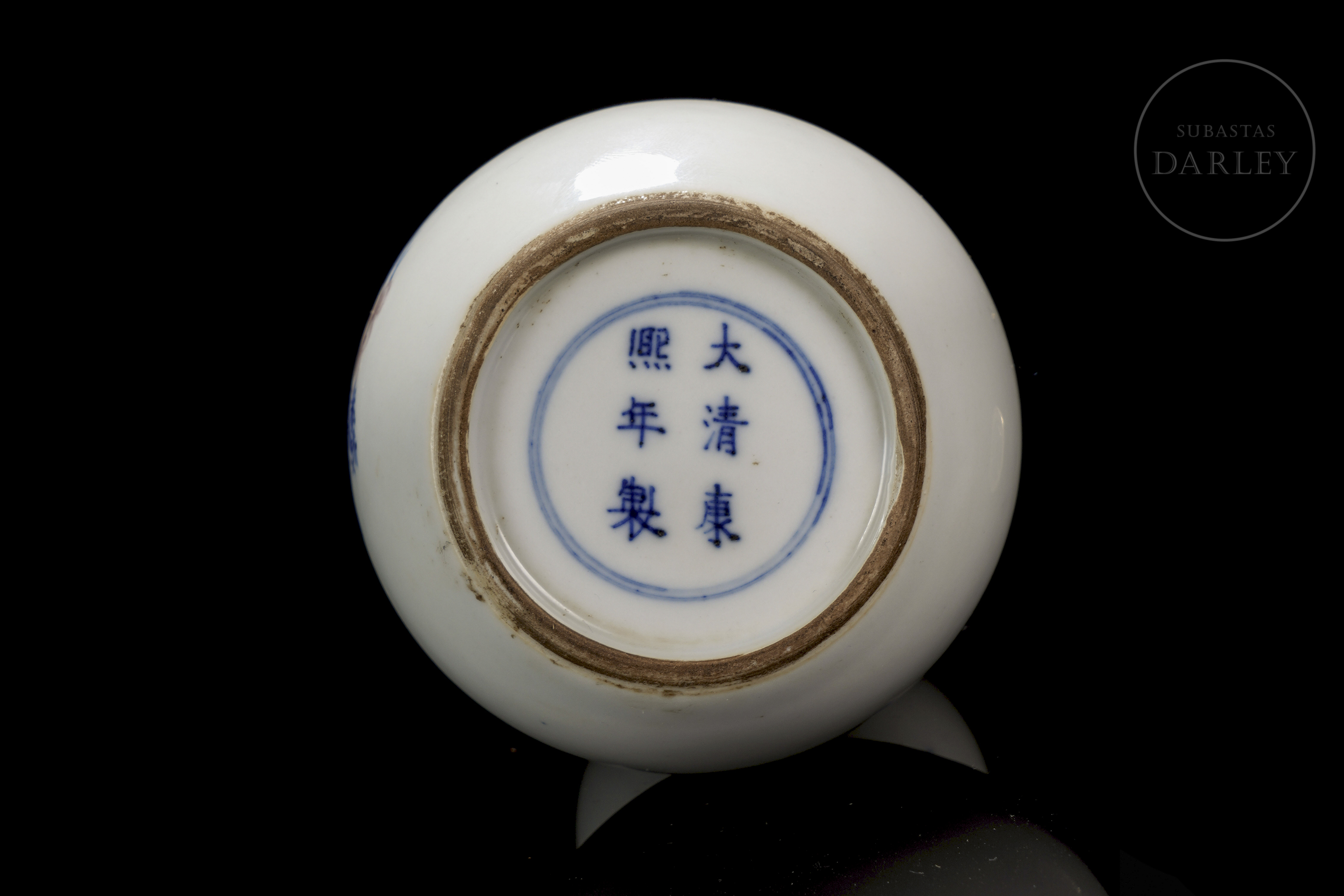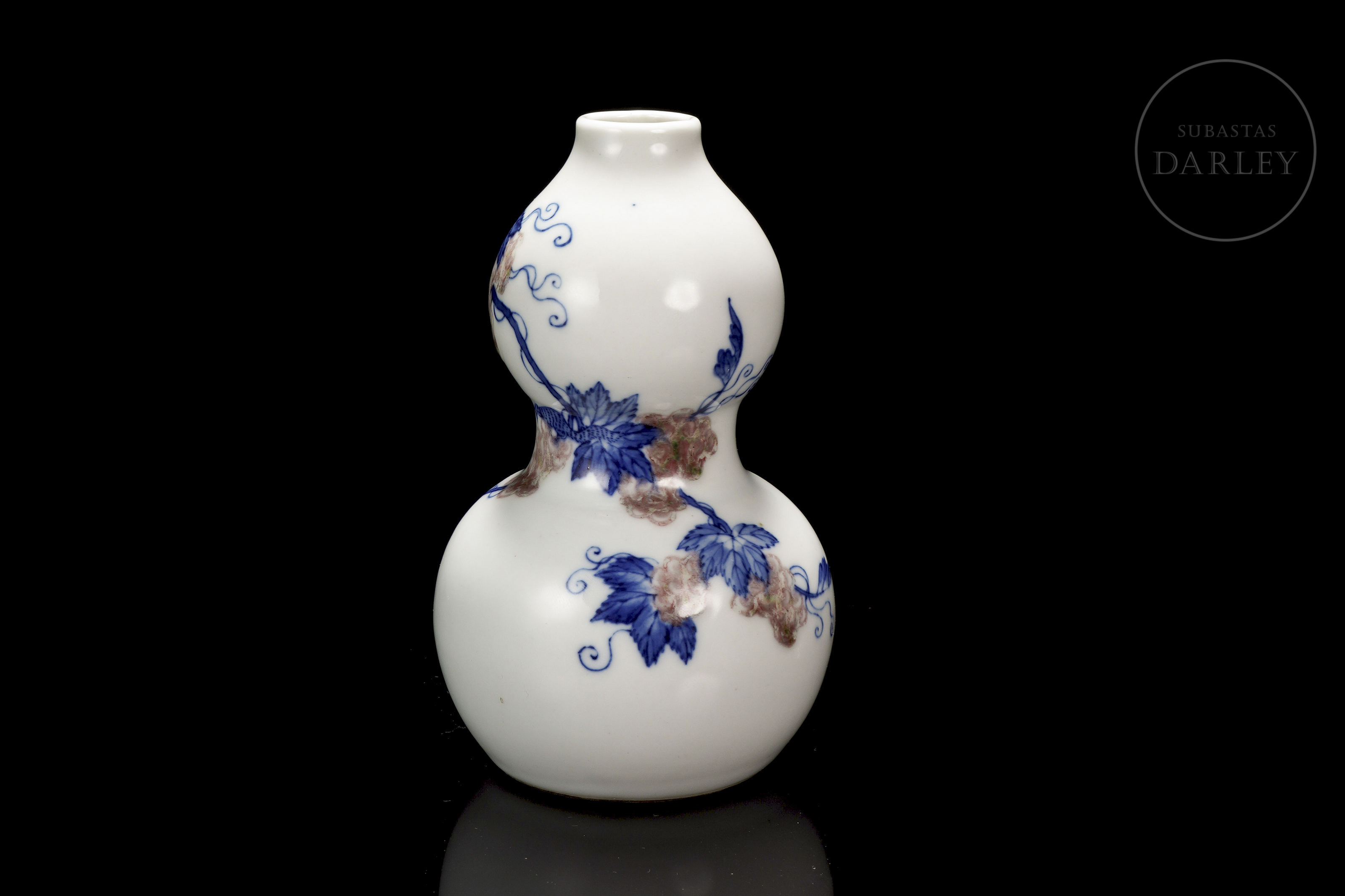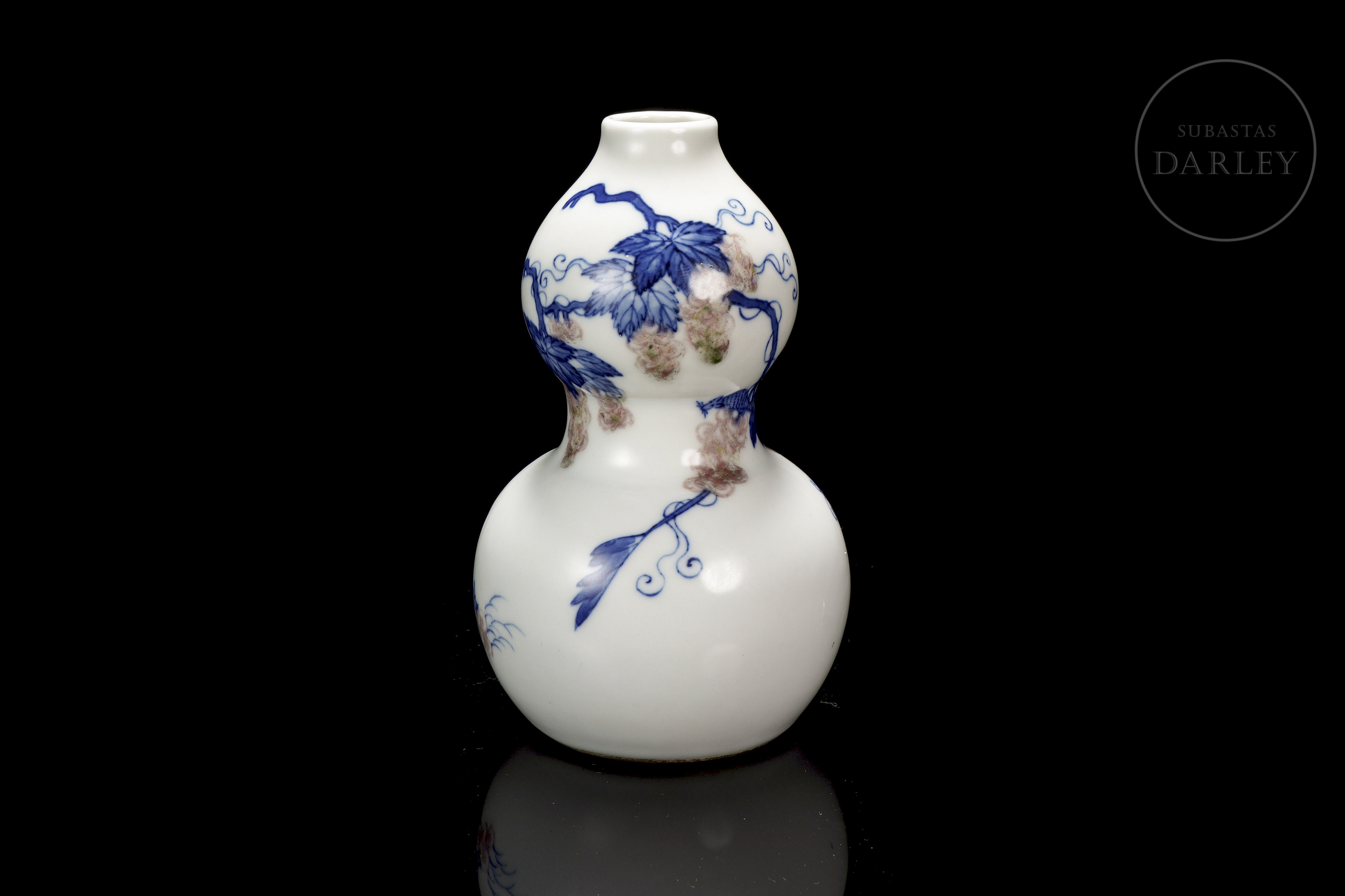 Porcelain vase in the shape of a double gourd. Against a white background, a vine with cobalt blue leaves and tendrils winds around the piece, dotted with clusters of copper-red grapes. Small blue squirrels enliven the scene. On the base is the six-character mark ‘大清康熙年製’ in underglaze blue, framed by a double circle.