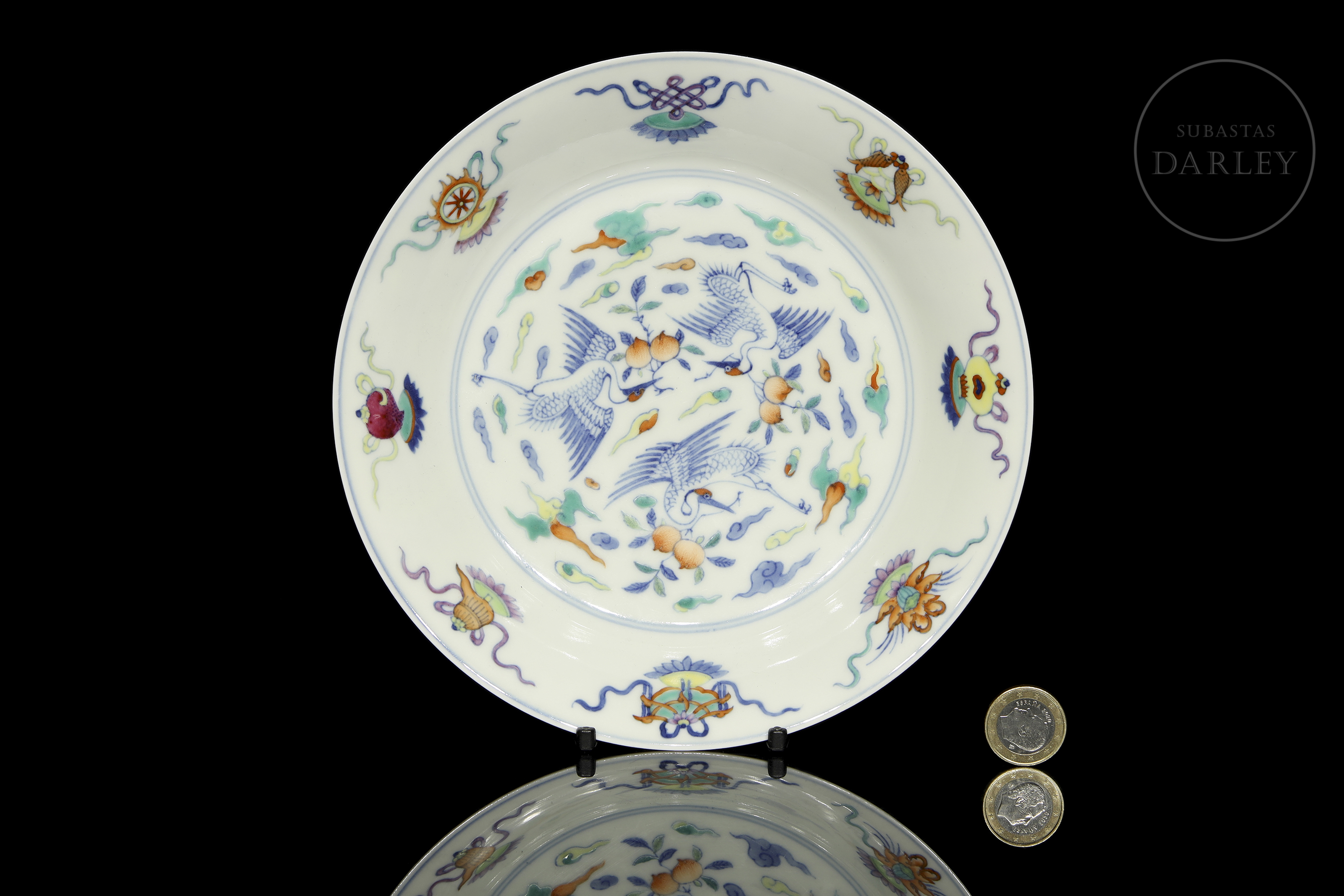 Porcelain decorated with polychrome enamels on glaze. The central scene depicts a group of cranes among auspicious clouds and peach tree branches. The rim is decorated with the Eight Buddhist Symbols arranged in a radial pattern. The reverse shows a border of stylised waves with bats in flight, and in the centre, a six-character seal ‘大清雍正年制’ in blue underglaze.