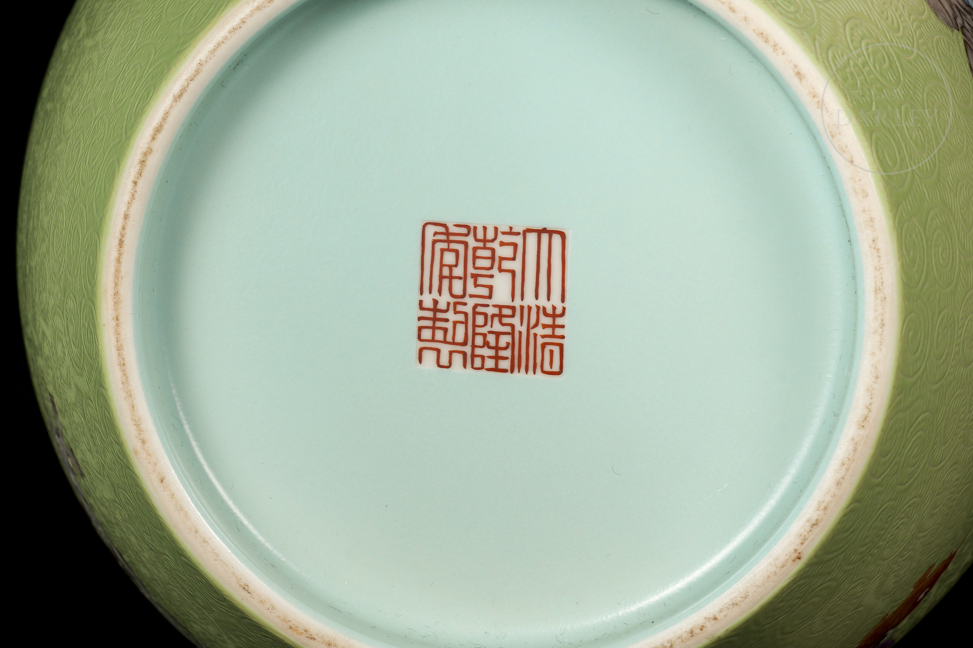 Ovoid porcelain vase with an apple green background decorated with sgraffiato spirals. The Eight Immortals are painted on this surface in pink family enamels. The pale turquoise base bears the six-character mark “大清乾隆年制” in iron red.