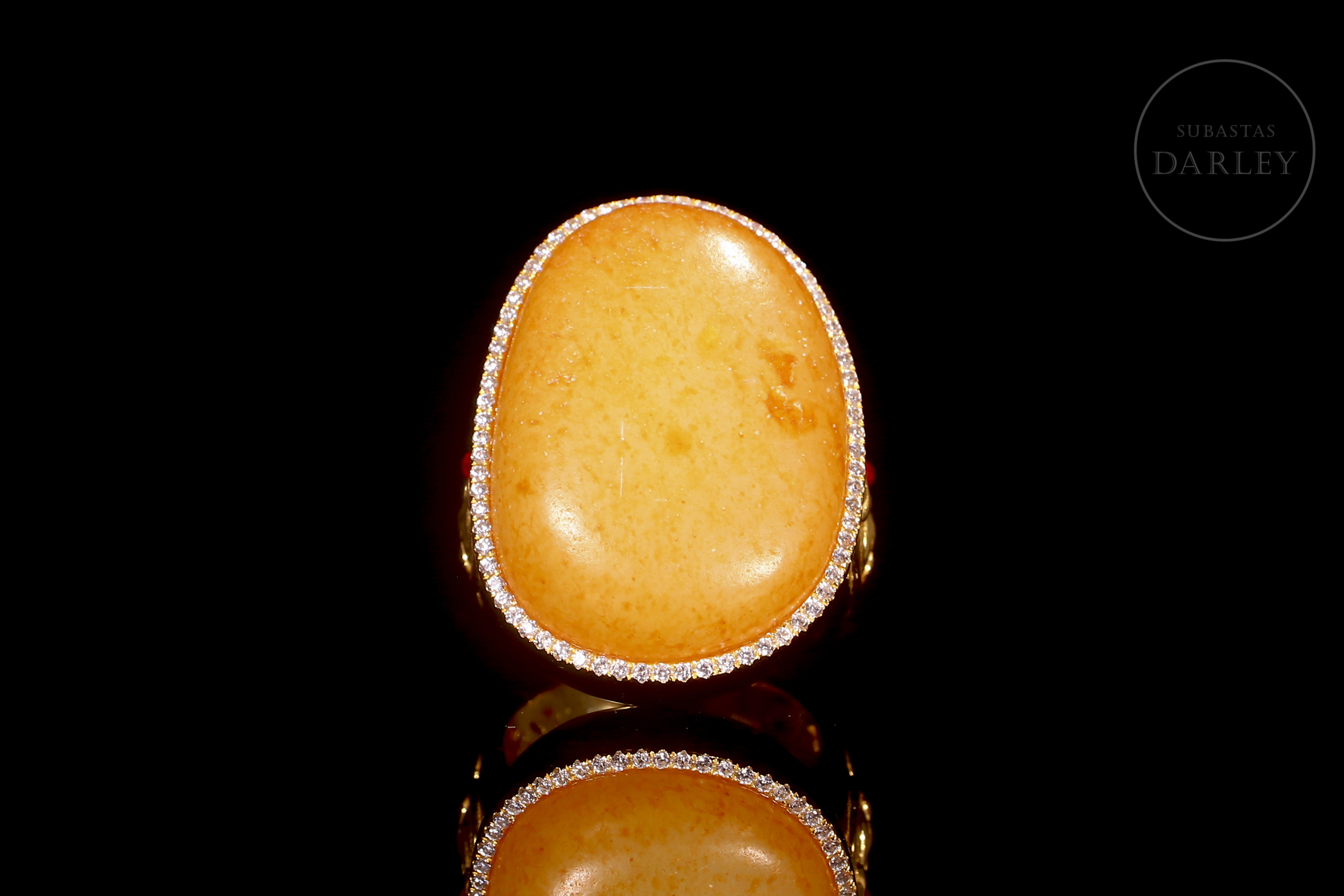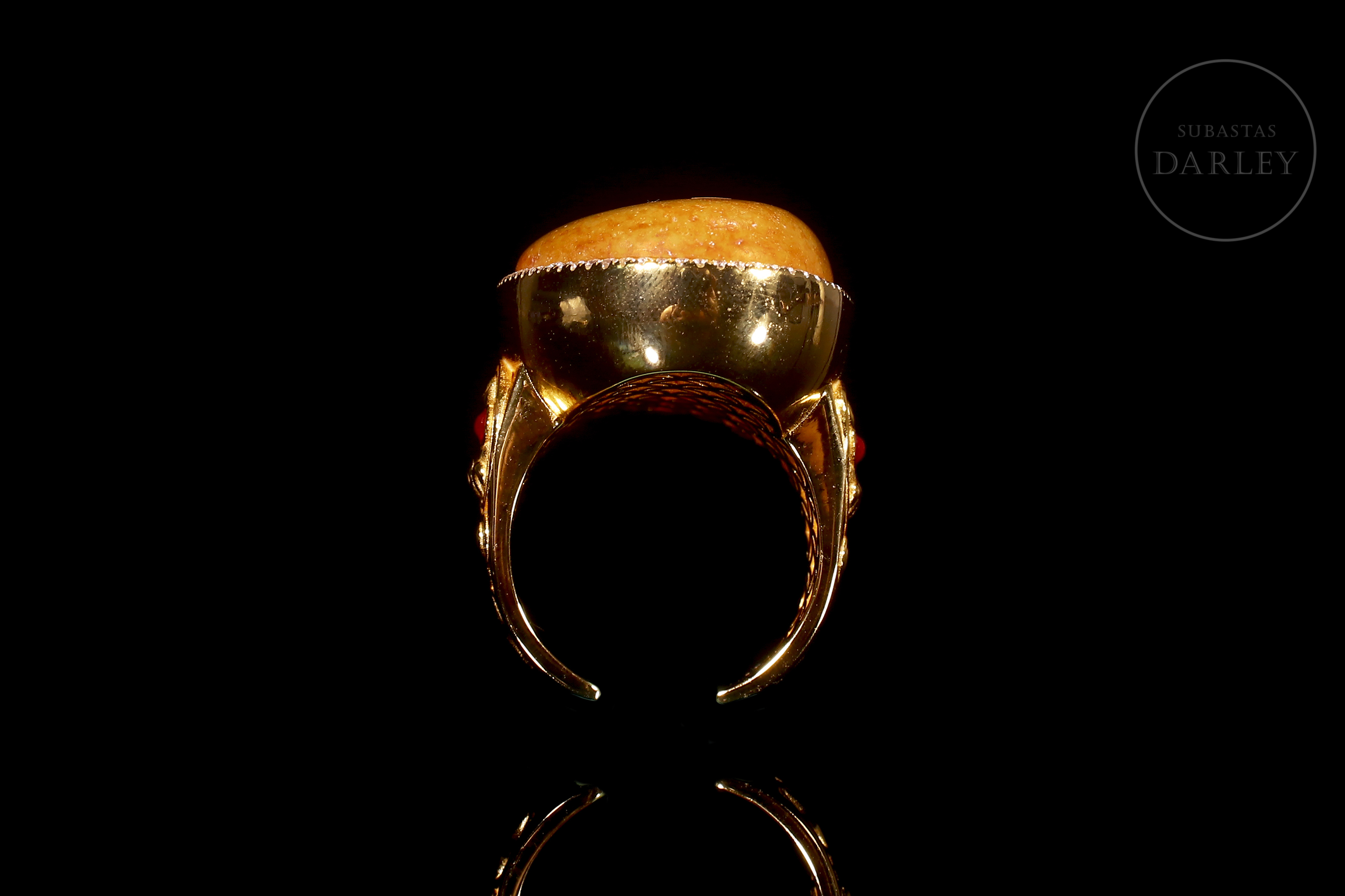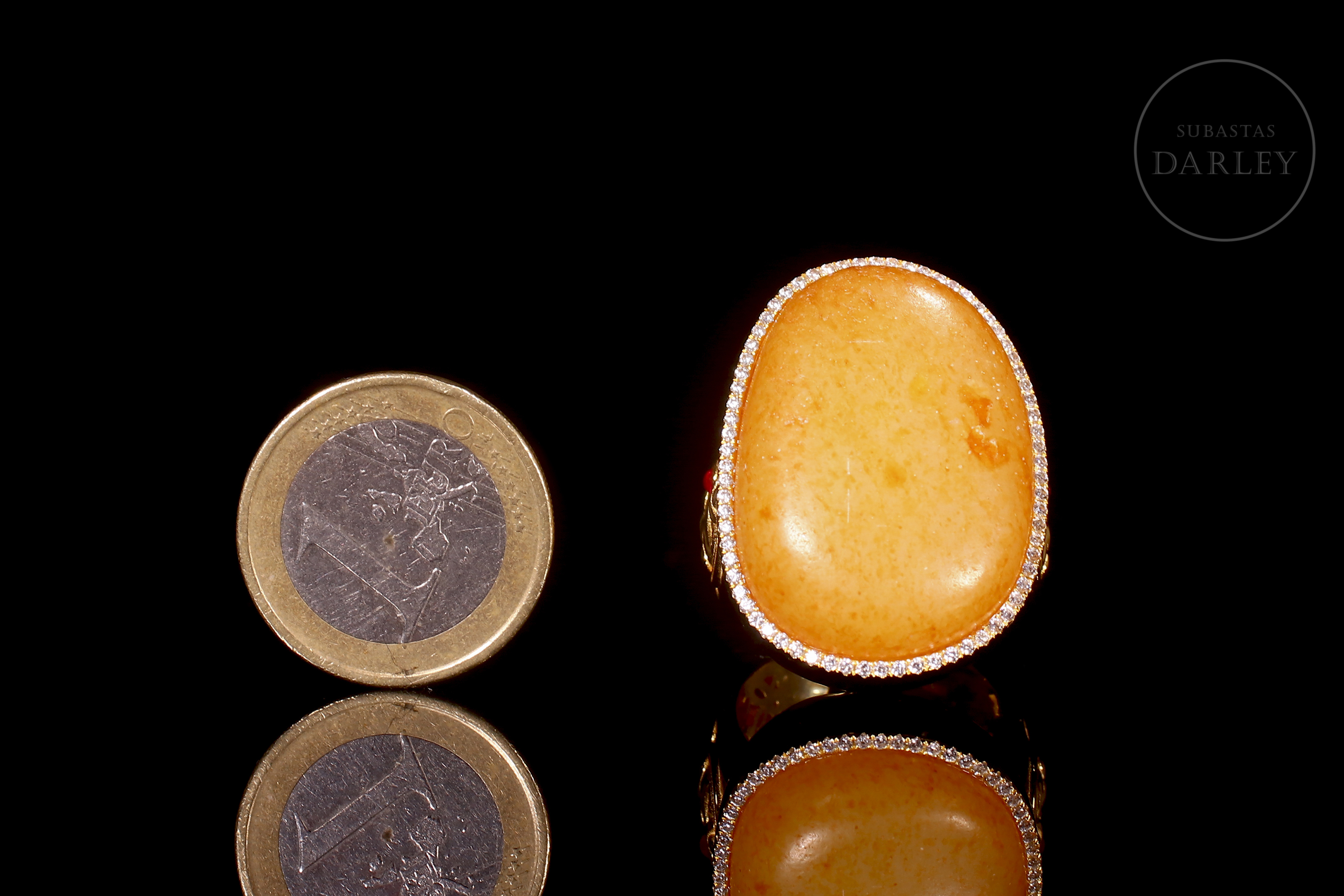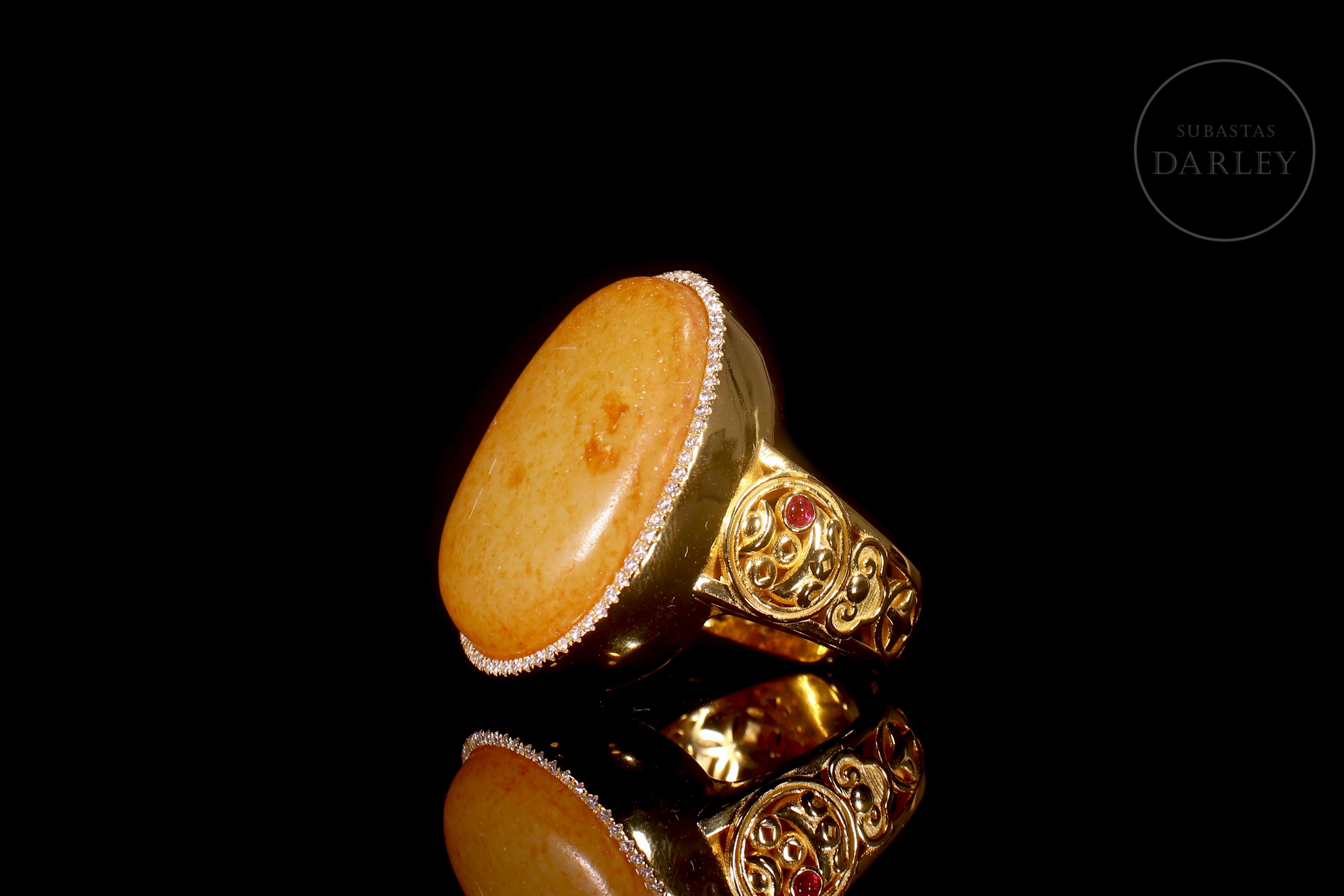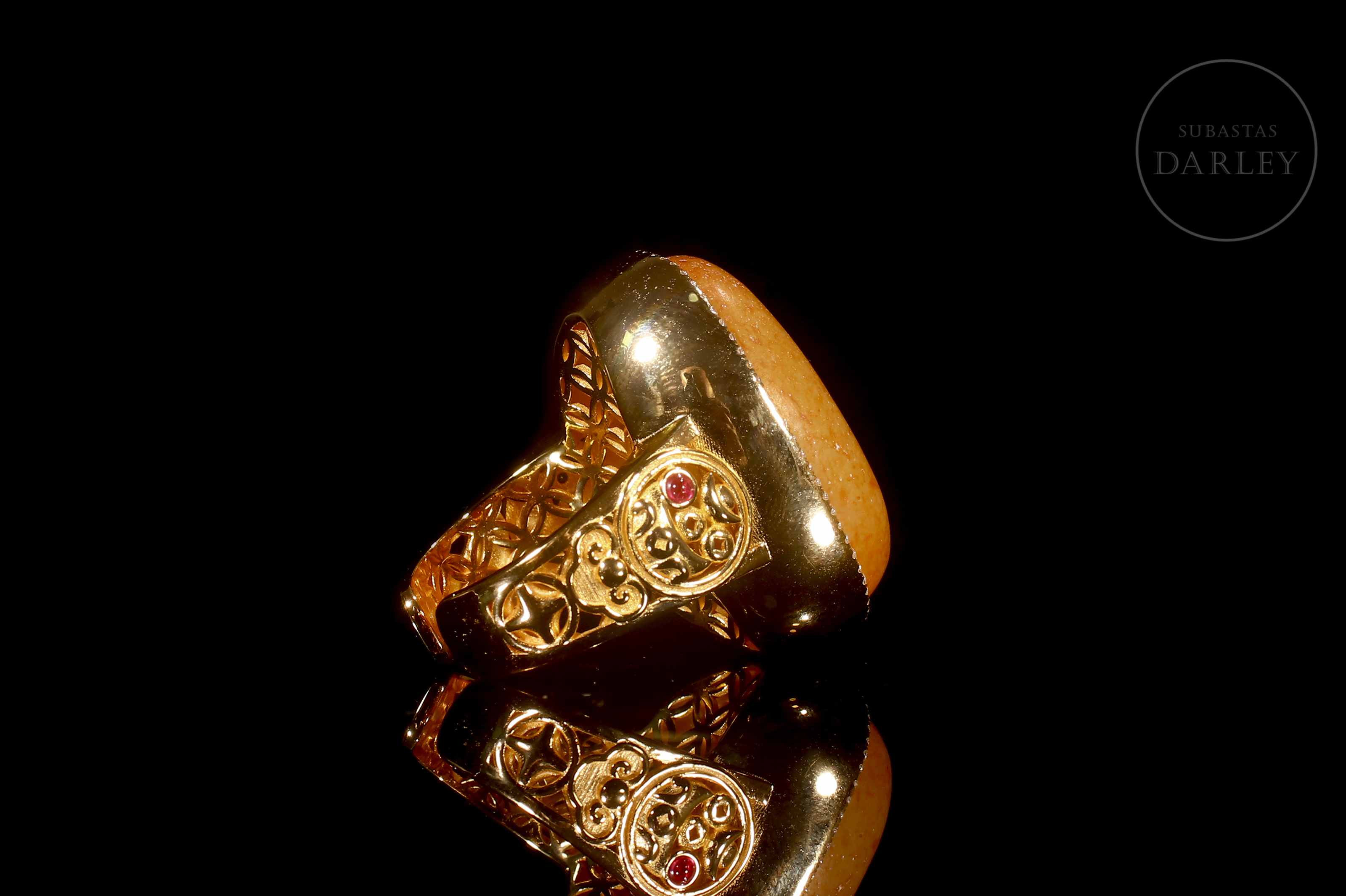 Openwork silver-gilt mount decorated with geometric motifs and a pink stone setting. In the center is a warm orange-toned Hetian jade surrounded by a border of fine transparent gems.