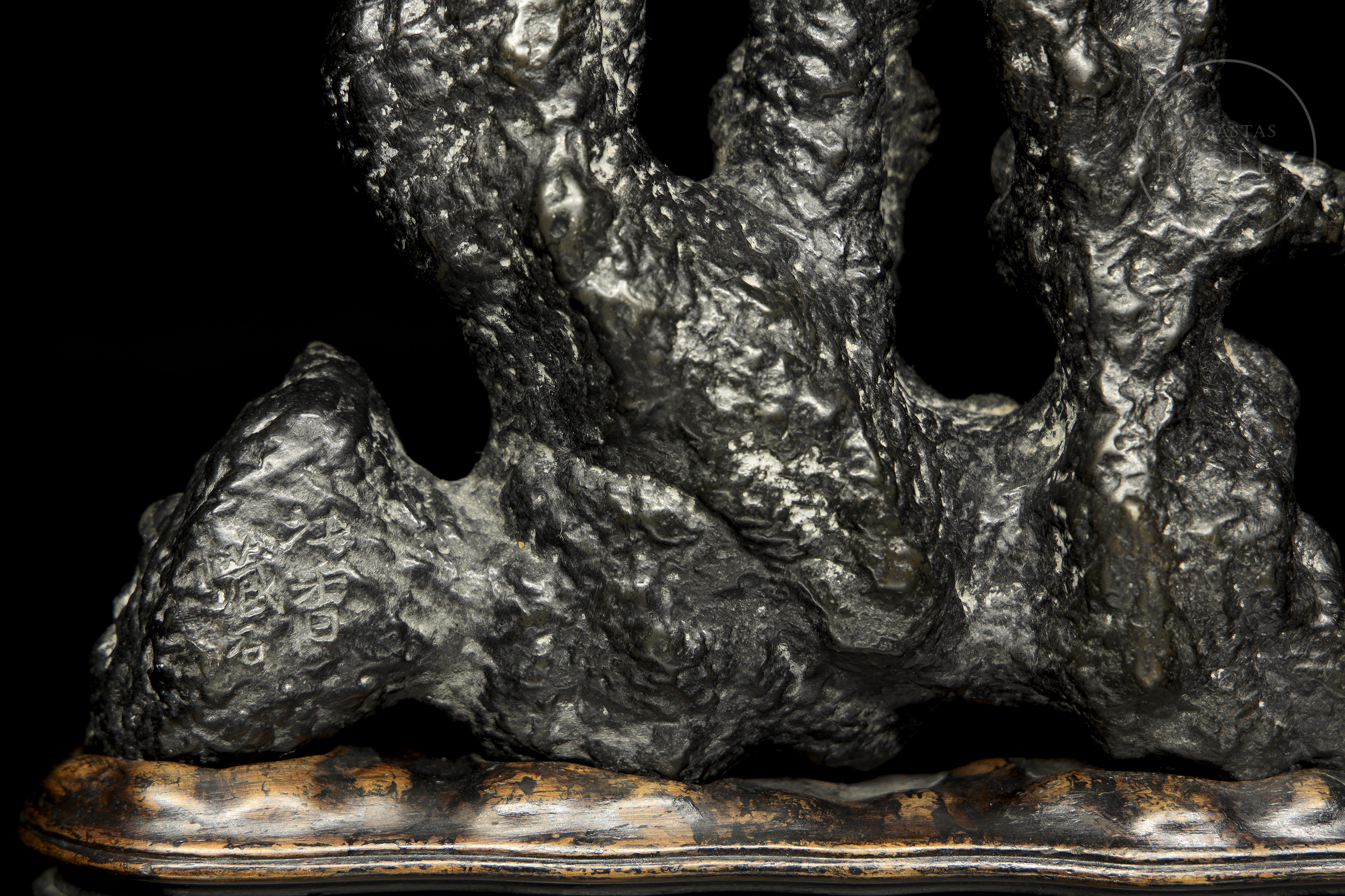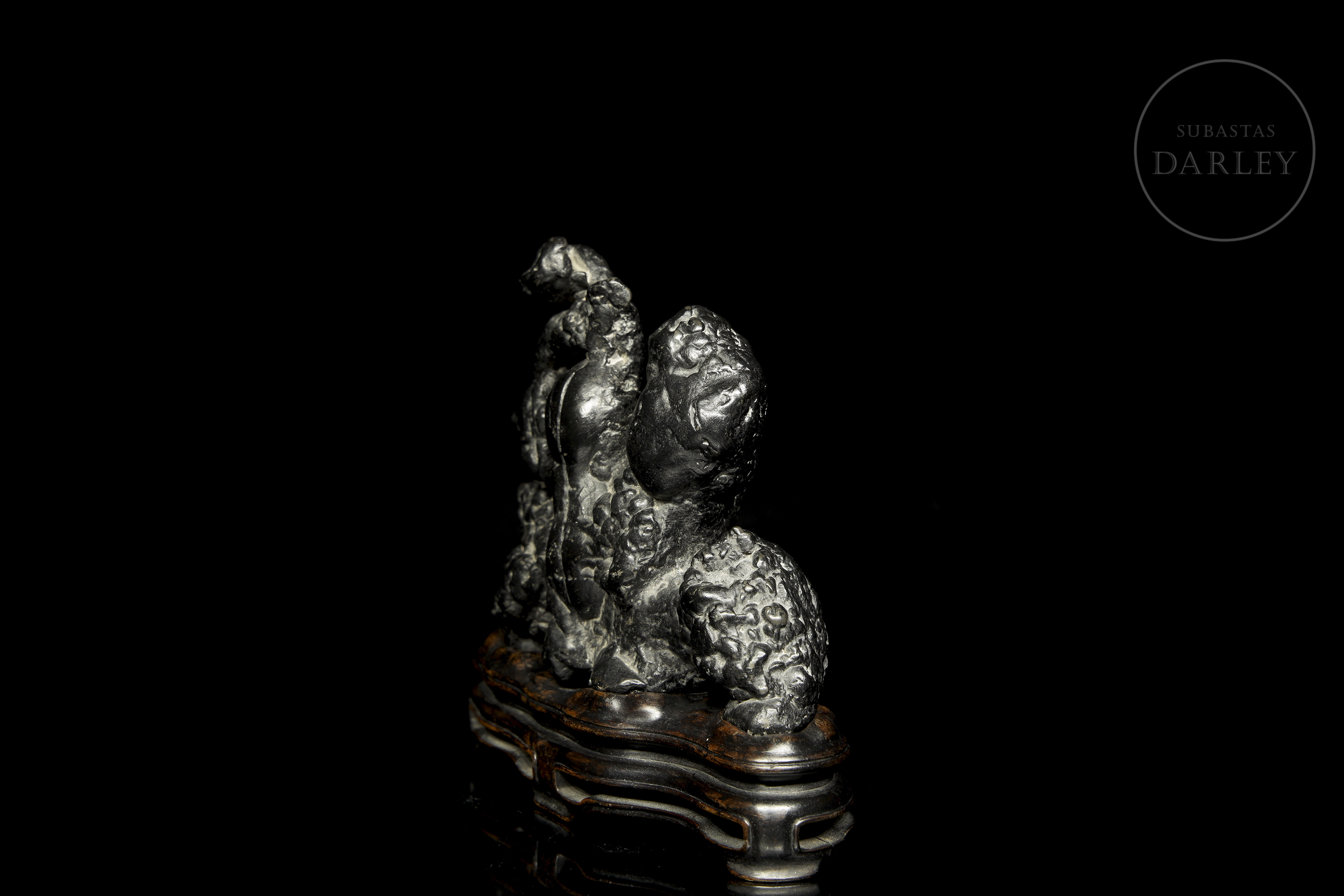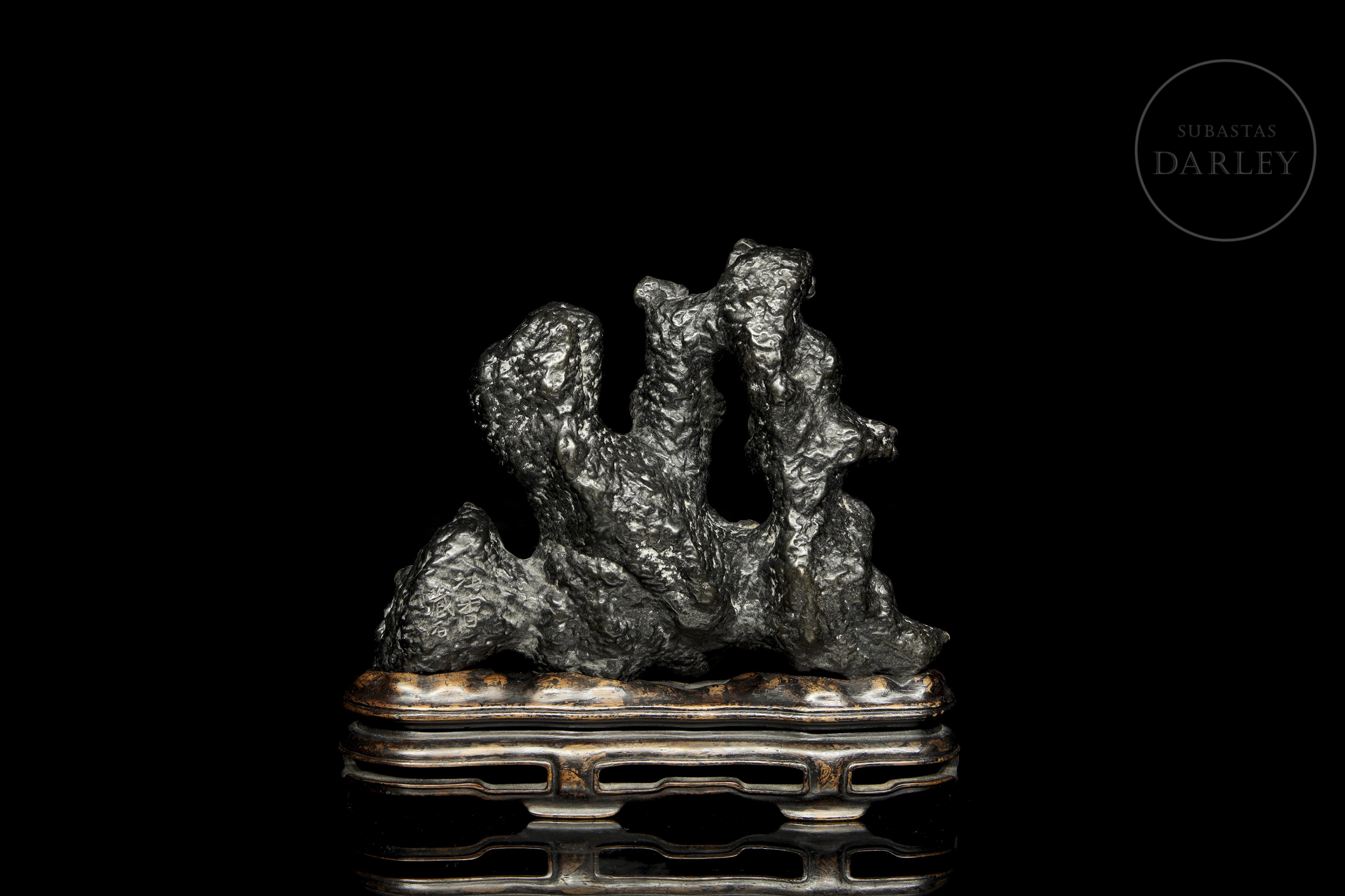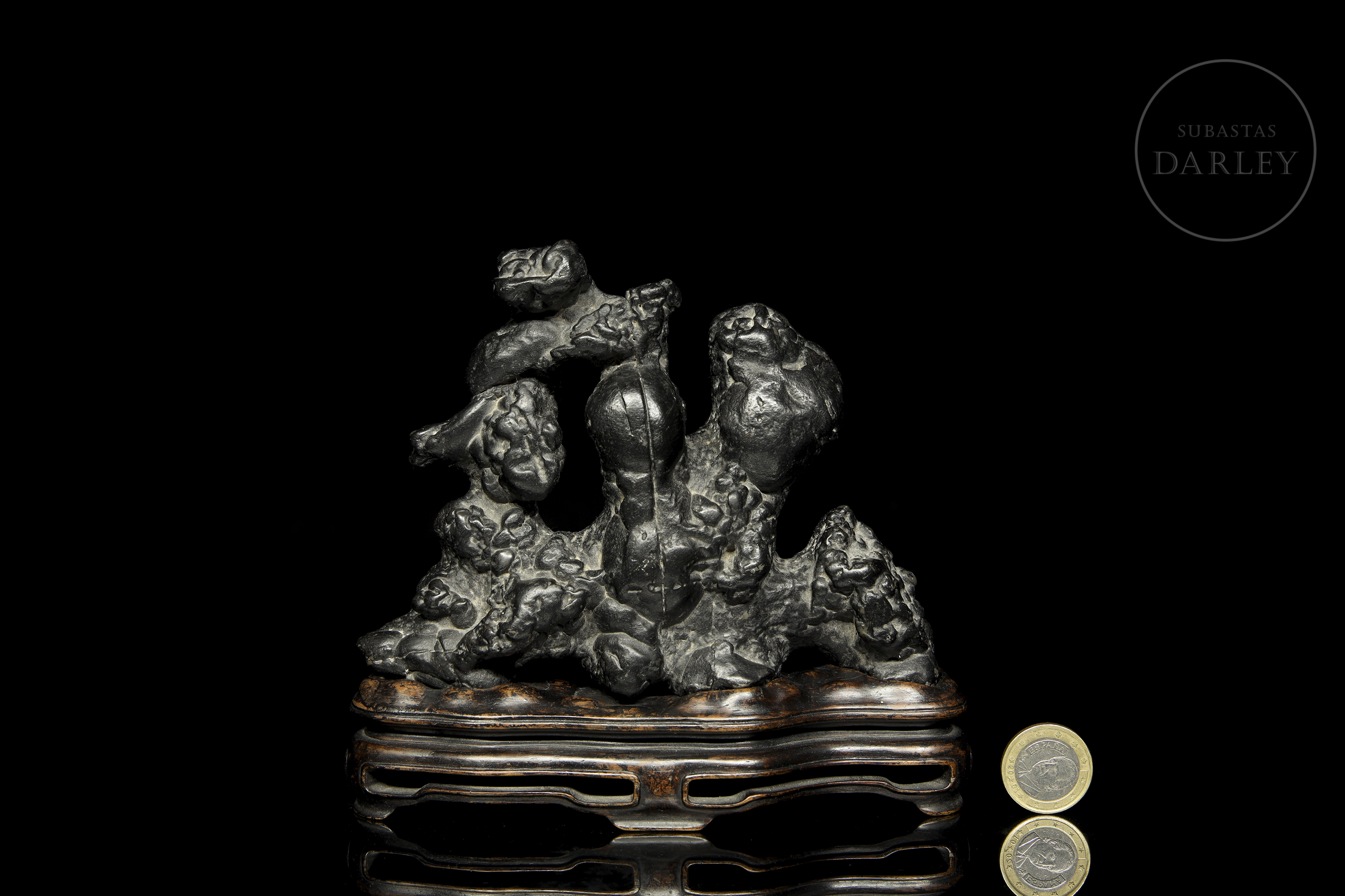 Natural sculpture, known as scholar's rock (gongshi), placed on a custom-made dark wood pedestal. The main piece is made of a dark, almost black material with a subtle metallic sheen. Its surface is extremely irregular and textured, with cavities and ridges. Its abstract, vertical form evokes a miniature mountain landscape, much appreciated in the aesthetics of scholars.