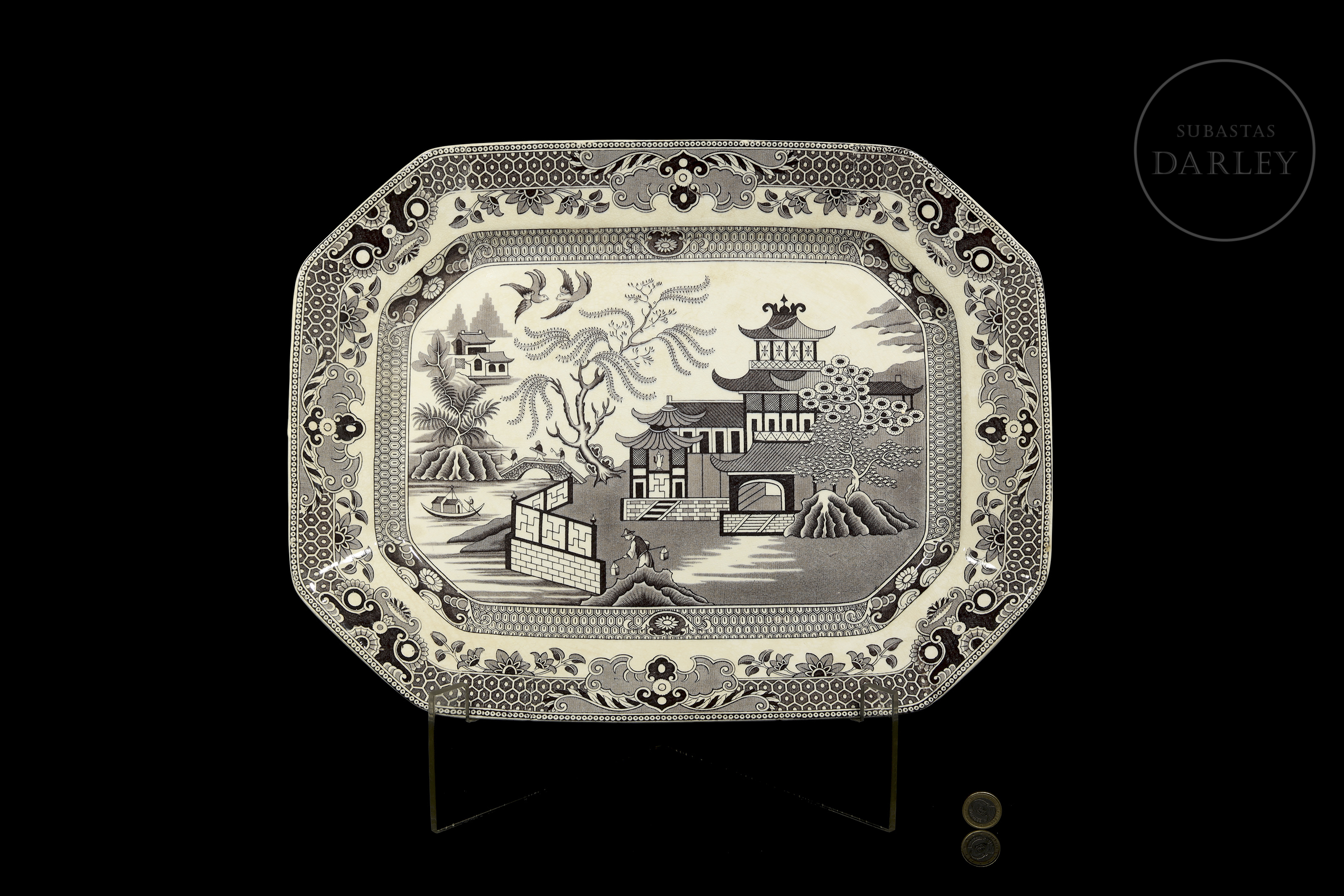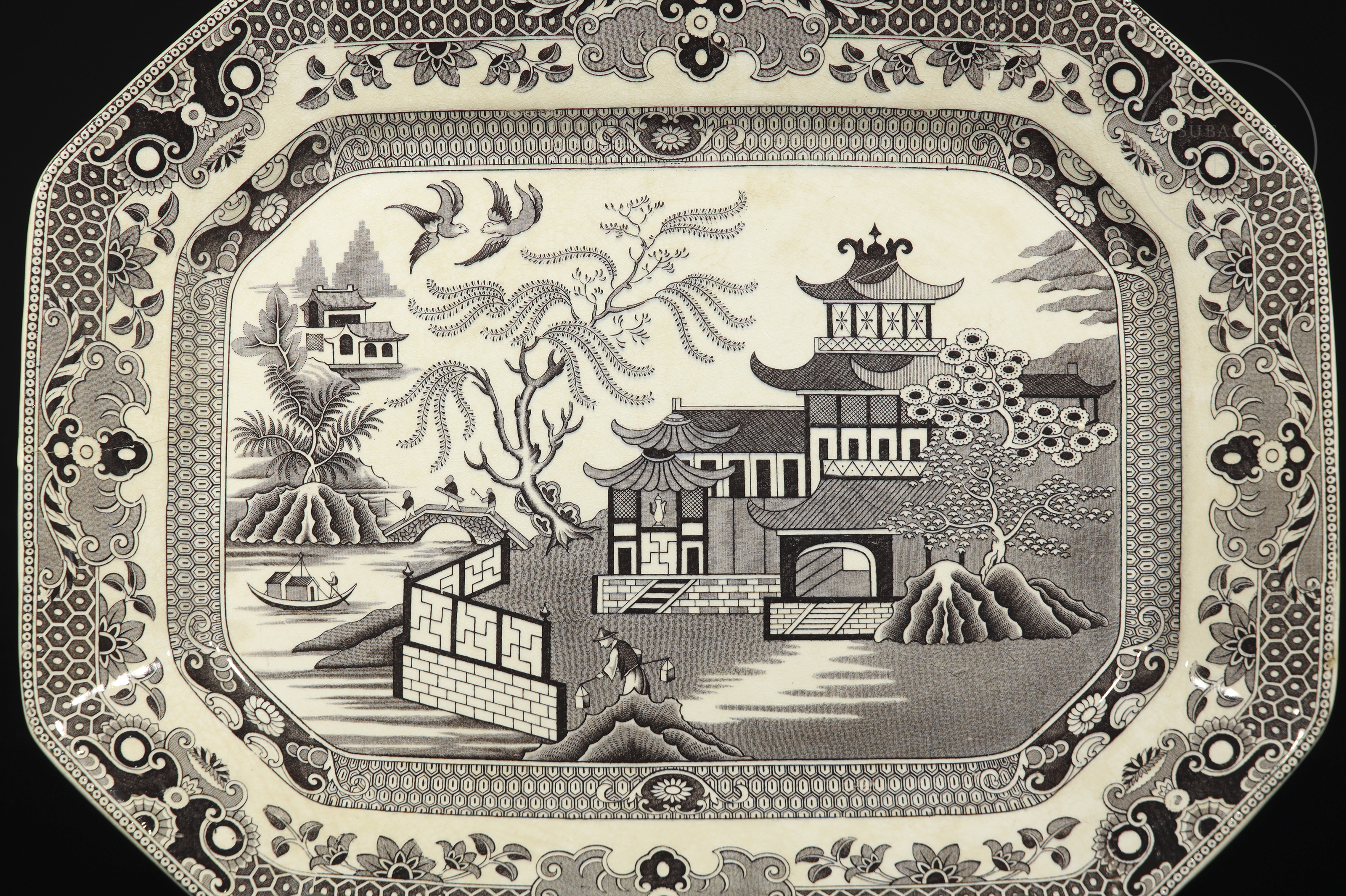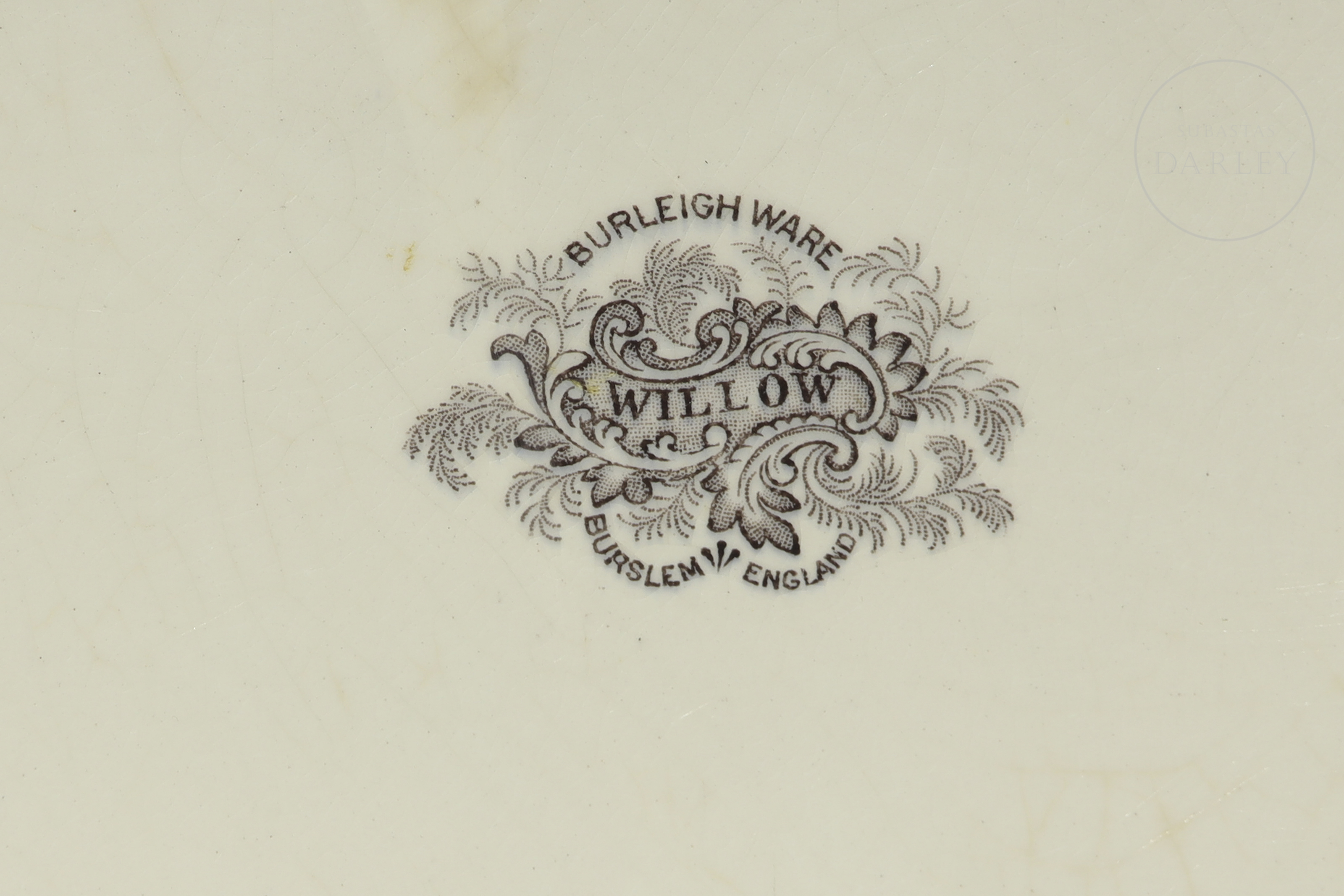 这款托盘是伯利瓷器(Burleigh Ware,原名伯吉斯与利Burgess & Leigh)出品的“黑柳”图案餐盘。虽然柳树图案的原始设计可以追溯到18世纪,但伯利瓷器生产这款餐盘的时间是在20世纪初。