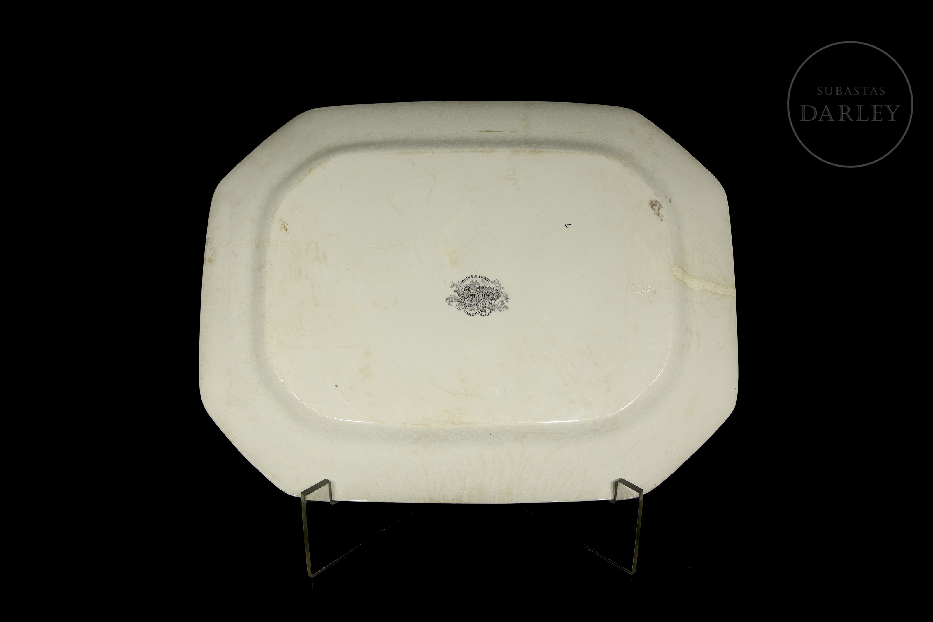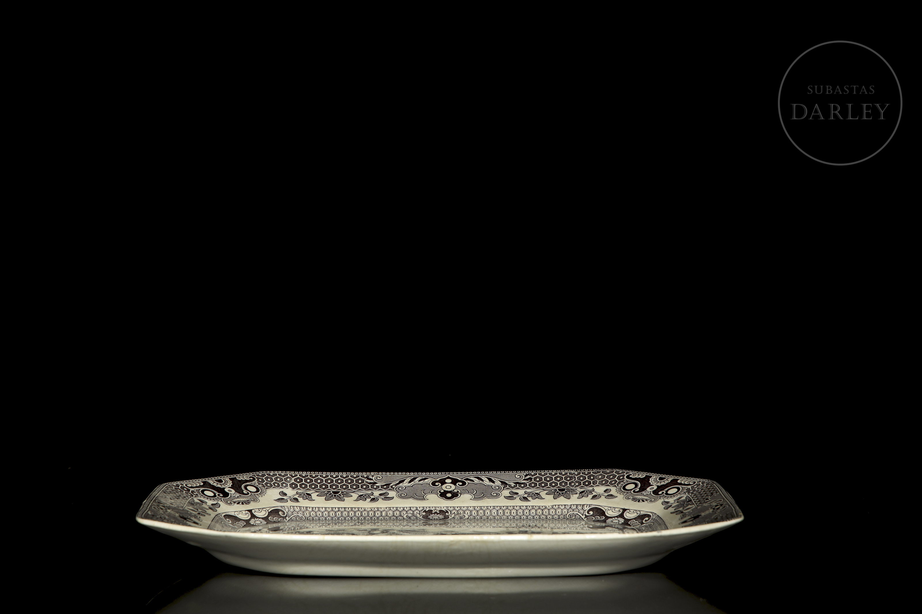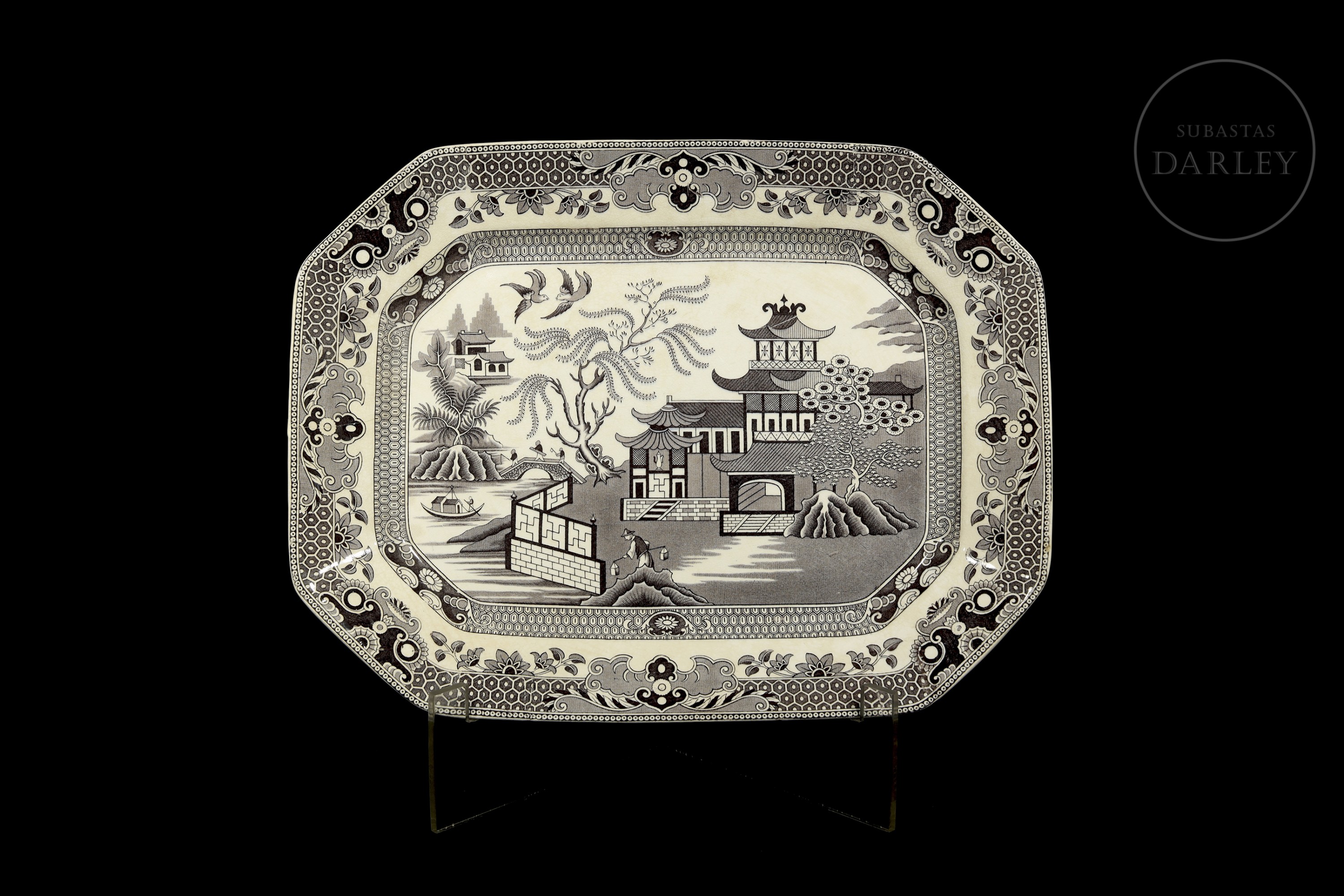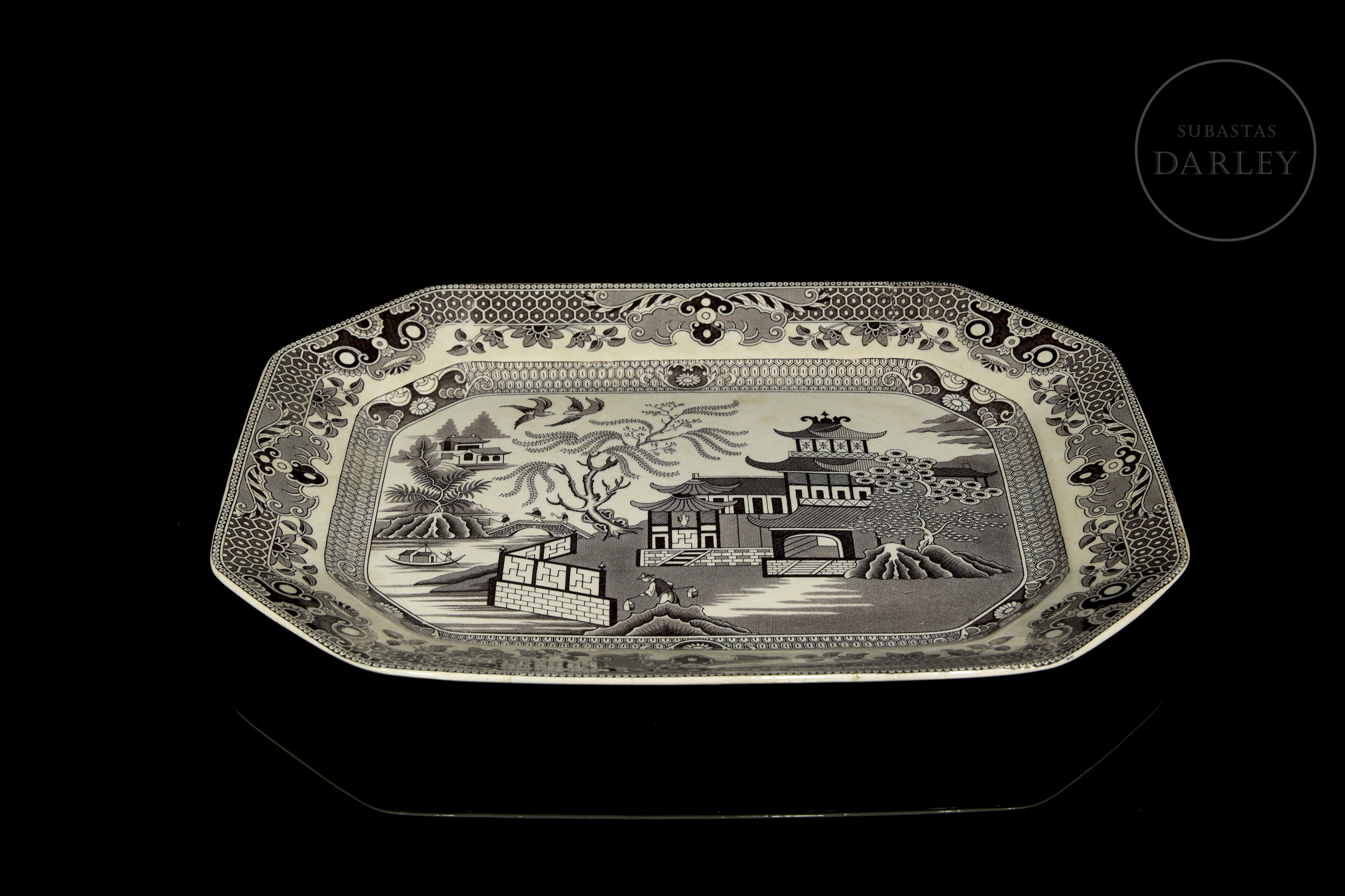这款托盘是伯利瓷器(Burleigh Ware,原名伯吉斯与利Burgess & Leigh)出品的“黑柳”图案餐盘。虽然柳树图案的原始设计可以追溯到18世纪,但伯利瓷器生产这款餐盘的时间是在20世纪初。