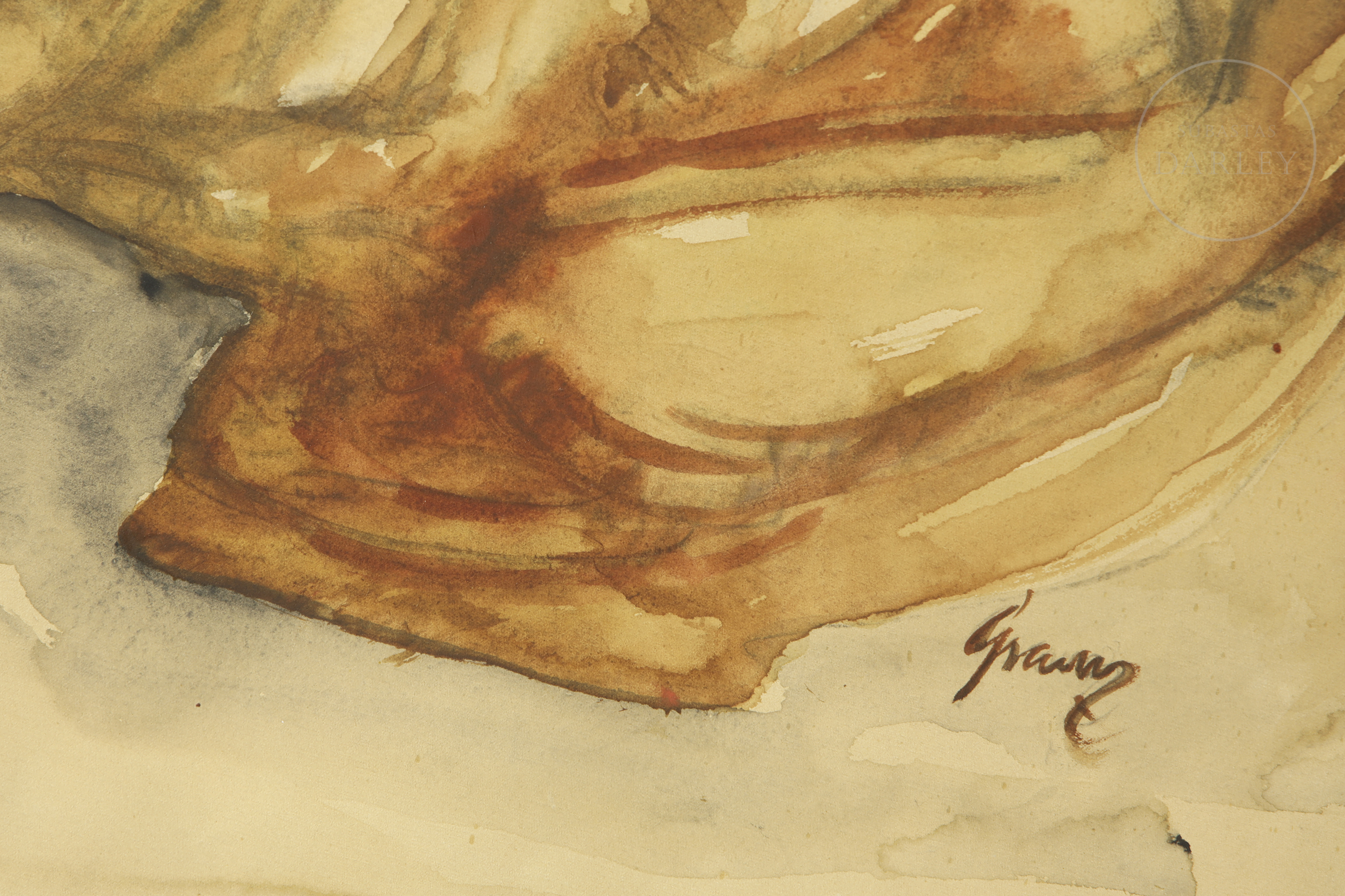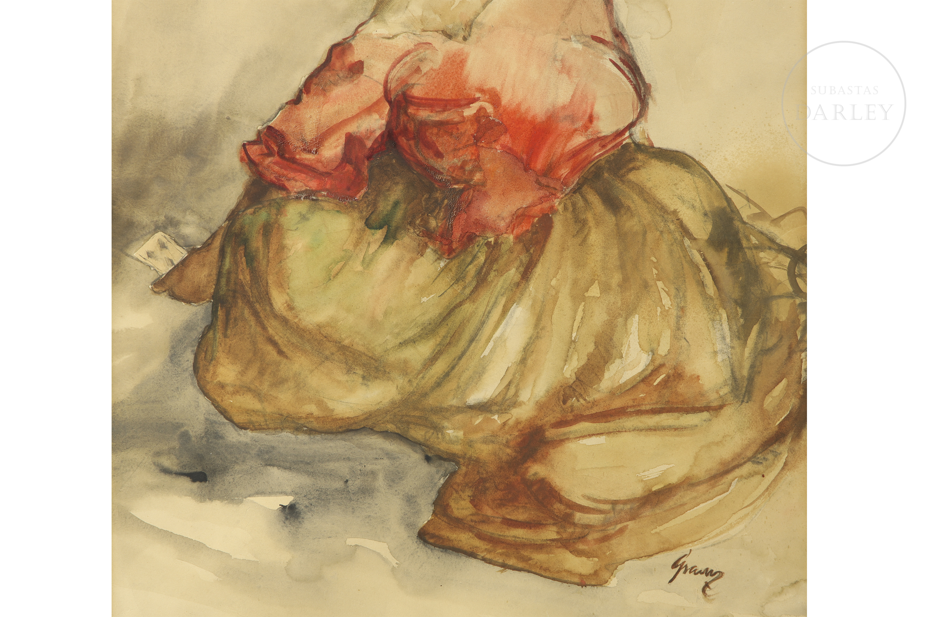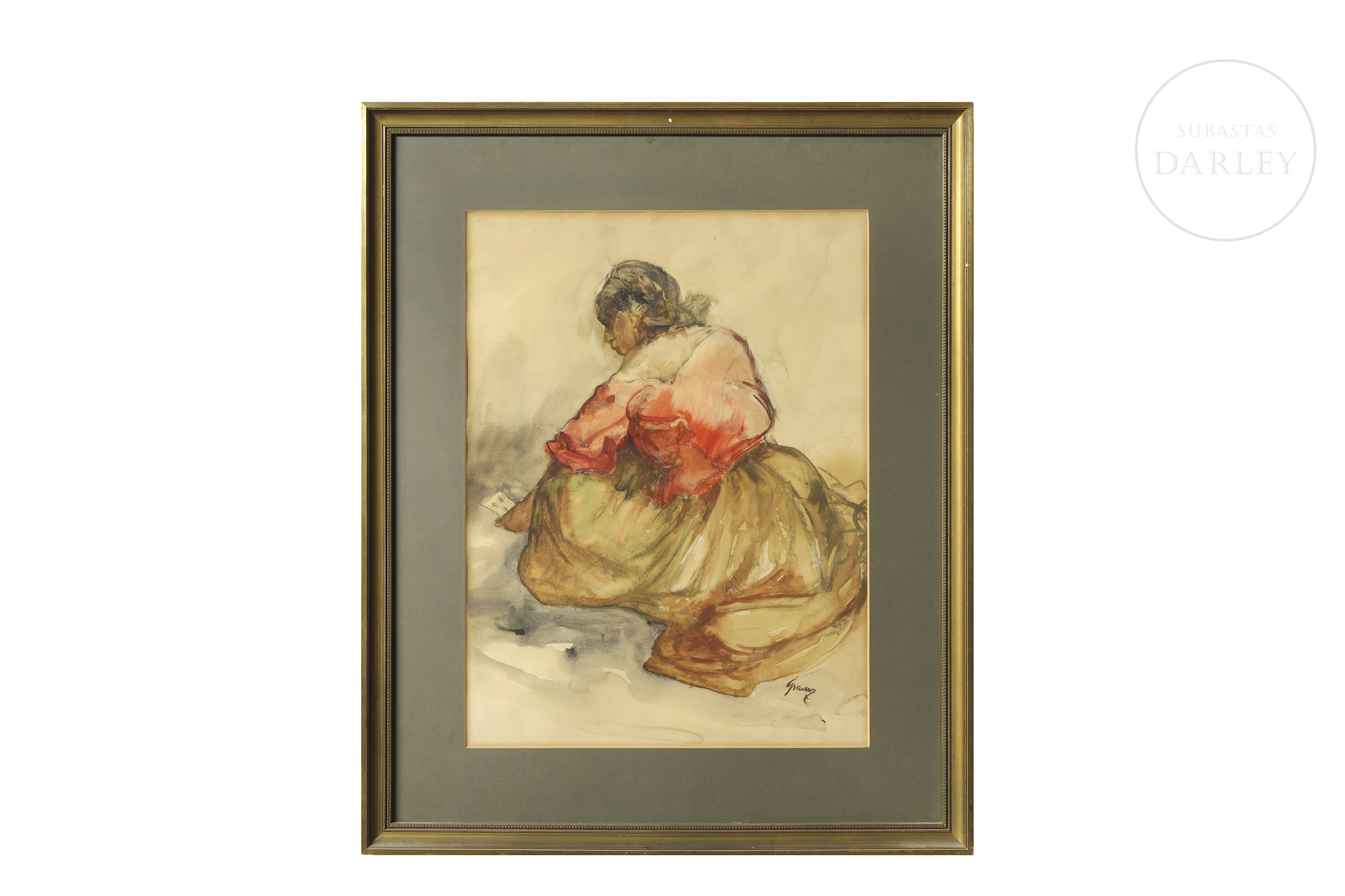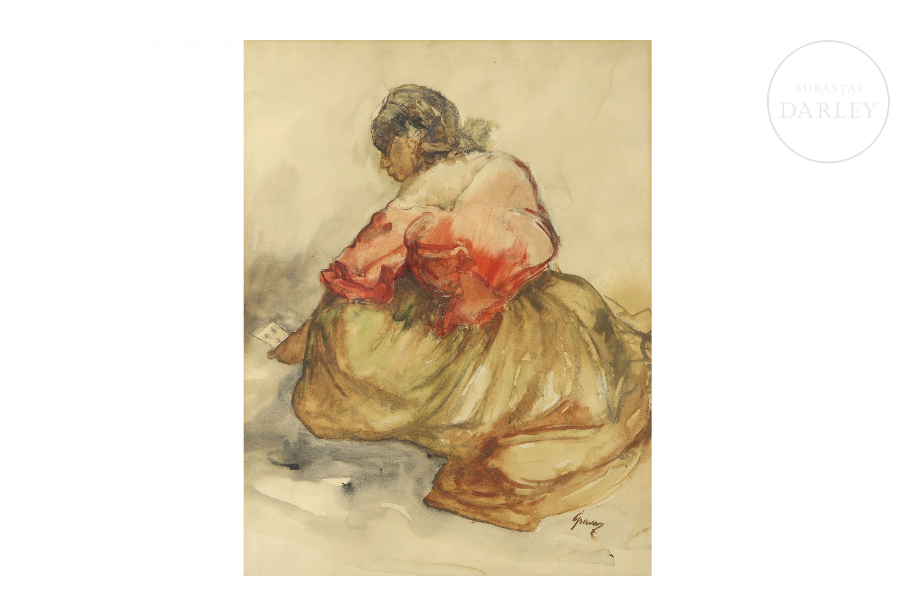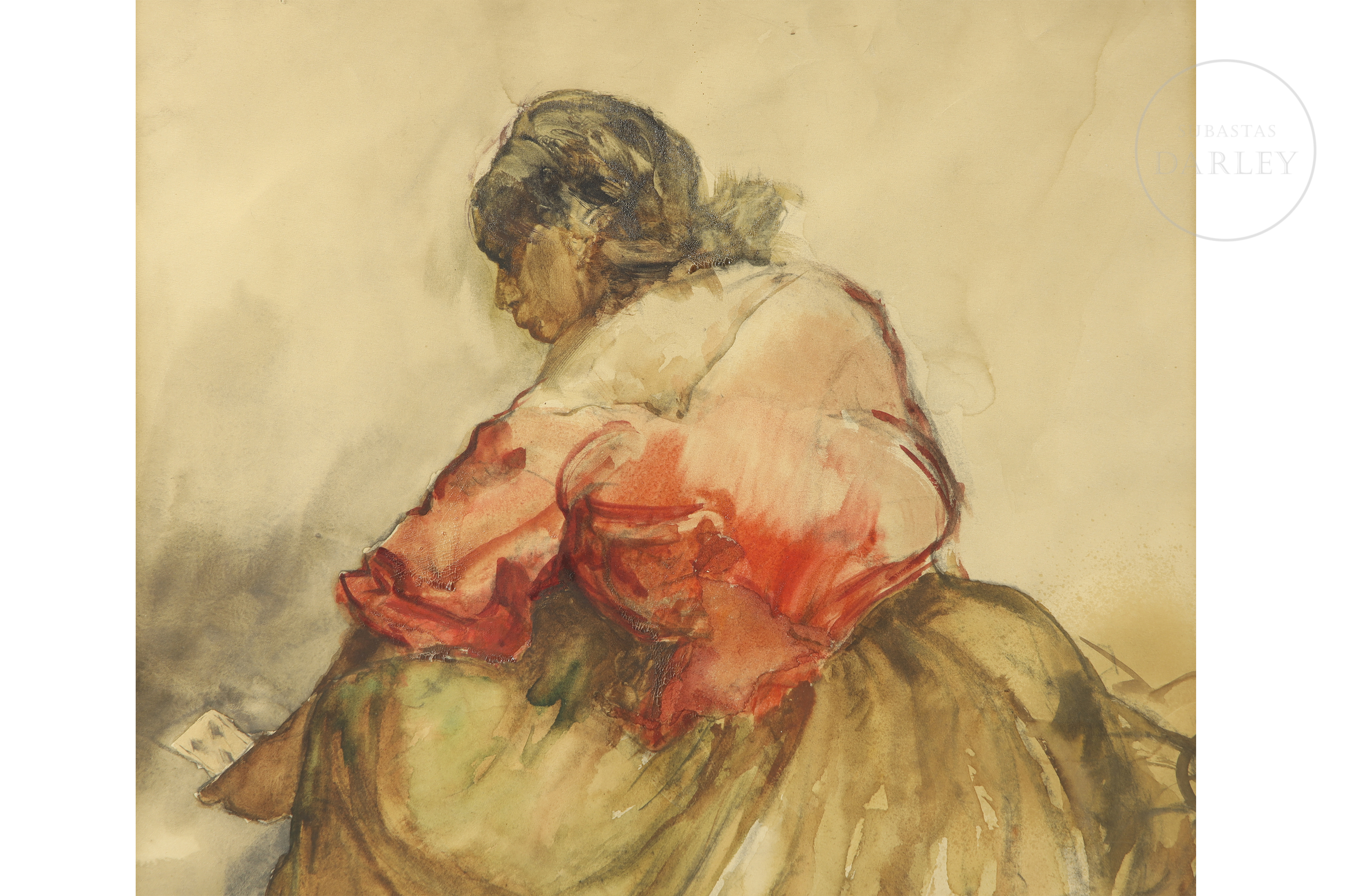 Watercolor on paper. Depicts a seated female figure, with her back to the viewer, dressed in an ochre skirt and red blouse, in an introspective pose while holding some letters. Signed in the lower right corner.