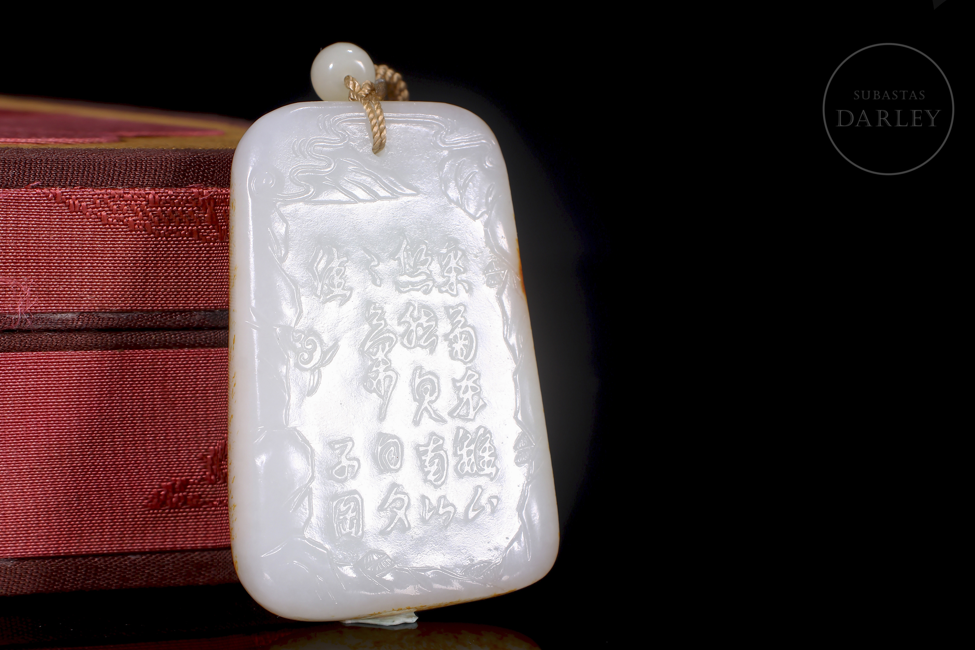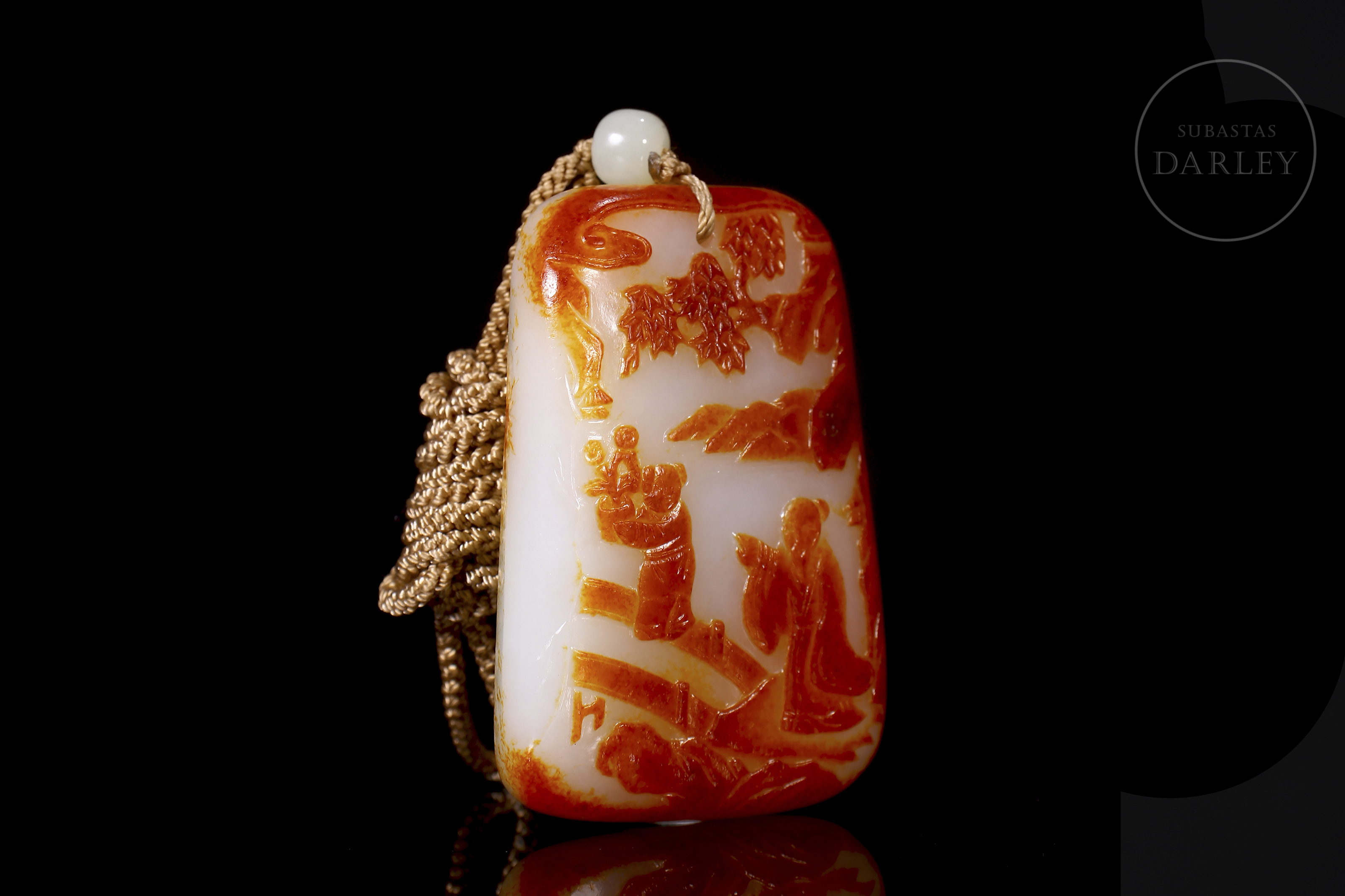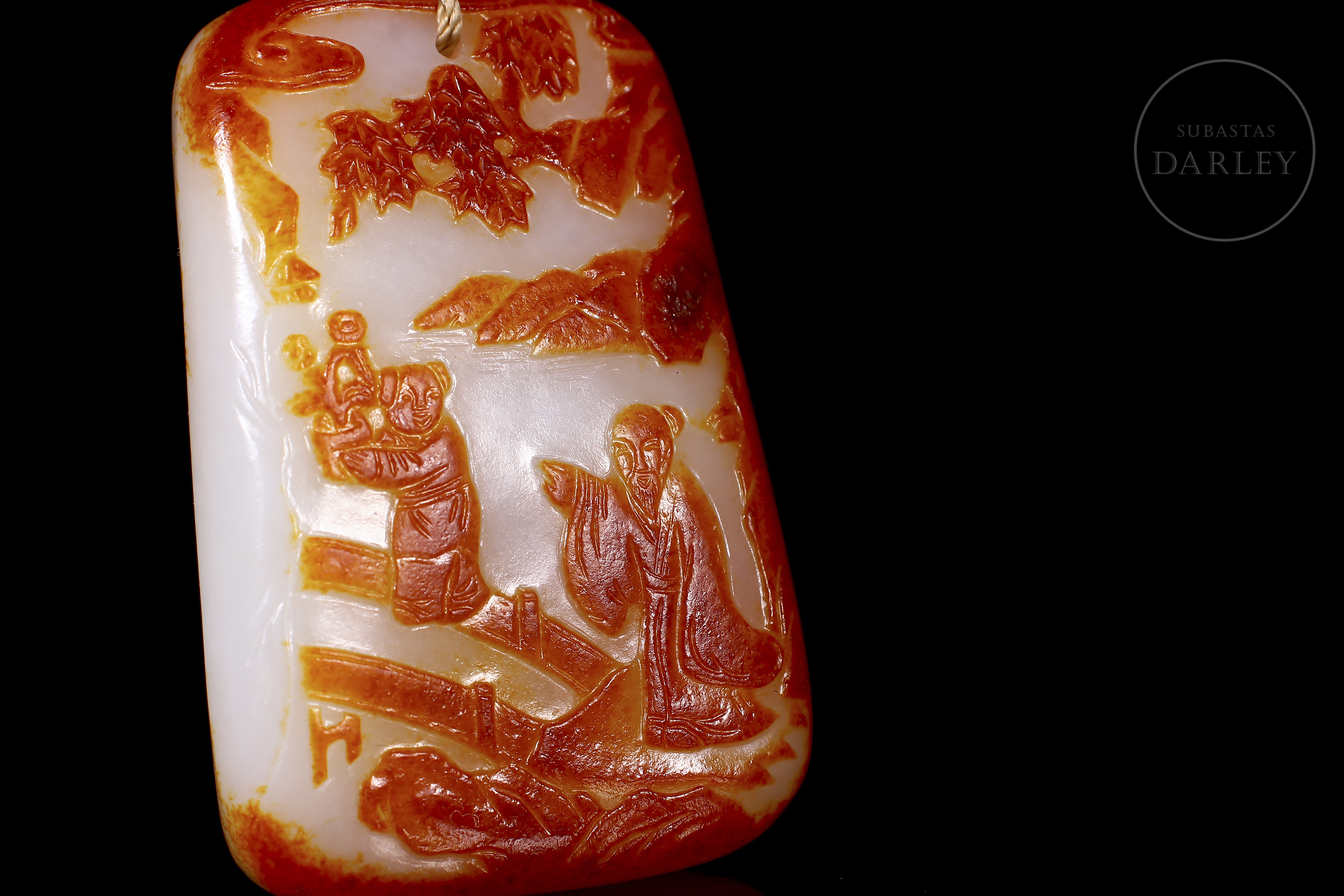 和田玉匾,长方形,边角圆润。玉质洁白,覆以浓郁的红褐色“锈皮”。正面浮雕描绘两位文人雅士在松石环绕的园林中漫步的场景,雕刻技法巧妙地运用了红褐色包浆。背面镌刻诗句及浮雕款识“子冈”。配特制衬里盒。清代(1644–1912)。