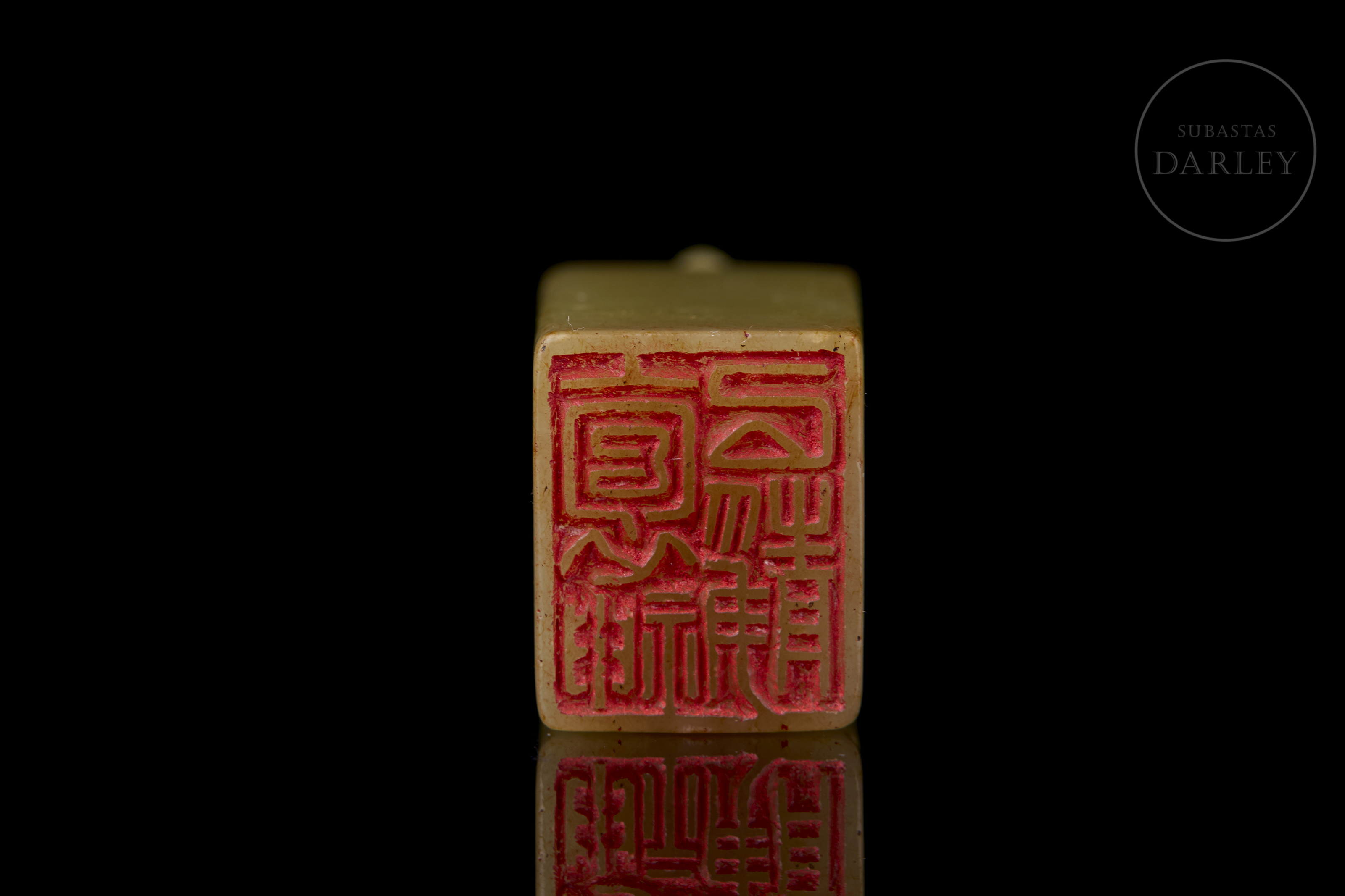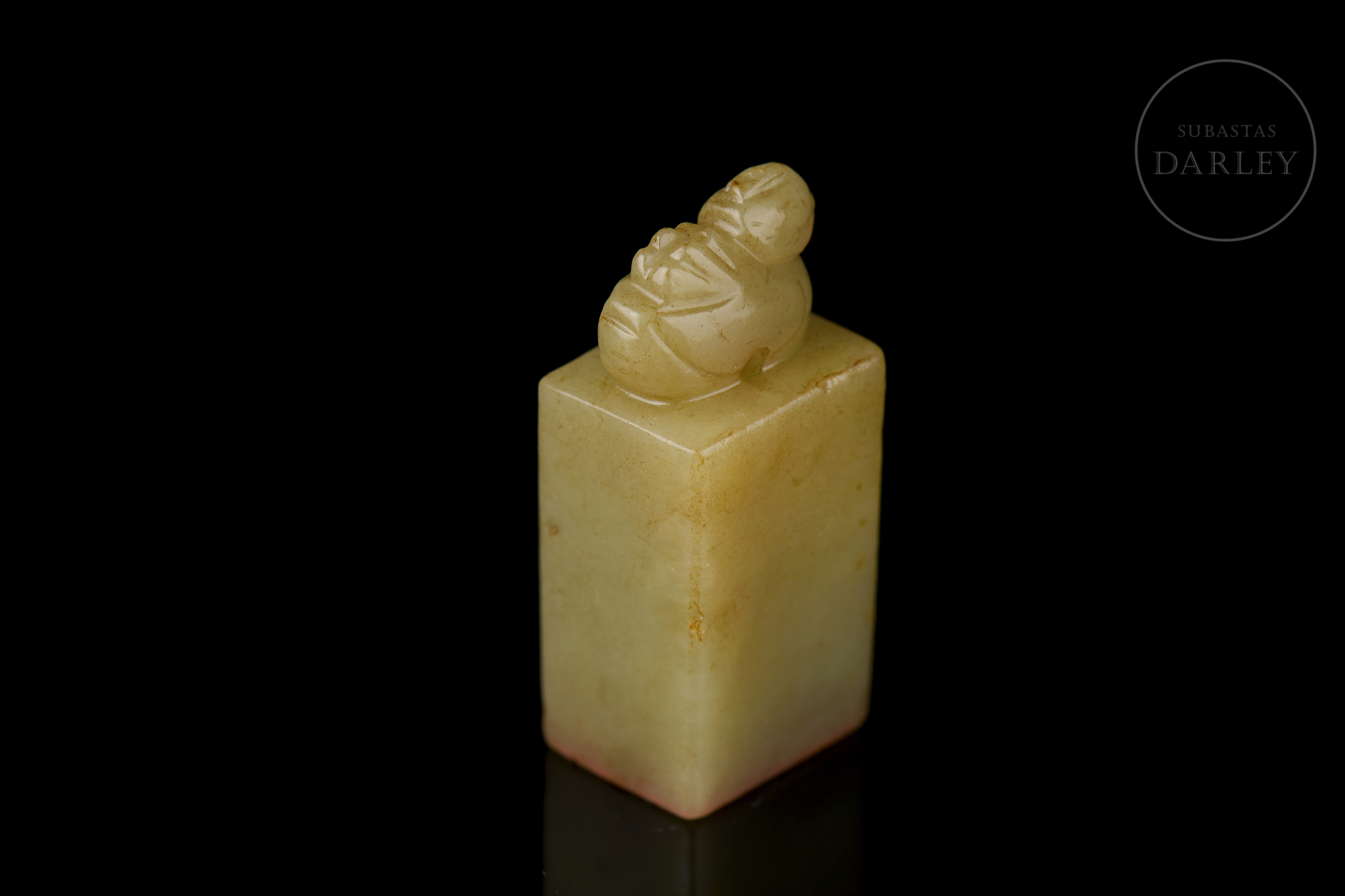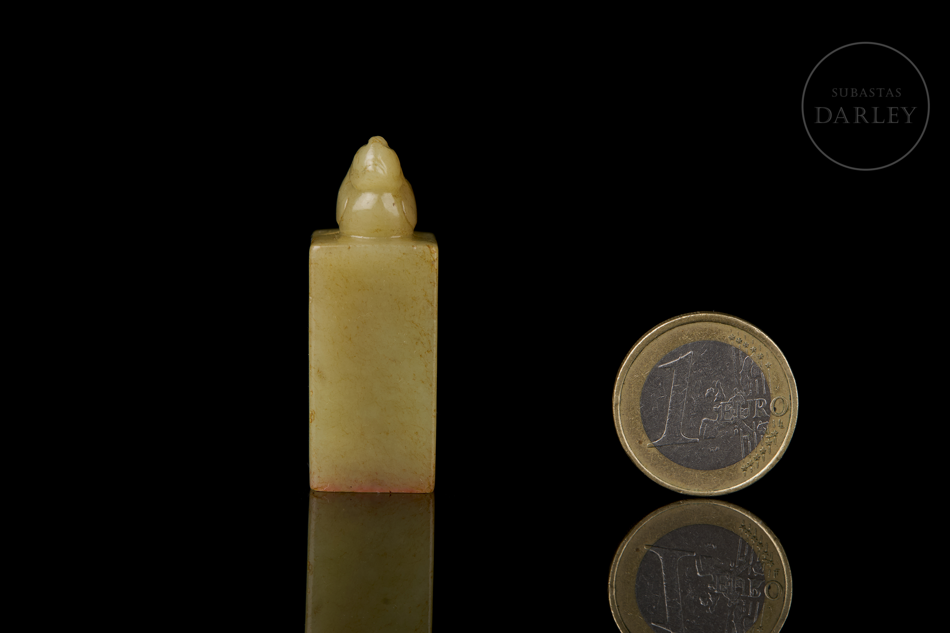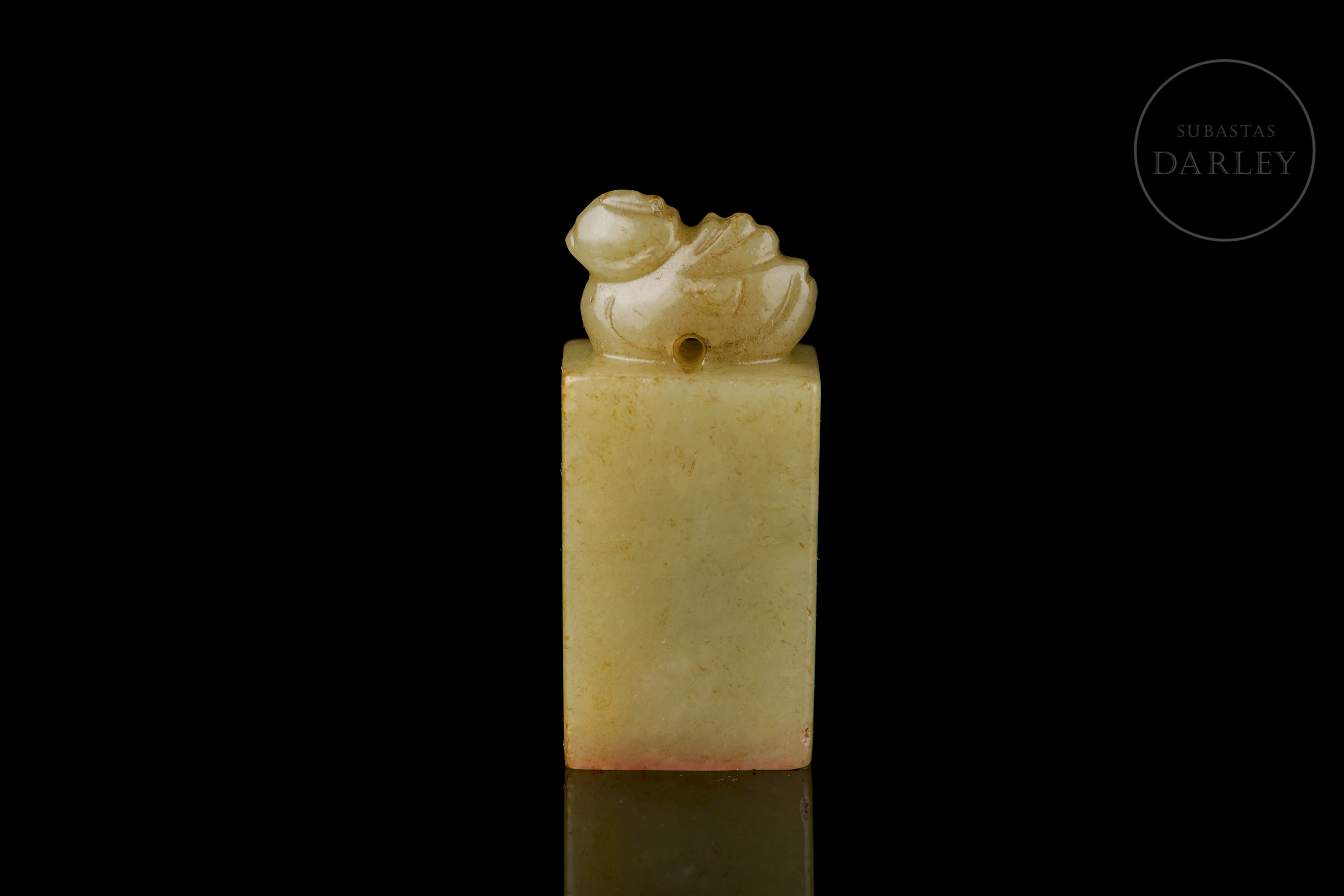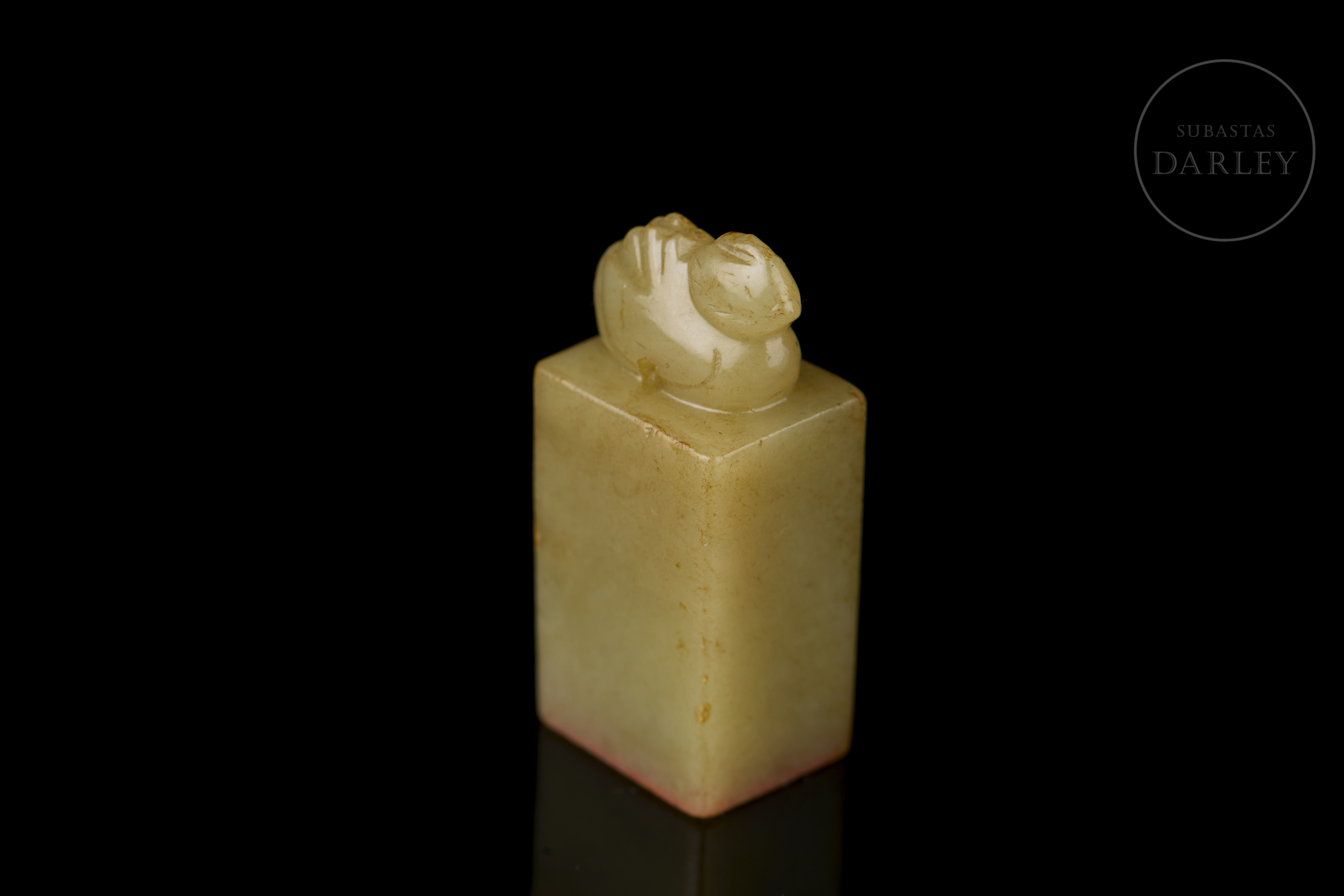 Seal carved from yellowish Hetian jade with slight ochre inclusions. It is rectangular, crowned by a relief figure of a reclining mandarin duck, worked with simplicity and softness. The base is inscribed with the characters ‘抱神以静’.