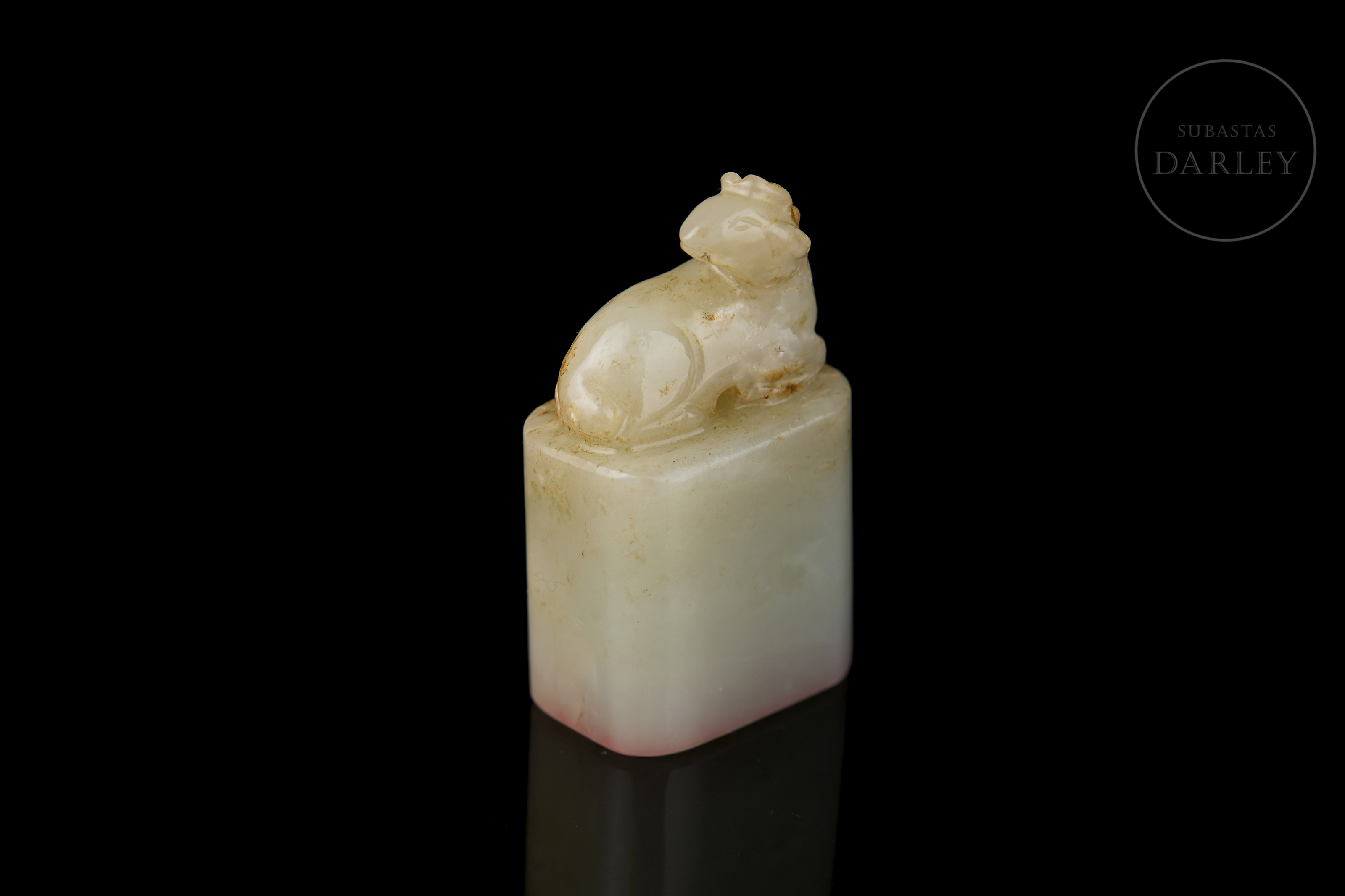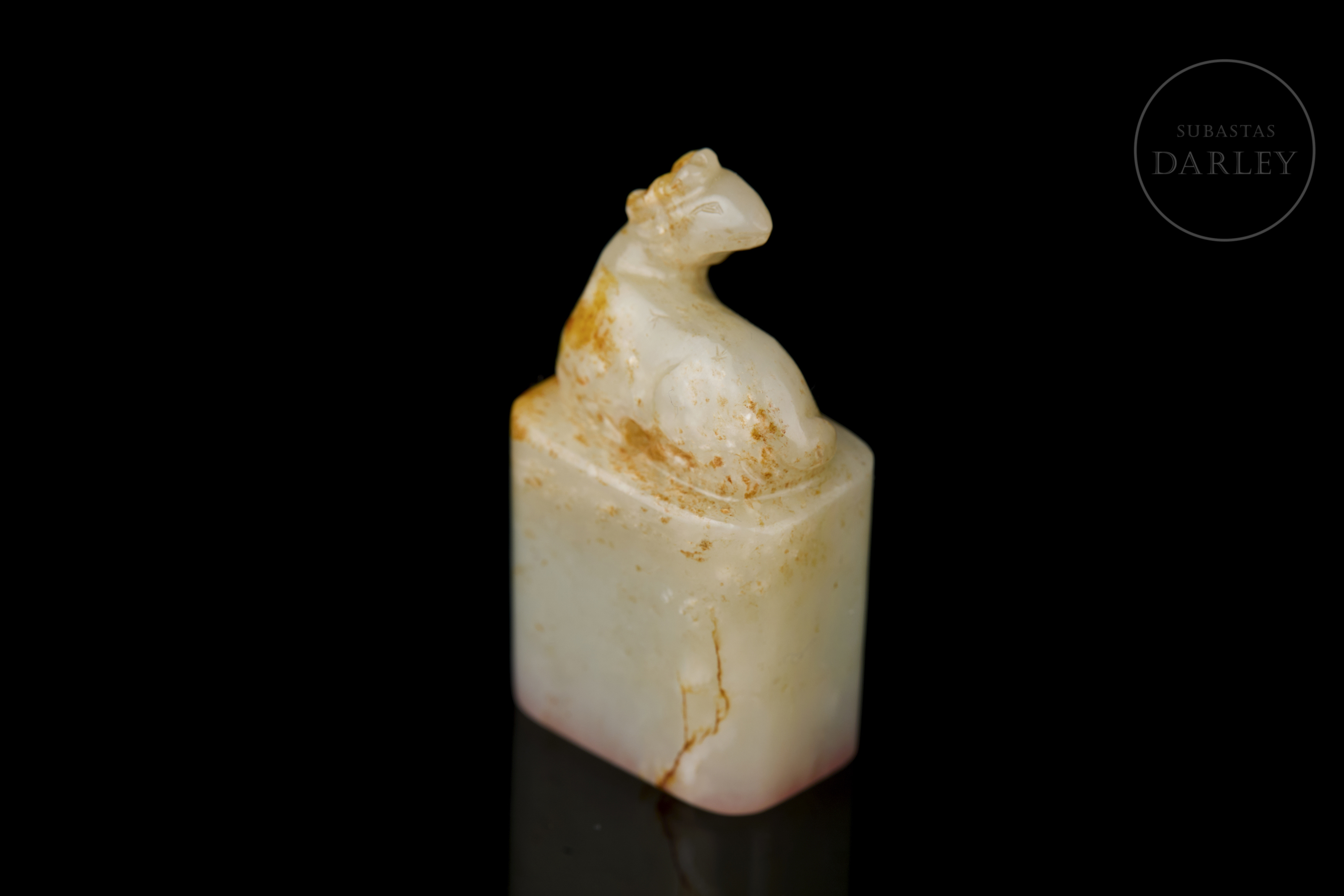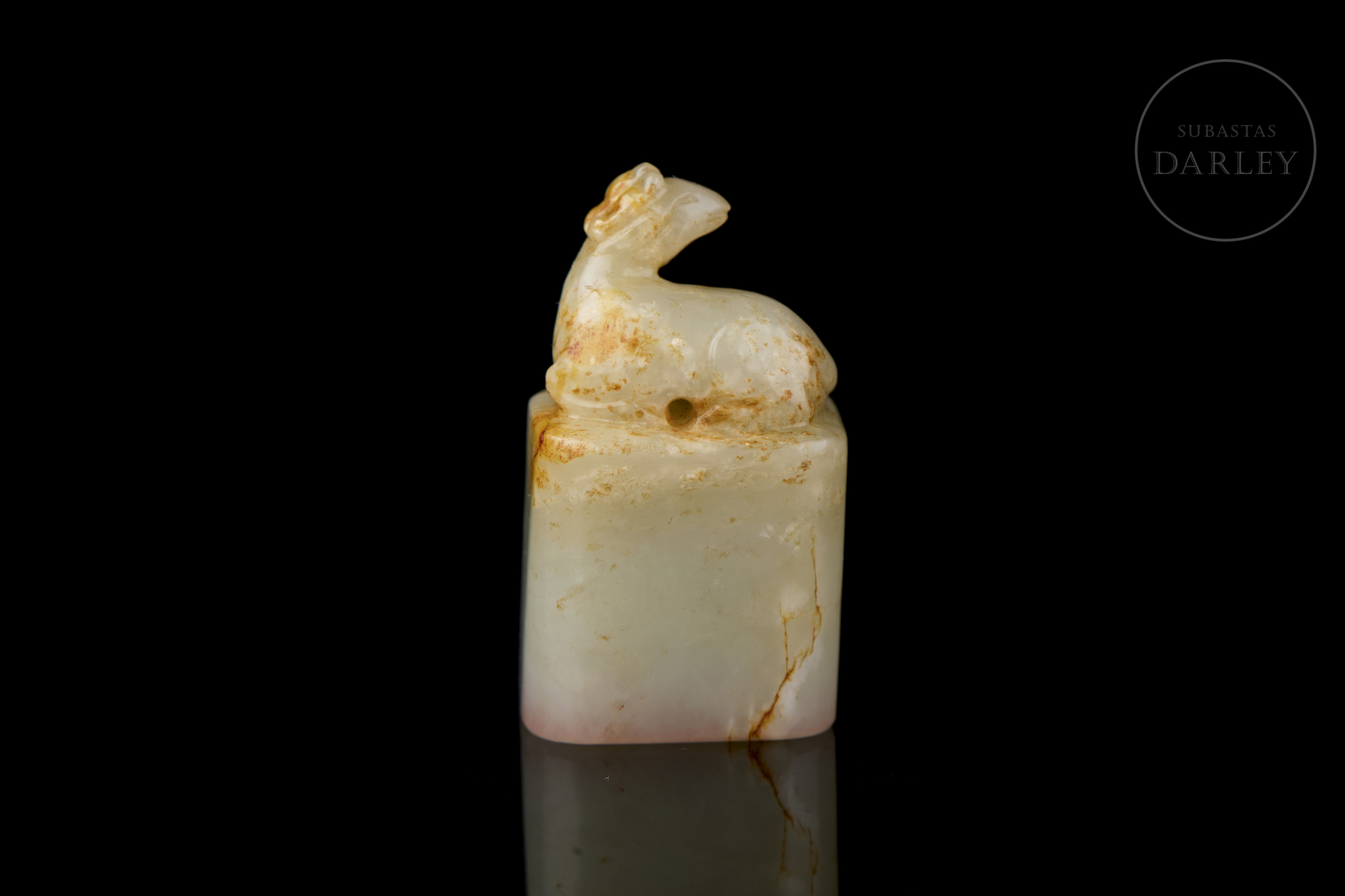Seal carved from Hetian jade in whitish tones with ochre veins and slight transparency. It has a rectangular base with rounded corners, crowned by the figure of a reclining ram with soft forms and its head turned. The seal is engraved with the characters ‘慎思’ on the base.