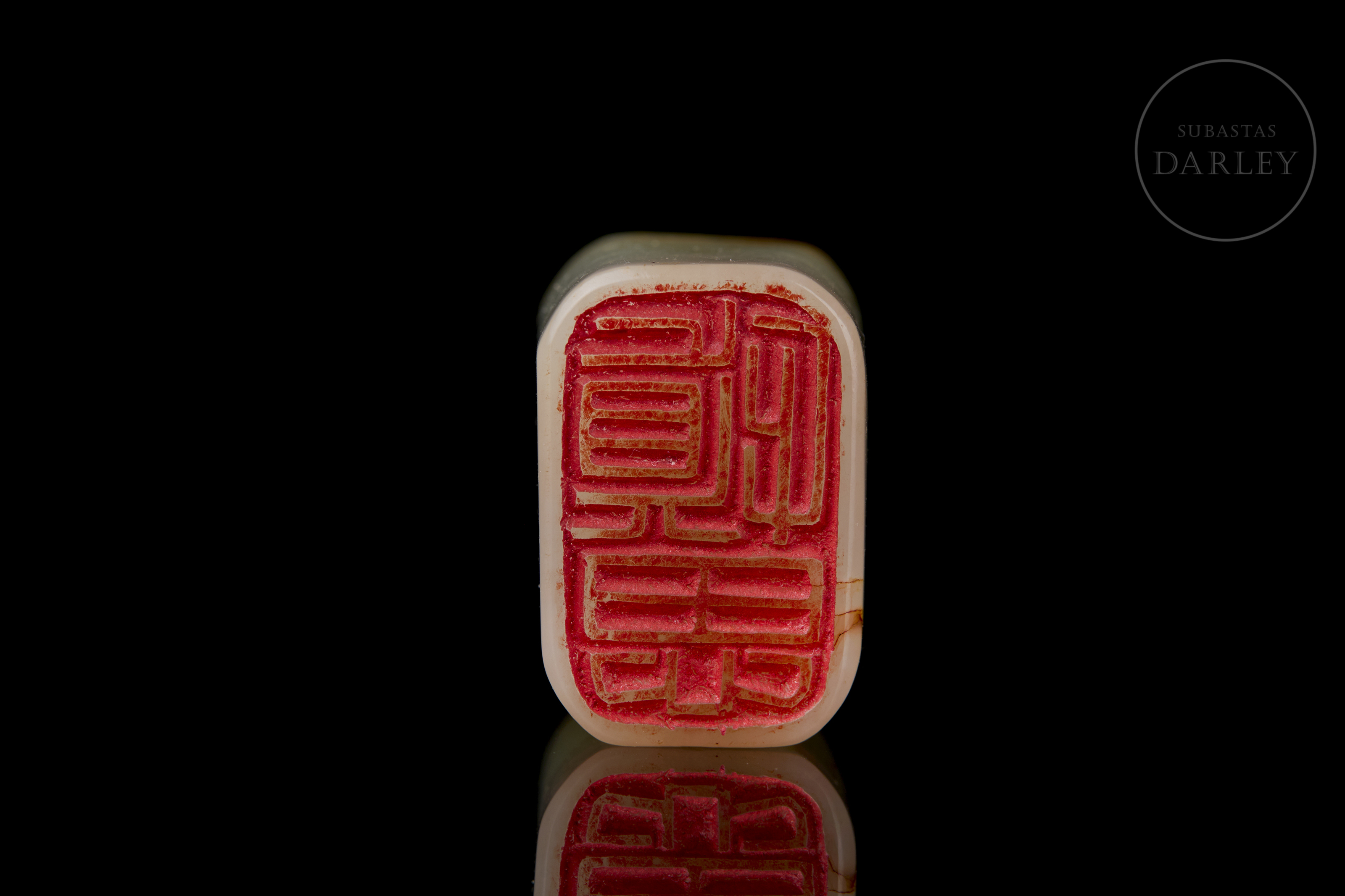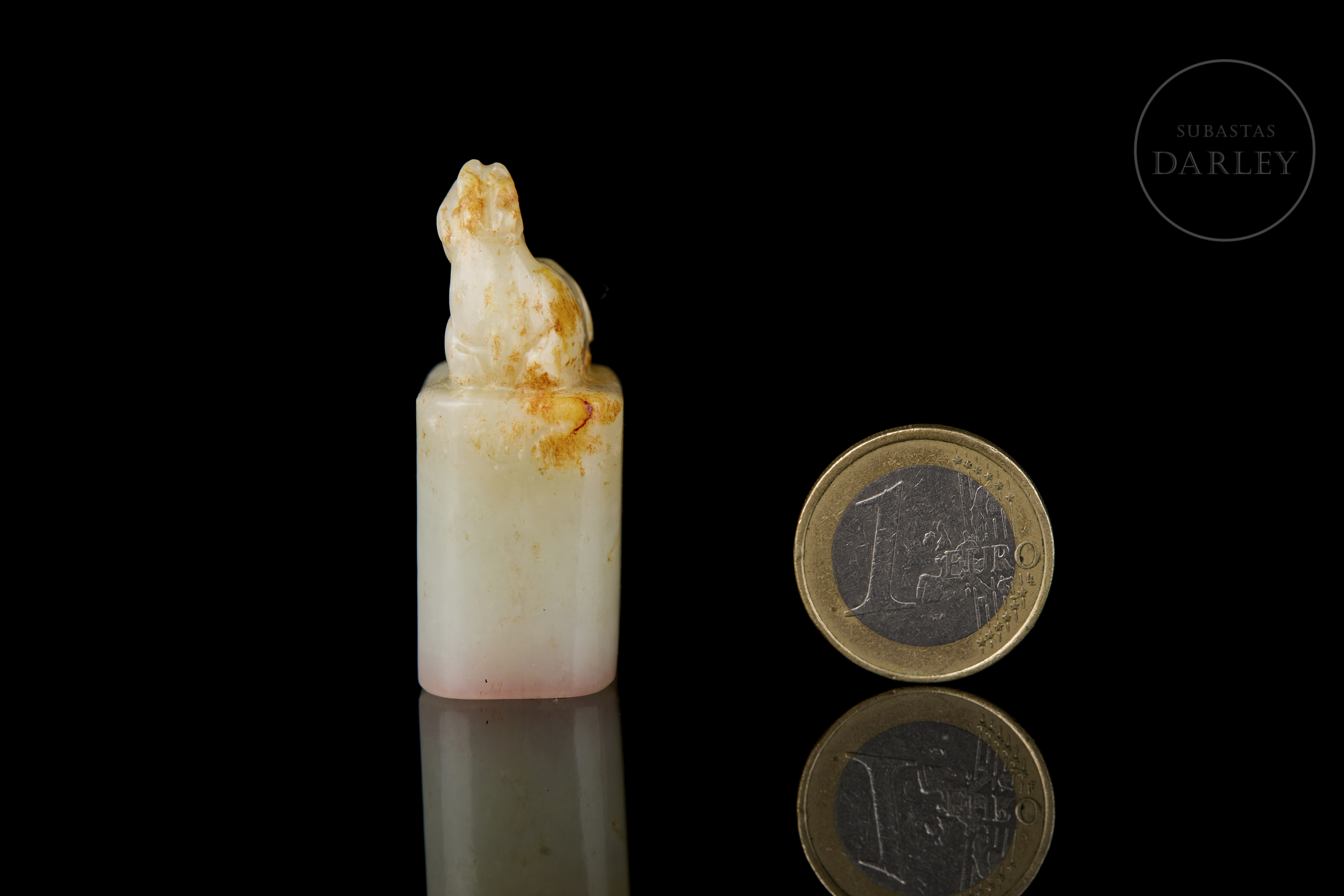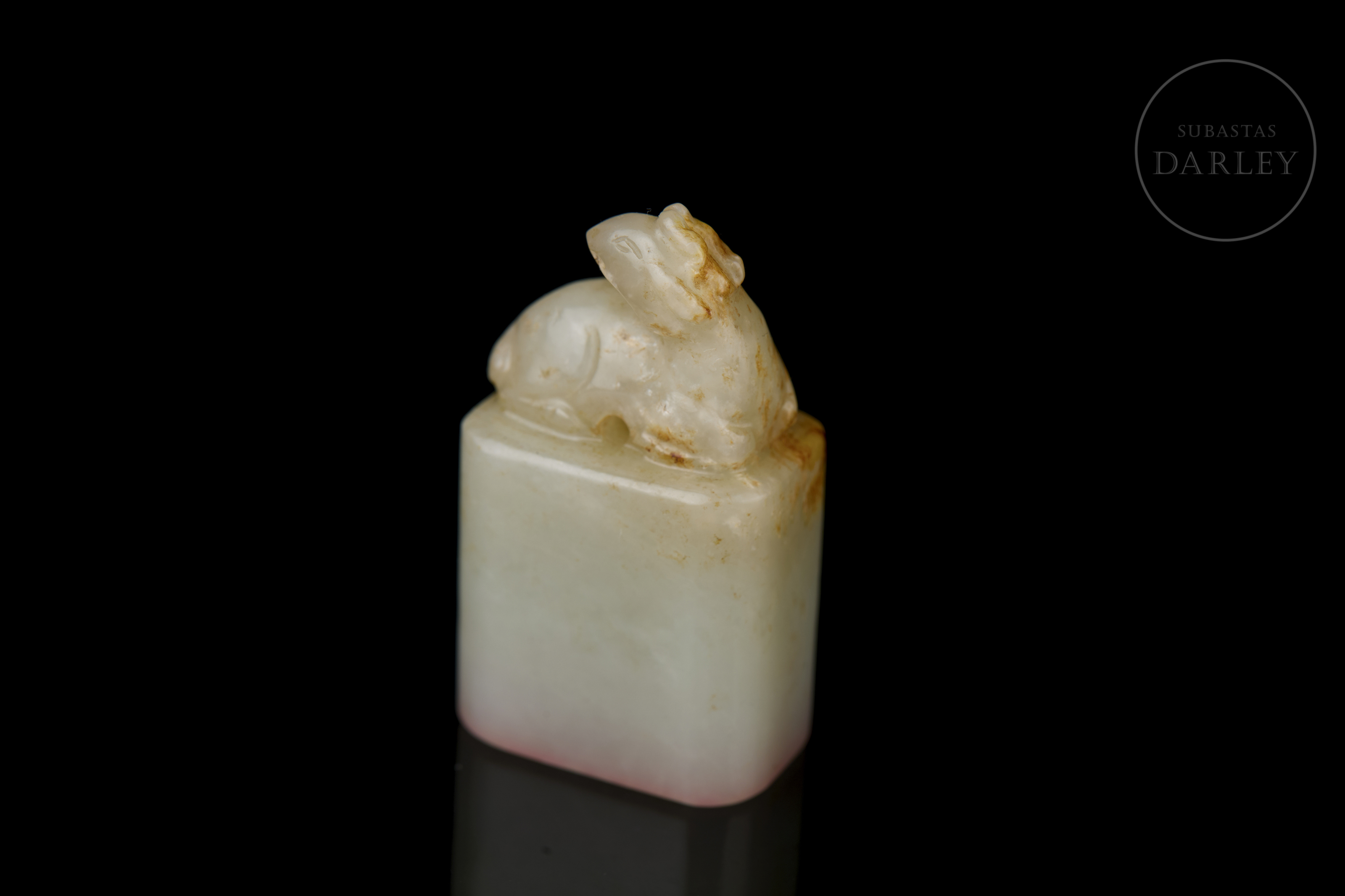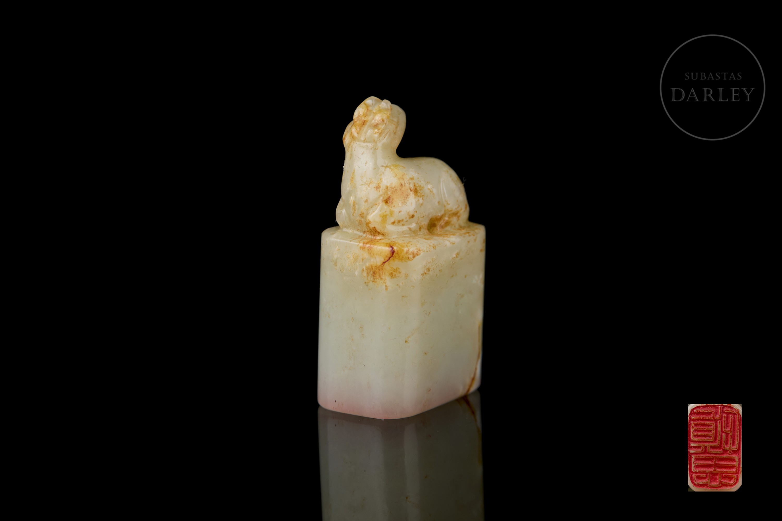 Seal carved from Hetian jade in whitish tones with ochre veins and slight transparency. It has a rectangular base with rounded corners, crowned by the figure of a reclining ram with soft forms and its head turned. The seal is engraved with the characters ‘慎思’ on the base.