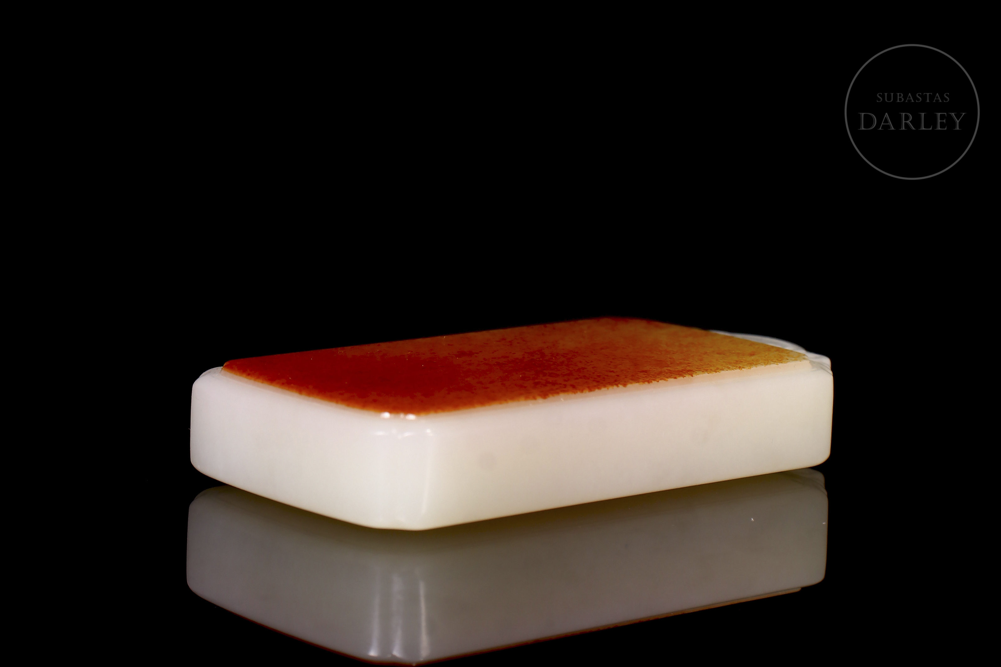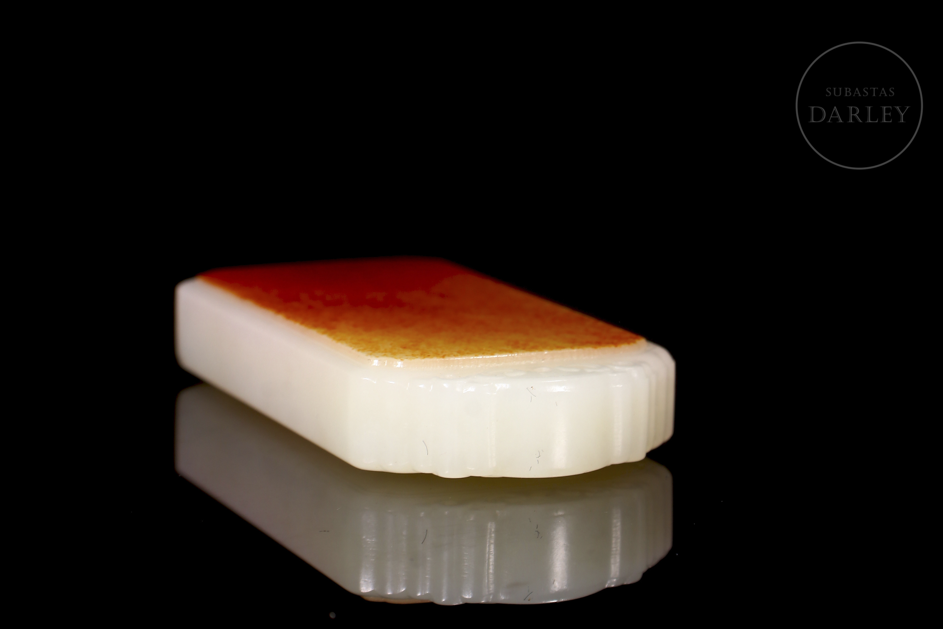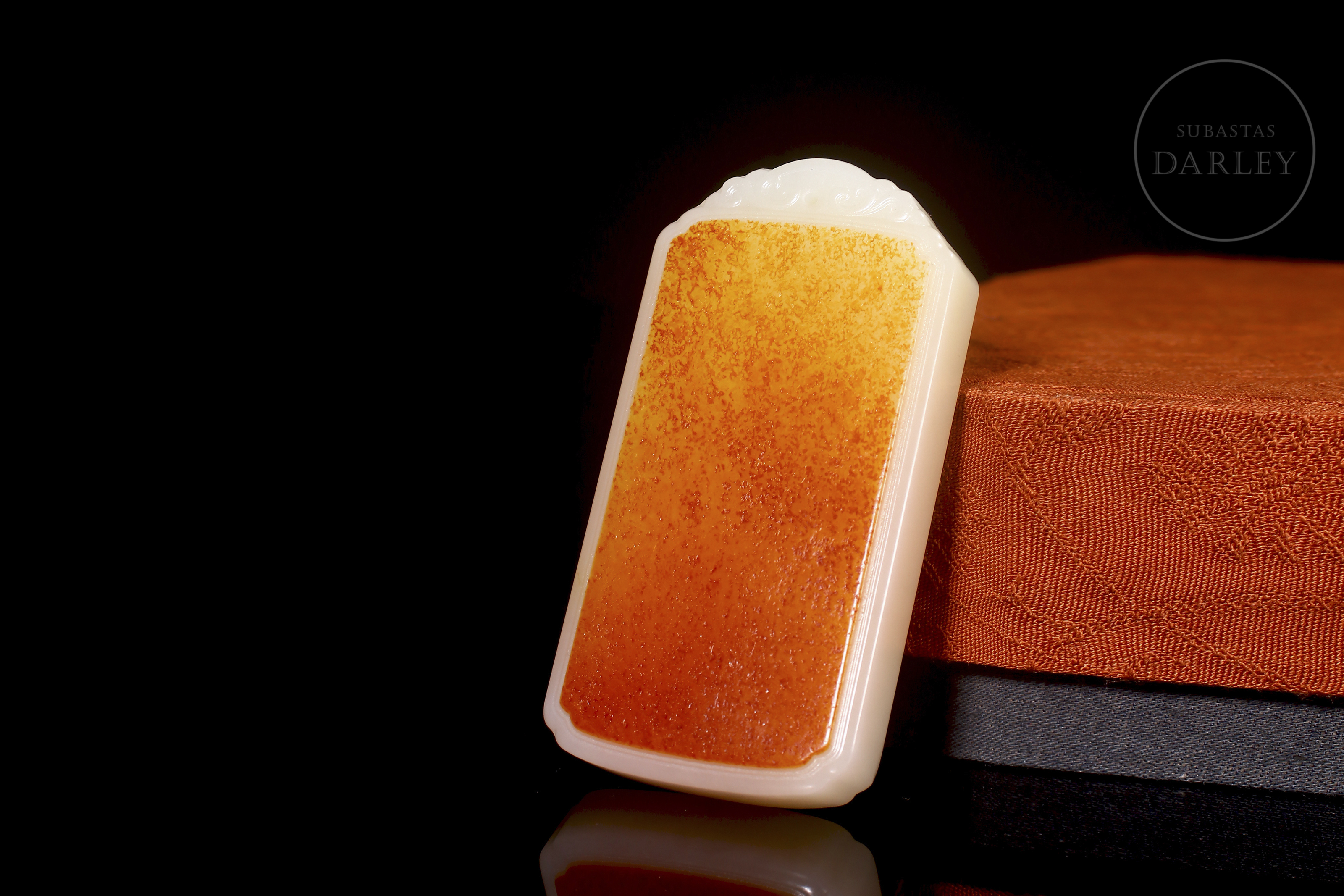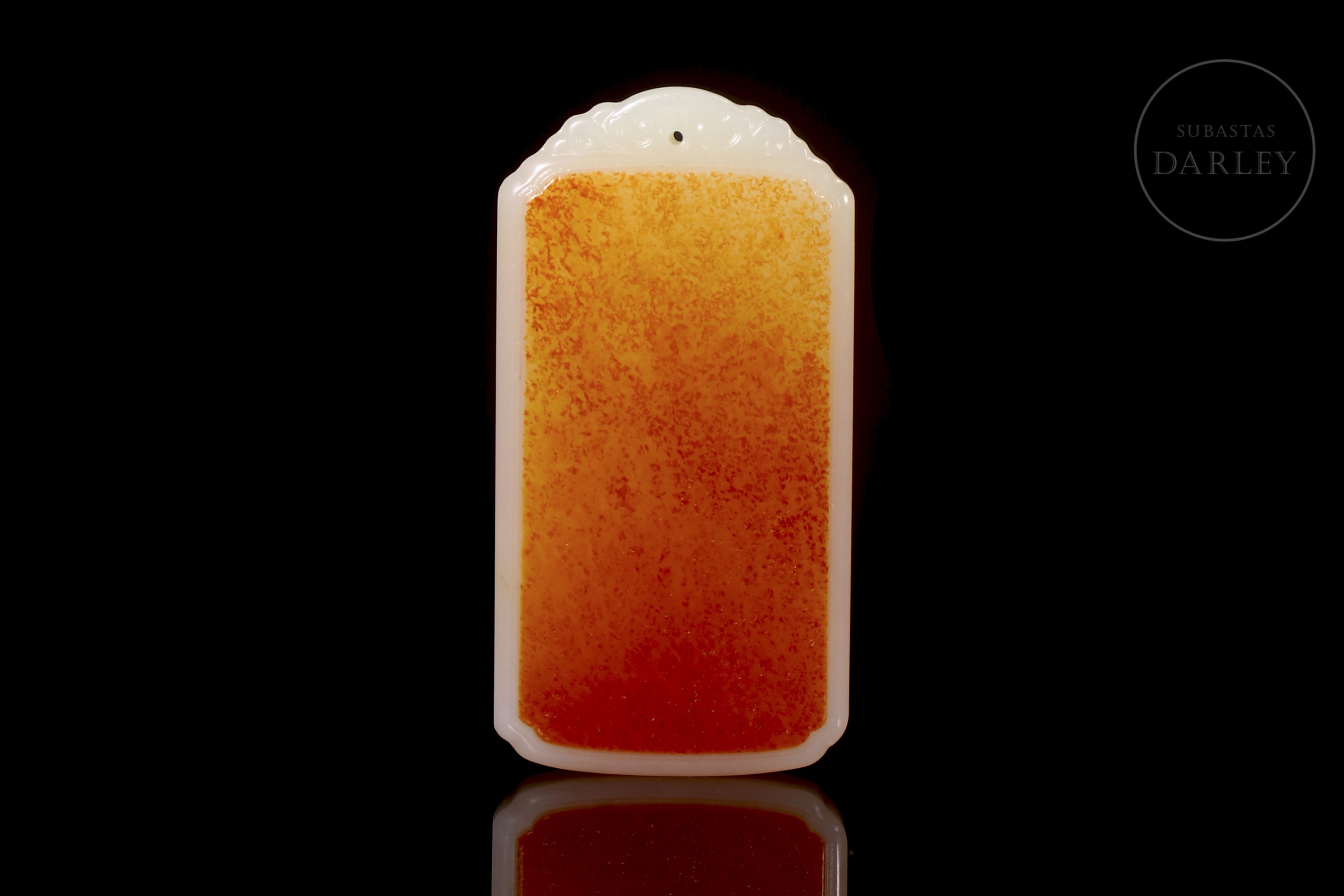 Rectangular white jade plaque with intense orange skin naturally covering the front of the plaque. The back is polished and smooth, while the top has a gently lobed and perforated edge, designed for hanging. Comes with a custom-made box.