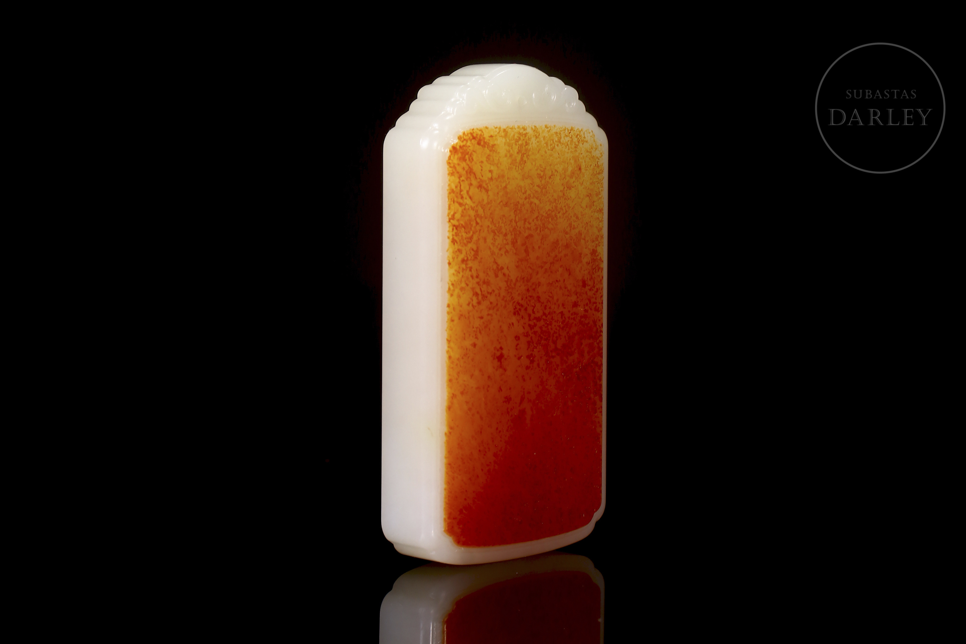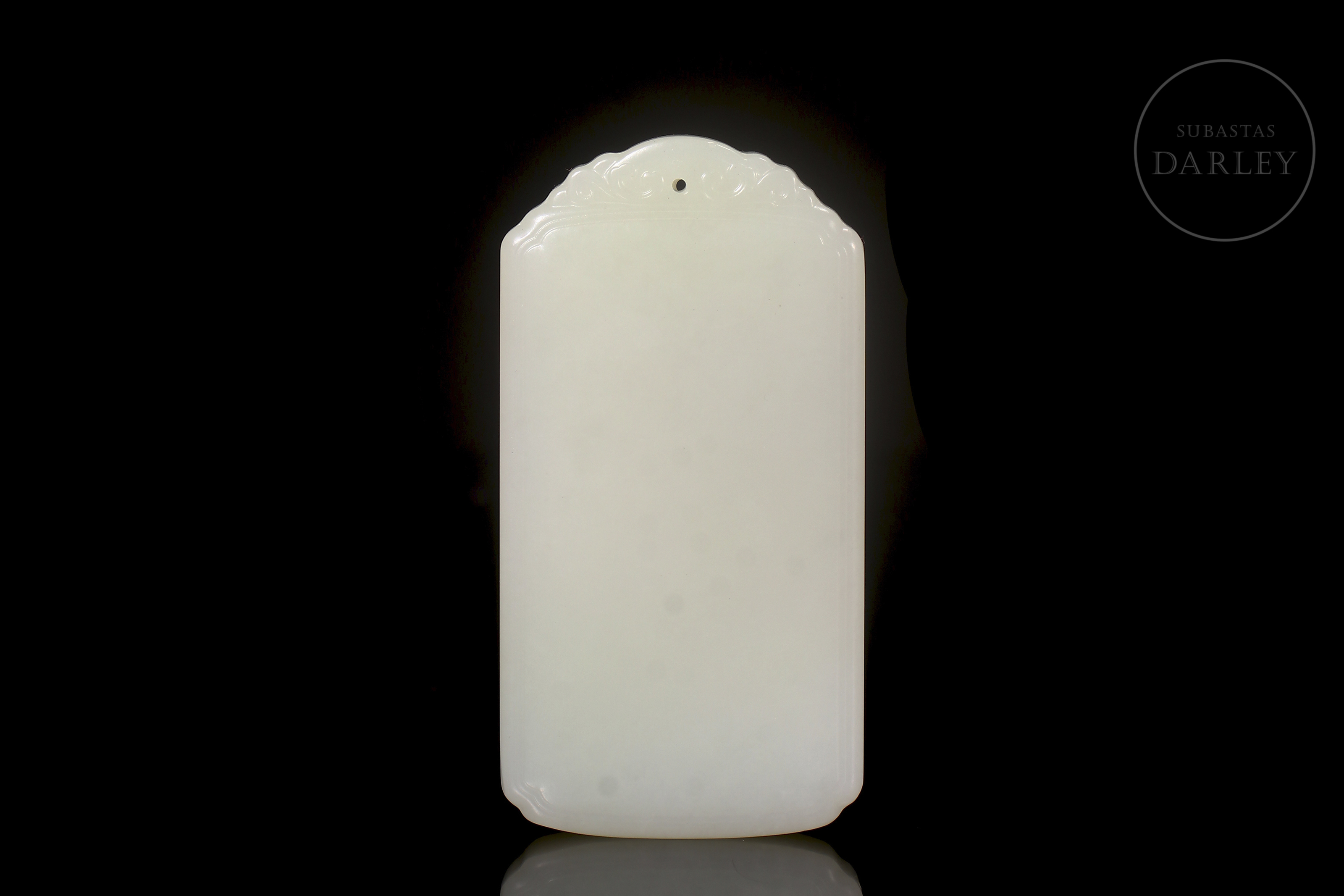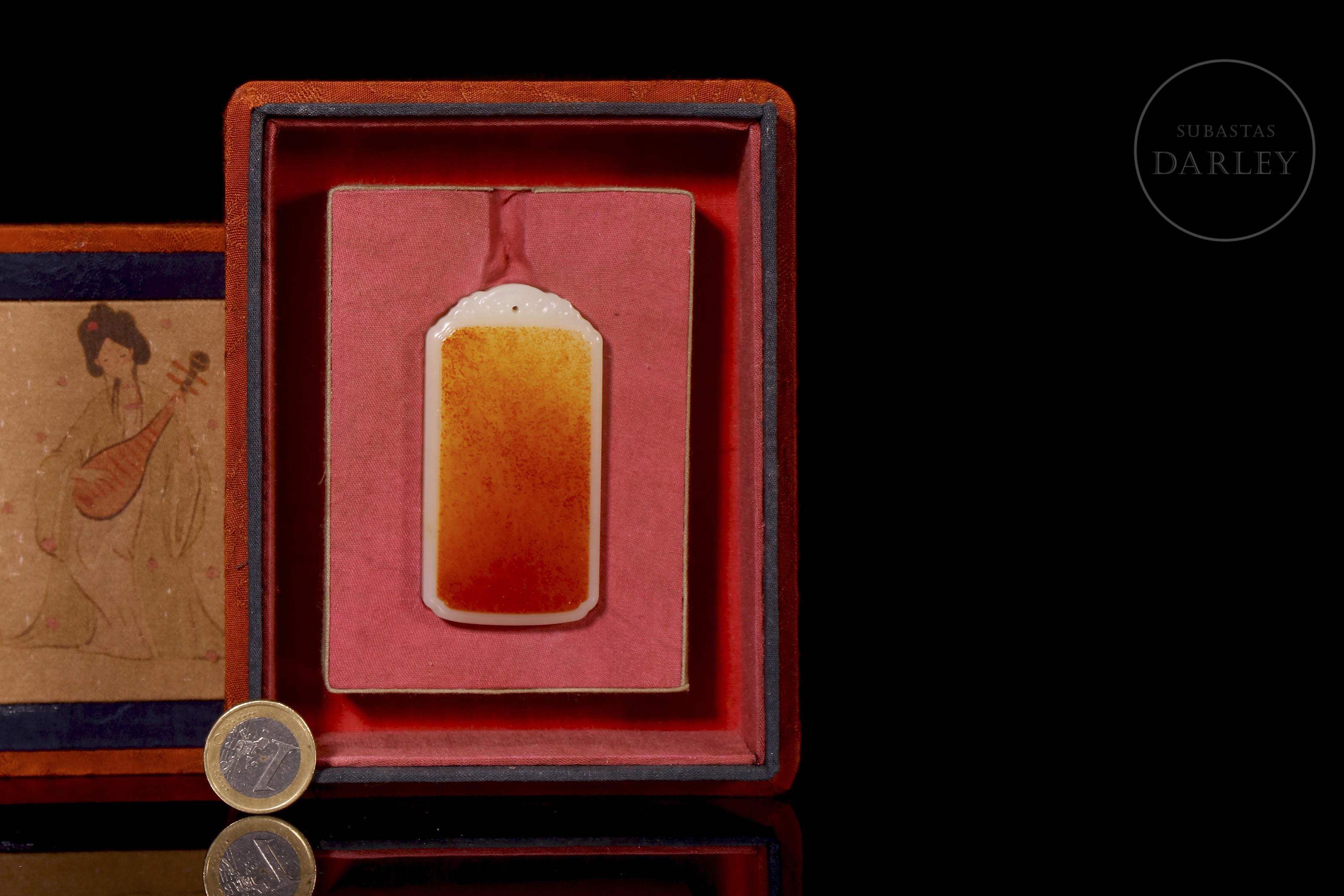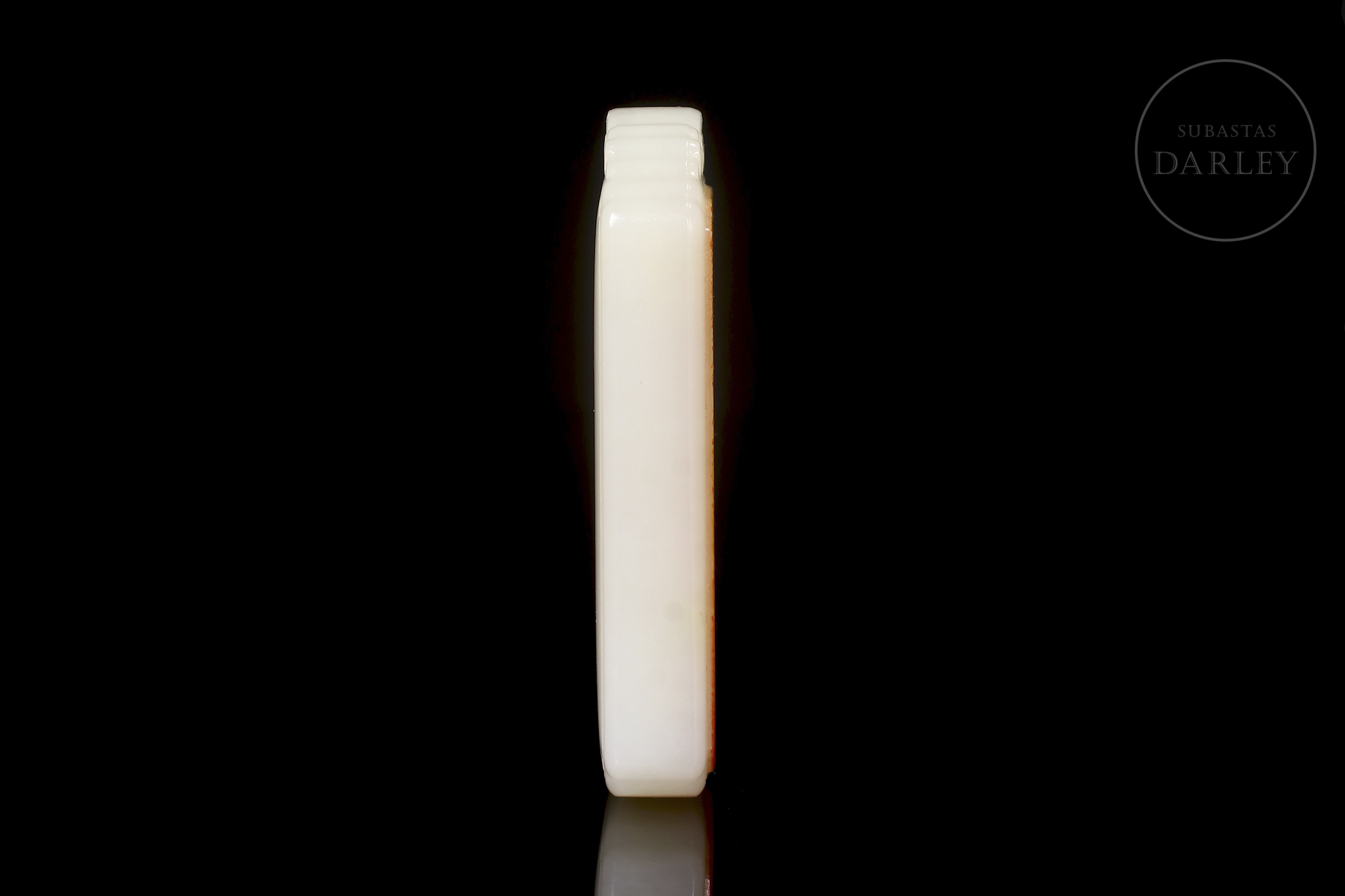 Rectangular white jade plaque with intense orange skin naturally covering the front of the plaque. The back is polished and smooth, while the top has a gently lobed and perforated edge, designed for hanging. Comes with a custom-made box.