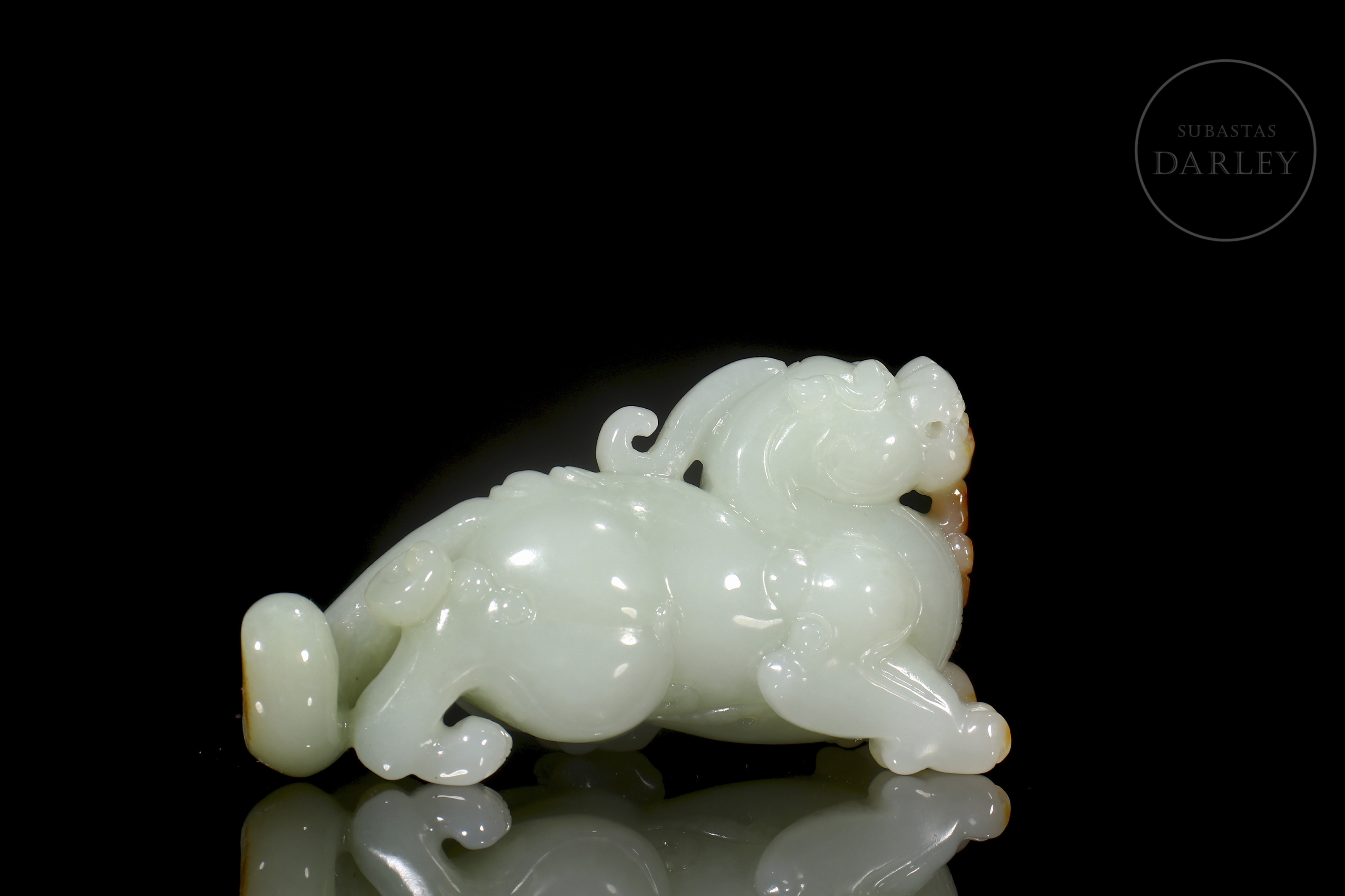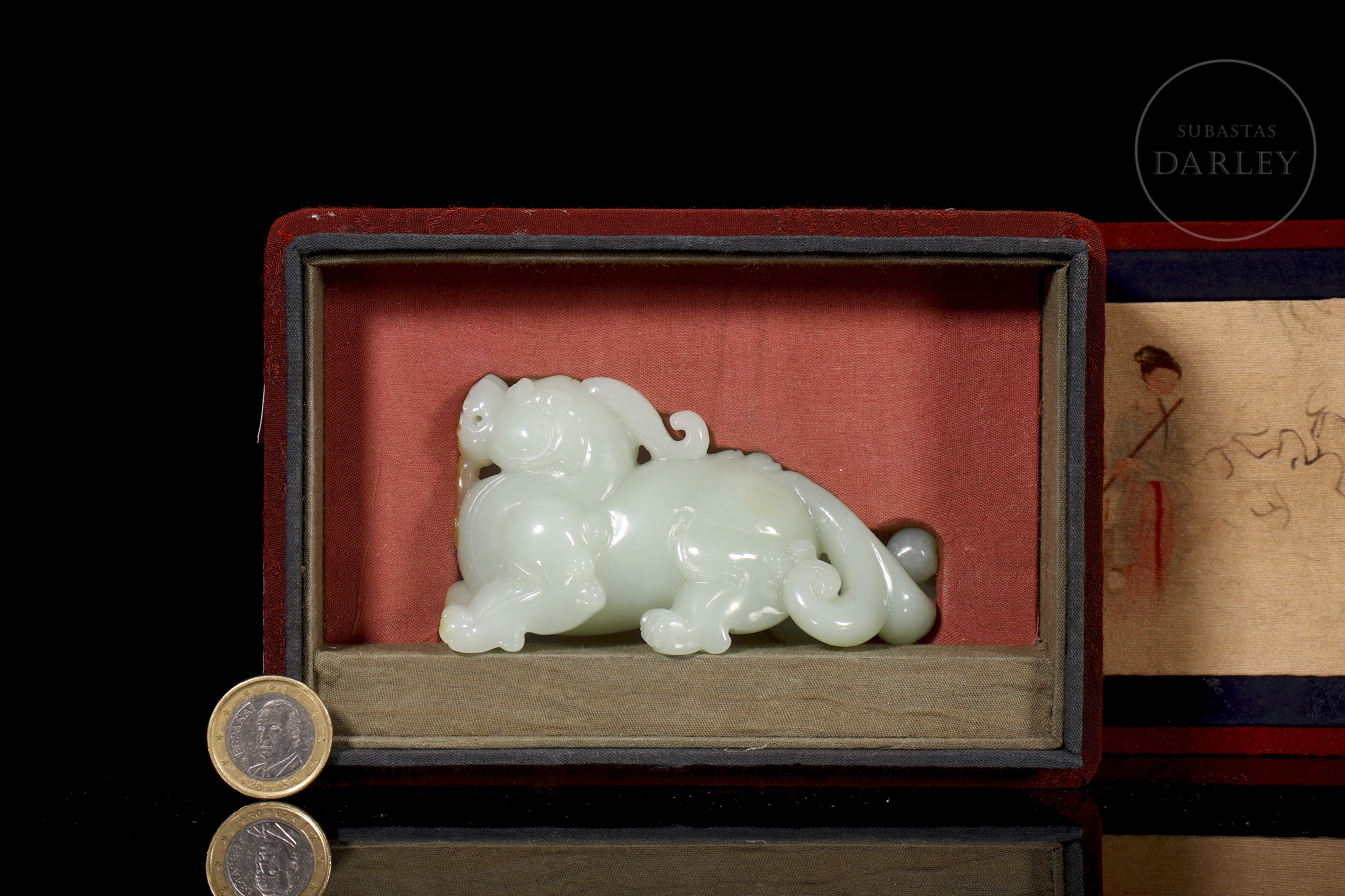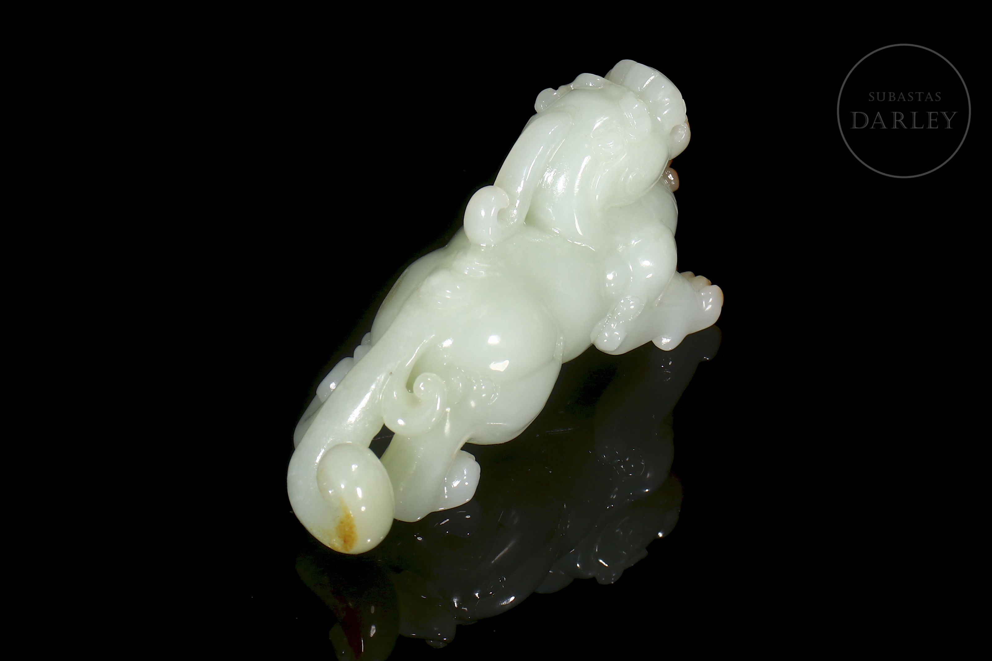 Zoomorphic sculpture in white Hetian jade, representing a fantastical creature with a reclining body, sturdy legs and an upright head with an energetic expression. The mane and tail are carved with undulating incisions that accentuate the movement. The jade, with a uniform tone and slight natural veins, has areas of ochre patina that have been used in the carving. It is kept in a custom-made box lined with fabric.