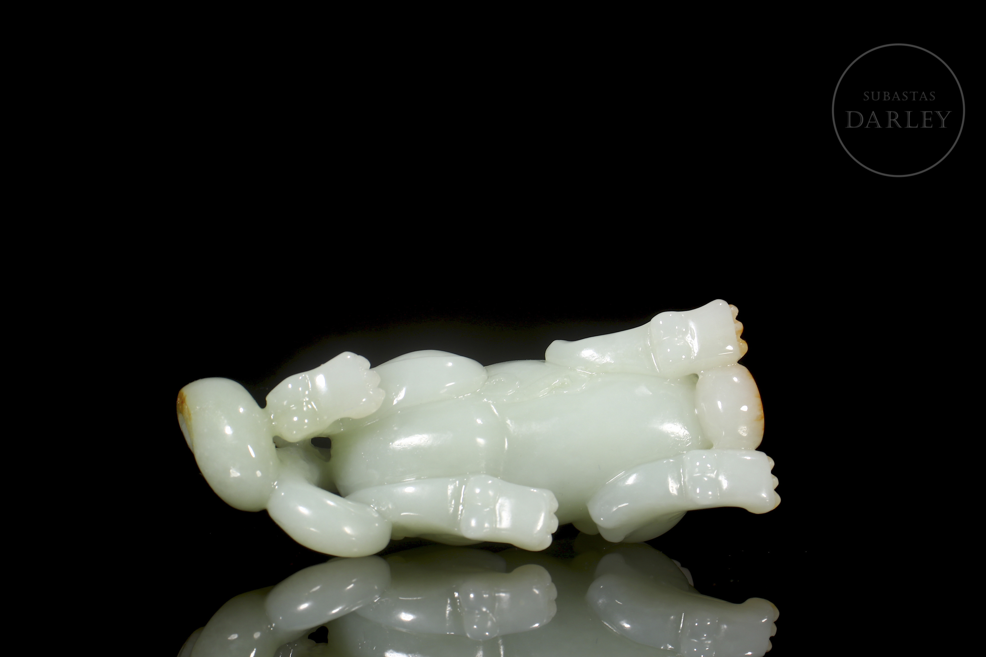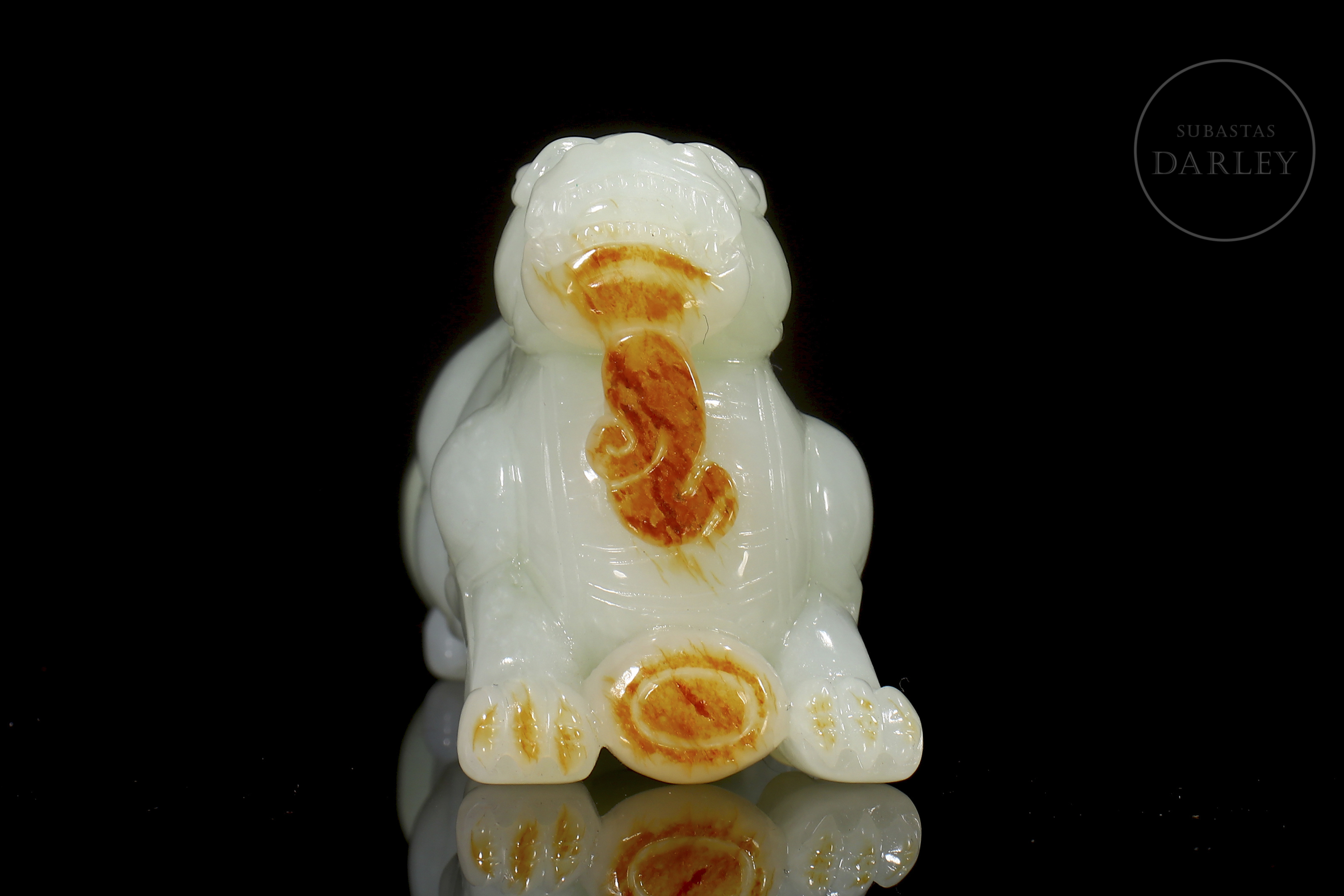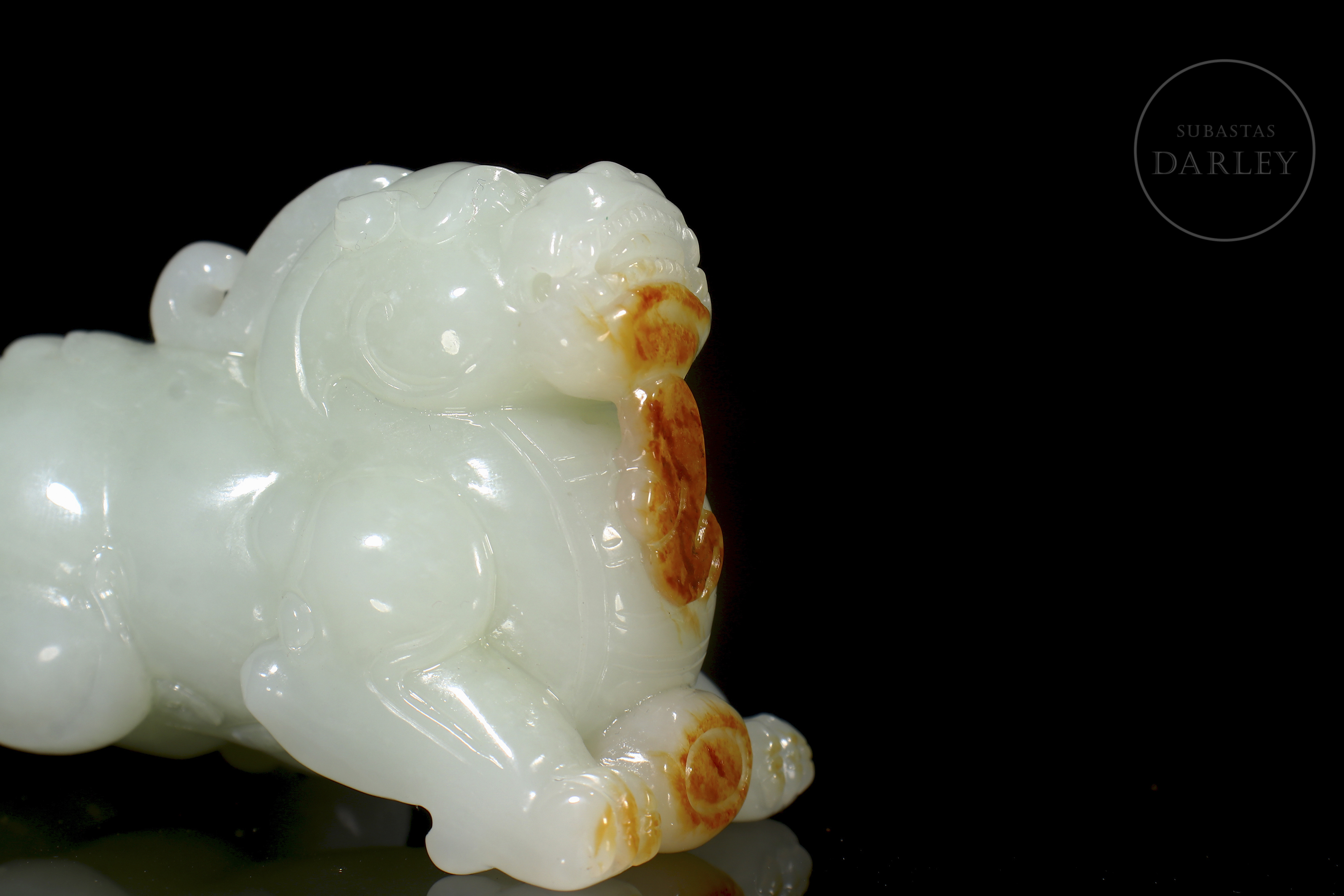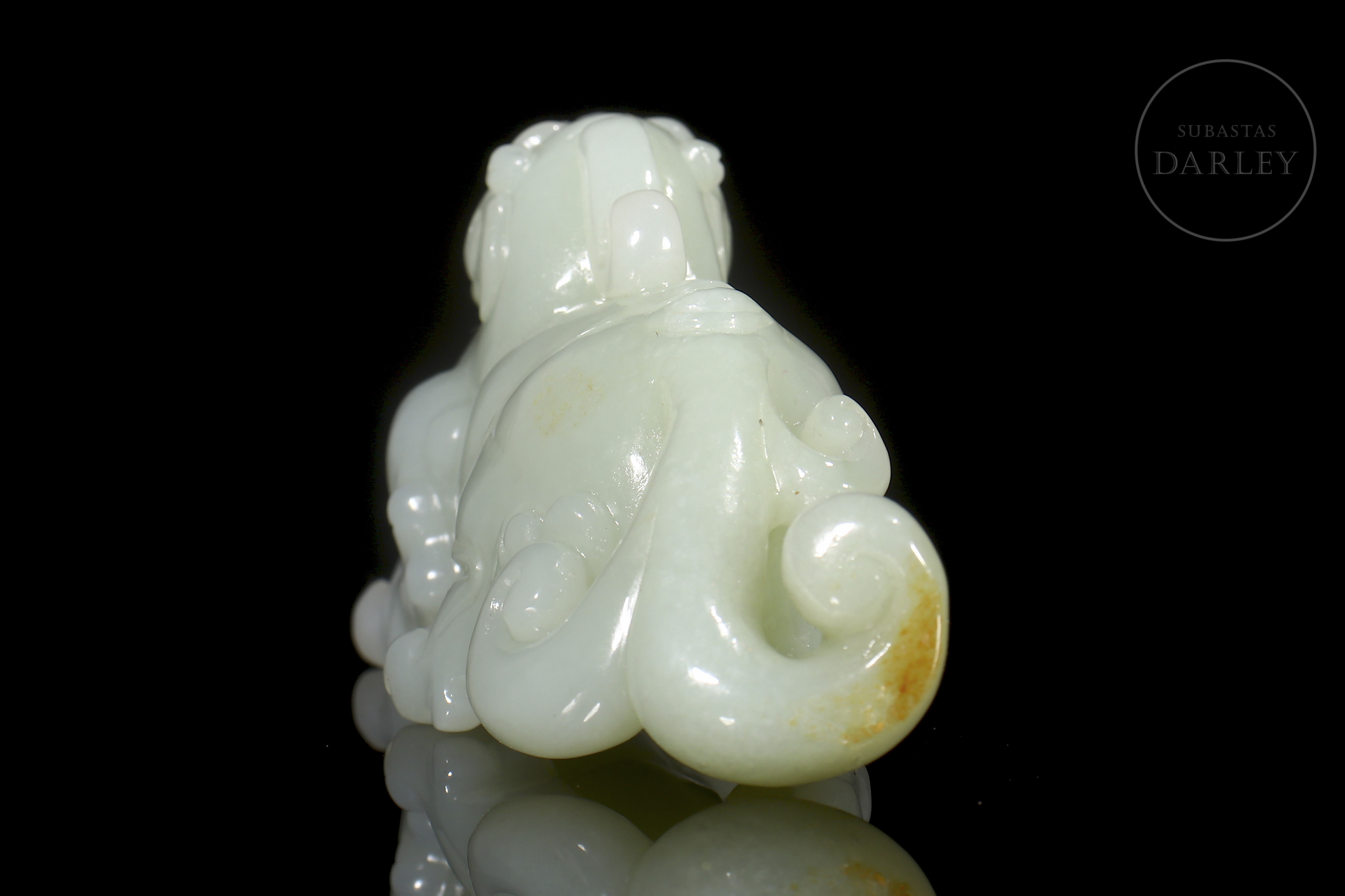 Zoomorphic sculpture in white Hetian jade, representing a fantastical creature with a reclining body, sturdy legs and an upright head with an energetic expression. The mane and tail are carved with undulating incisions that accentuate the movement. The jade, with a uniform tone and slight natural veins, has areas of ochre patina that have been used in the carving. It is kept in a custom-made box lined with fabric.