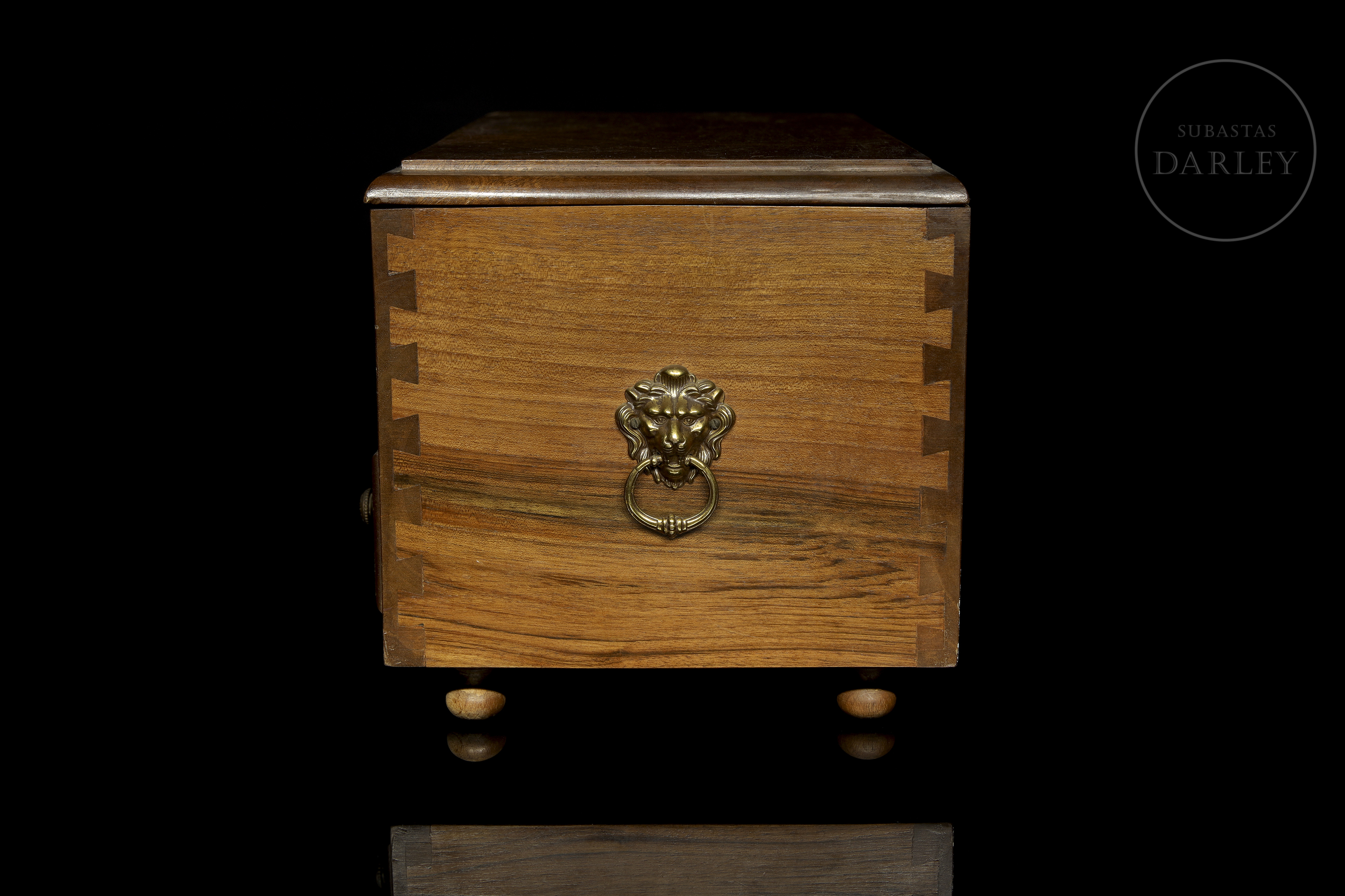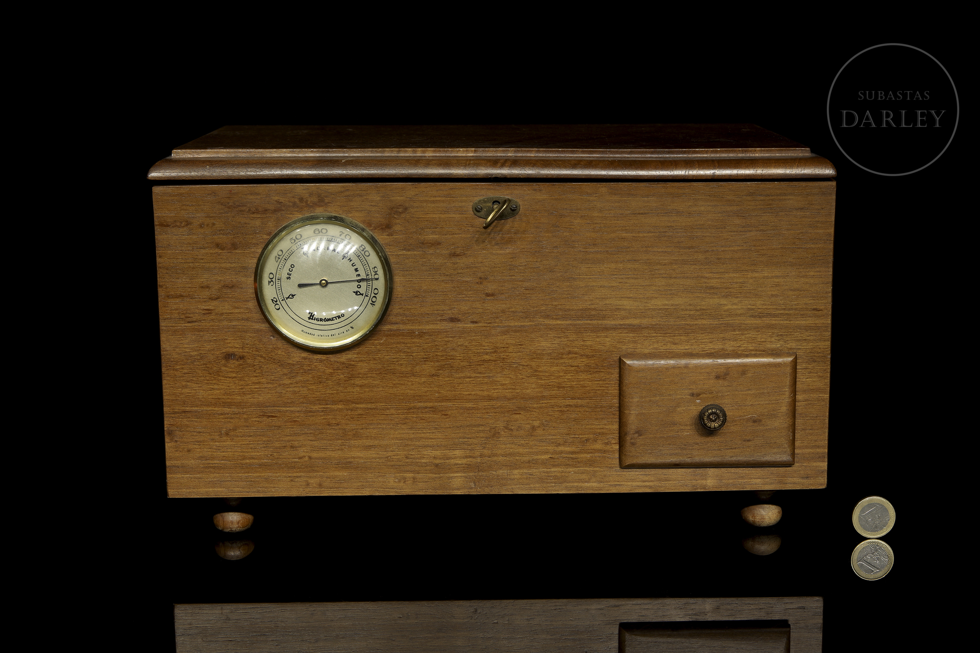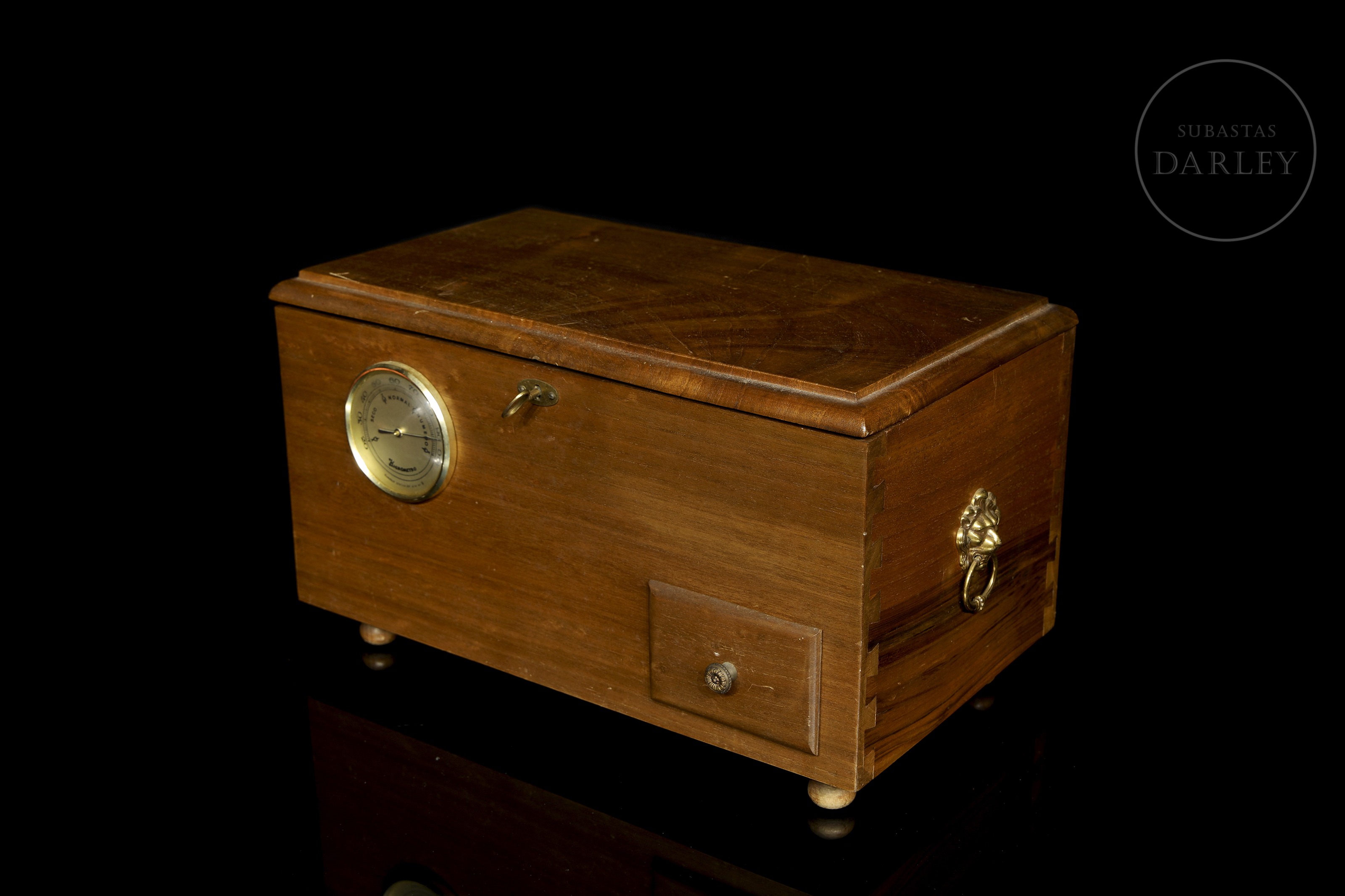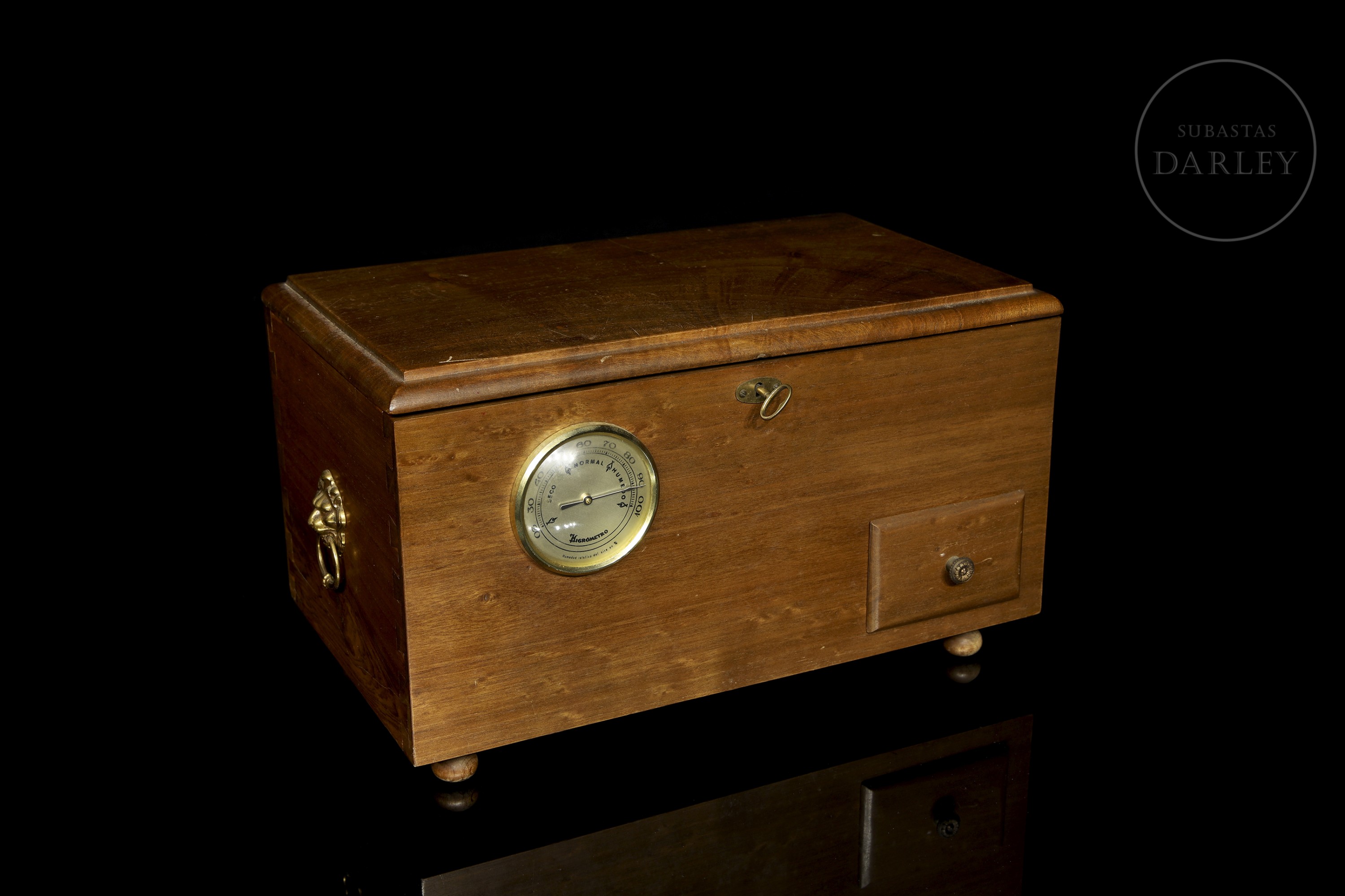 木质加湿器盒。配备前置湿度计及辅助抽屉。侧面饰有狮首环形把手。内部专为雪茄储存设计。