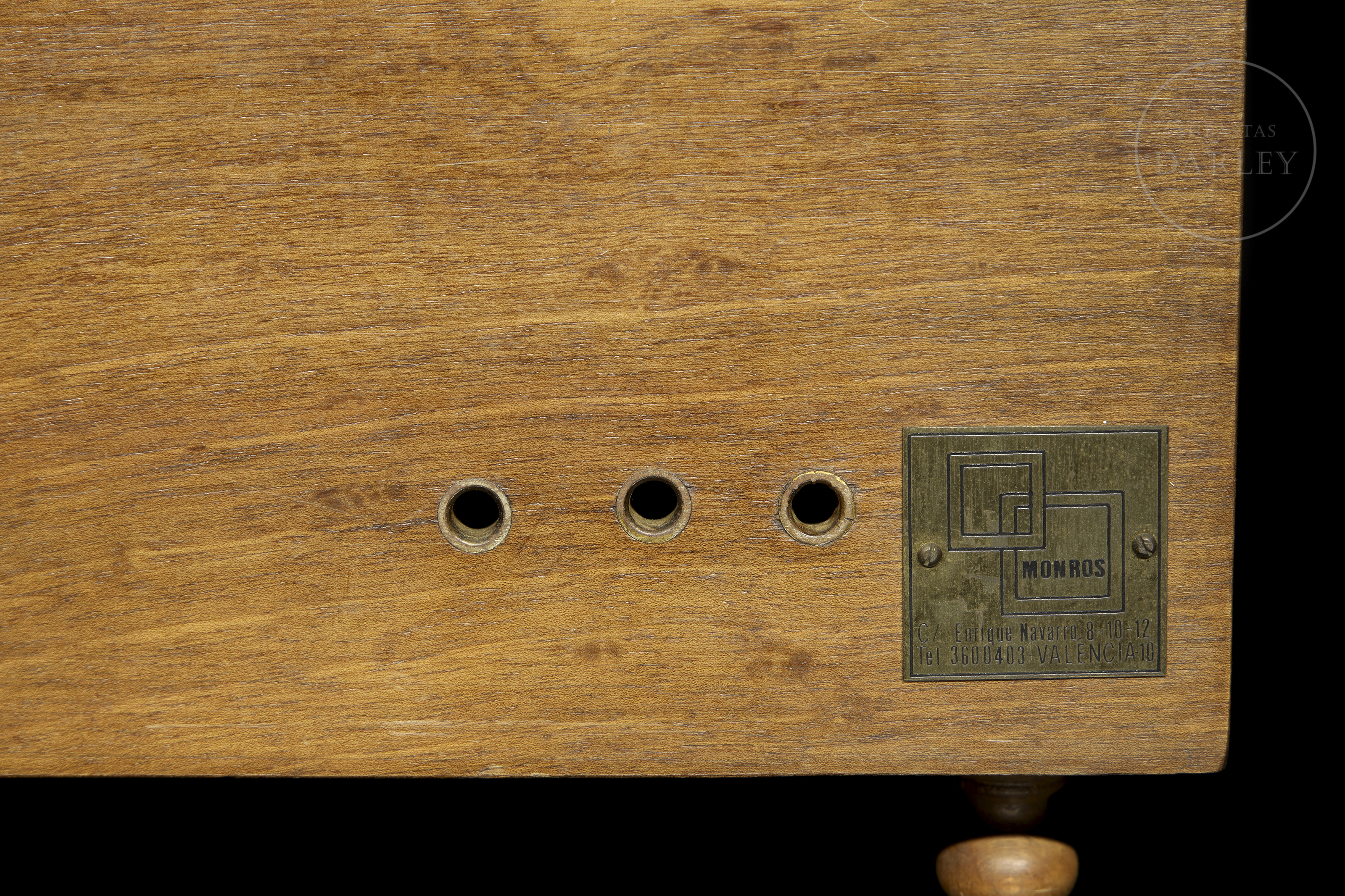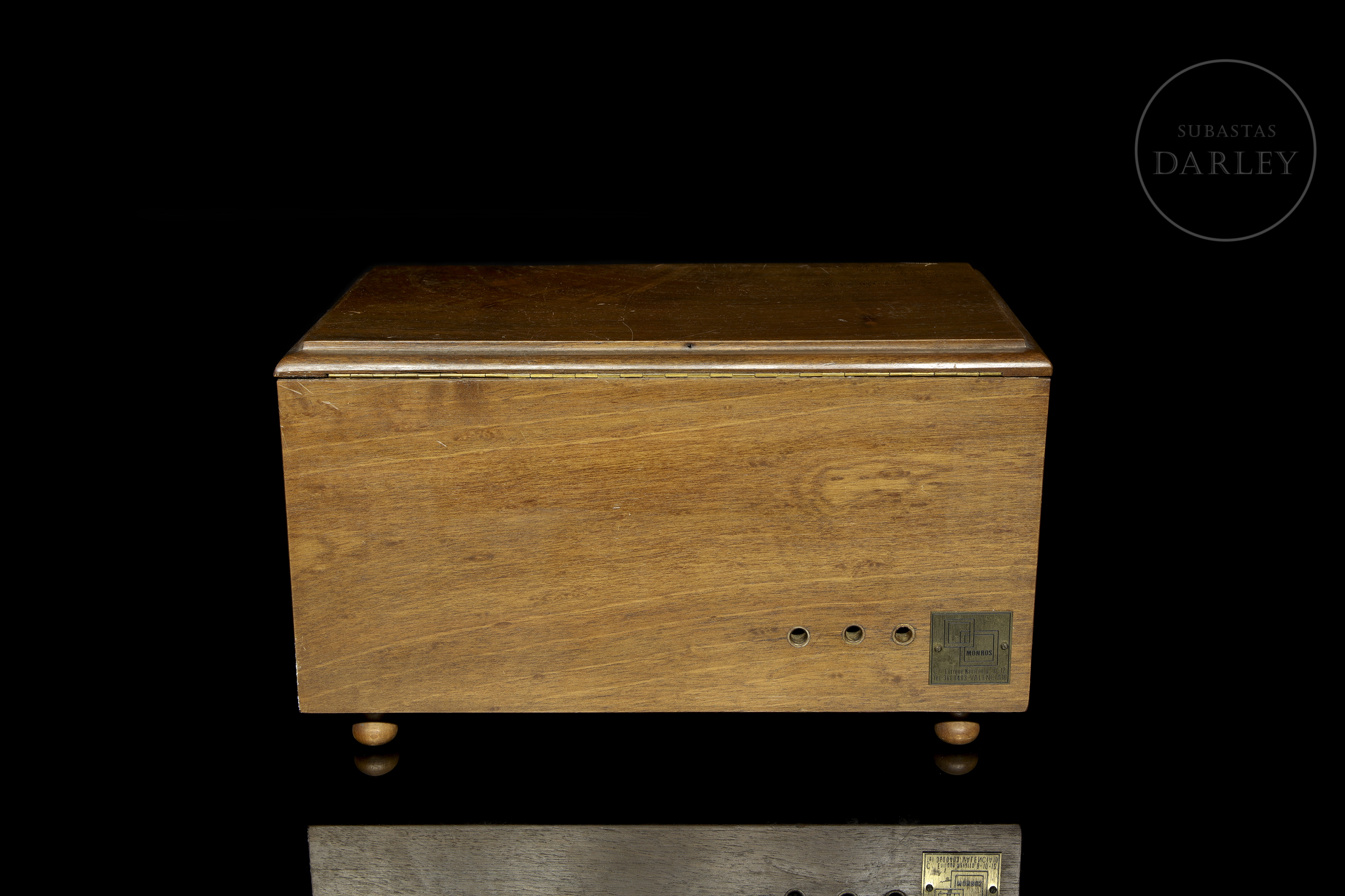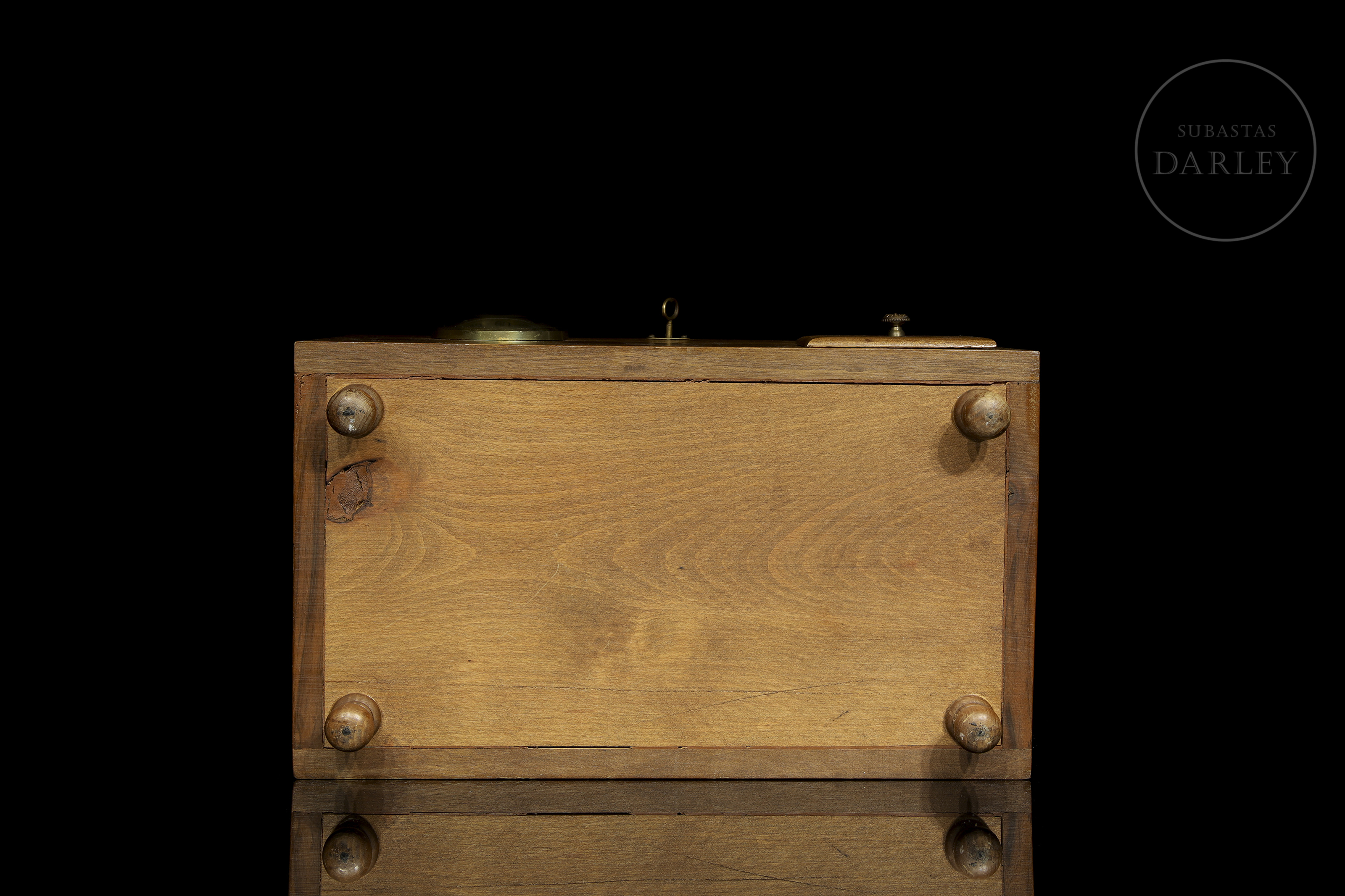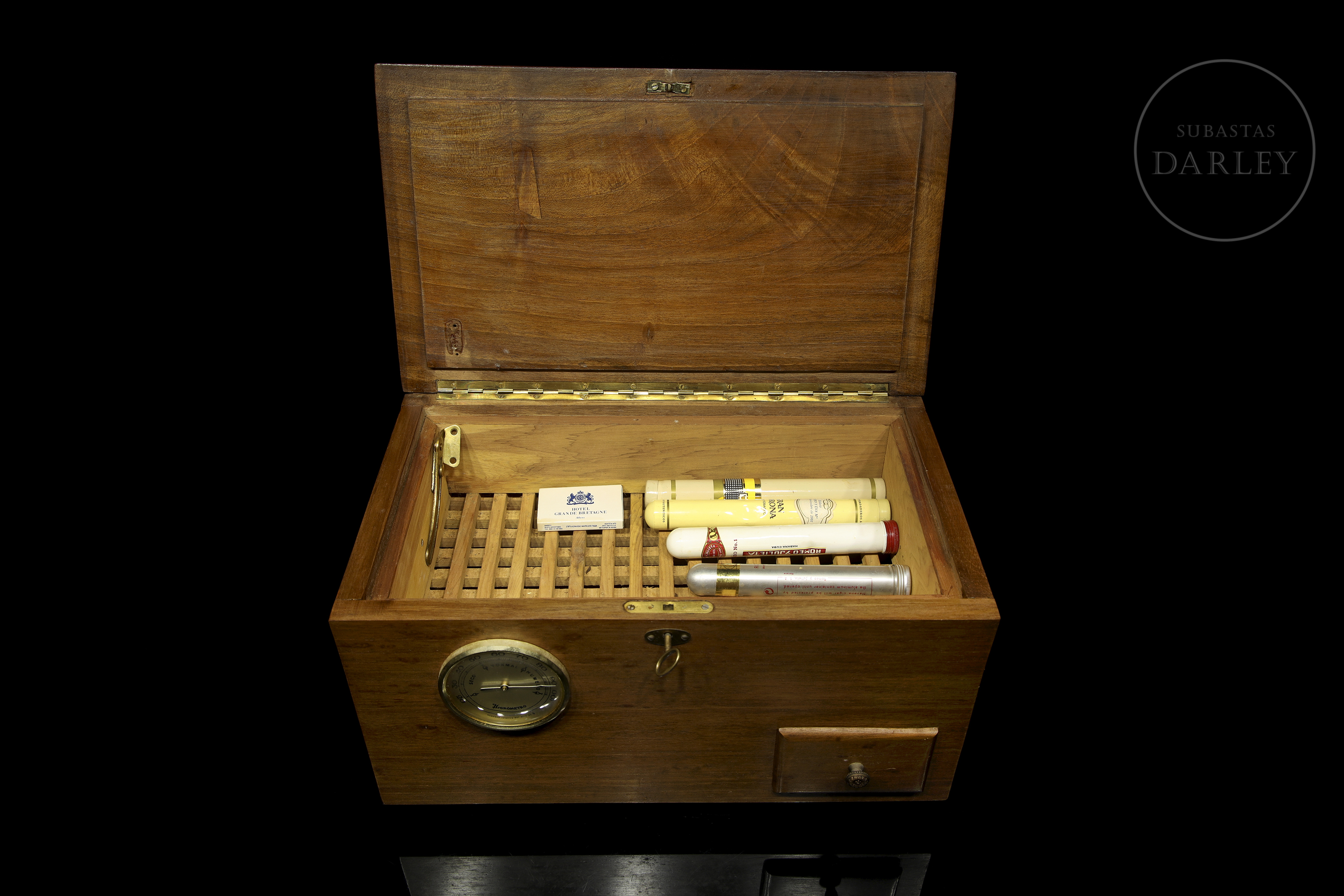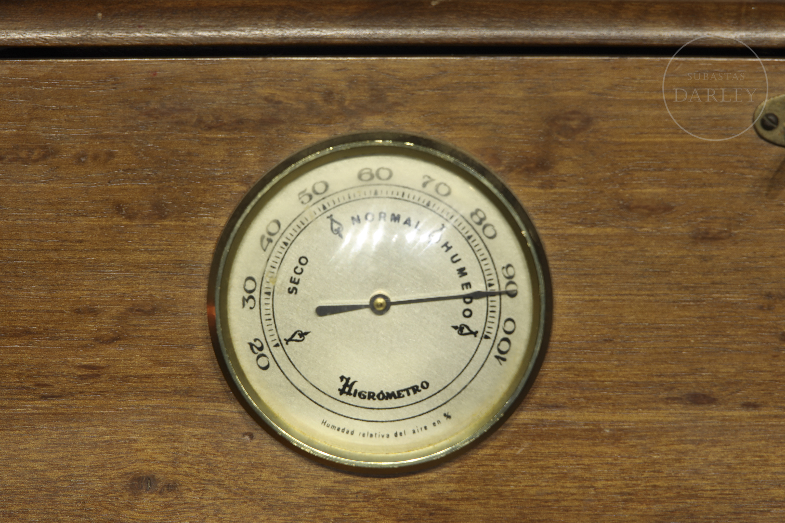 木质加湿器盒。配备前置湿度计及辅助抽屉。侧面饰有狮首环形把手。内部专为雪茄储存设计。