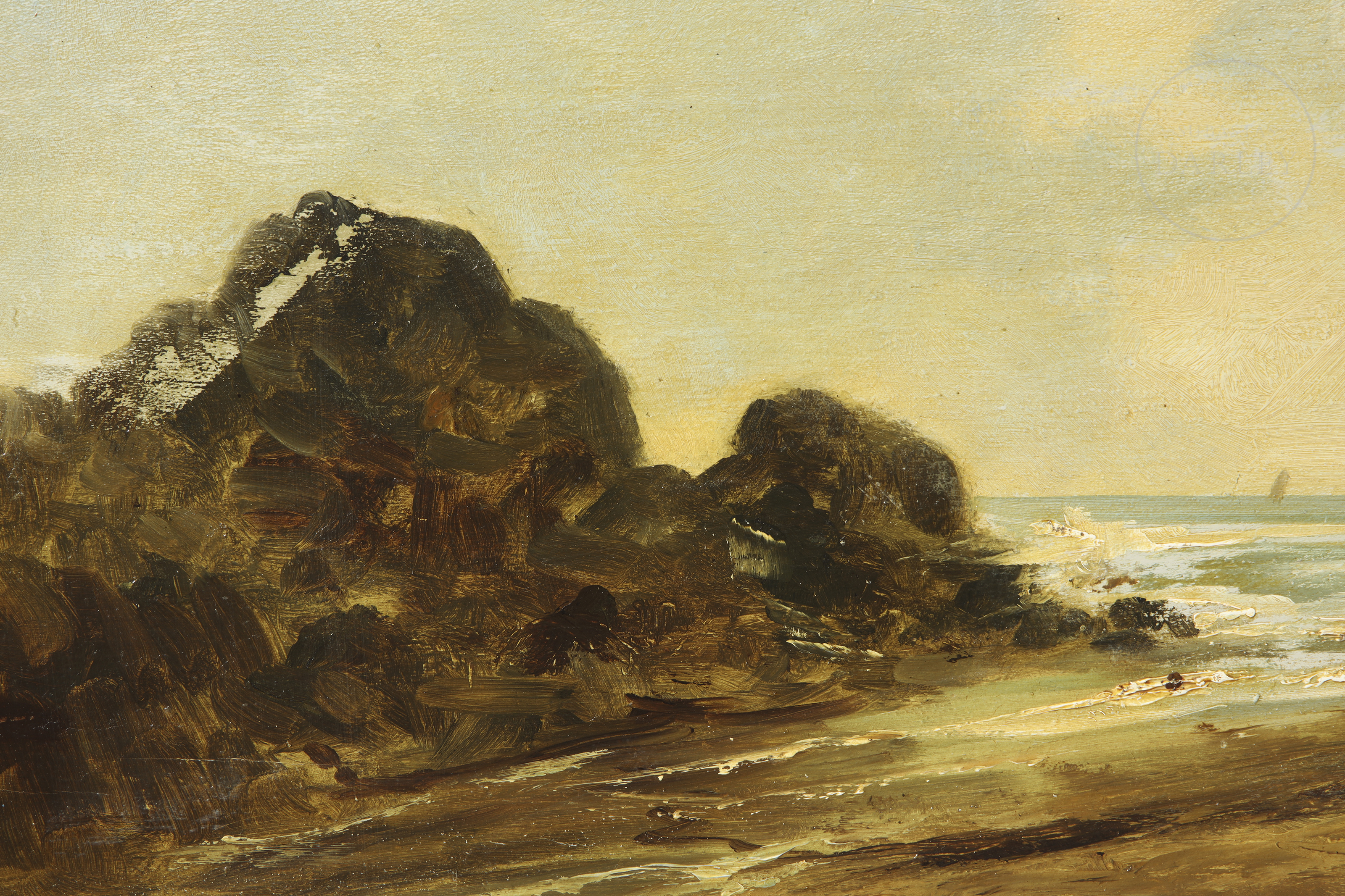Oil on panel. Serene seascape depicting a solitary fishing boat resting on the wet sand of the shore. The sea stretches calmly towards a low horizon. Signed ‘J. M. González’ in the lower right corner.