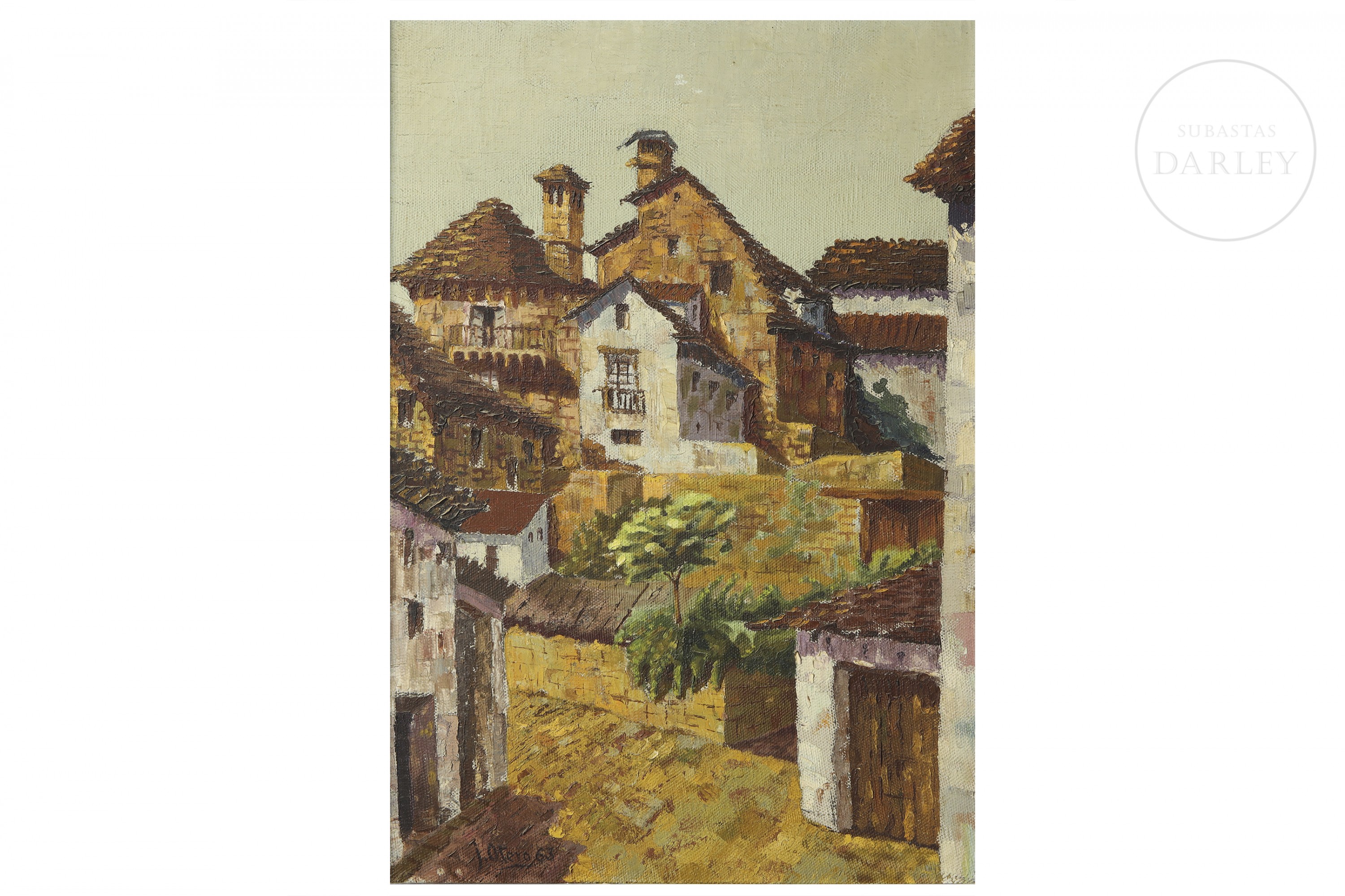 油画布。描绘乡村村落,采用赭石与白色调色盘。左下角签名“J. Otero 63”。