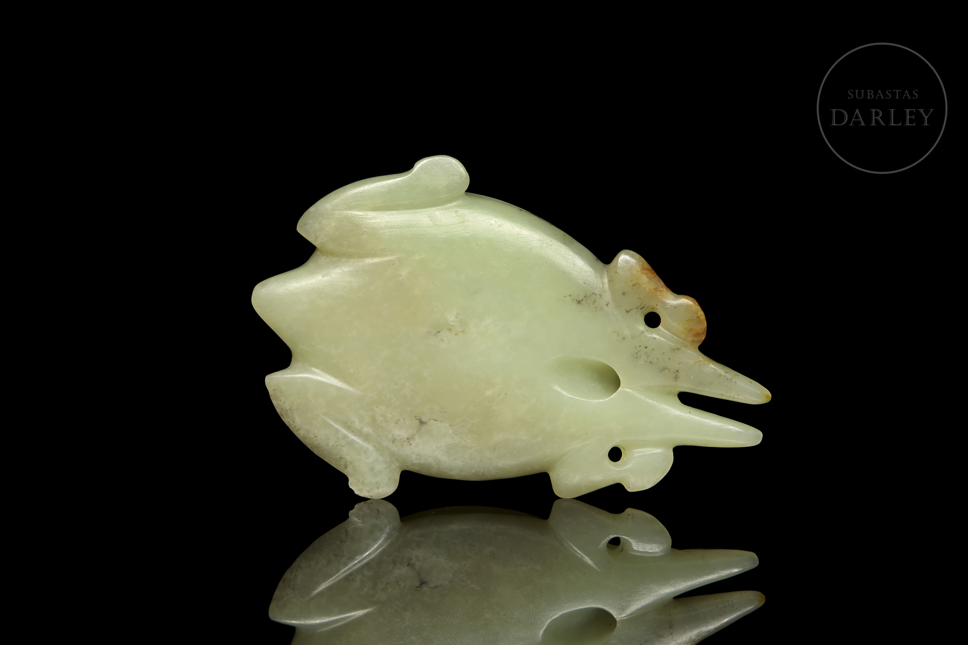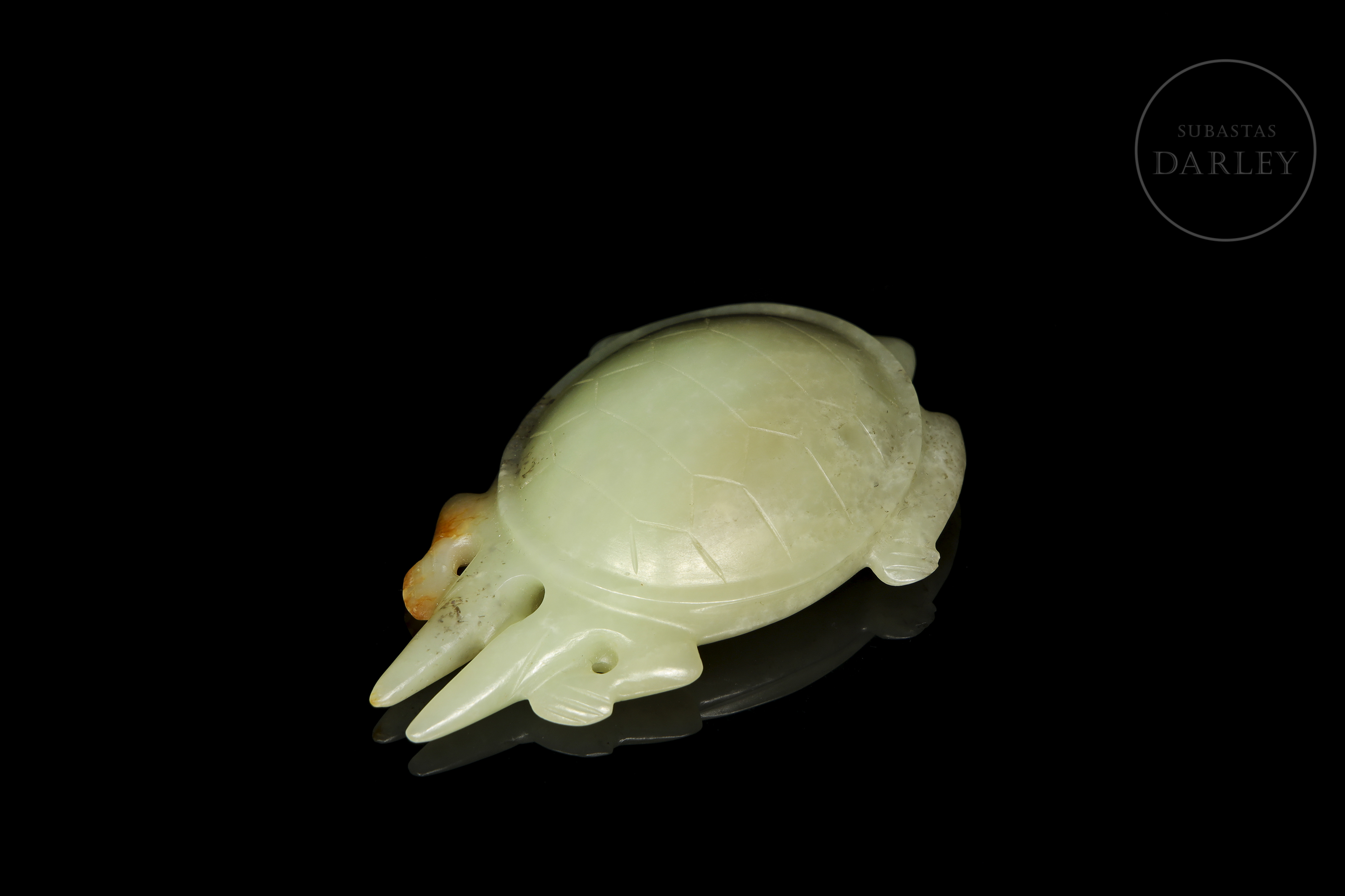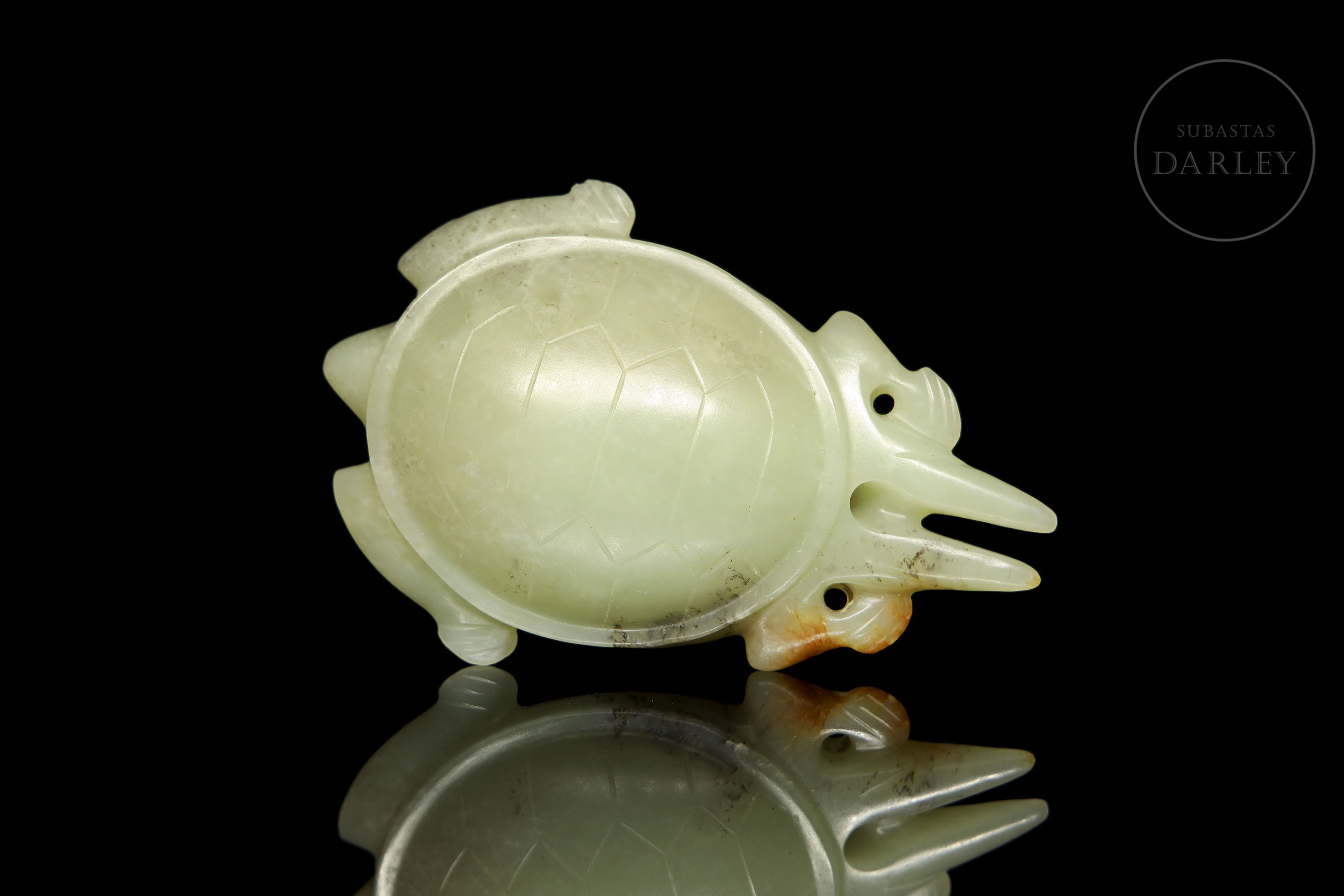 Nephrite jade amulet, carved from a pale green stone with brown inclusions, sculpted in the shape of a mythical turtle. It combines a simplified turtle shell, with incised plates, with a small head and stylized tail or hind legs. It has several perforations for use as a pendant.