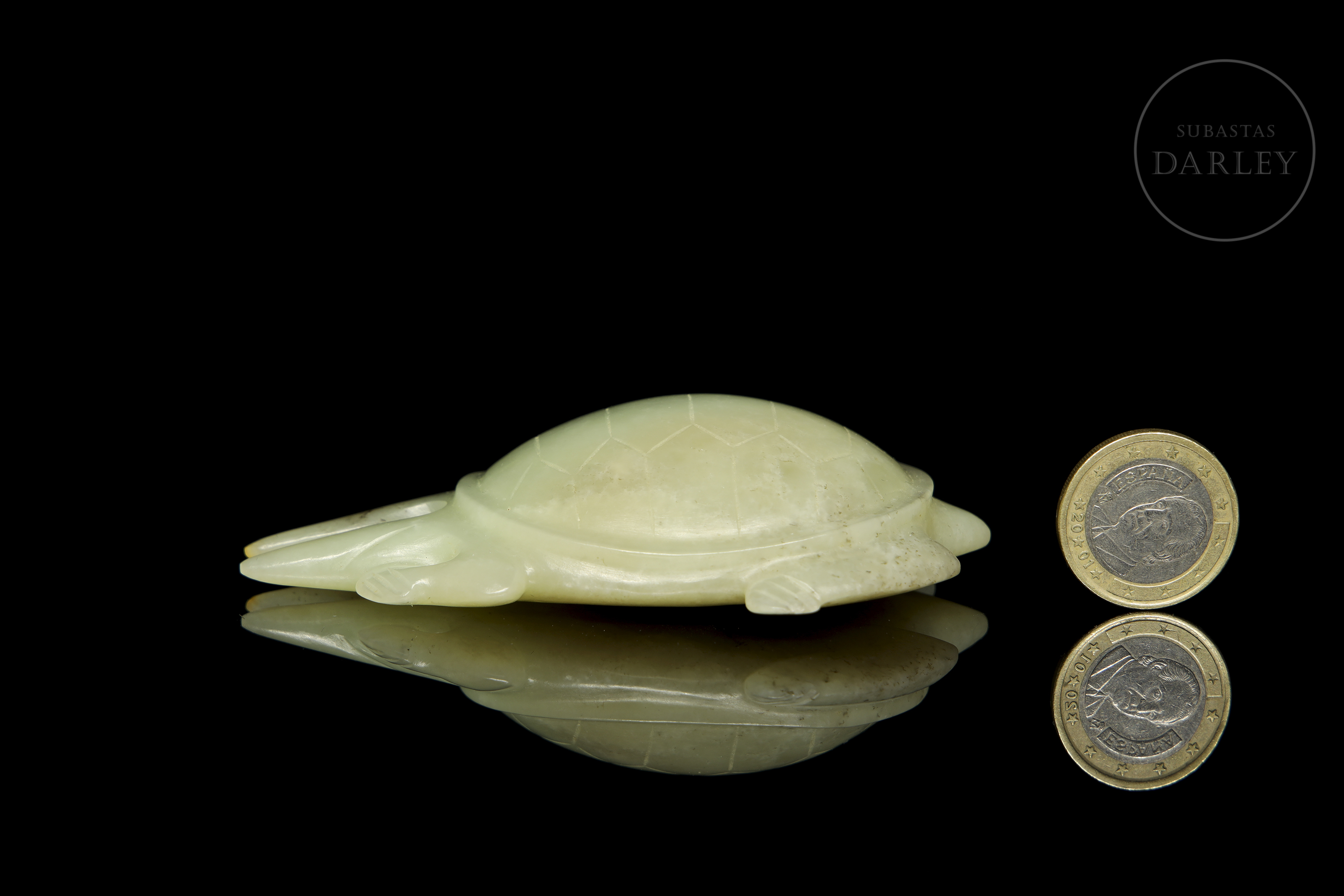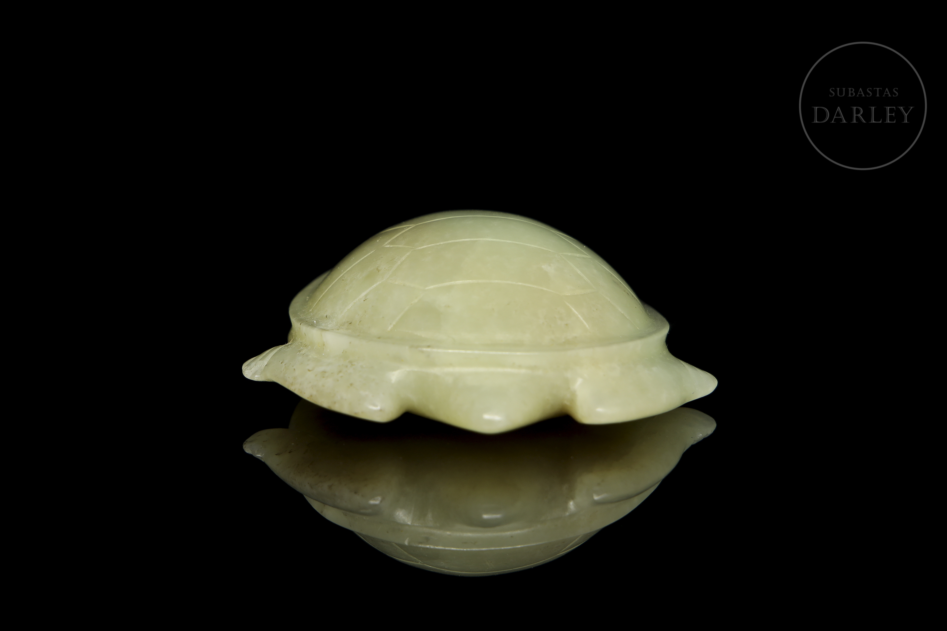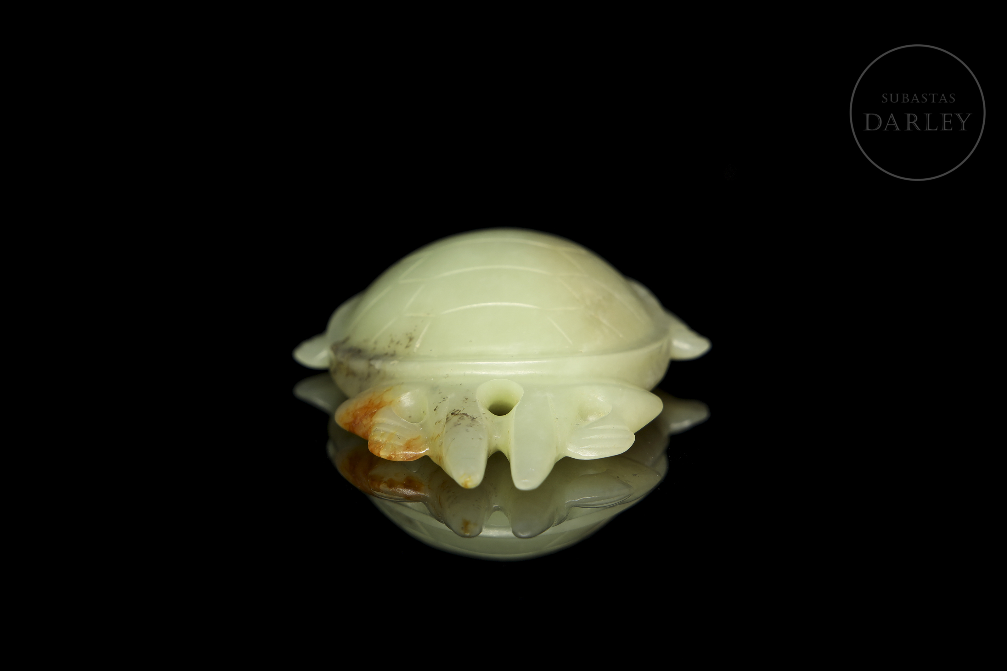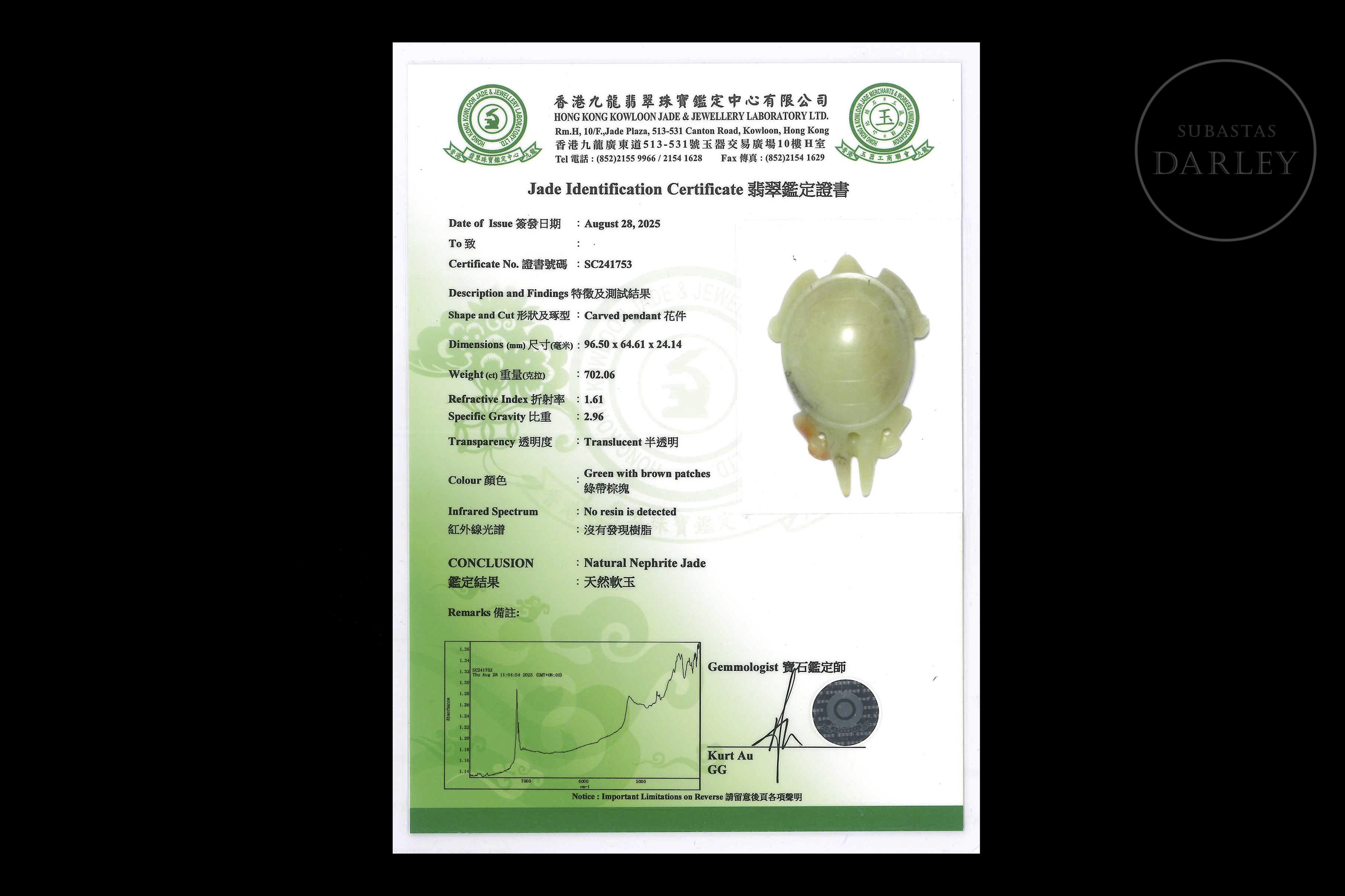 Nephrite jade amulet, carved from a pale green stone with brown inclusions, sculpted in the shape of a mythical turtle. It combines a simplified turtle shell, with incised plates, with a small head and stylized tail or hind legs. It has several perforations for use as a pendant.