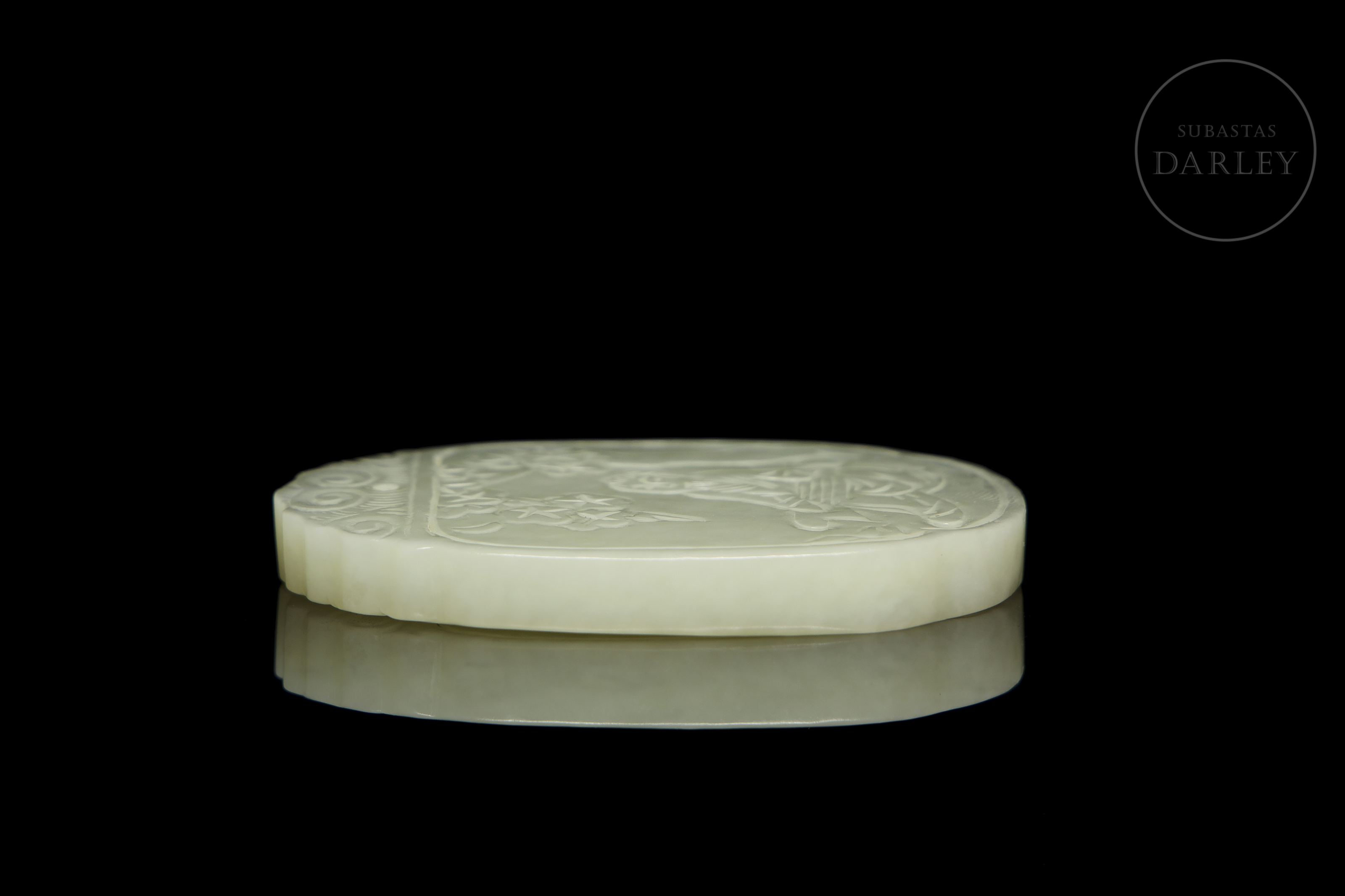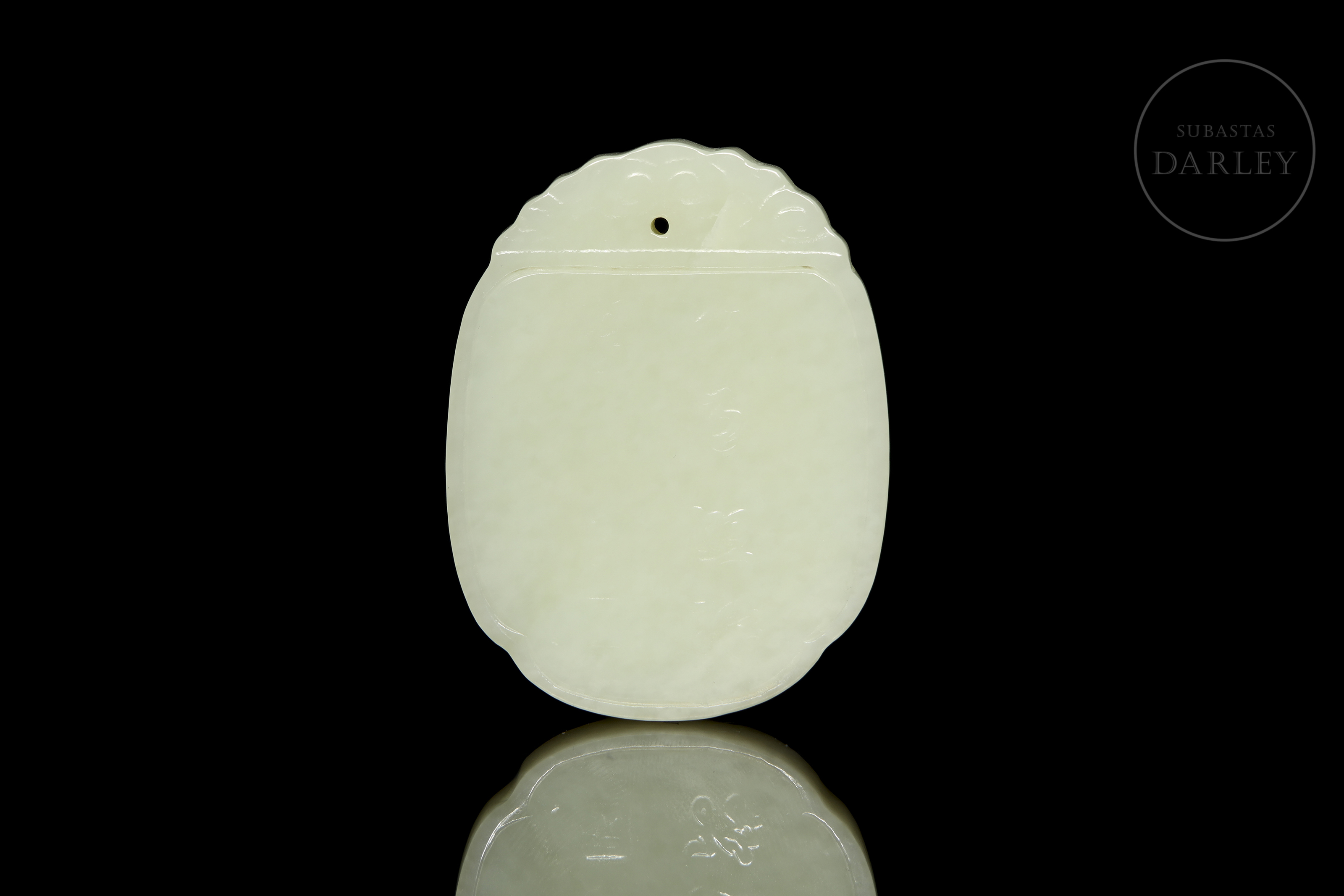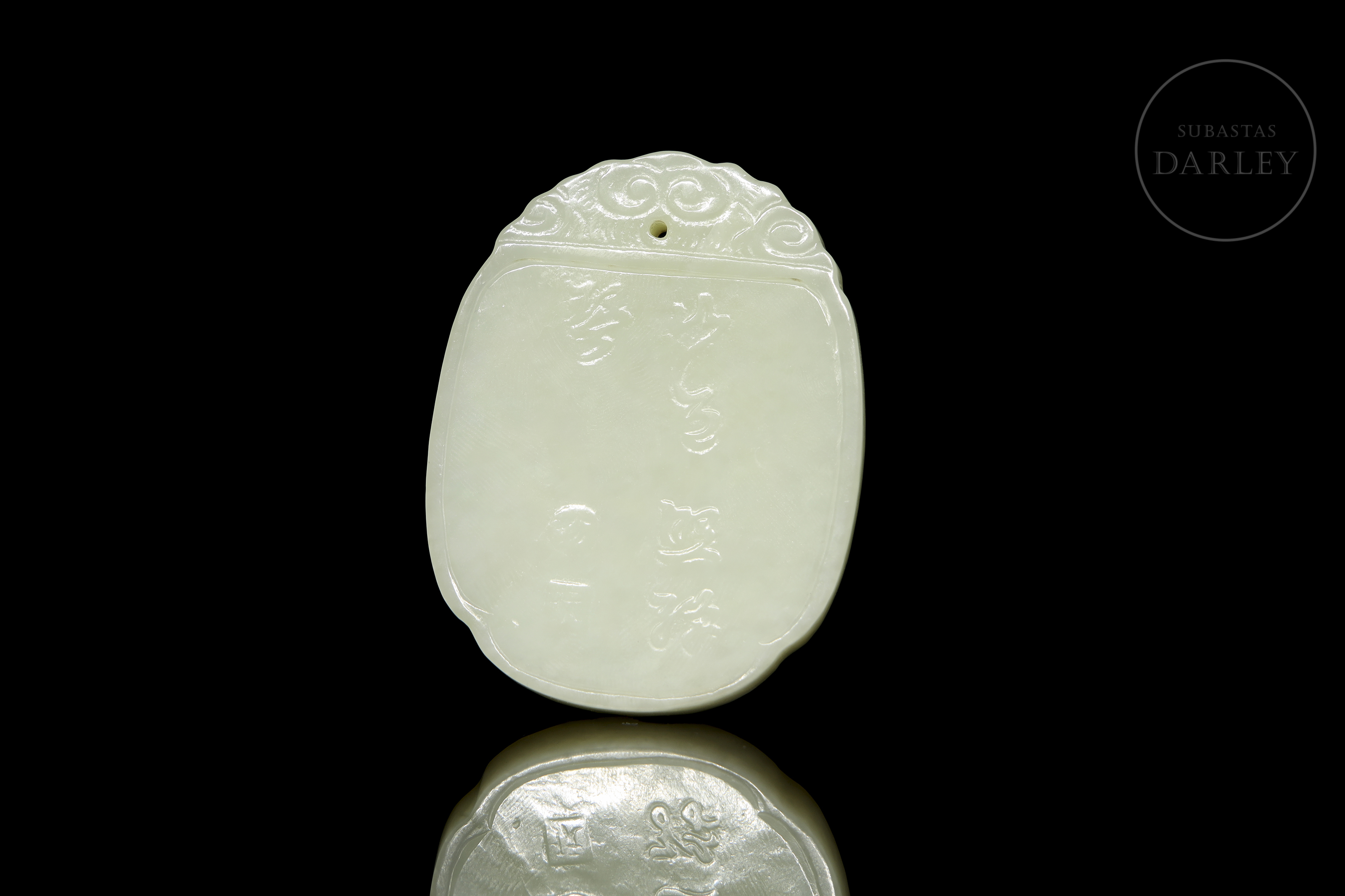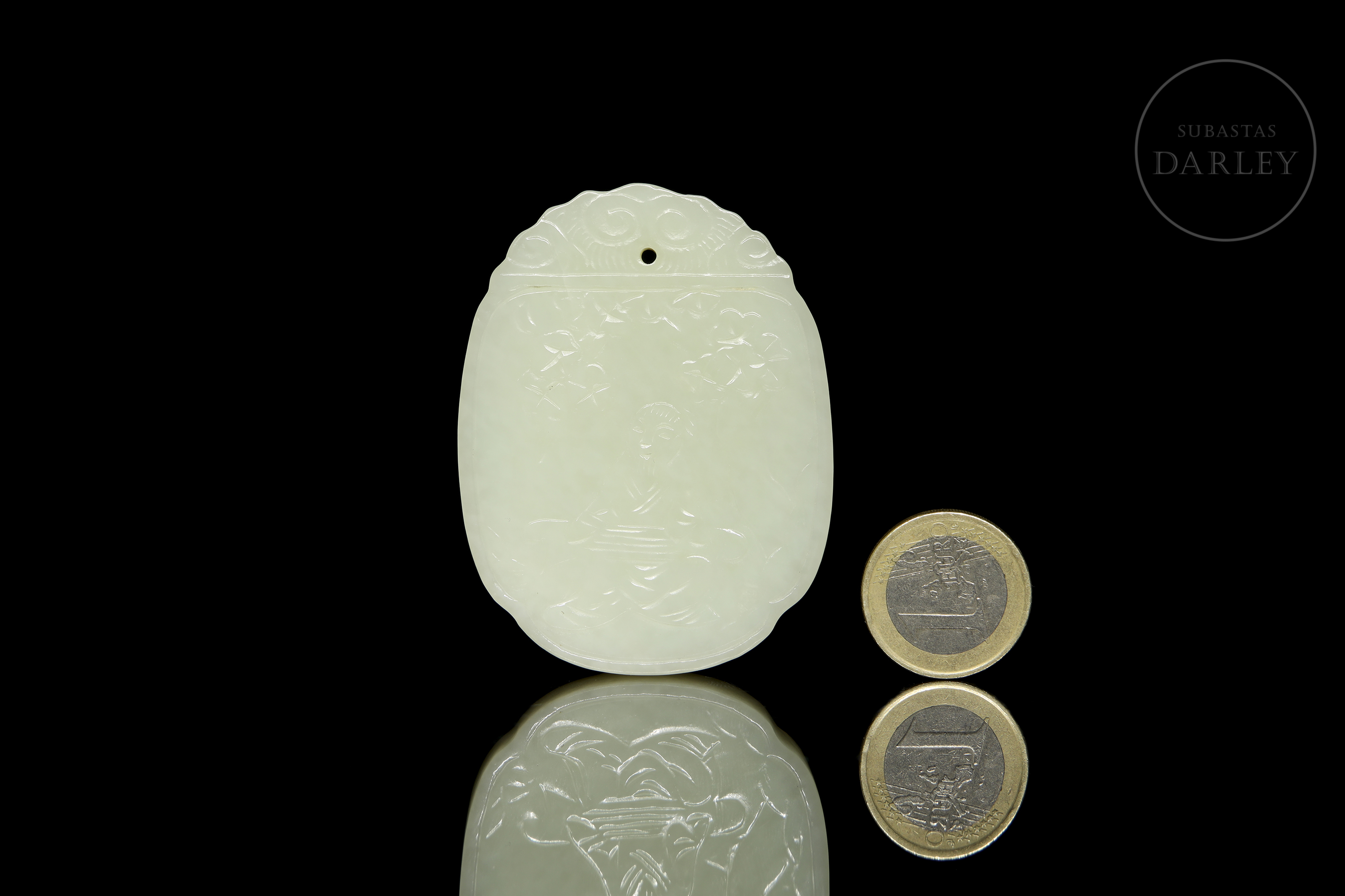 A pale jade pendant, finely carved in relief with the representation of an old man seated under a tree while playing the guqin. The reverse side bears an inscription. The upper part, topped with scrollwork, incorporates a hole for suspension. Qing Dynasty (1644–1912).