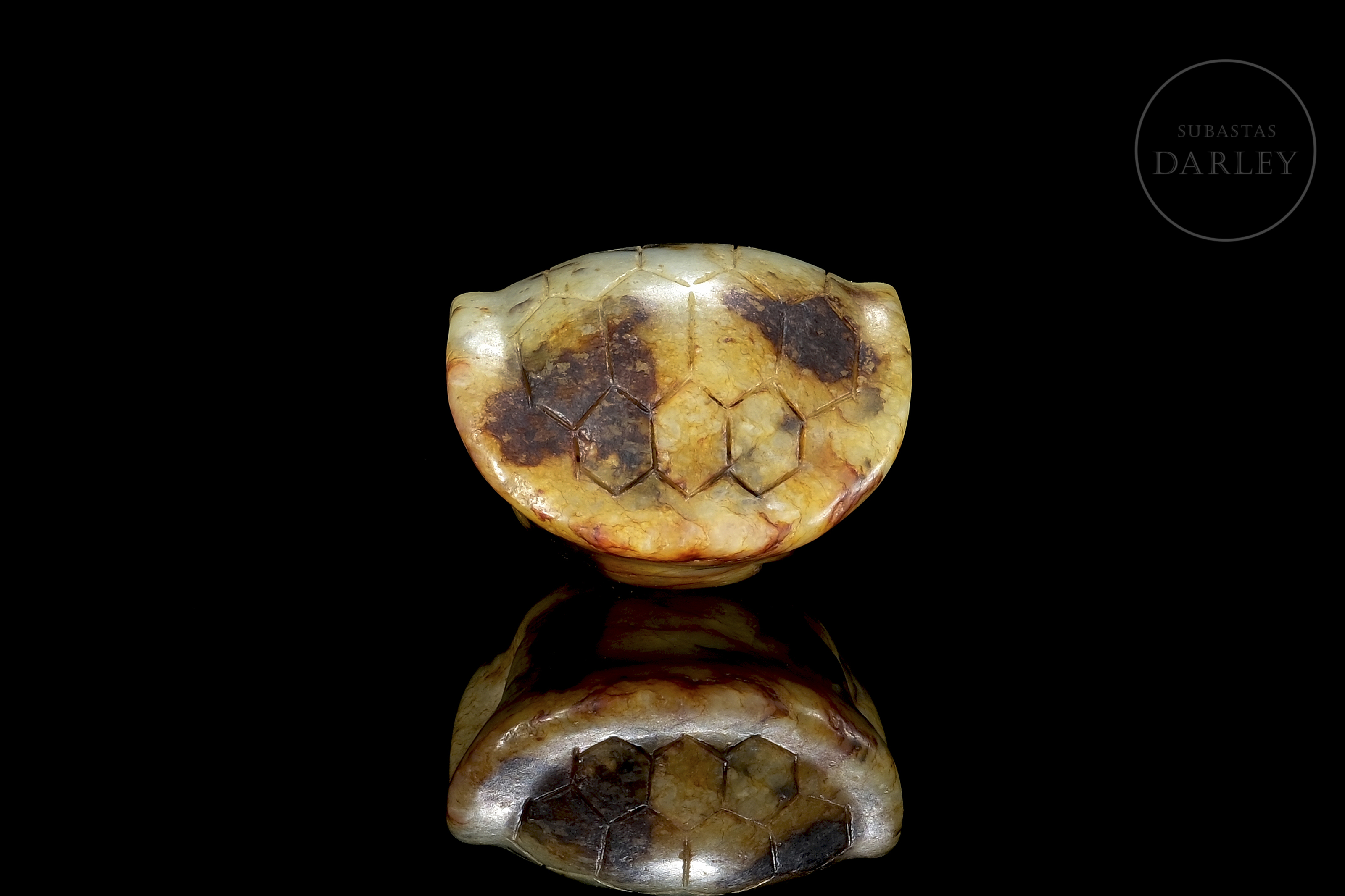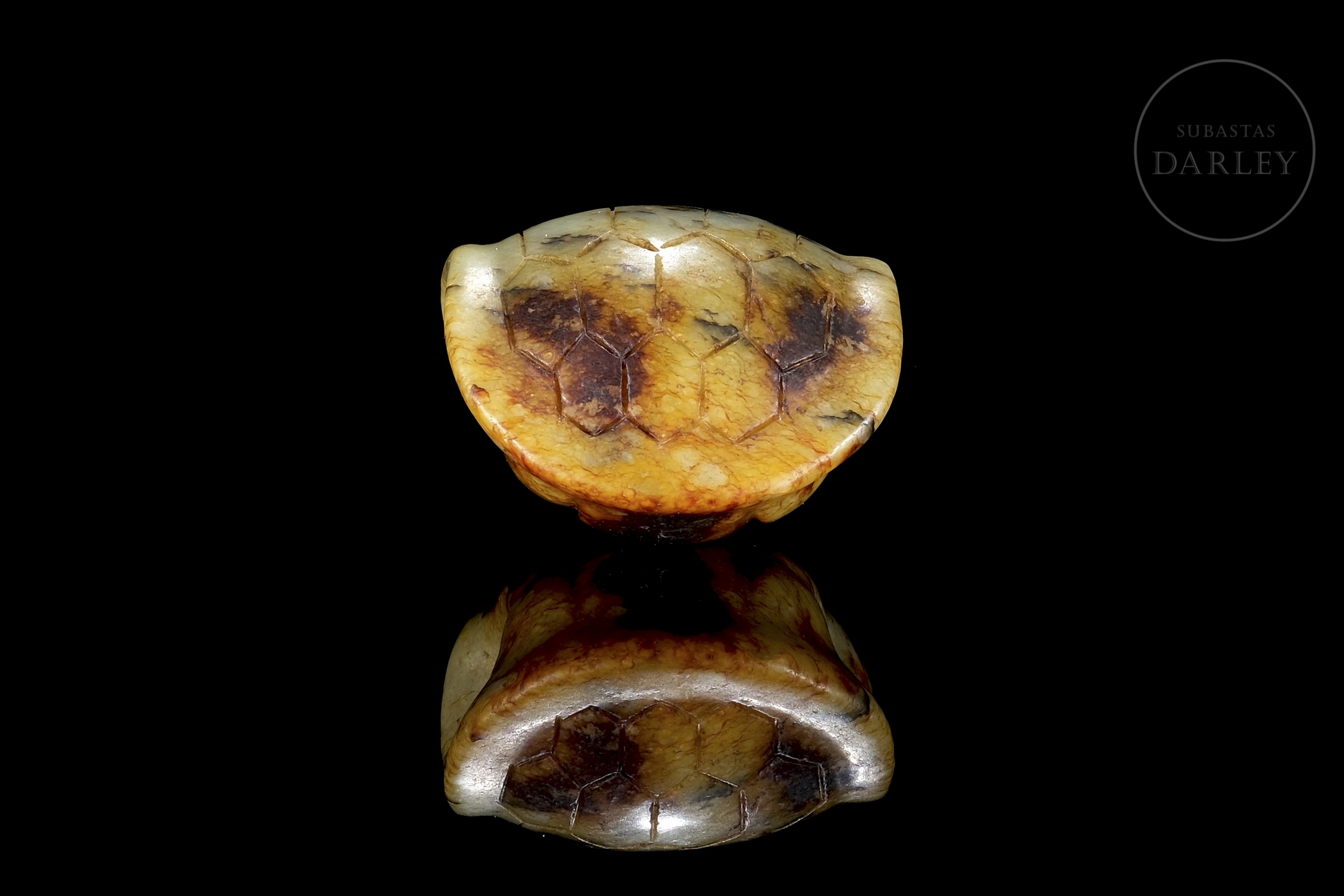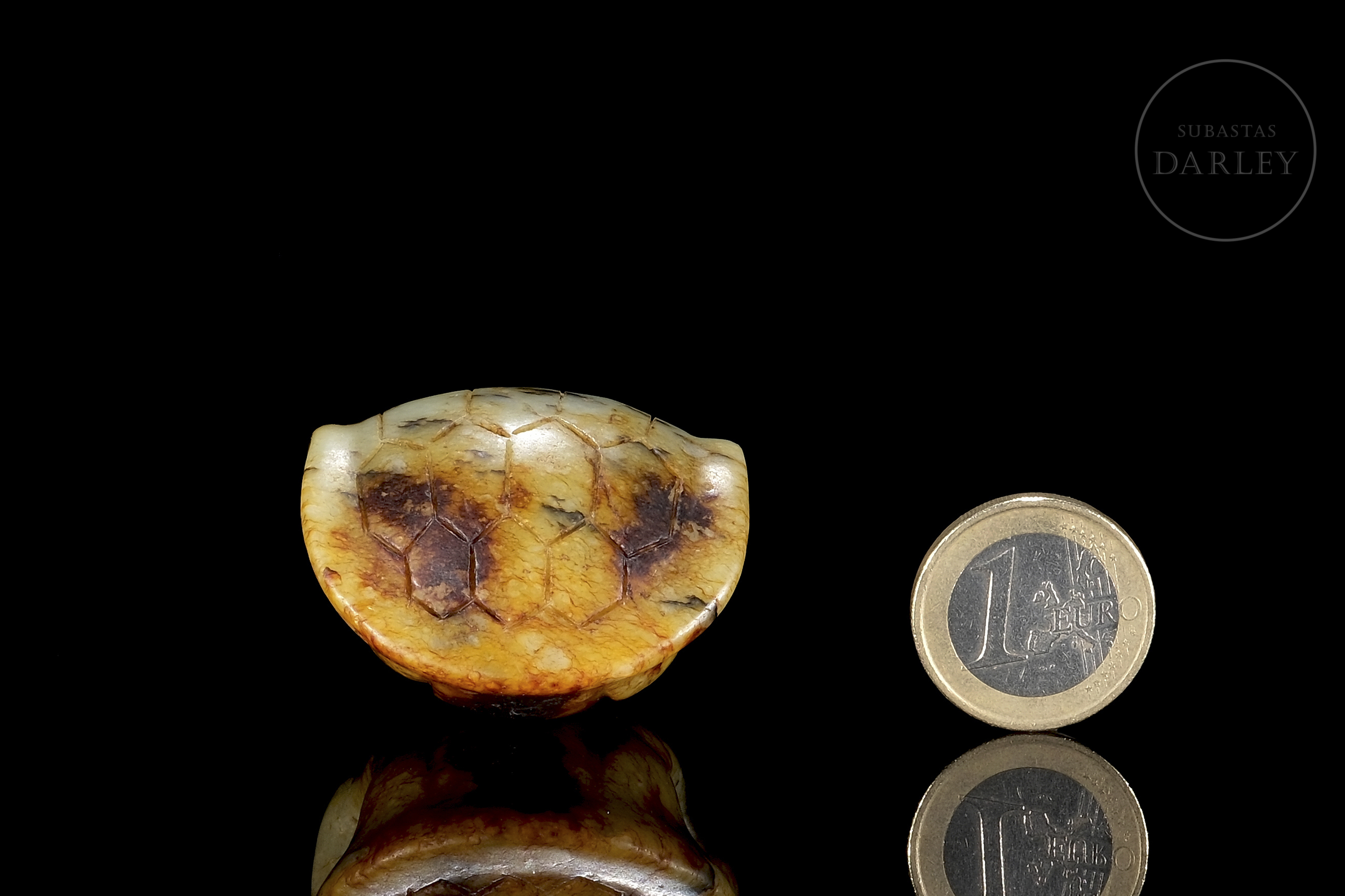 Carved and polished jade, whitish, with extensive veins and inclusions in brown and reddish tones. It represents a turtle shell in a naturalistic style. The convex surface is finely incised with hexagonal patterns that decorate the shell. The piece is perforated in the centre so that it can be suspended as an amulet.