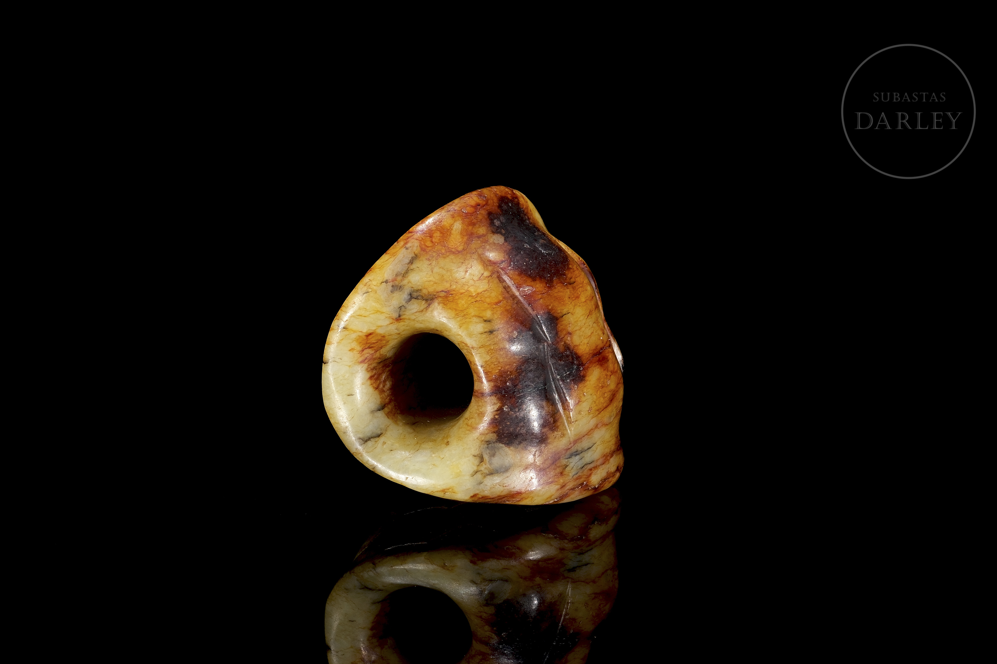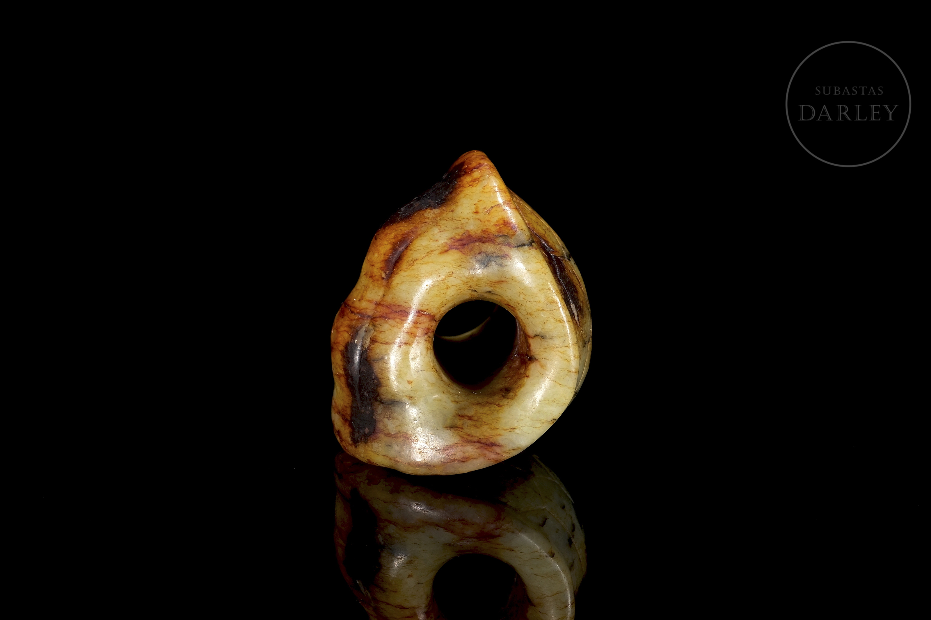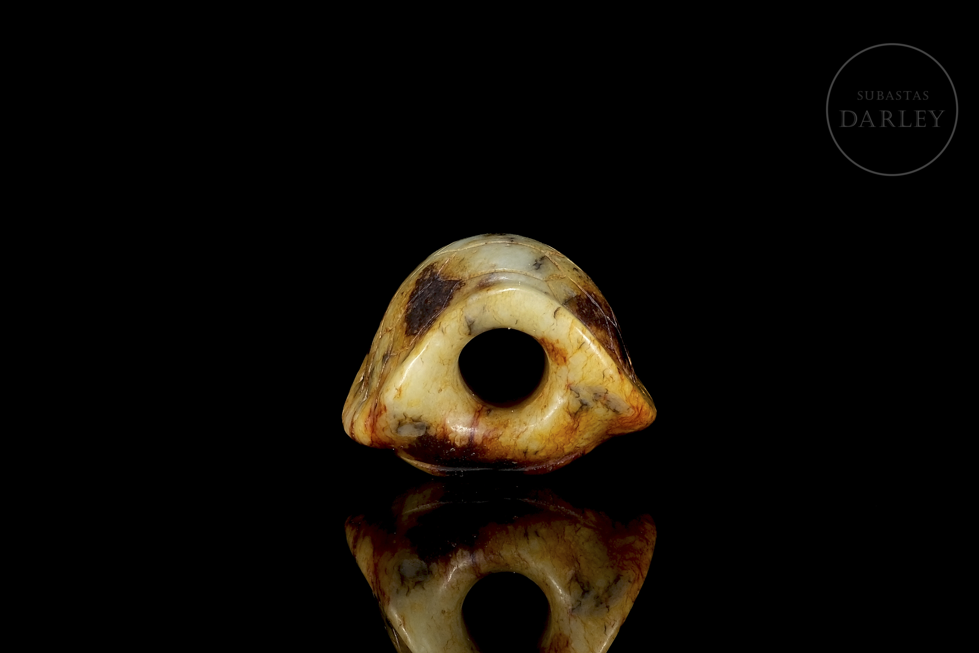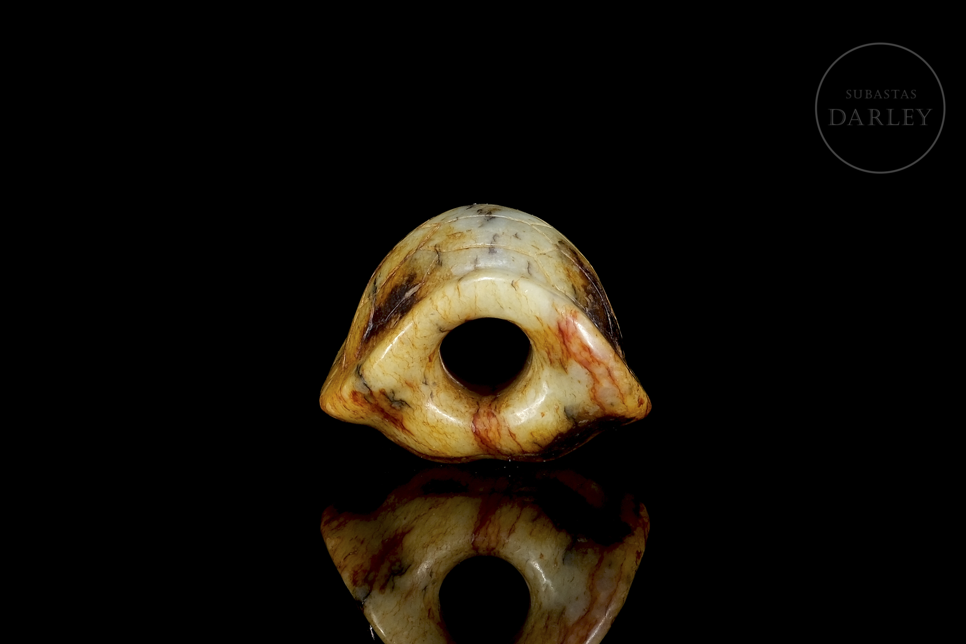 Carved and polished jade, whitish, with extensive veins and inclusions in brown and reddish tones. It represents a turtle shell in a naturalistic style. The convex surface is finely incised with hexagonal patterns that decorate the shell. The piece is perforated in the centre so that it can be suspended as an amulet.