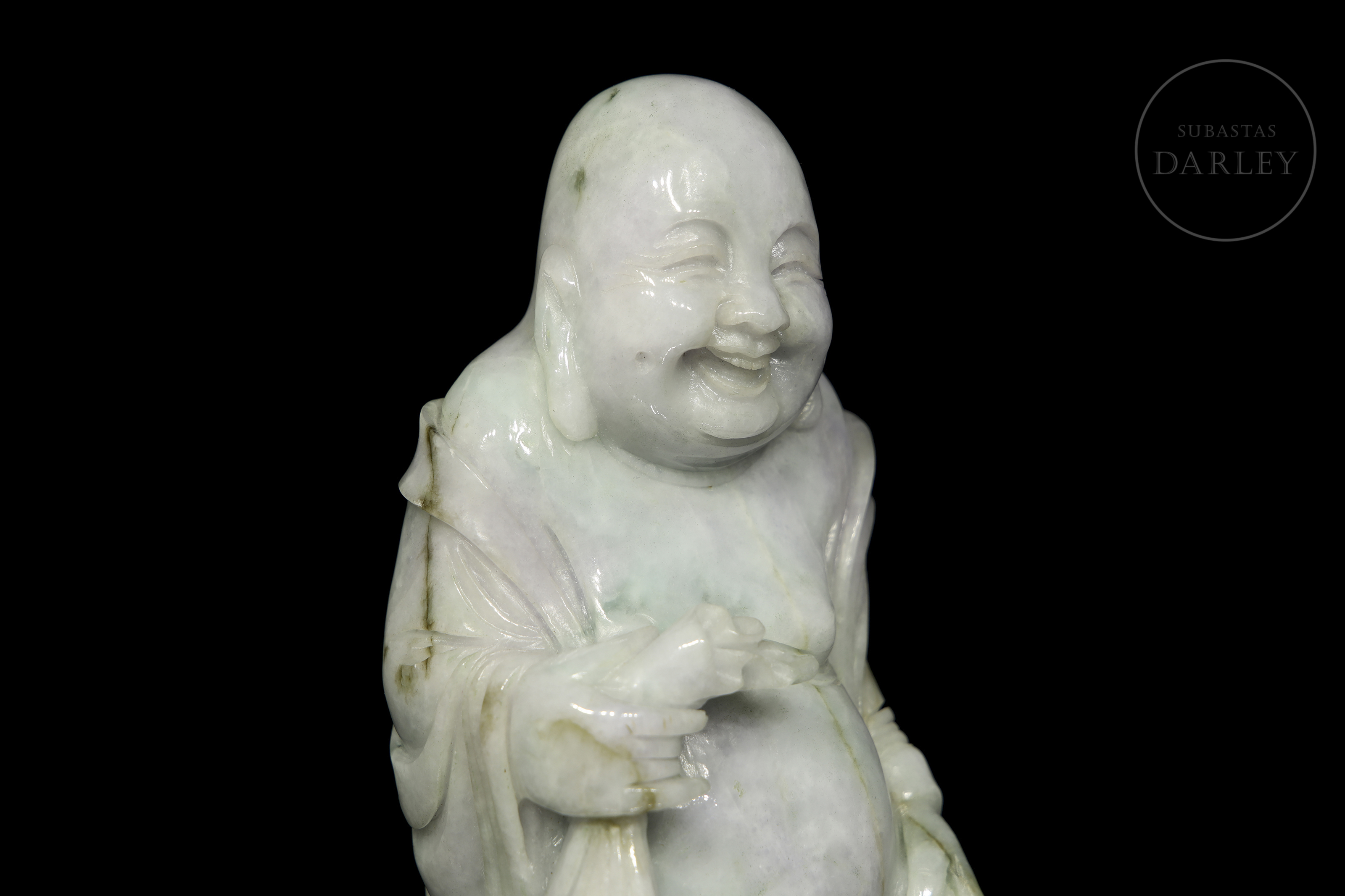 乳白色的翡翠雕刻,泛着淡紫色调,并带有绿、棕、黑三色纹路。造型为立姿的布袋和尚,身躯丰腴,神态欢愉。衣袂垂落的纹饰雕刻细腻,可见人物手持长串念珠。