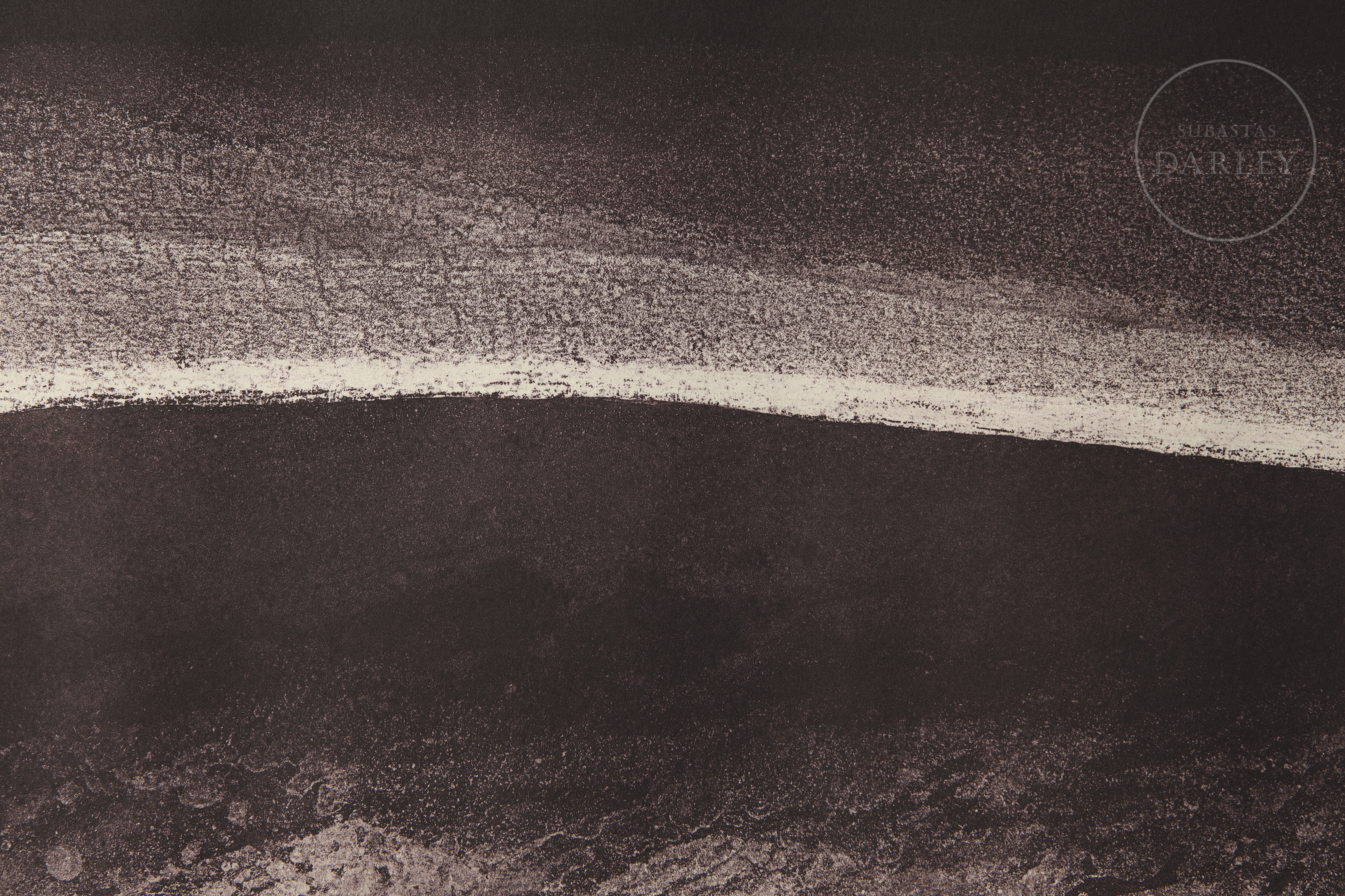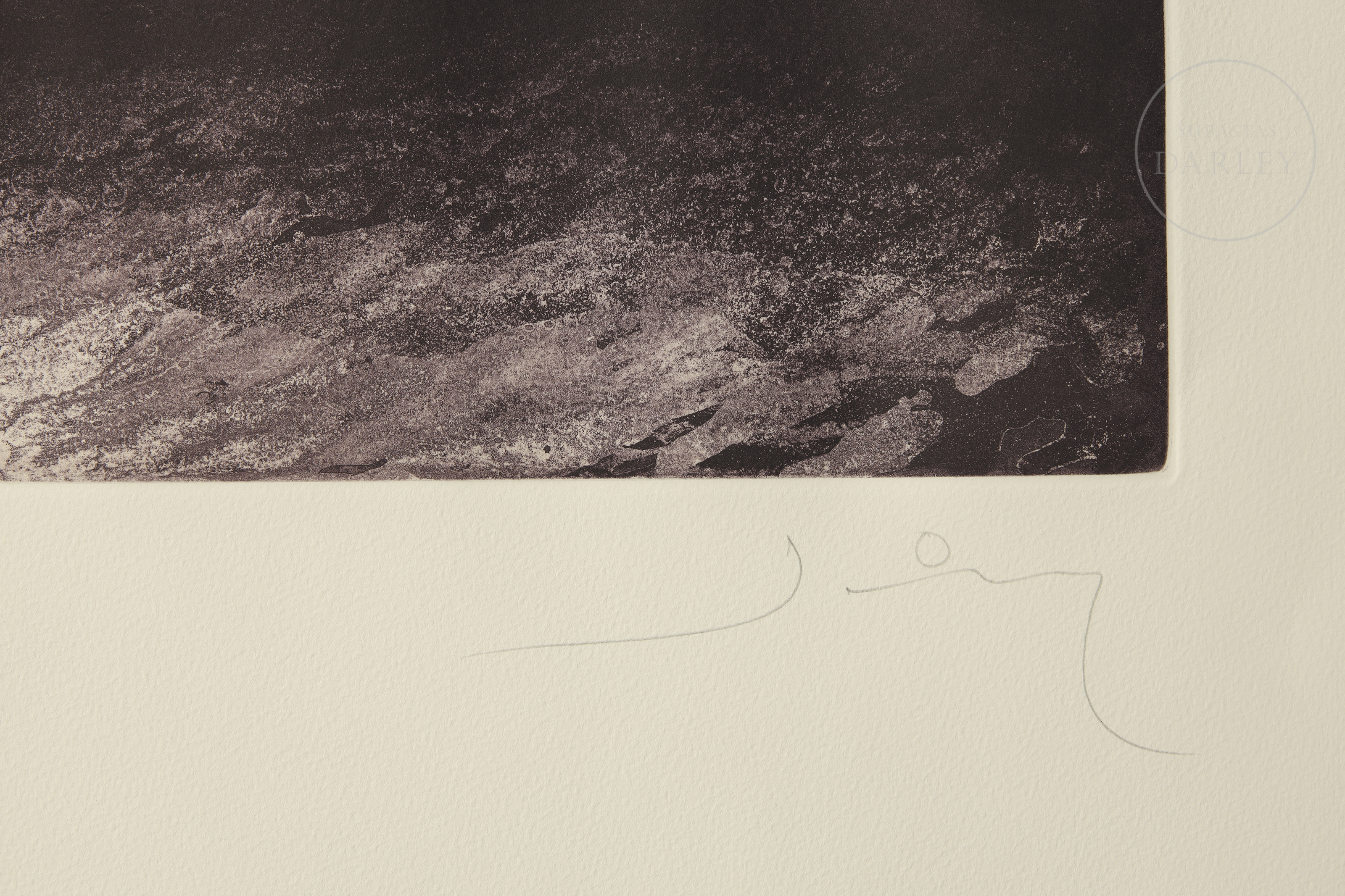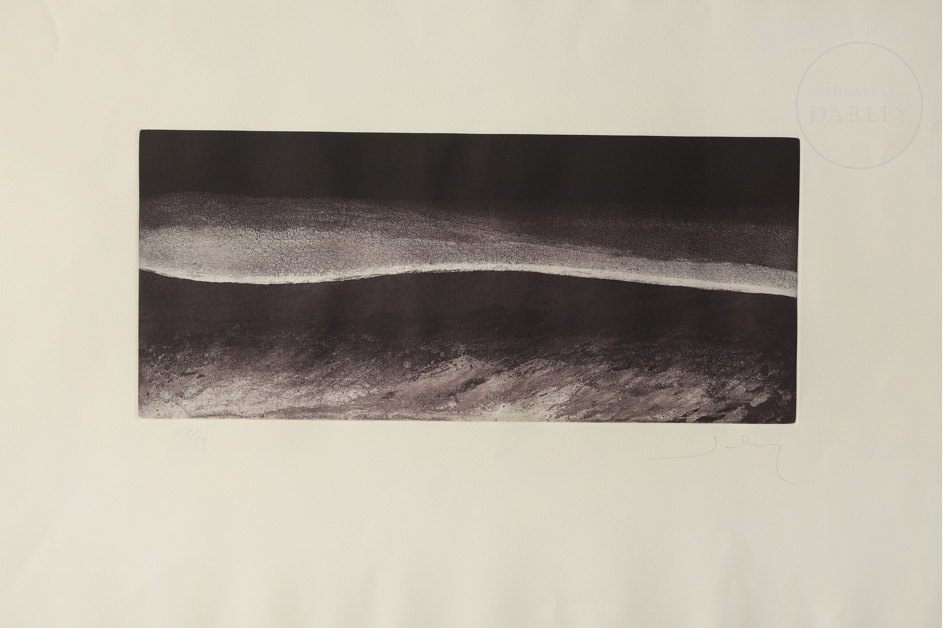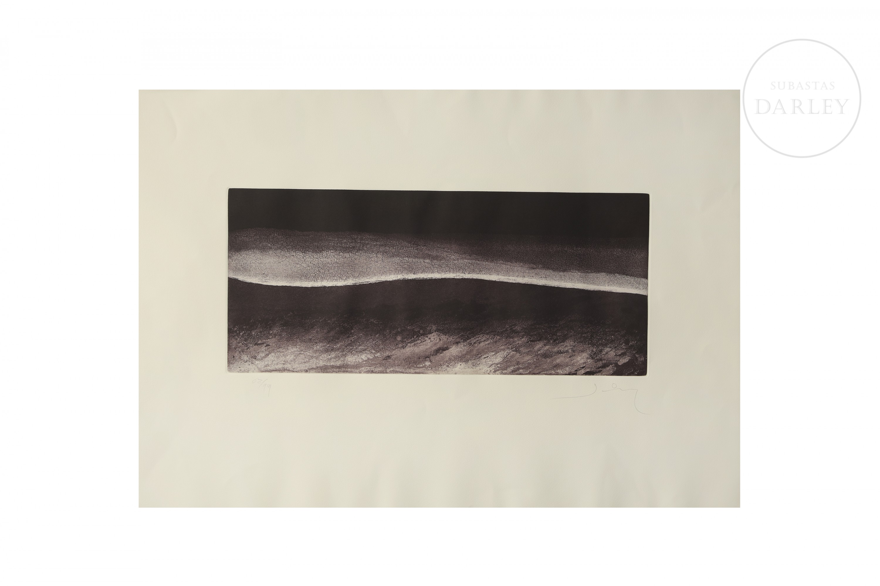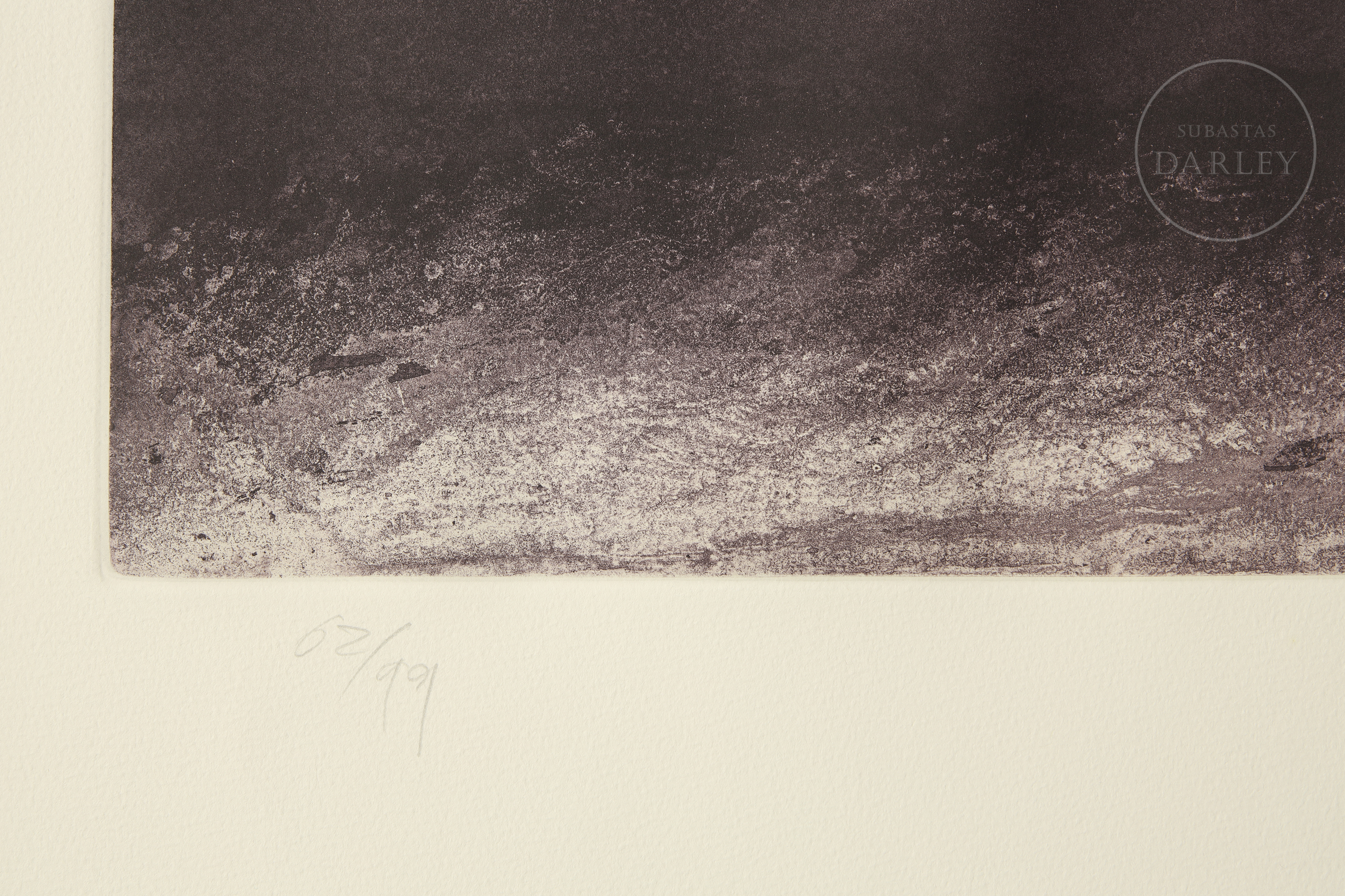 纸上蚀刻技法。紫色调矩形构图。右下角签名,左下角铅笔编号“62/99”。