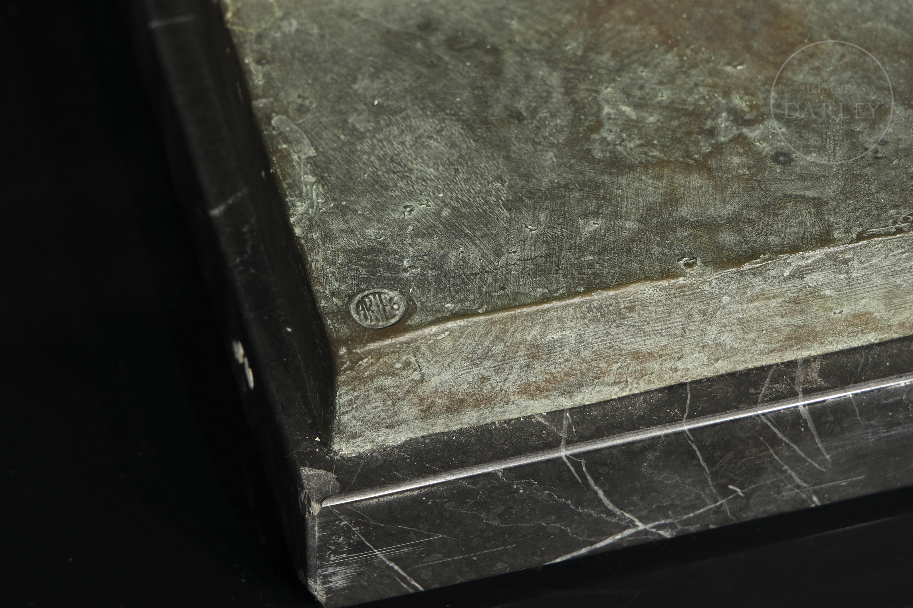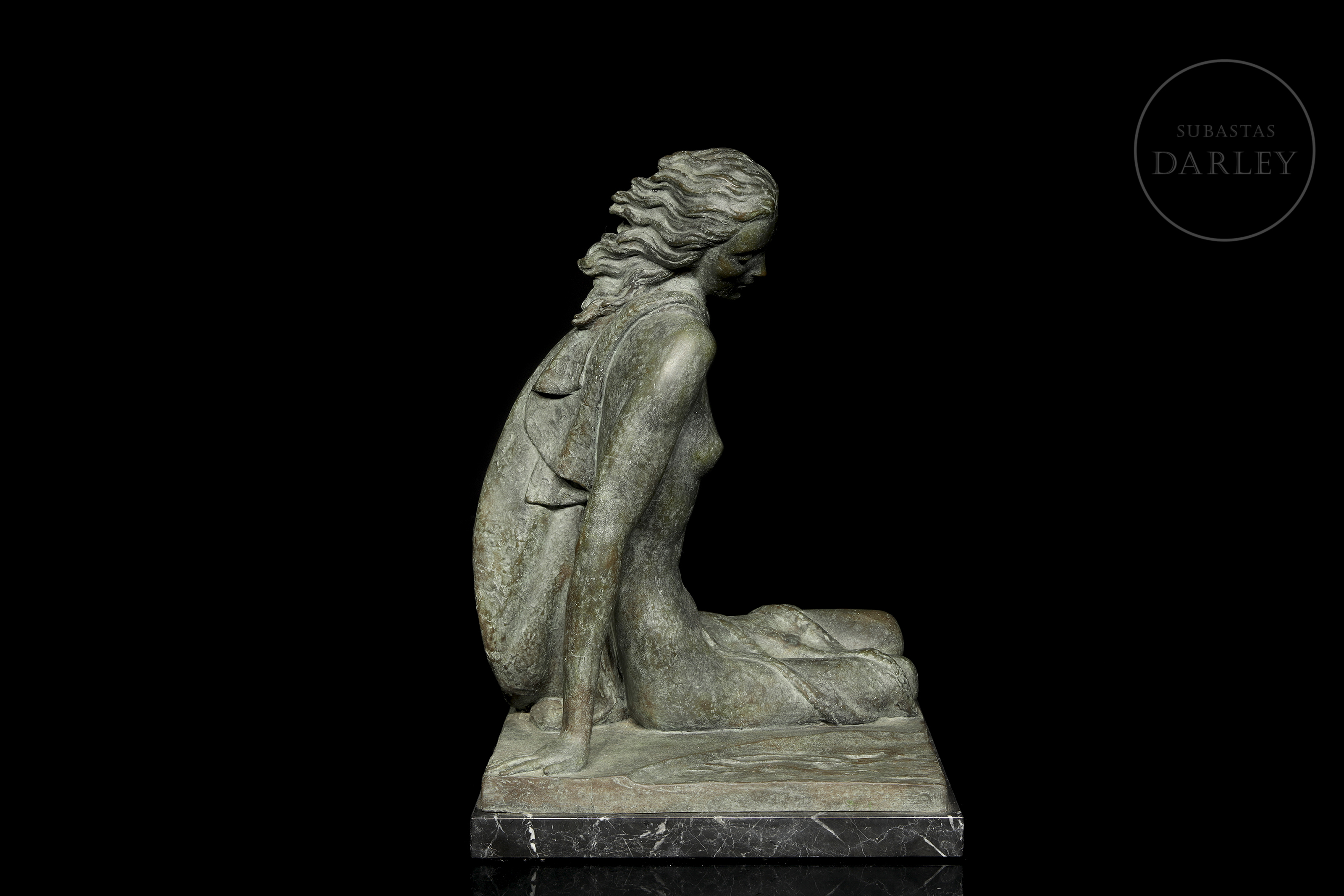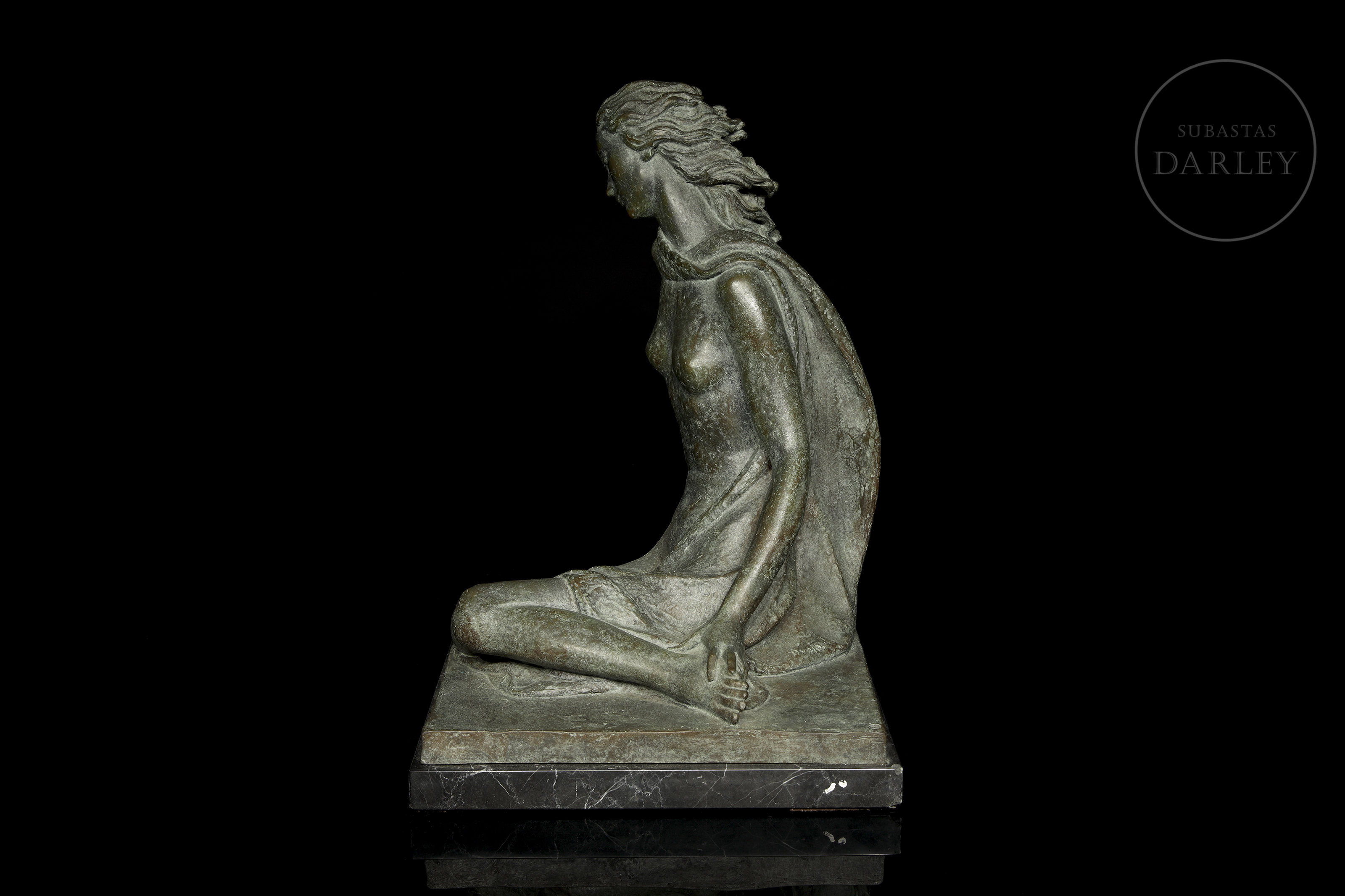 Patinated bronze sculpture on a marble pedestal. Nude female figure, depicted in a serene and melancholic seated pose. Signed ‘Avalos’ and foundry initials ‘ARTE’ on the base.