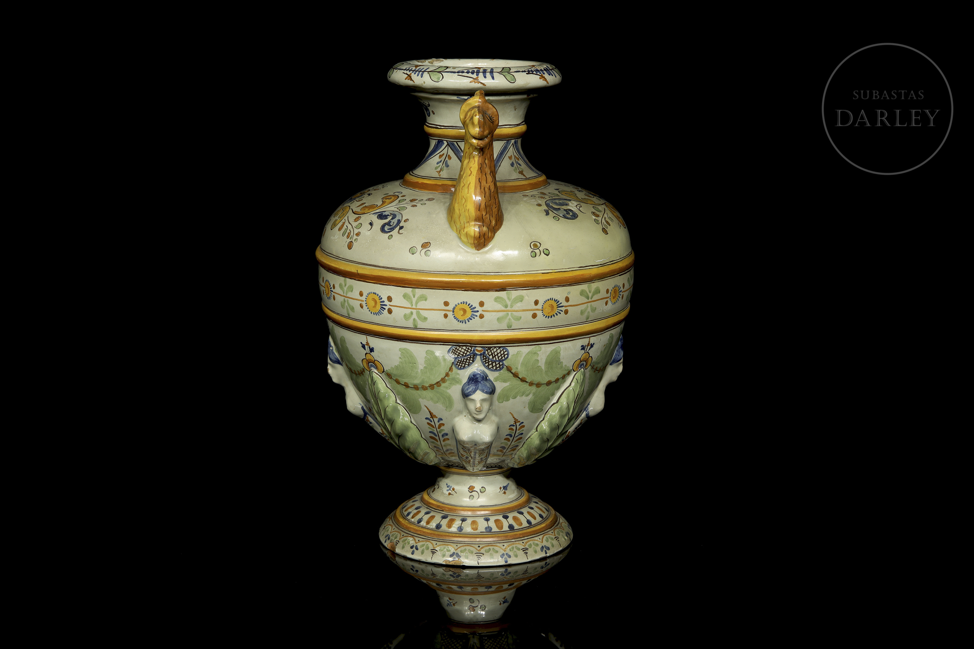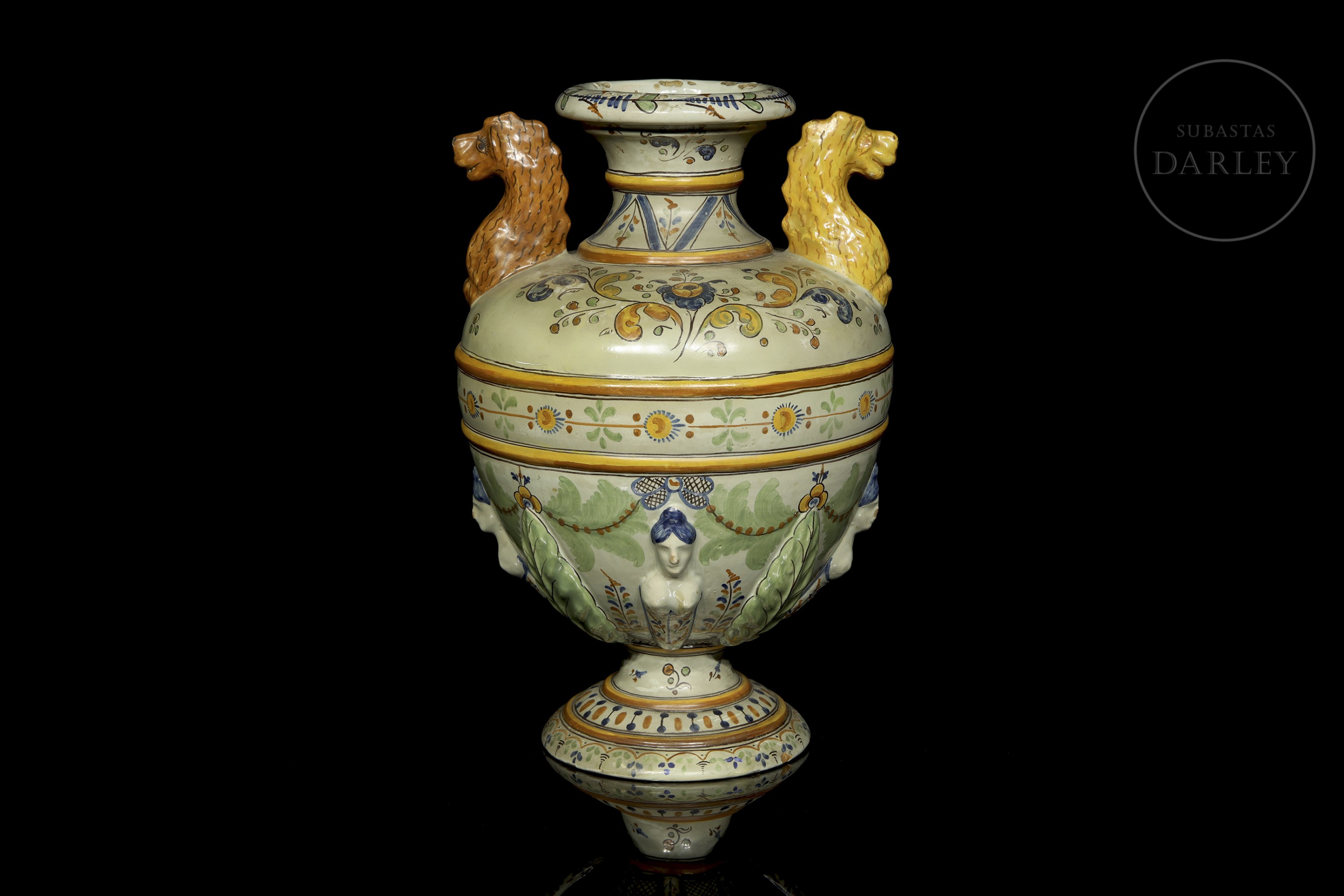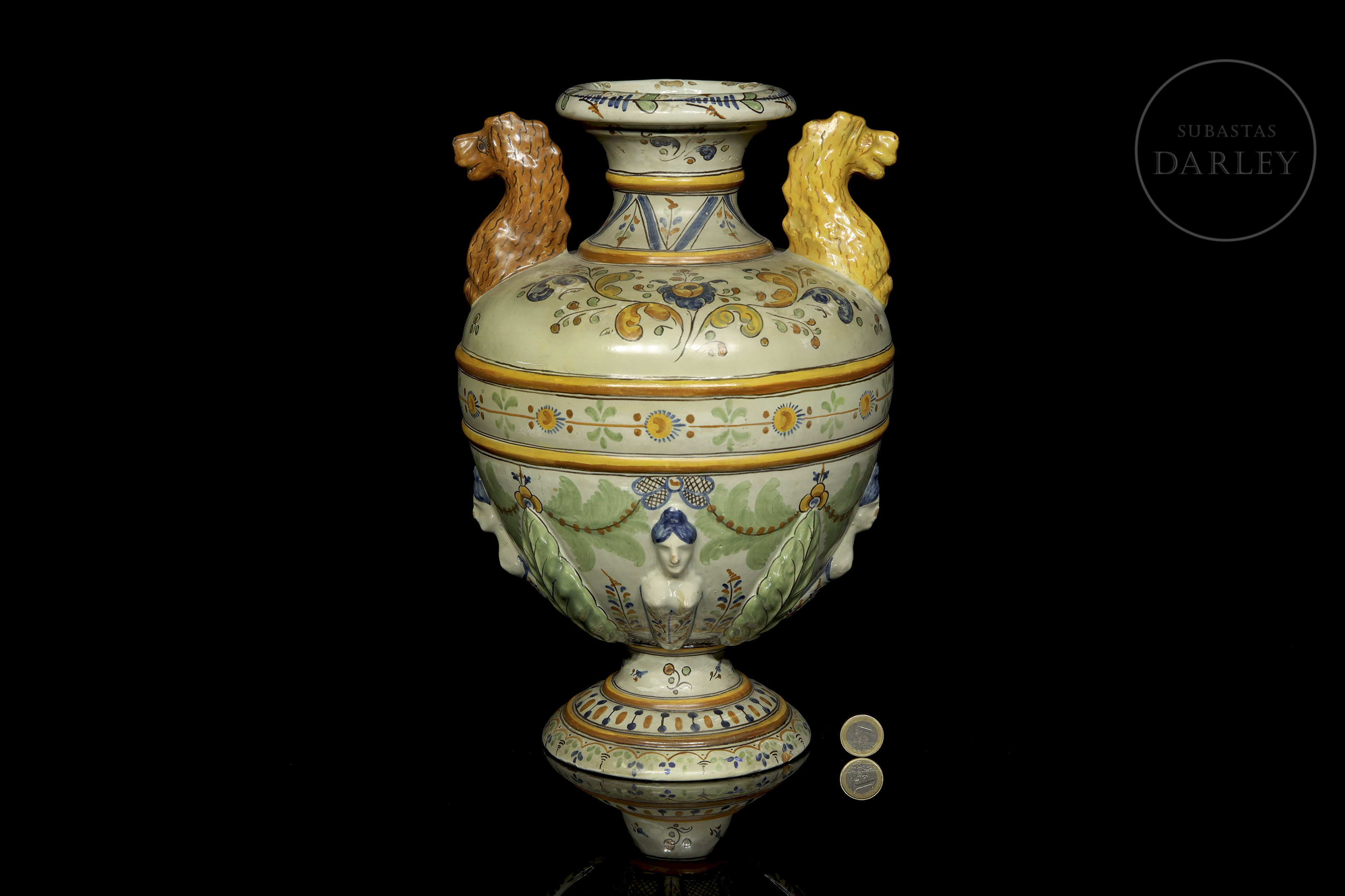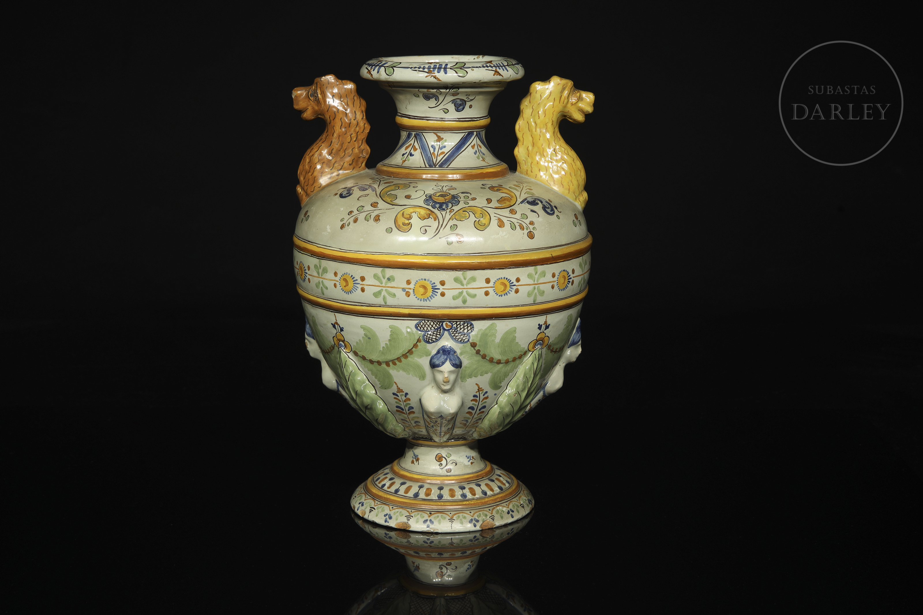 多色釉双耳瓶,饰以17世纪塔拉韦拉风格纹样。瓶身饰有浮雕花卉纹、熊掌叶纹及女性头像。瓶耳以焦糖赭石色调塑成狮首造型。蓝、绿、黄三色釉彩绚丽夺目。
