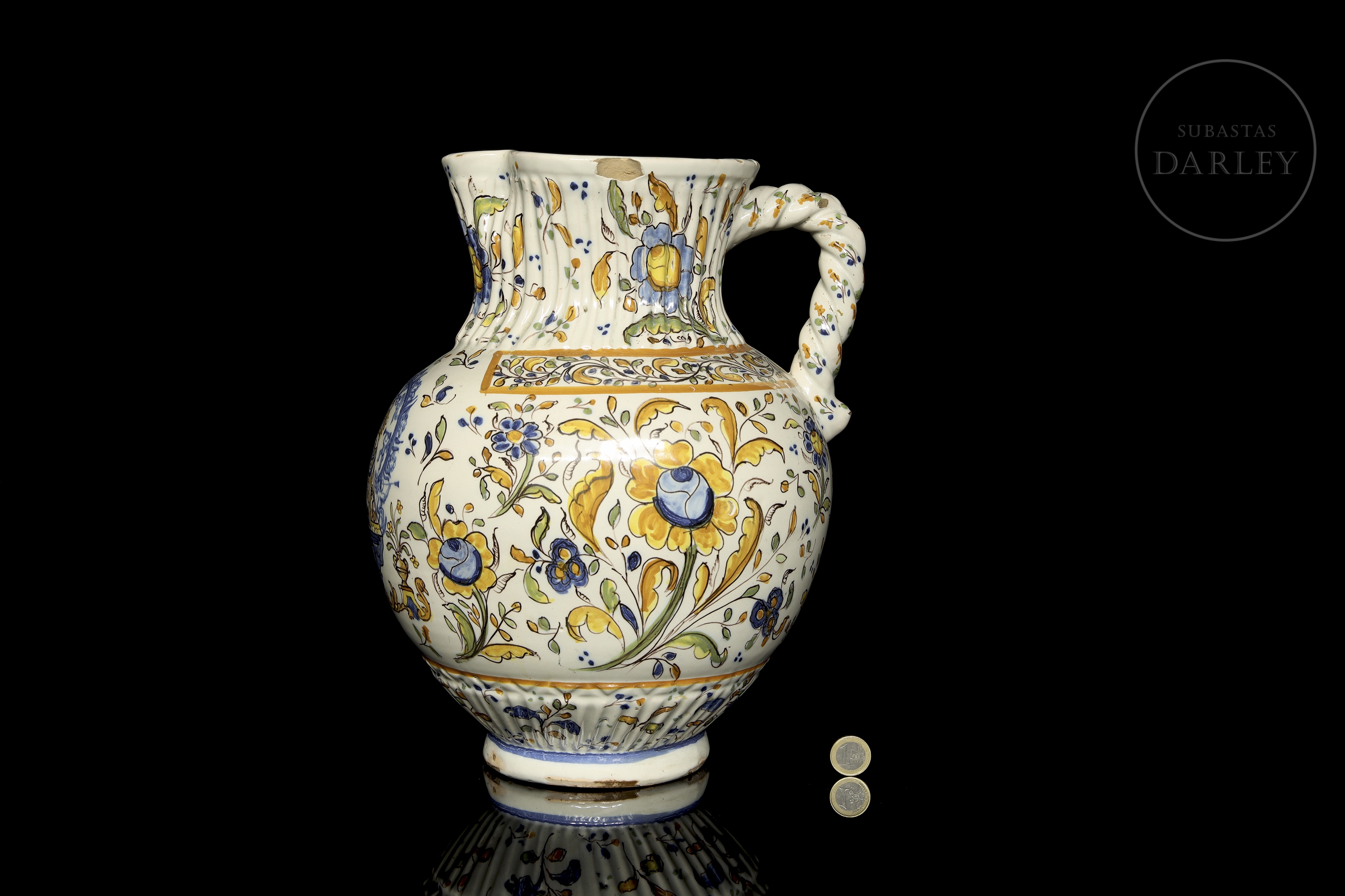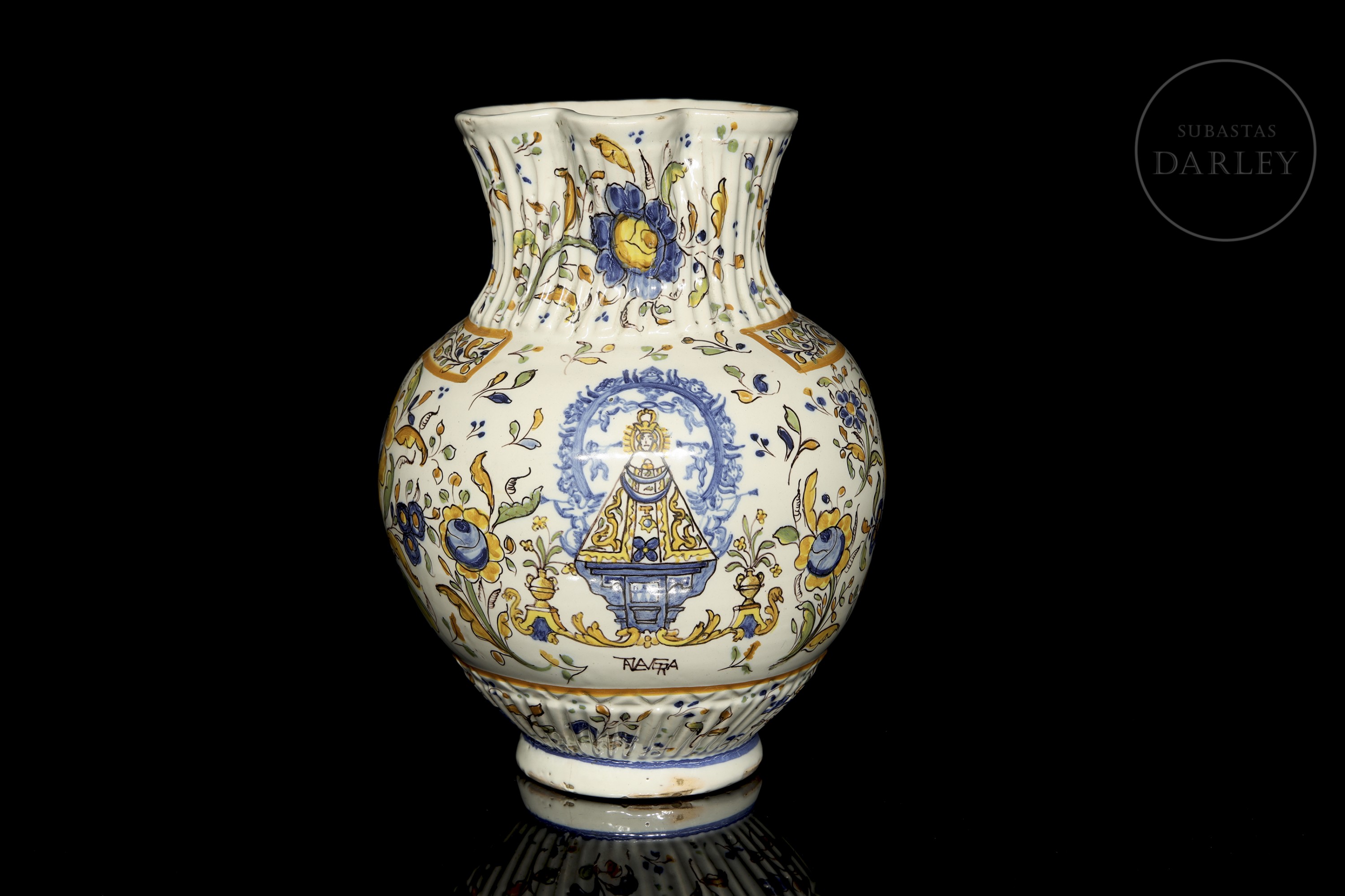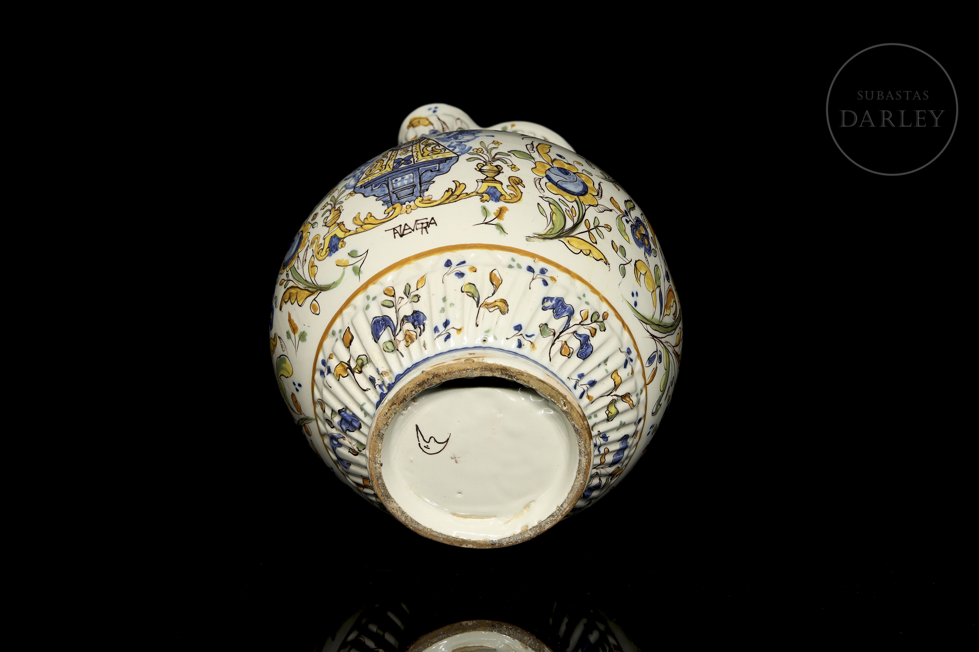 塔拉韦拉陶器。精美陶制壶具,扭纹壶柄配凹槽颈部。饰以蓝、黄、绿三色花卉纹样,中央饰板描绘普拉多圣母像。器身标有“TALAVERA”字样,底座留有艺术家签名。壶口处有细微裂痕。