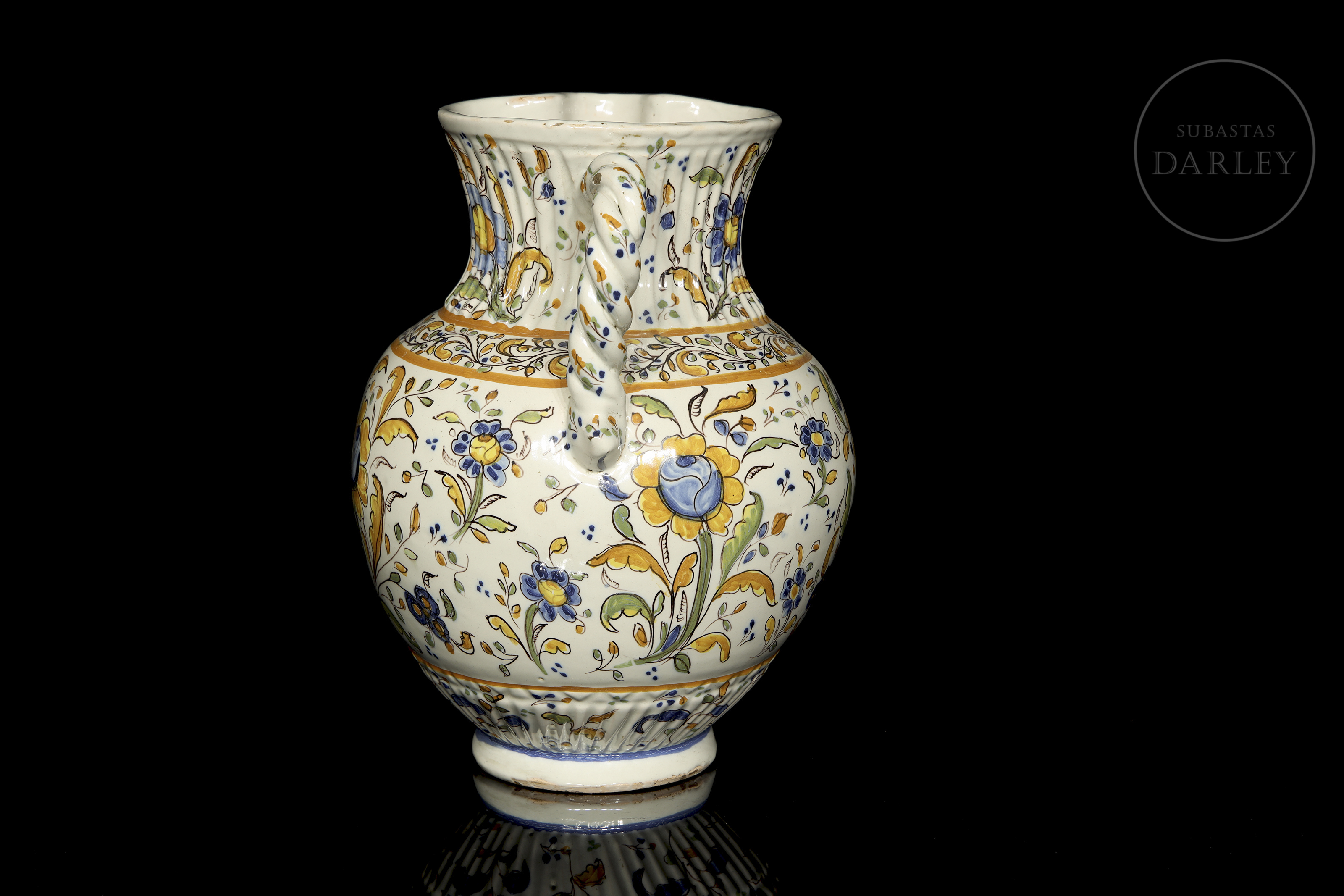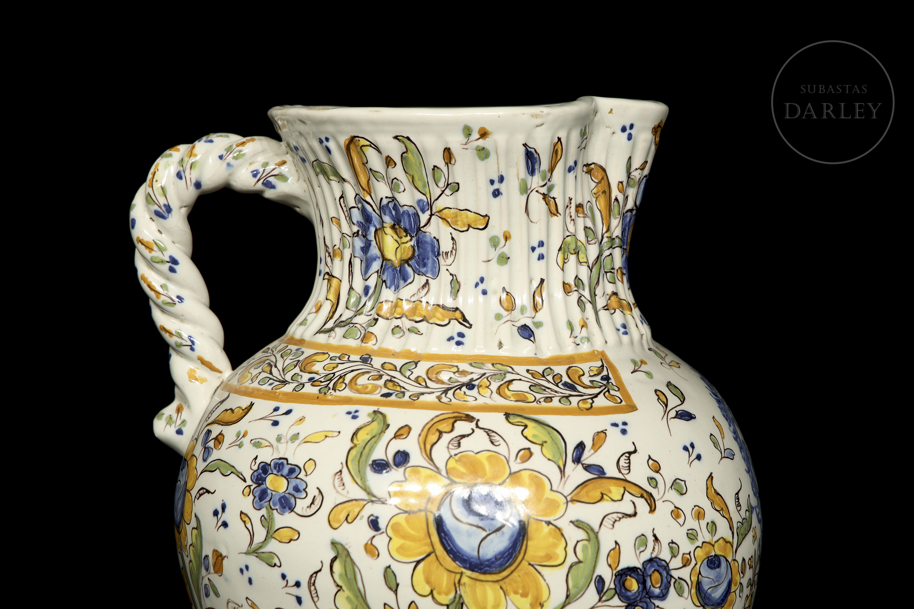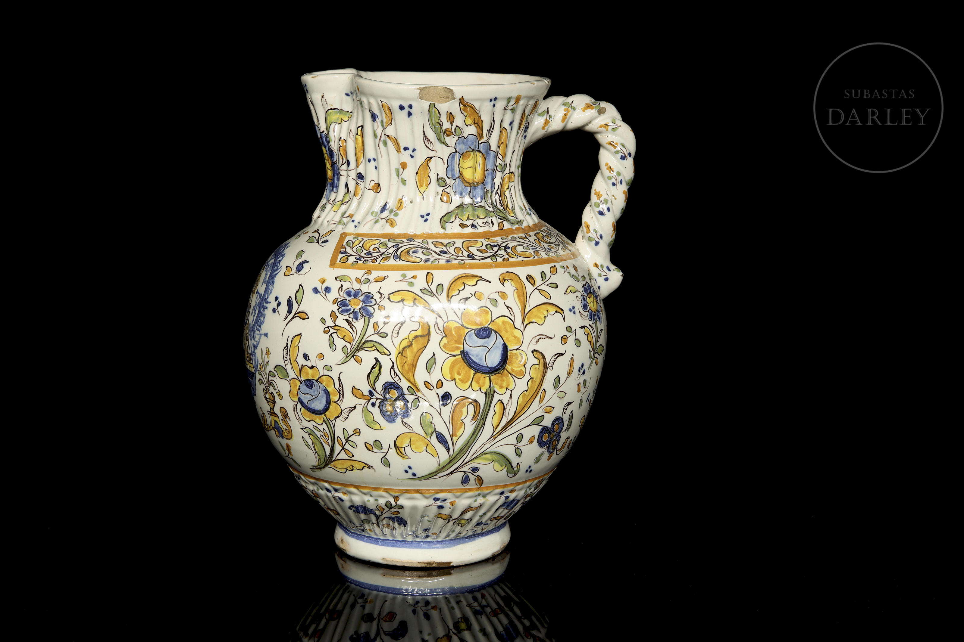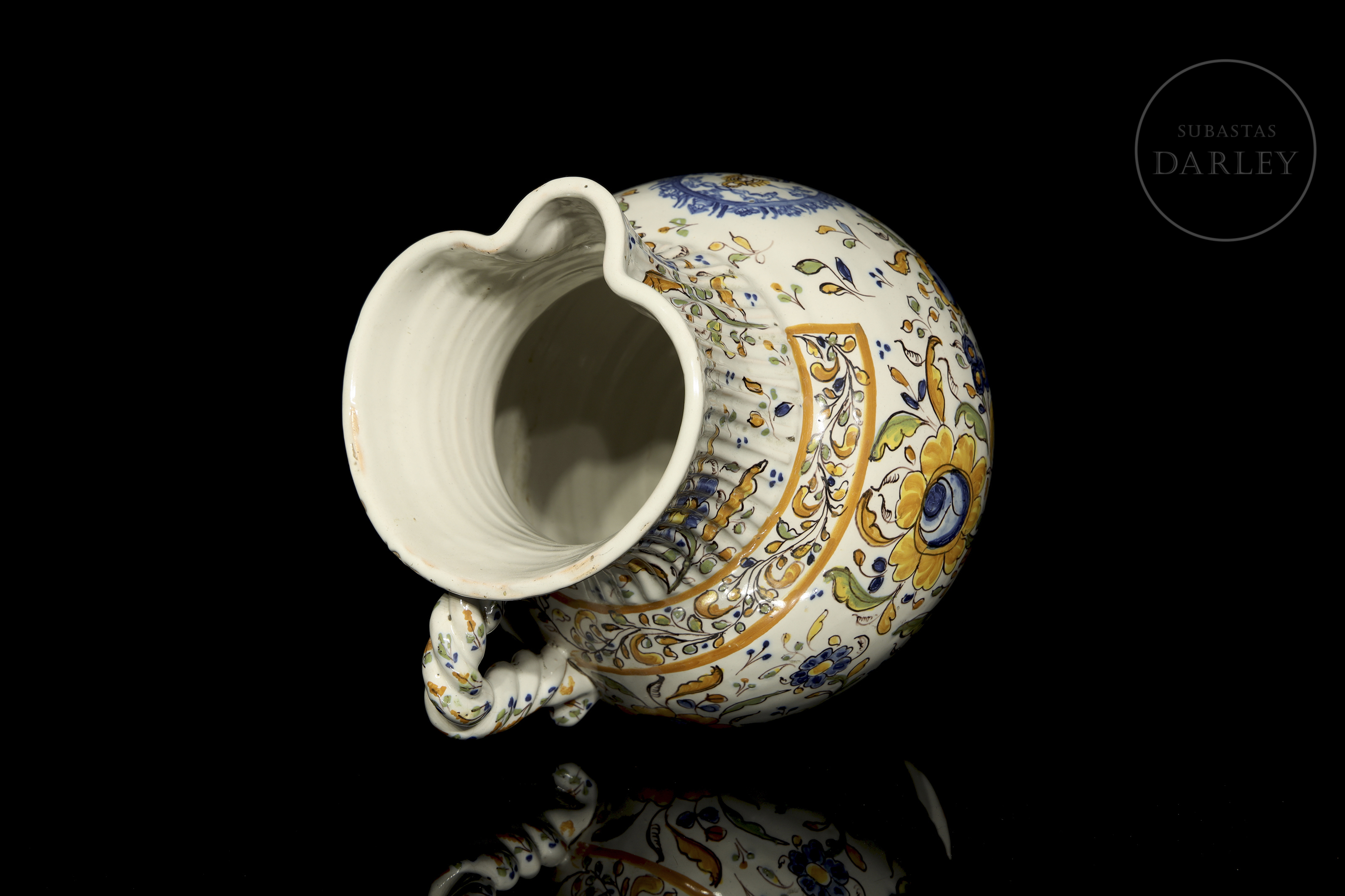 塔拉韦拉陶器。精美陶制壶具,扭纹壶柄配凹槽颈部。饰以蓝、黄、绿三色花卉纹样,中央饰板描绘普拉多圣母像。器身标有“TALAVERA”字样,底座留有艺术家签名。壶口处有细微裂痕。