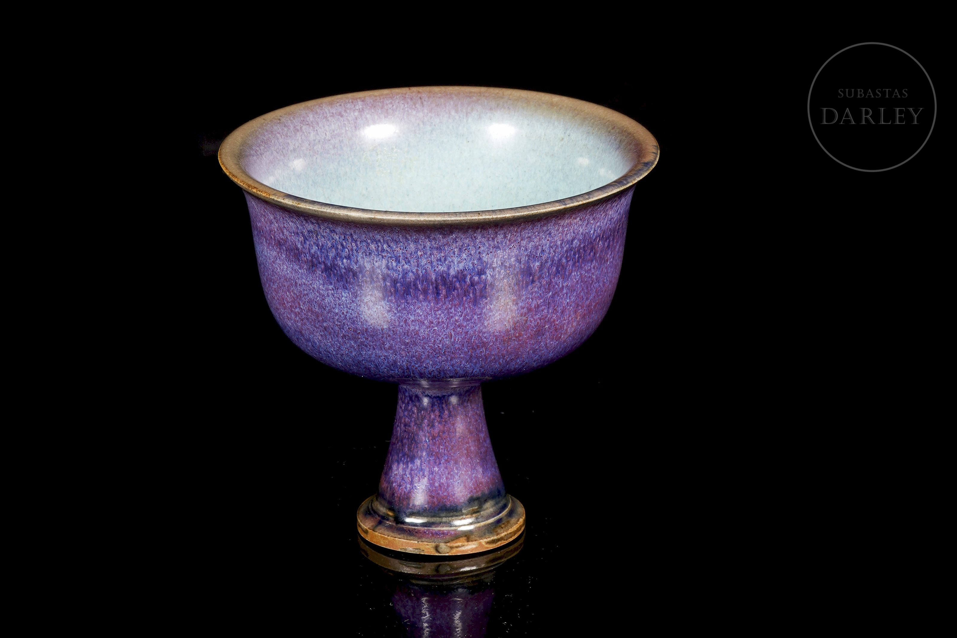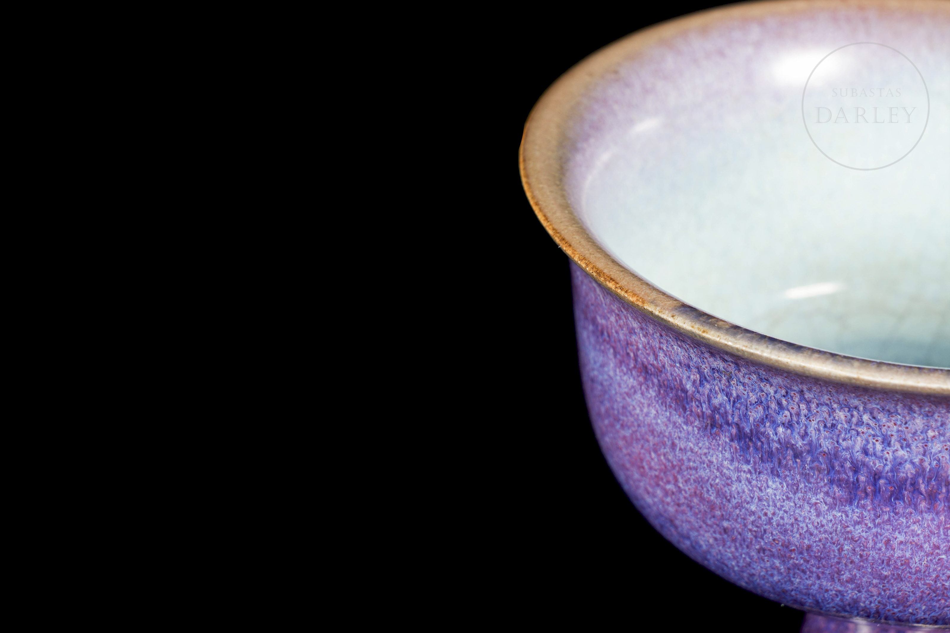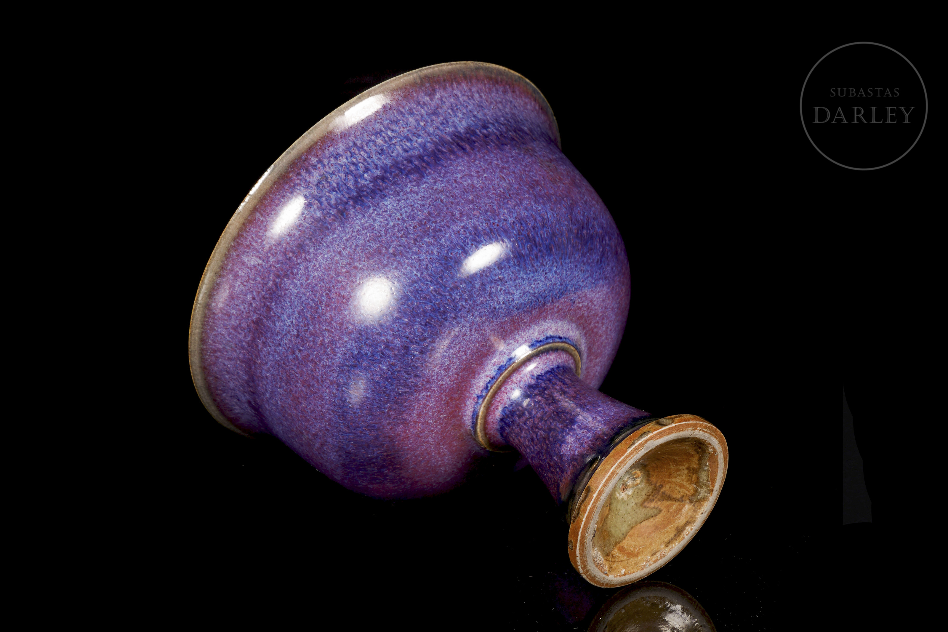 Cup with a tall conical foot and rounded body, with a thick Jun-style glaze. The exterior features a veined glaze in shades of purple and blue, while the interior is sky blue with a fine crackle pattern. The base of the foot is unglazed.