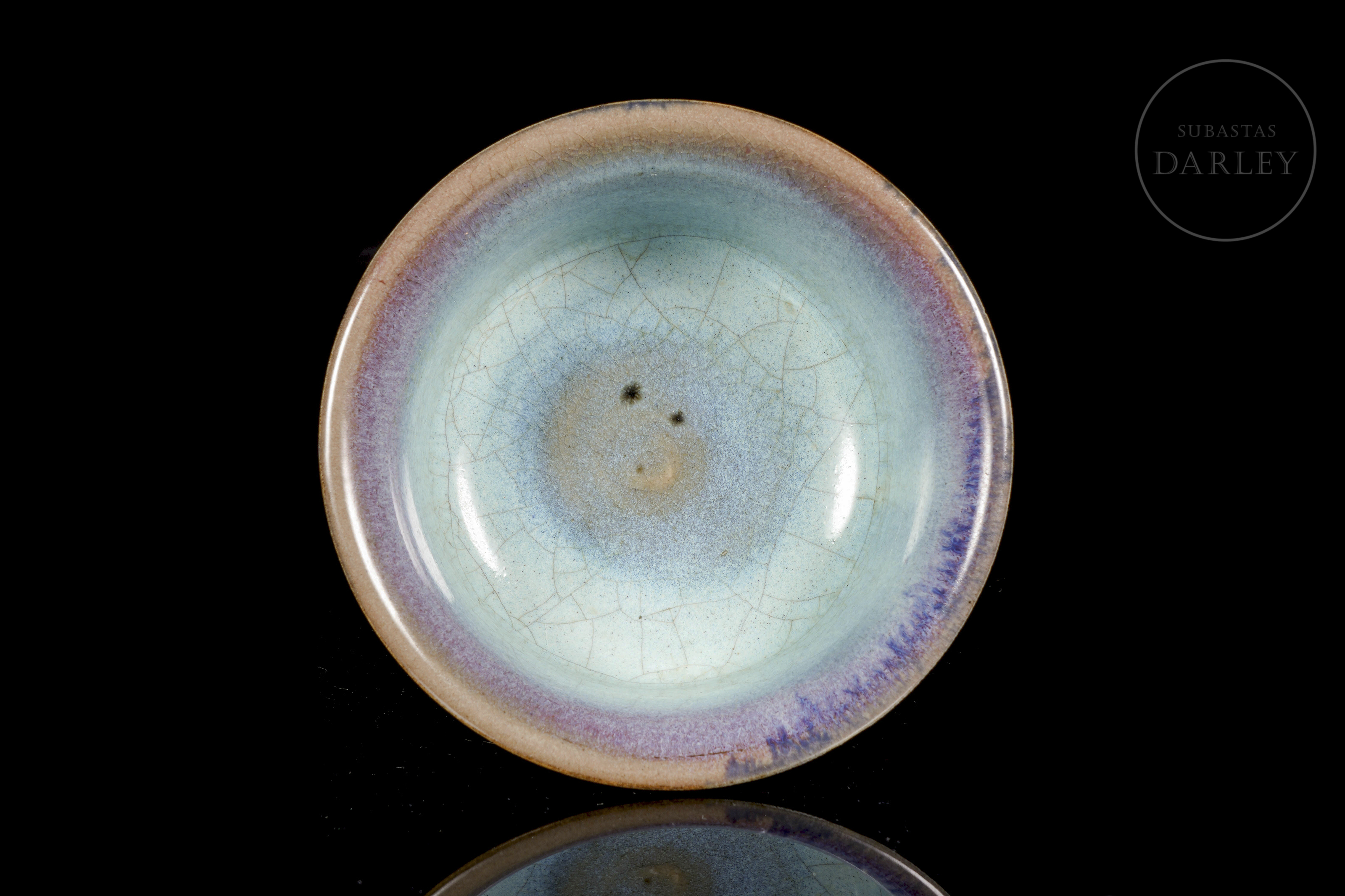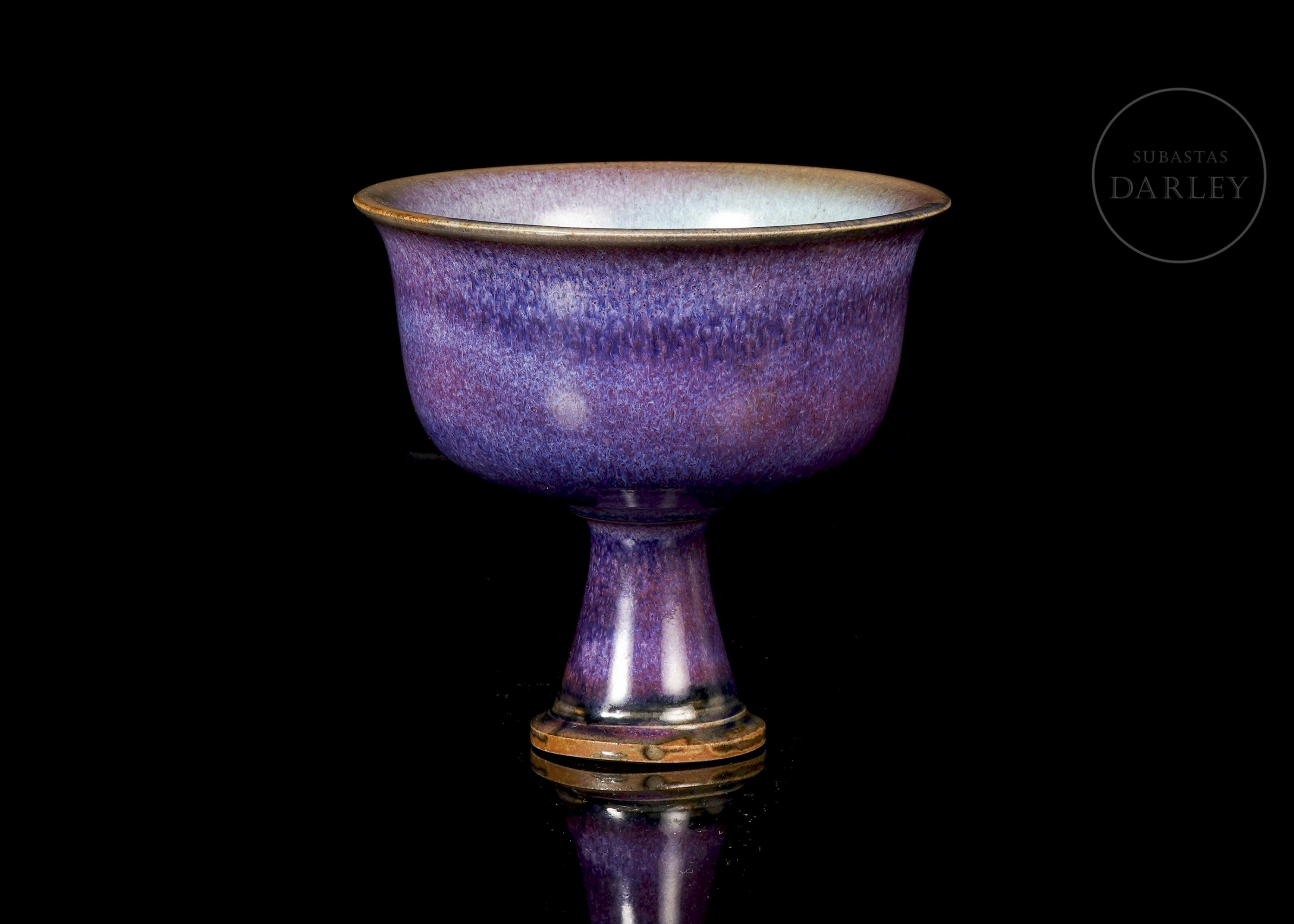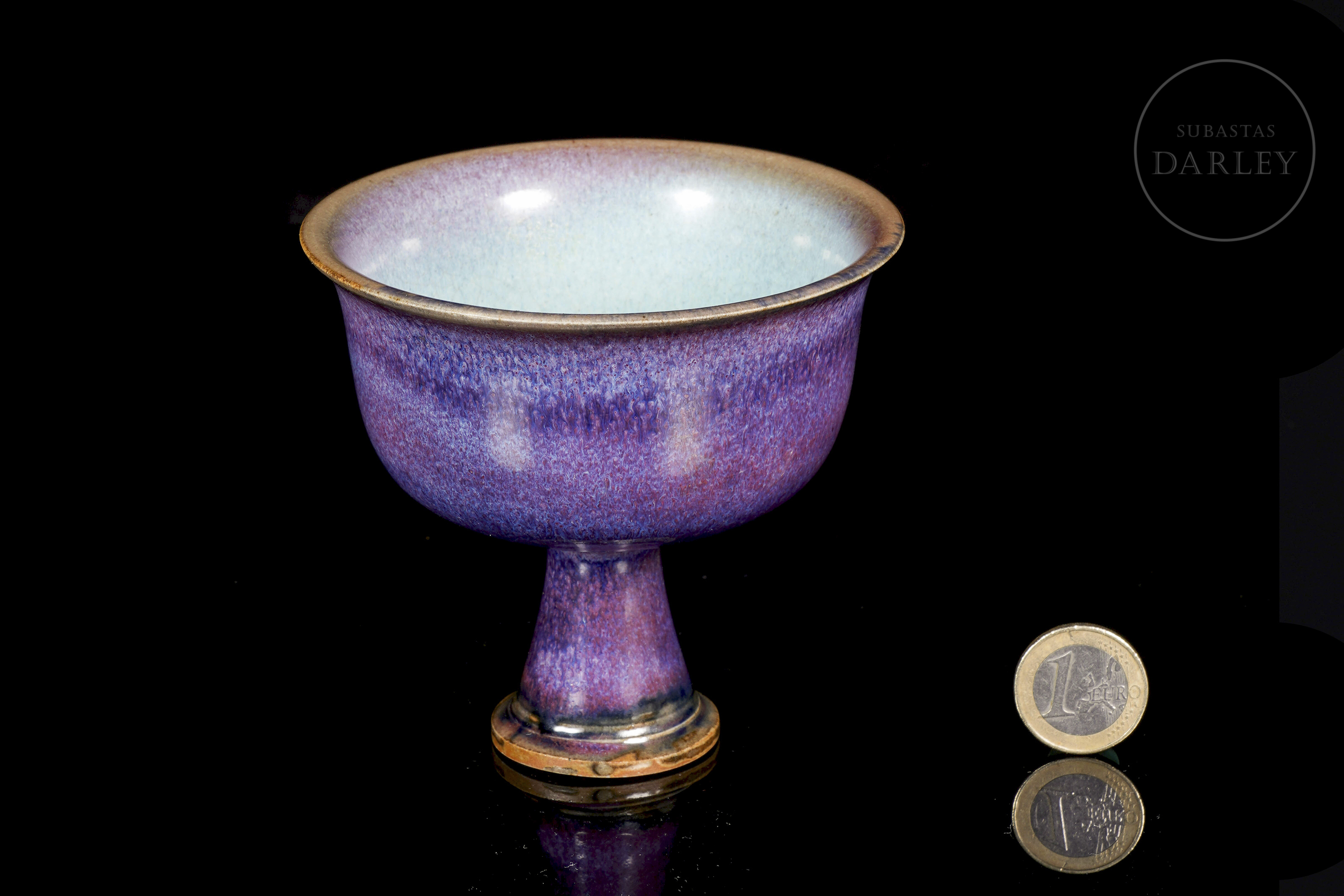 Cup with a tall conical foot and rounded body, with a thick Jun-style glaze. The exterior features a veined glaze in shades of purple and blue, while the interior is sky blue with a fine crackle pattern. The base of the foot is unglazed.