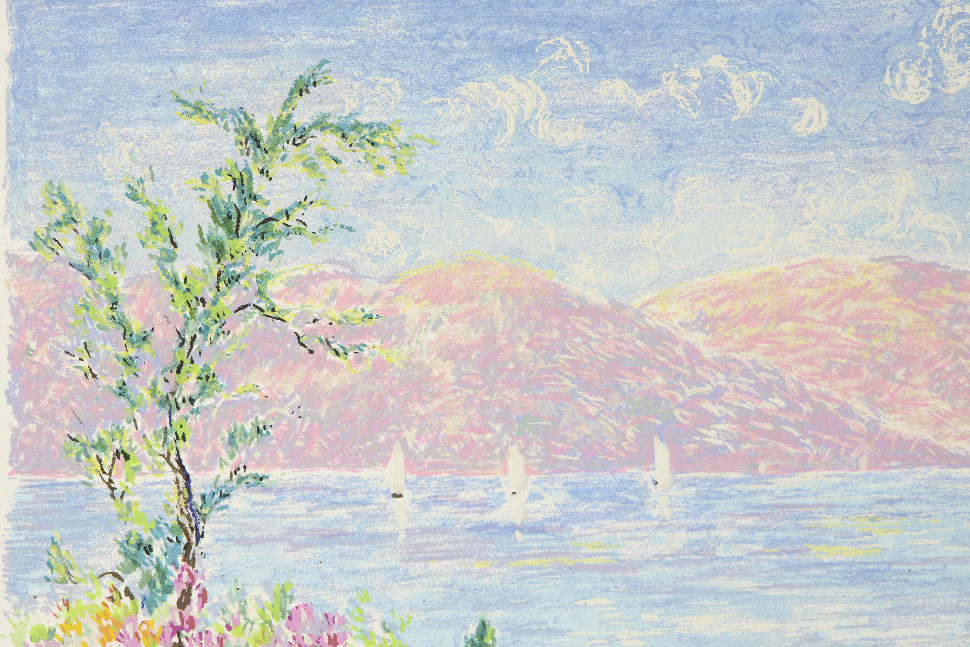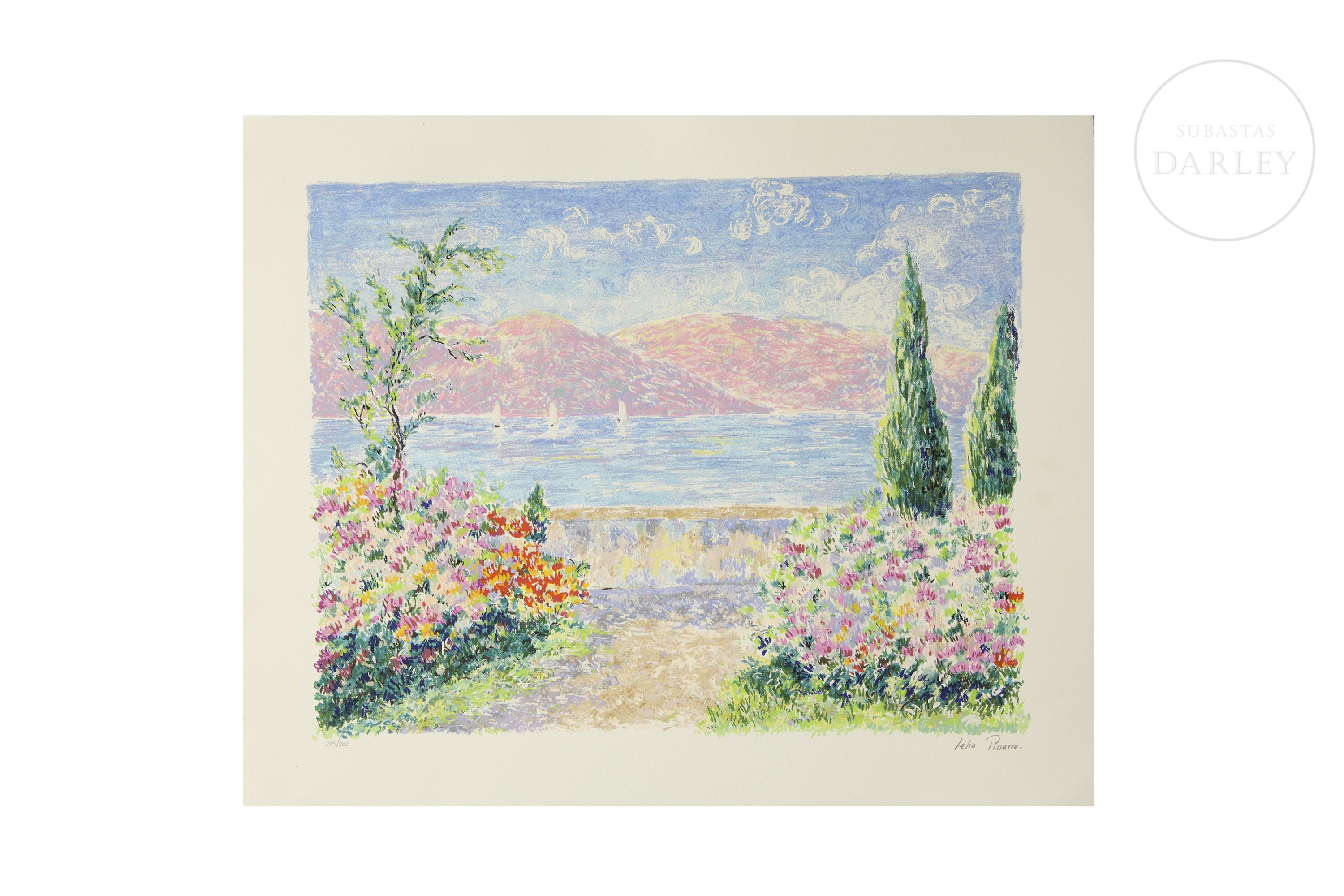 丝网印刷于纸上。以法国印象派风格描绘一幅绚丽多彩的美丽风景。右下角签名“Leila Pissarro”,左下角编号“205/300”。