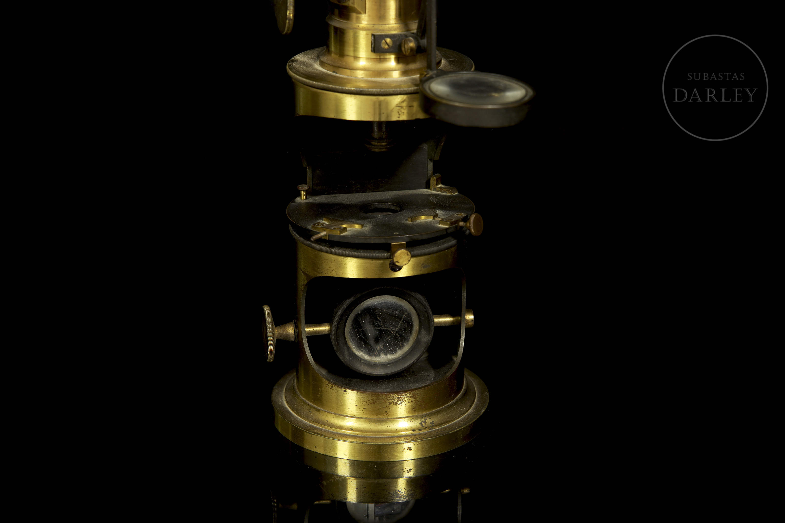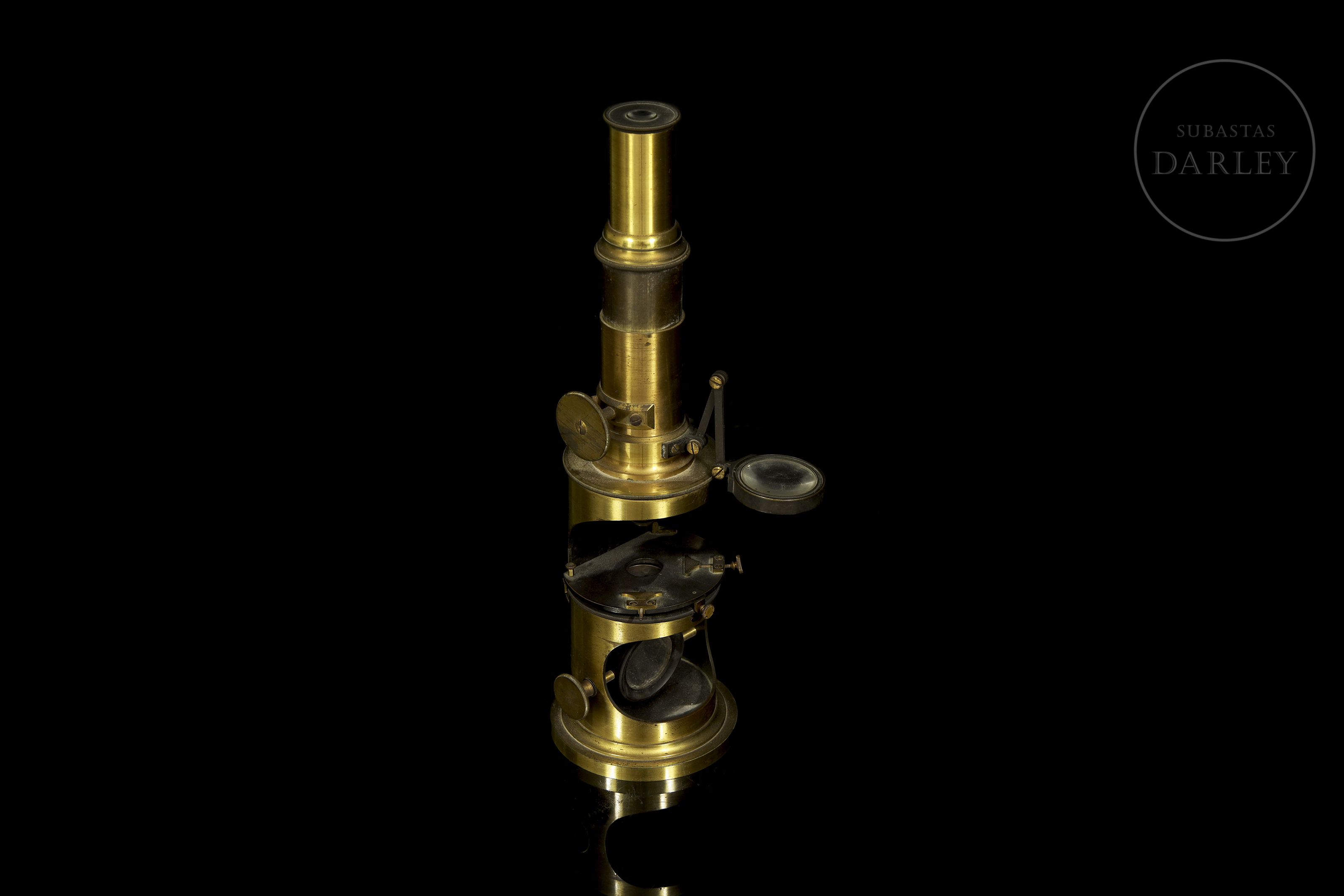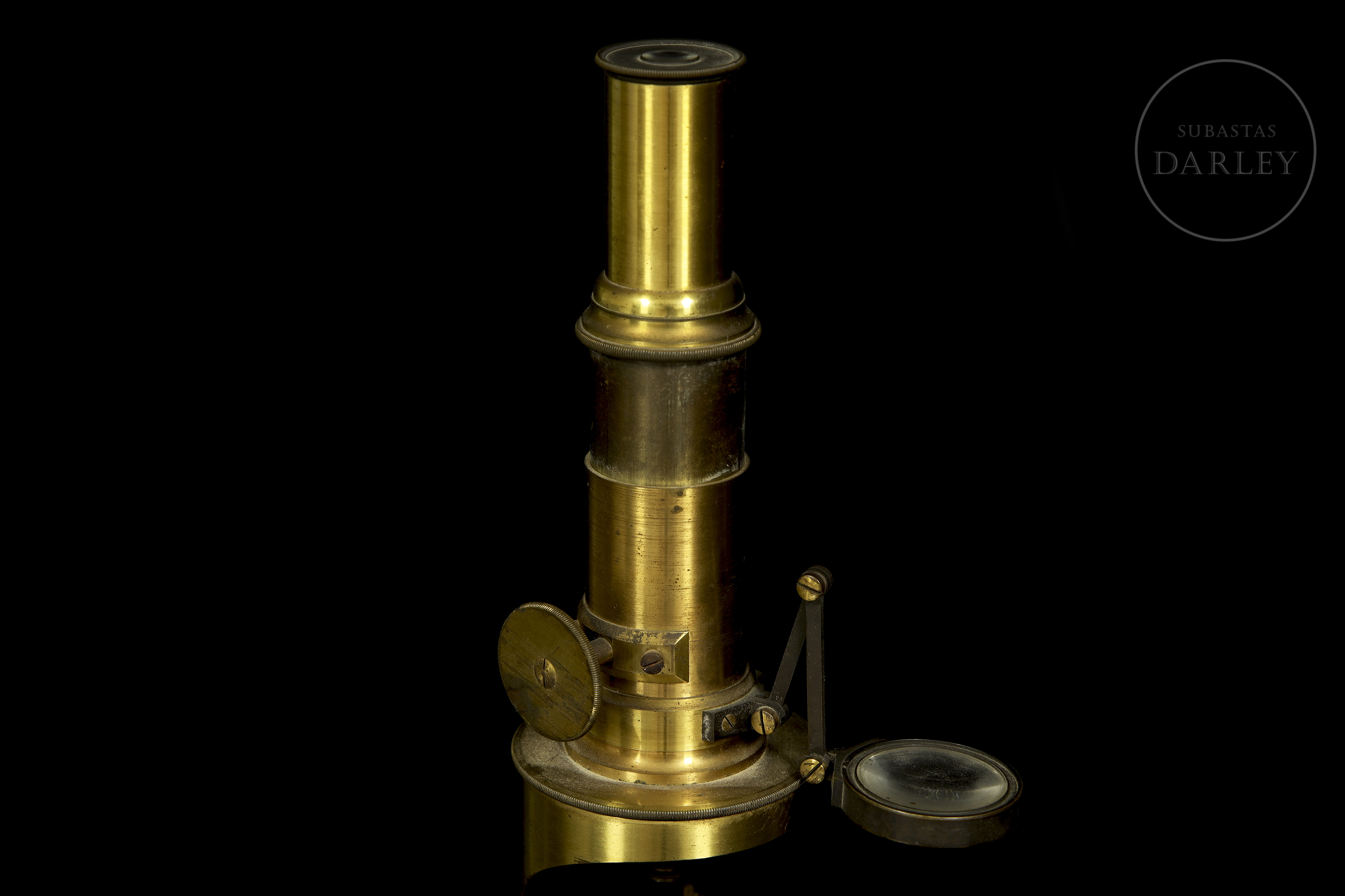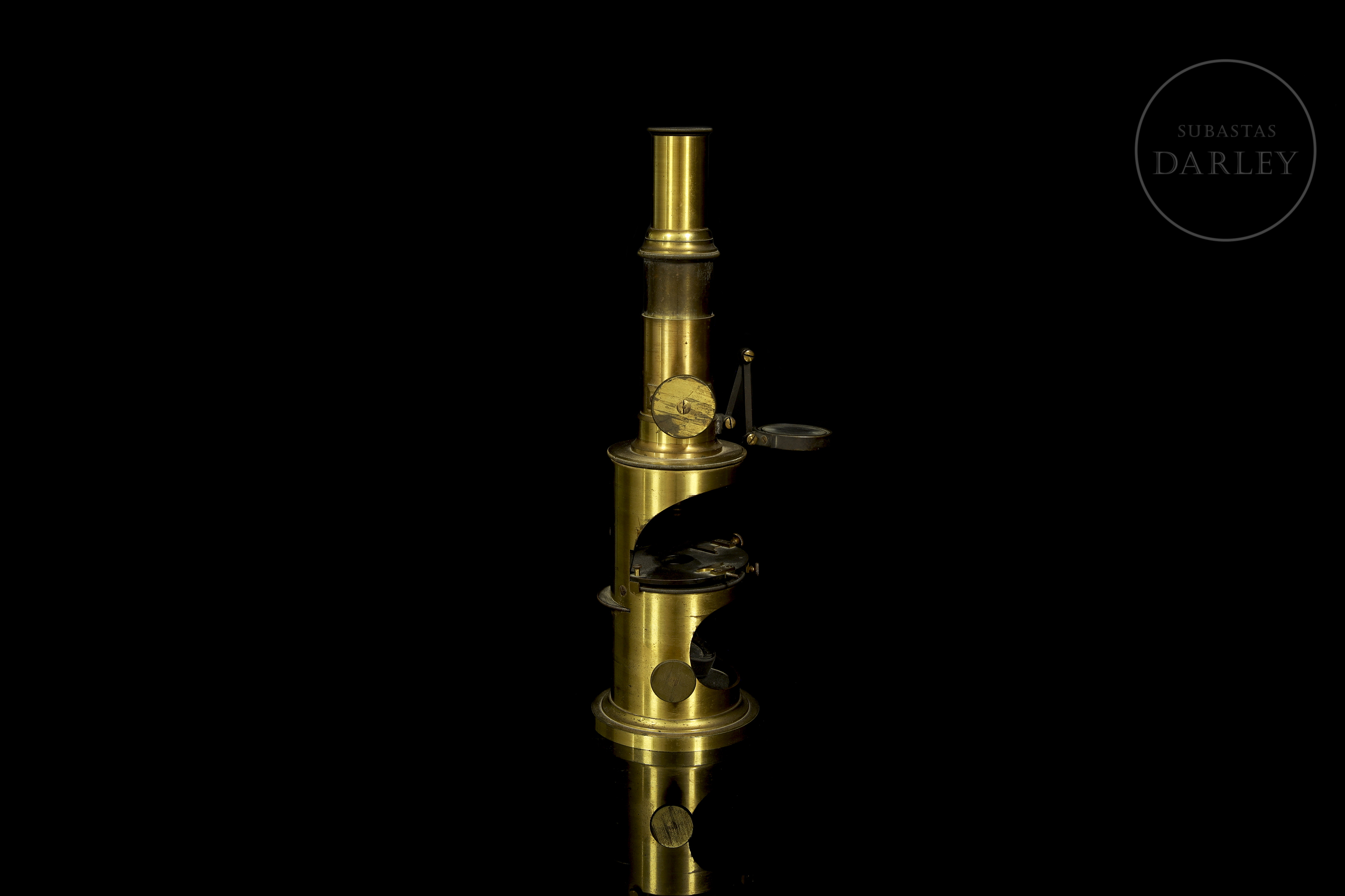 Scientific set consisting of a gold-plated brass microscope and various optical accessories, presented in their original wooden cases with interior compartments. The microscope retains its lenses and focusing mechanisms, as well as a main box with the manufacturer's label.