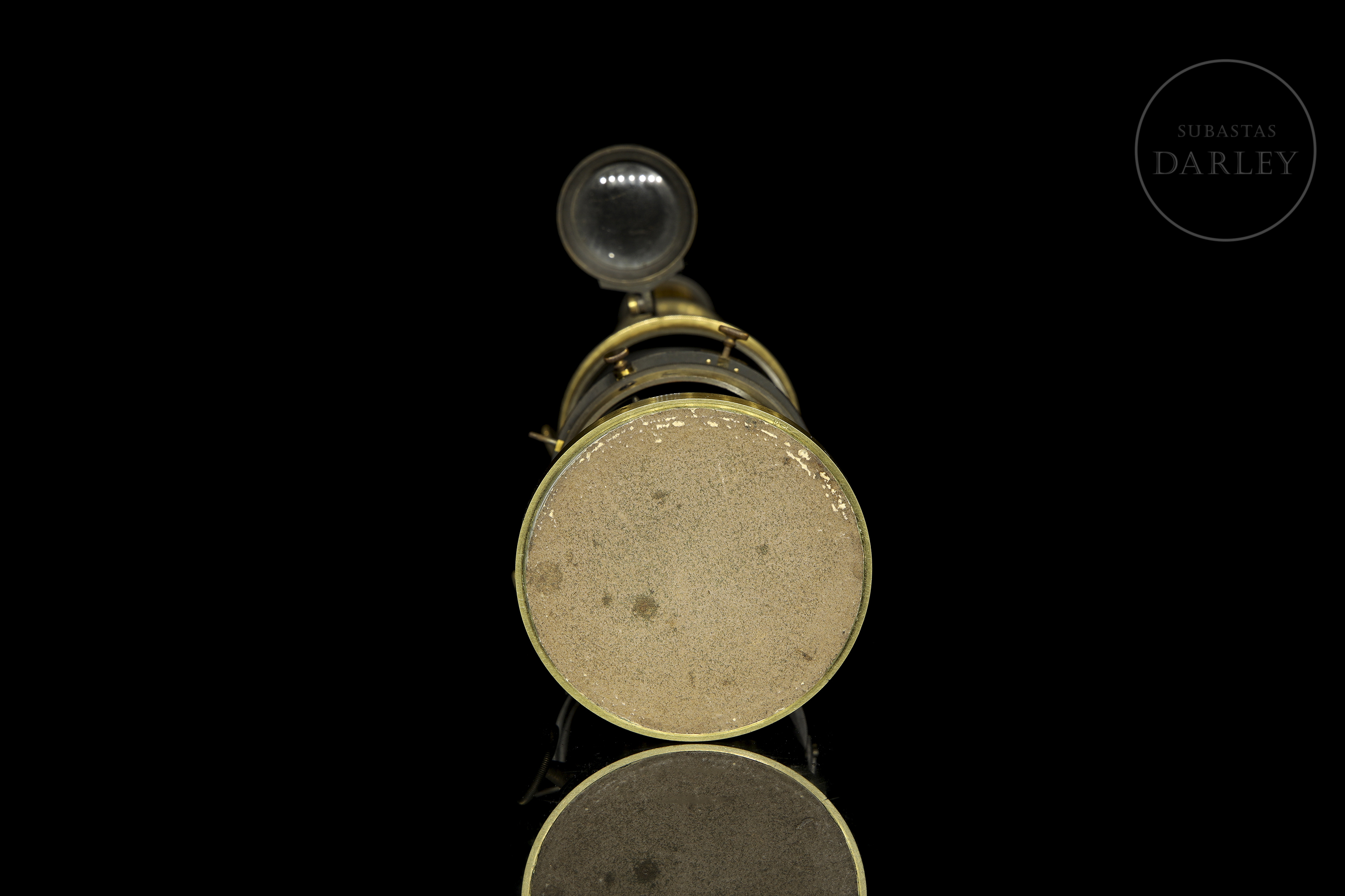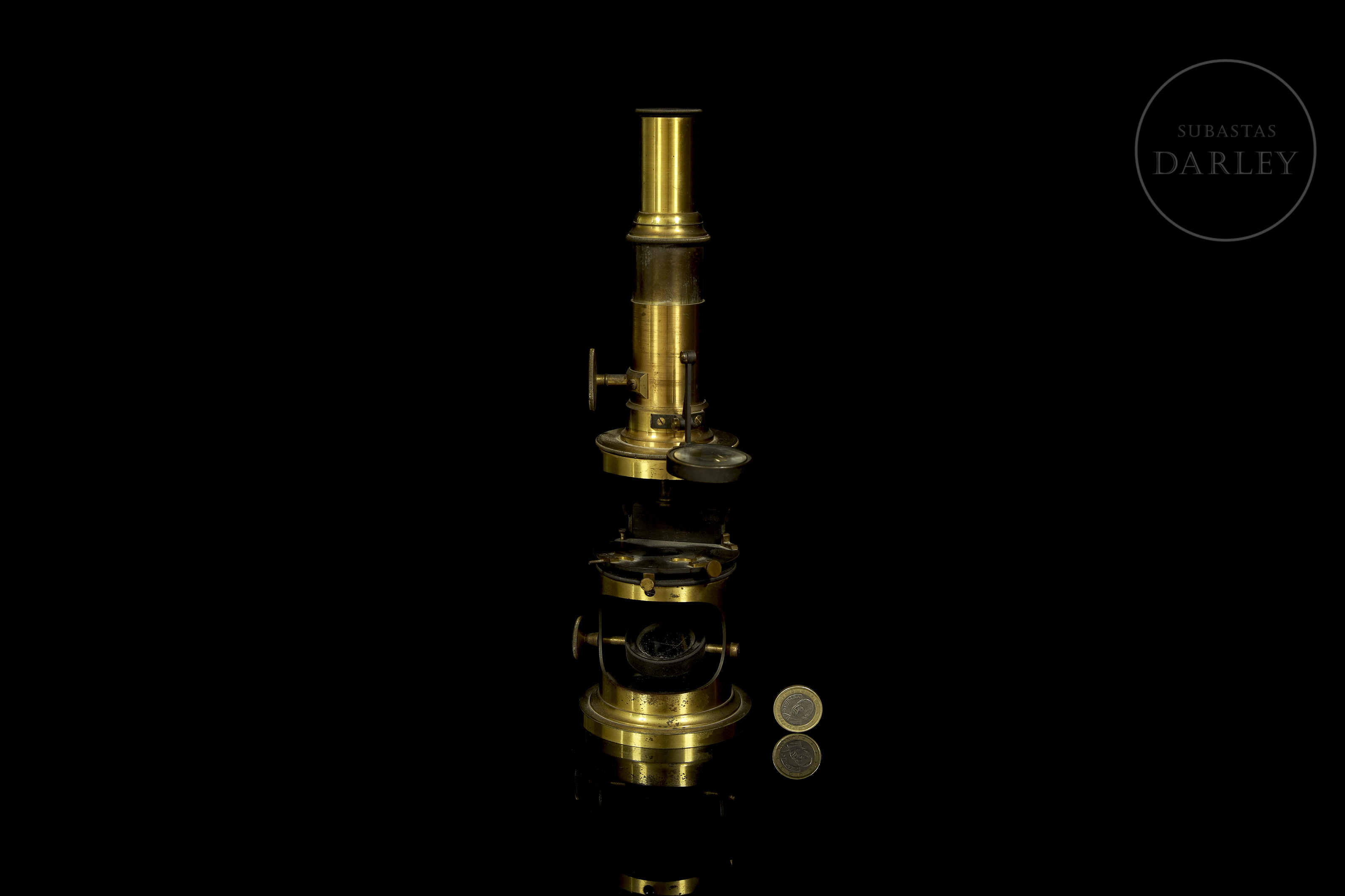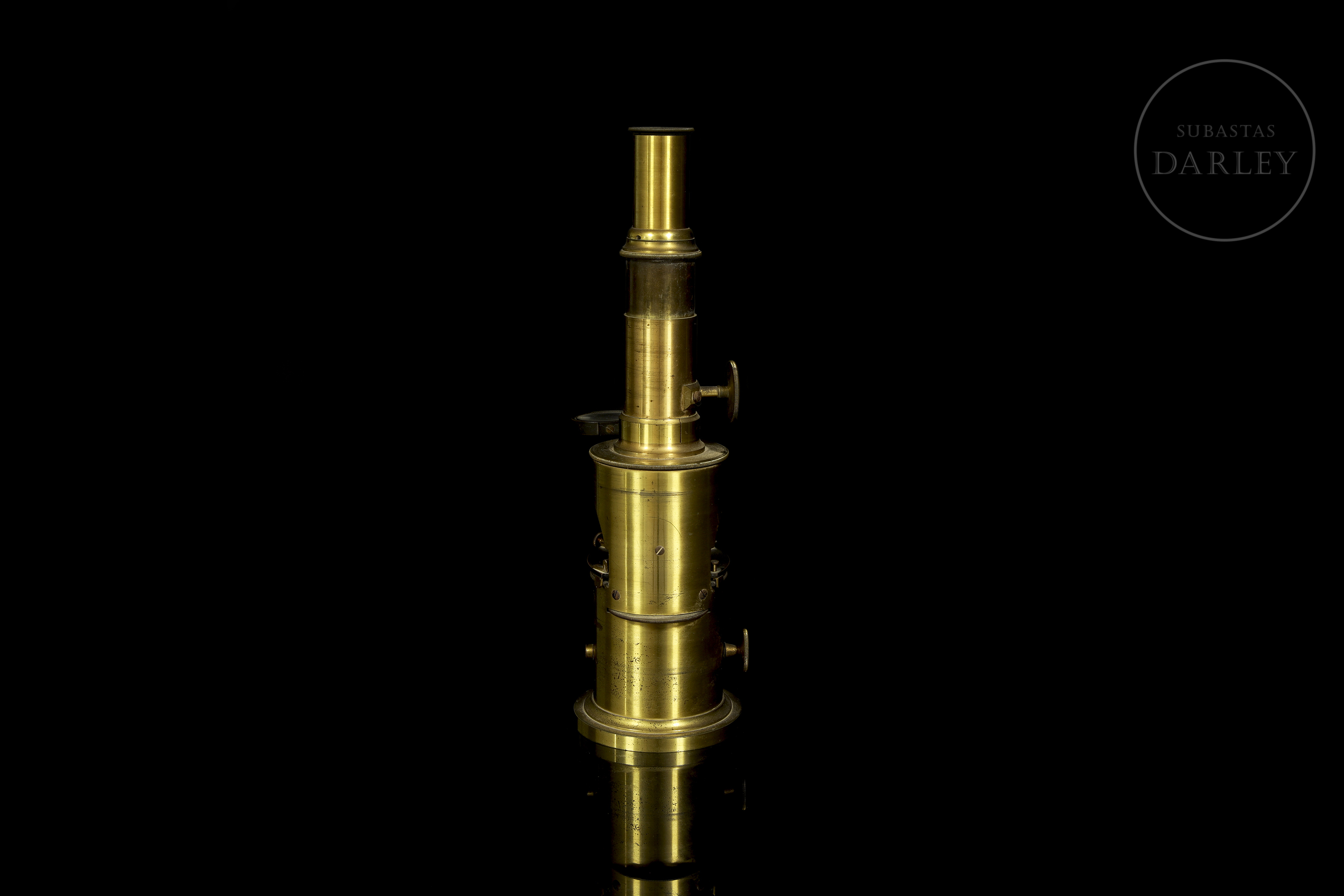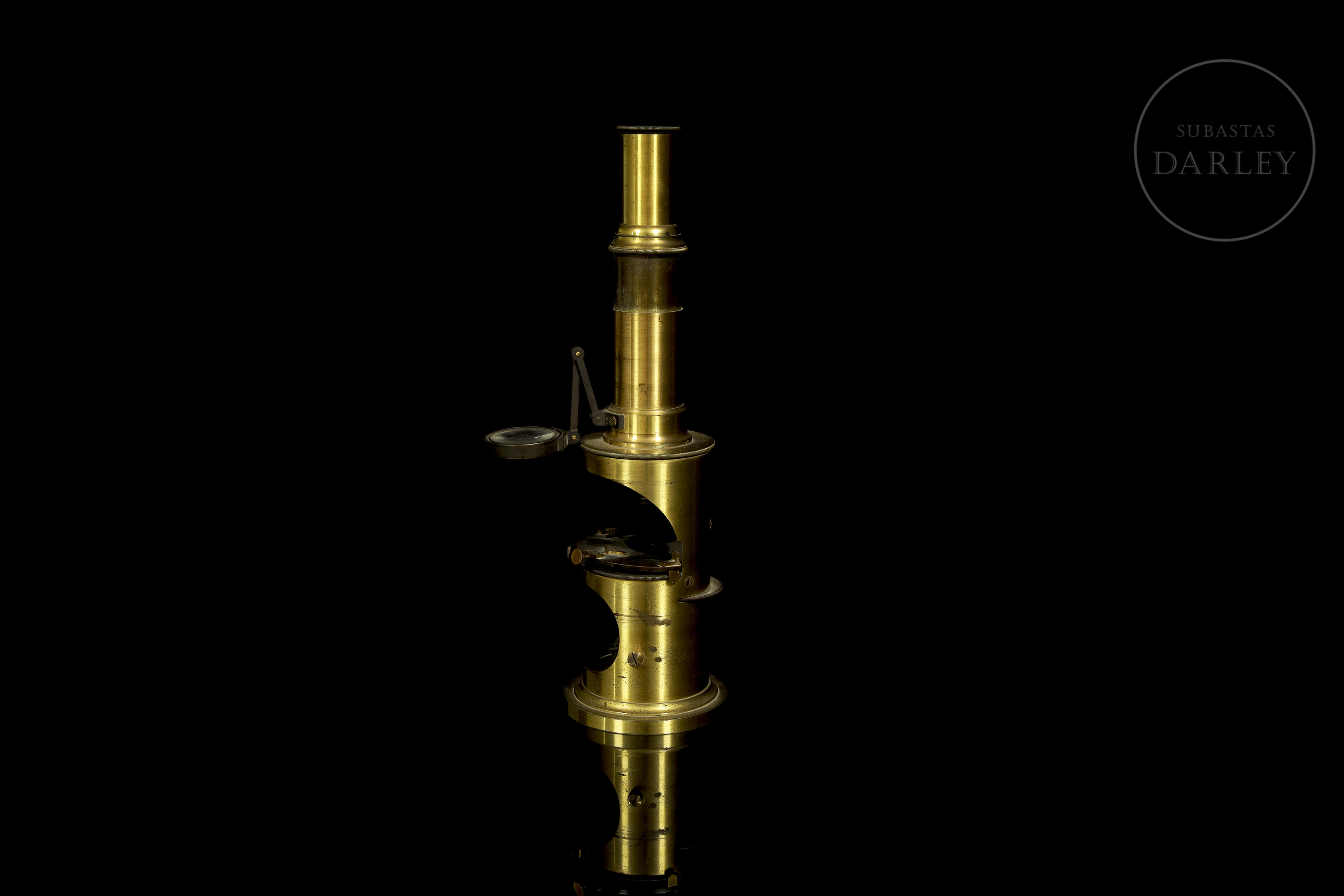 Scientific set consisting of a gold-plated brass microscope and various optical accessories, presented in their original wooden cases with interior compartments. The microscope retains its lenses and focusing mechanisms, as well as a main box with the manufacturer's label.