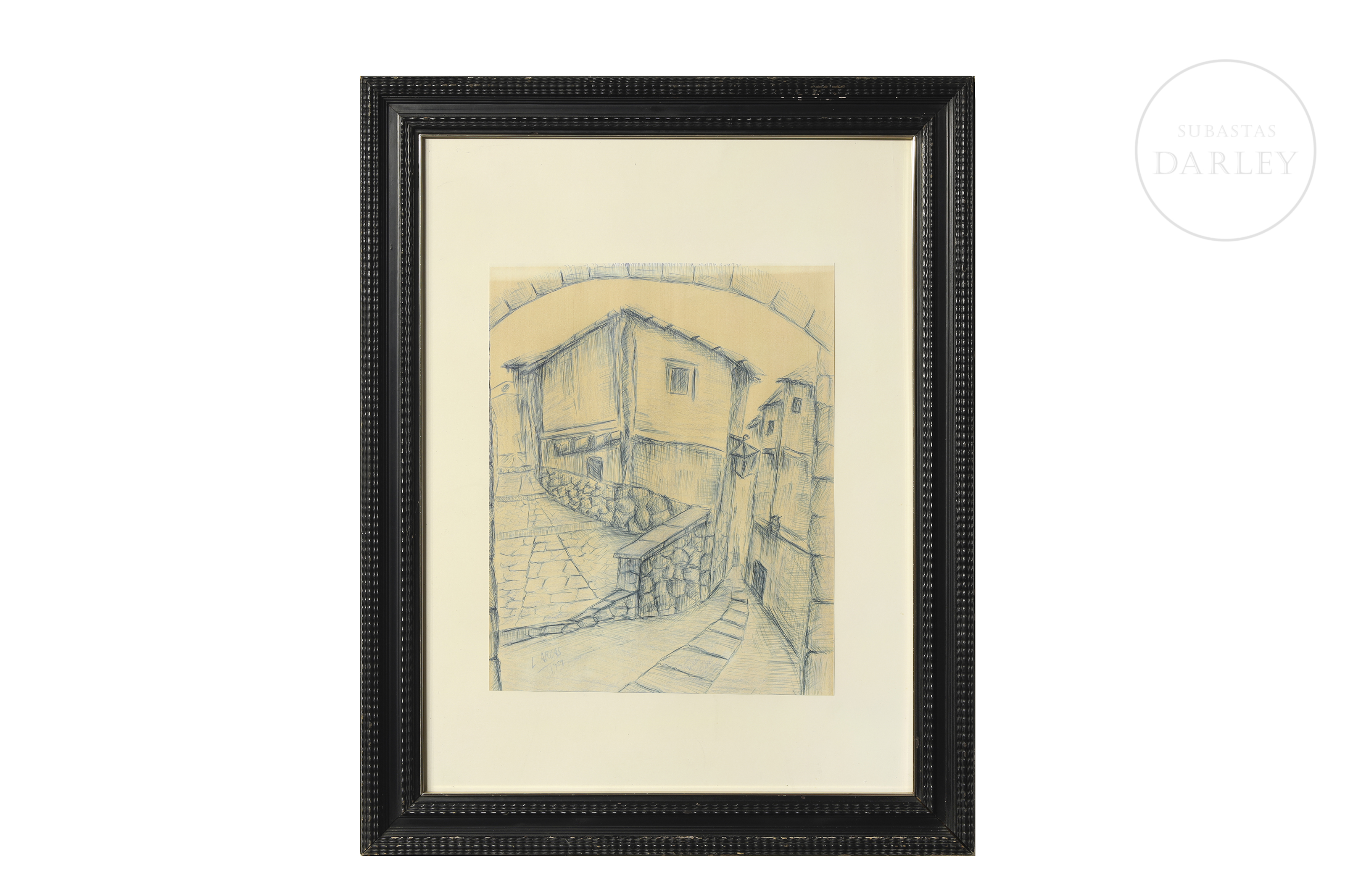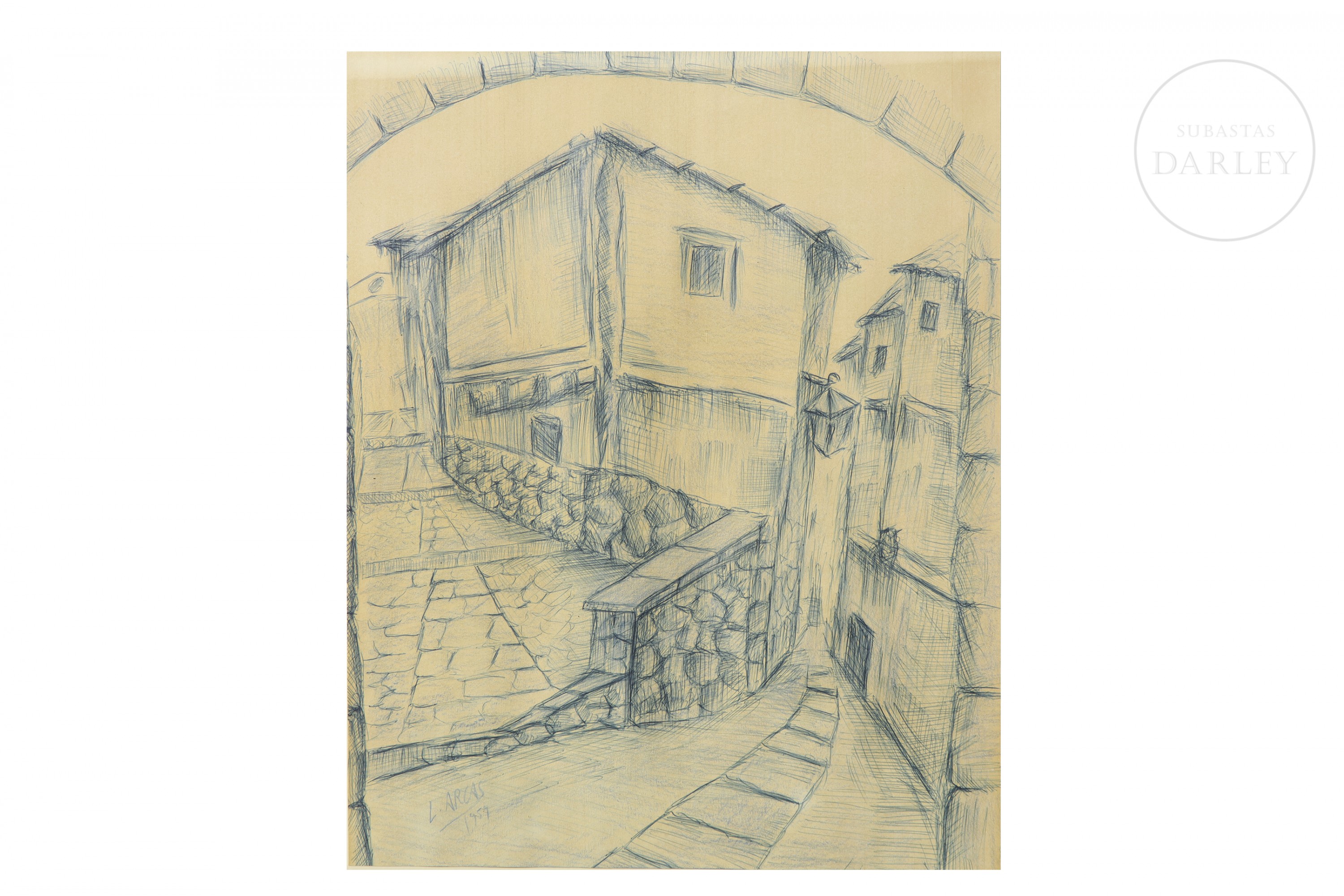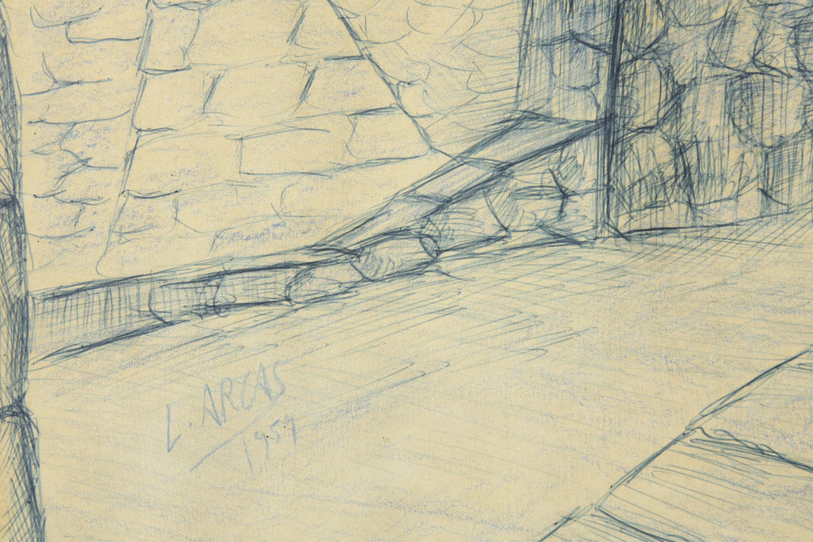 纸本水墨与石墨。描绘一条带有乡村建筑风格的巷弄都市景观。左下角签名并标注日期“L.ARCAS/1957”。背面签名、题名并标注日期。