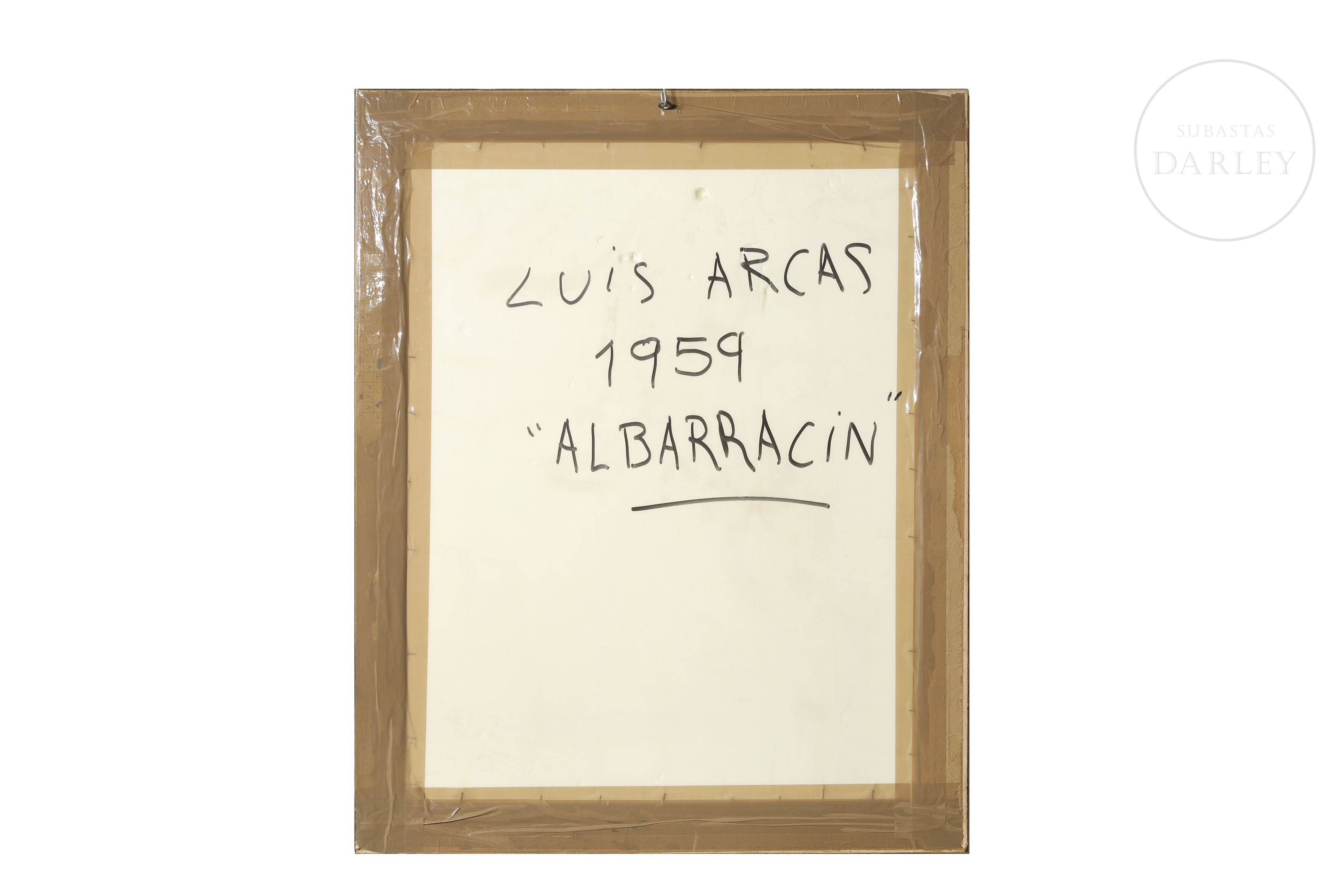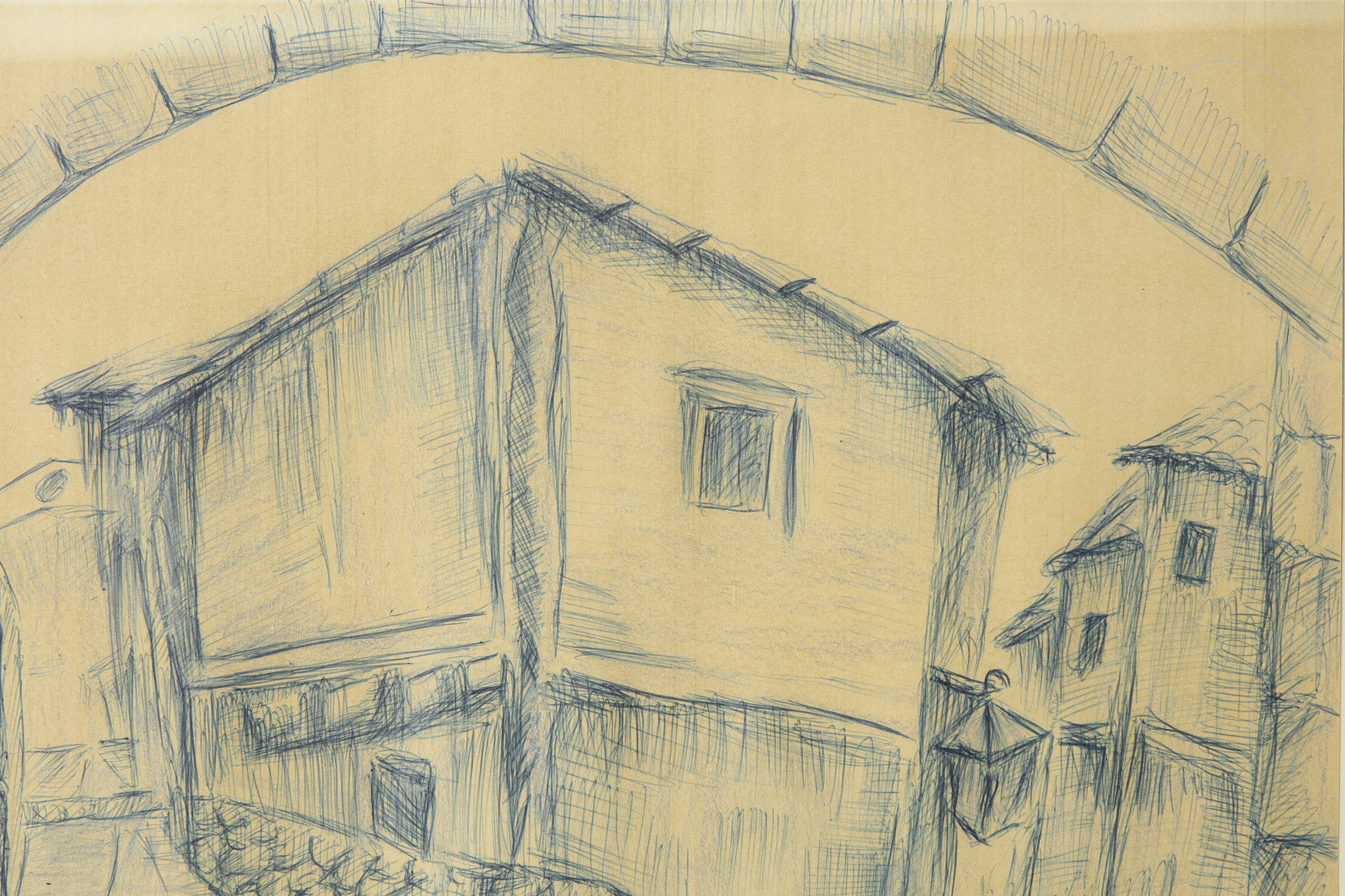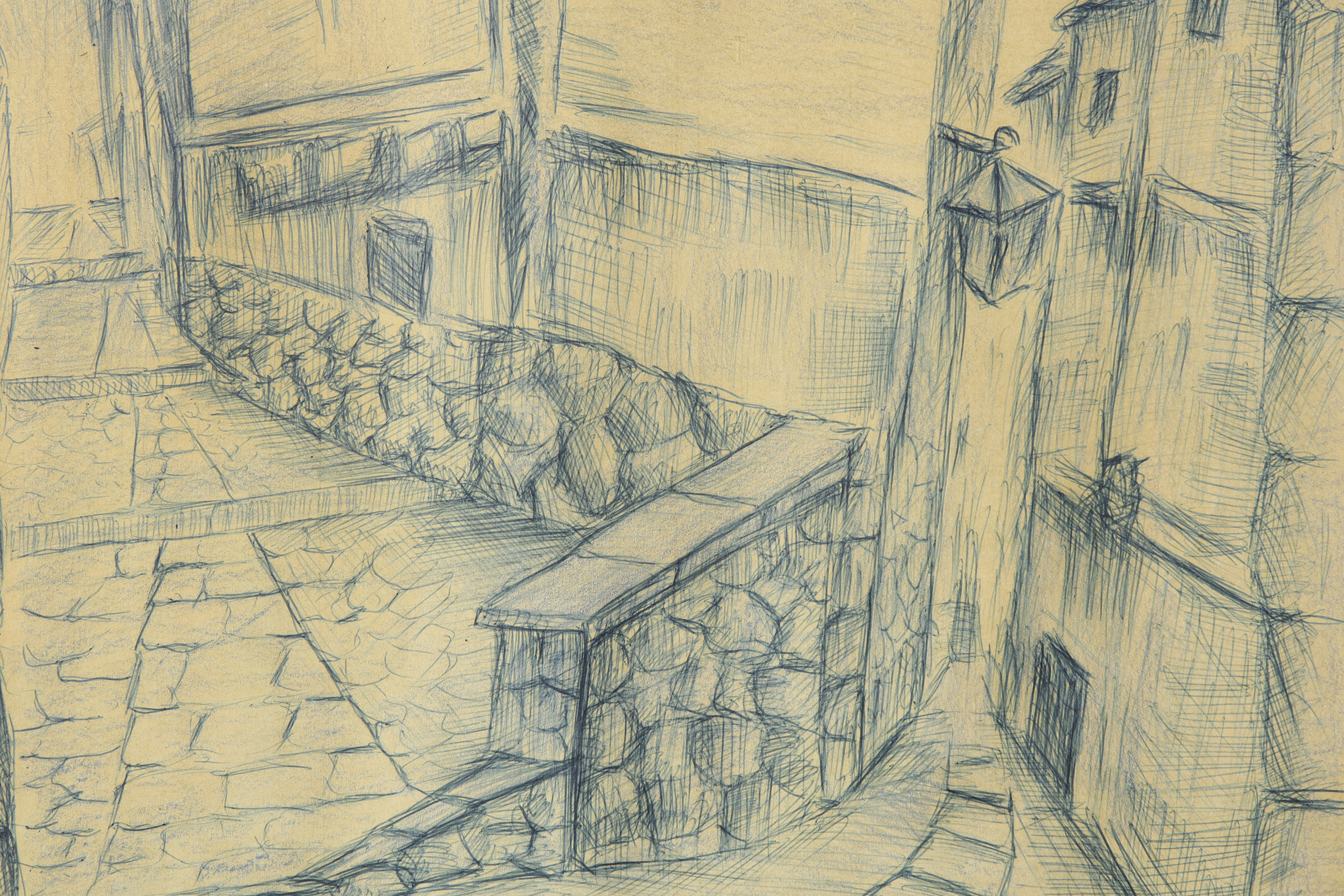 纸本水墨与石墨。描绘一条带有乡村建筑风格的巷弄都市景观。左下角签名并标注日期“L.ARCAS/1957”。背面签名、题名并标注日期。