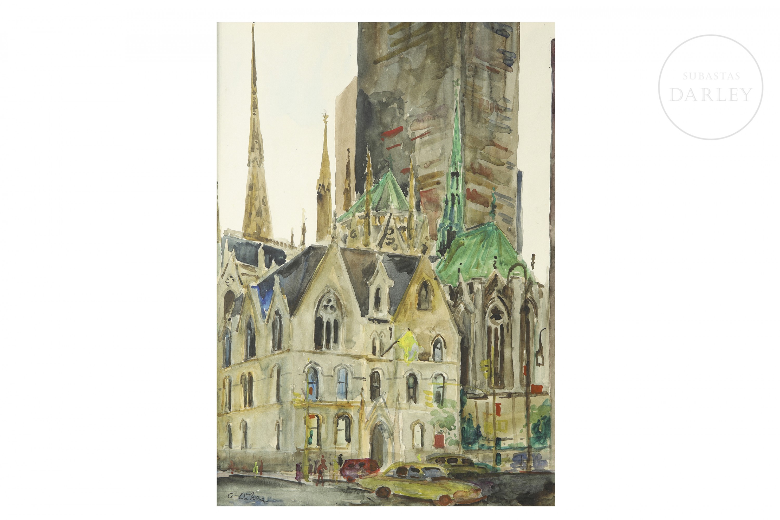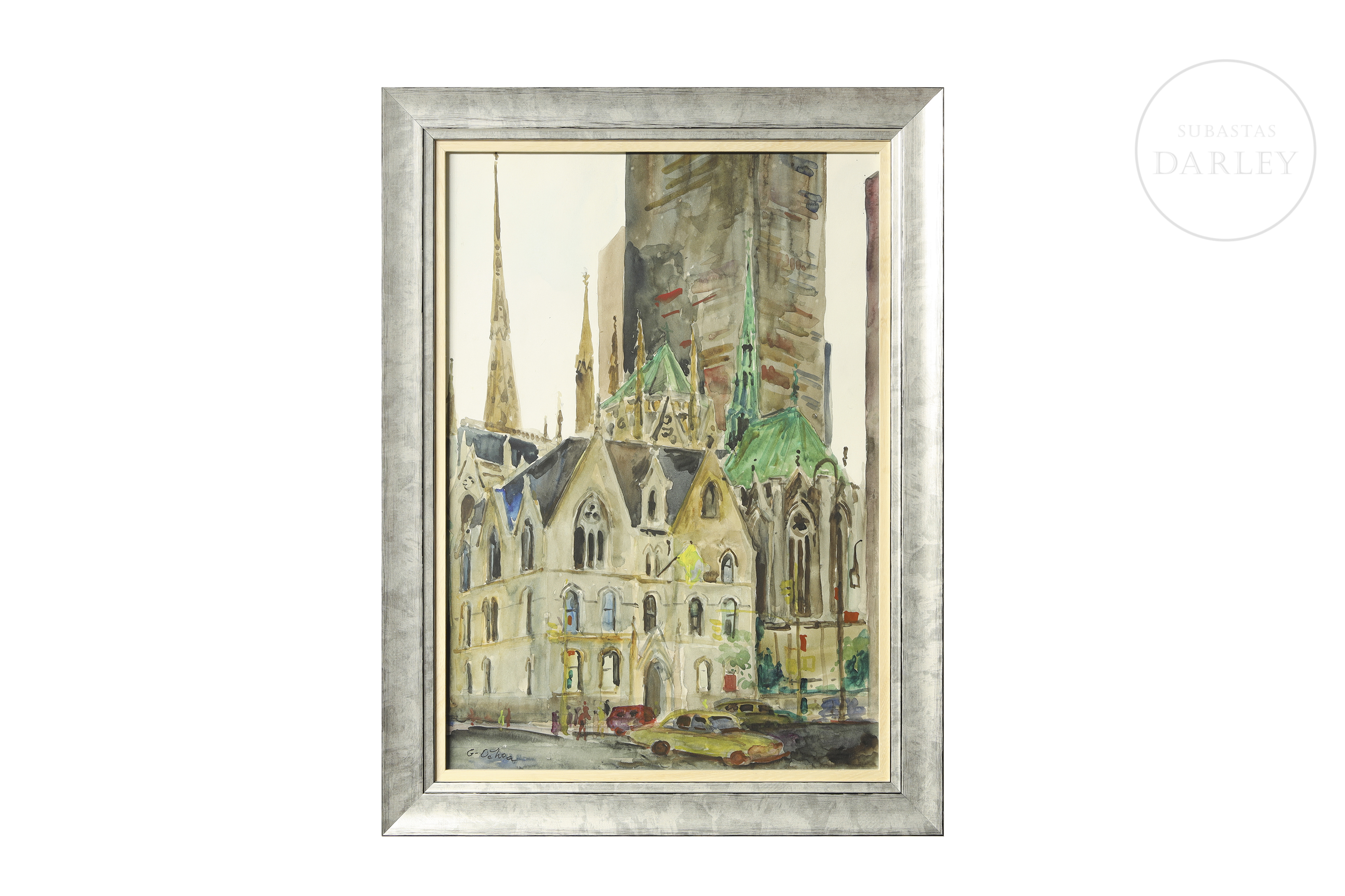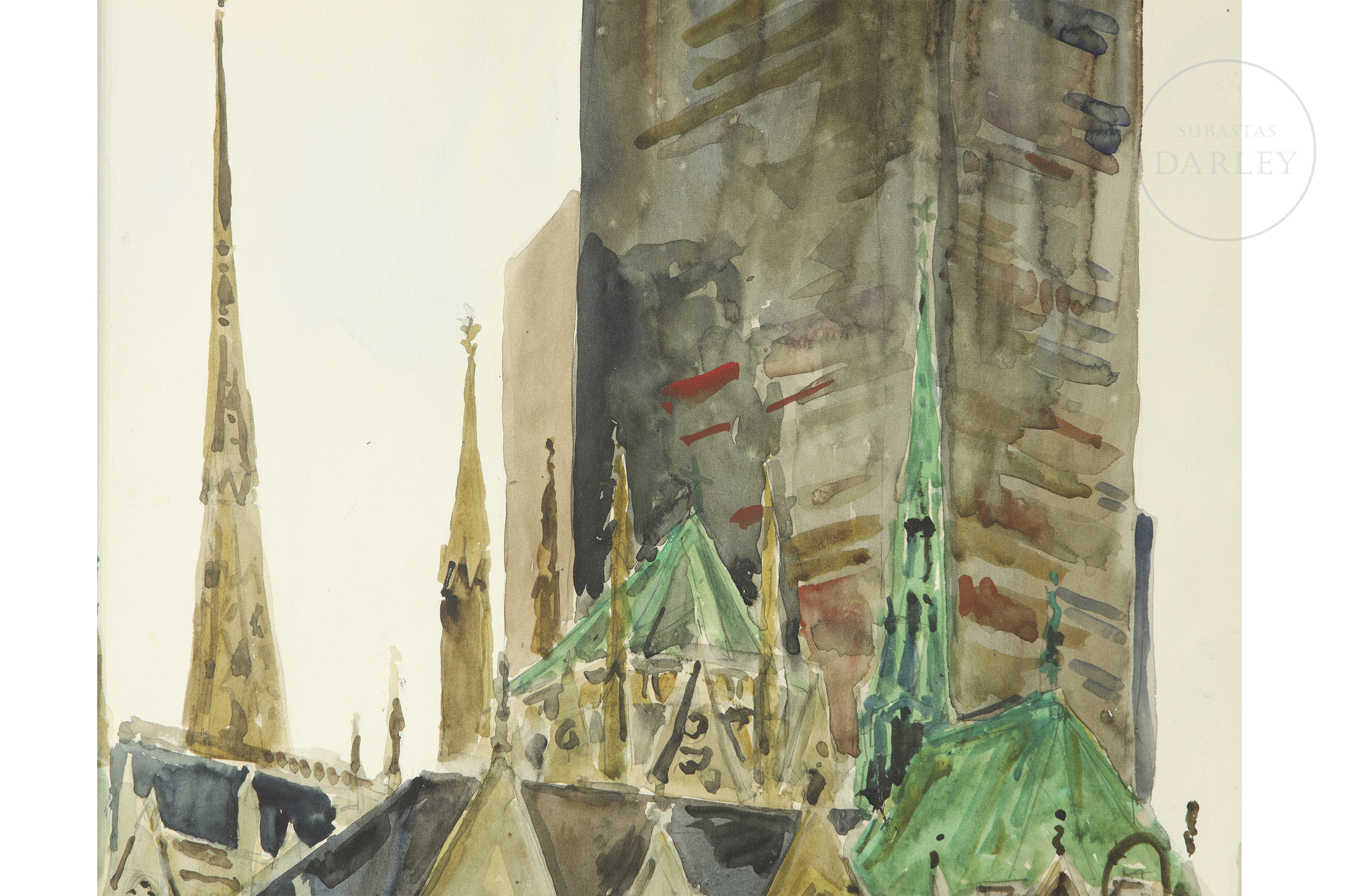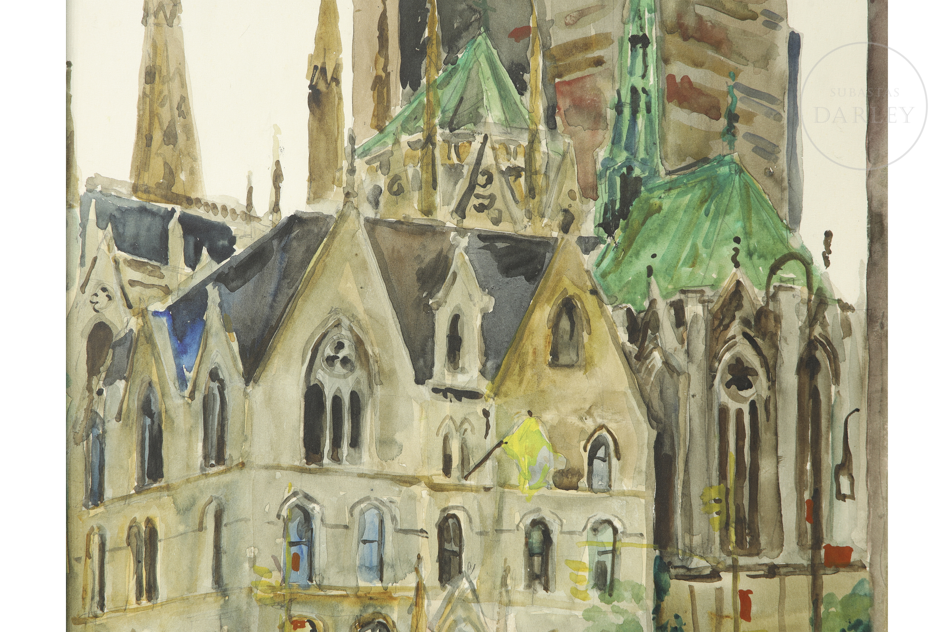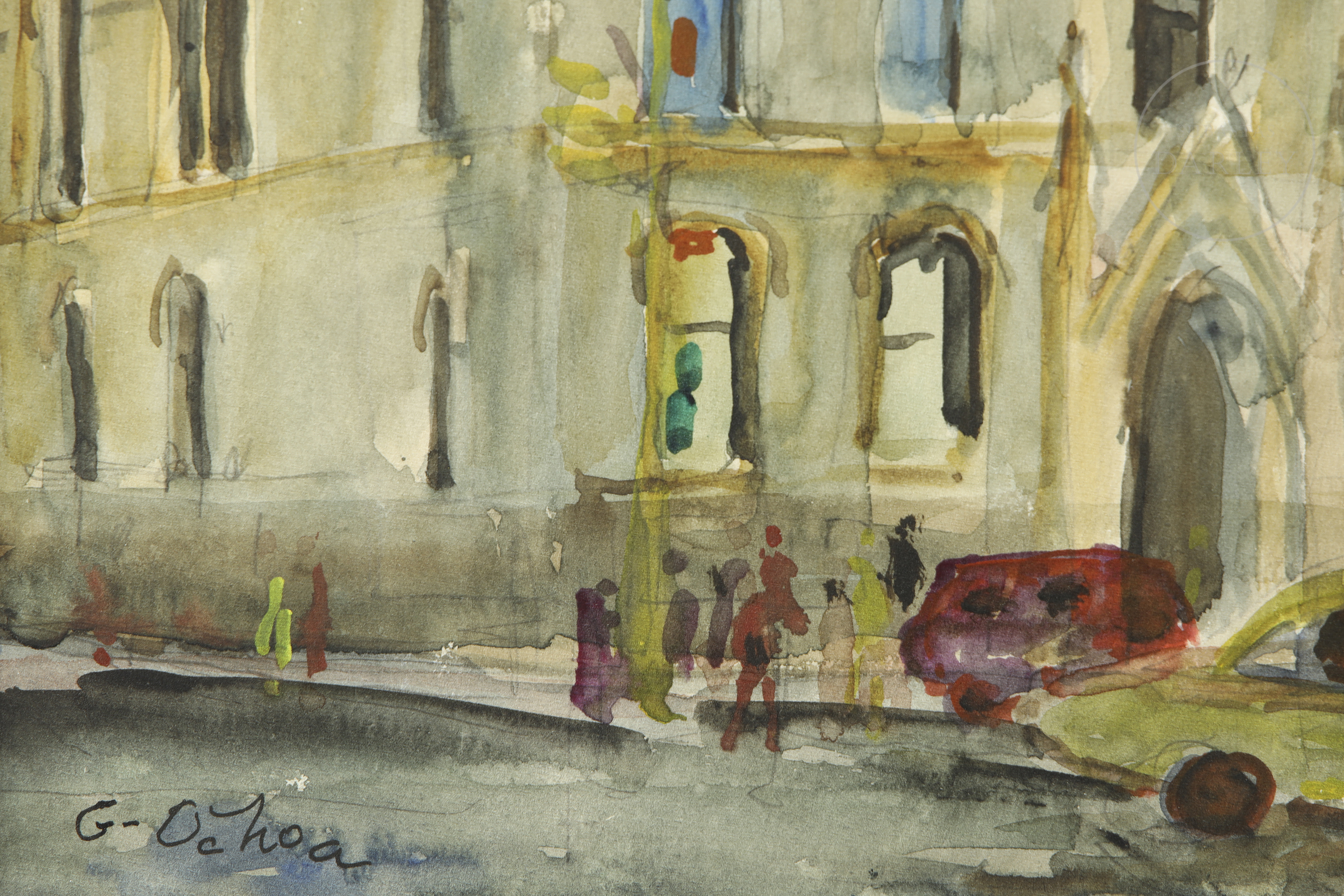 Watercolour on paper. Urban landscape contrasting the architecture of a Gothic cathedral with modern skyscrapers in the background. Signed ‘G-Ochoa’ in the lower left corner.