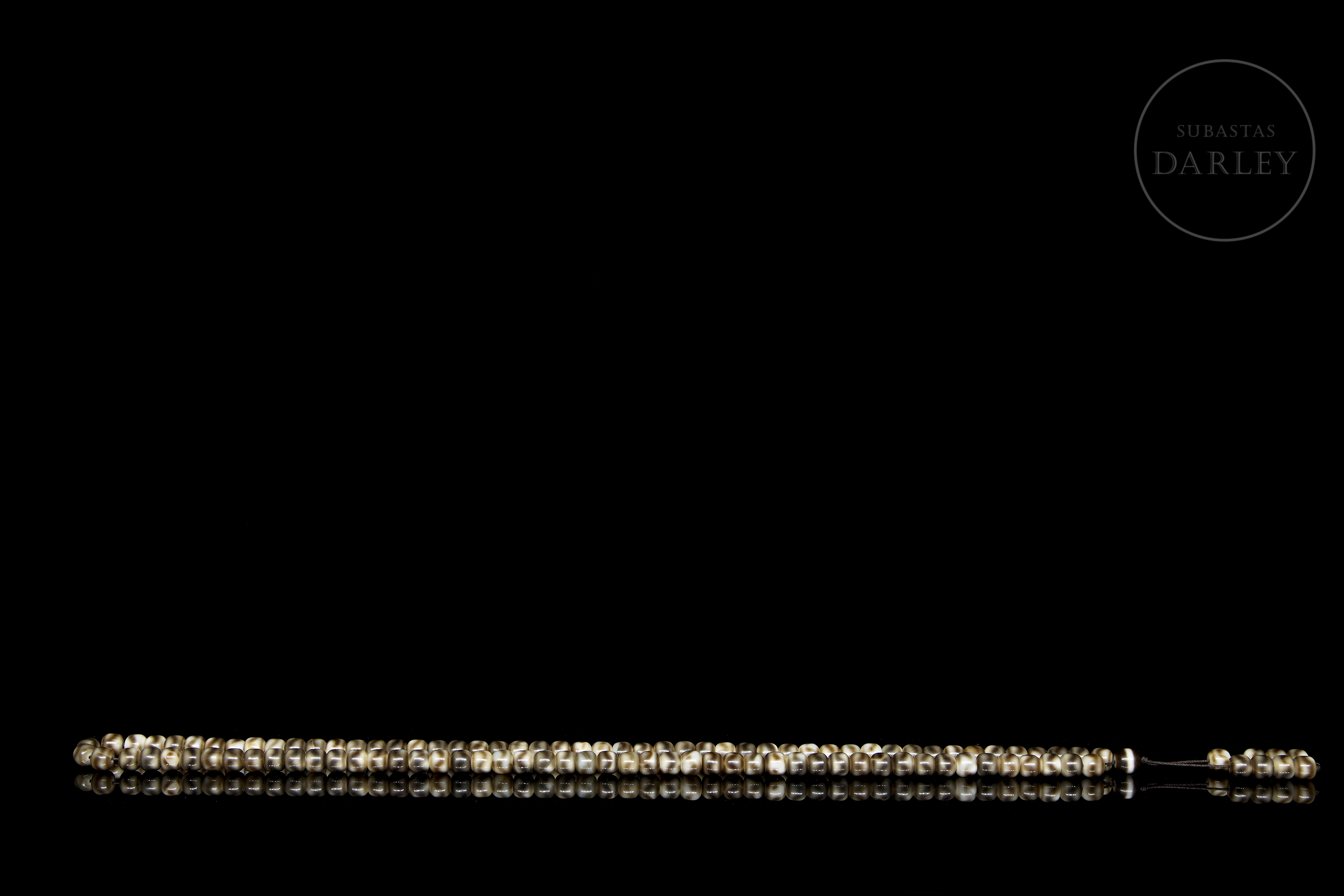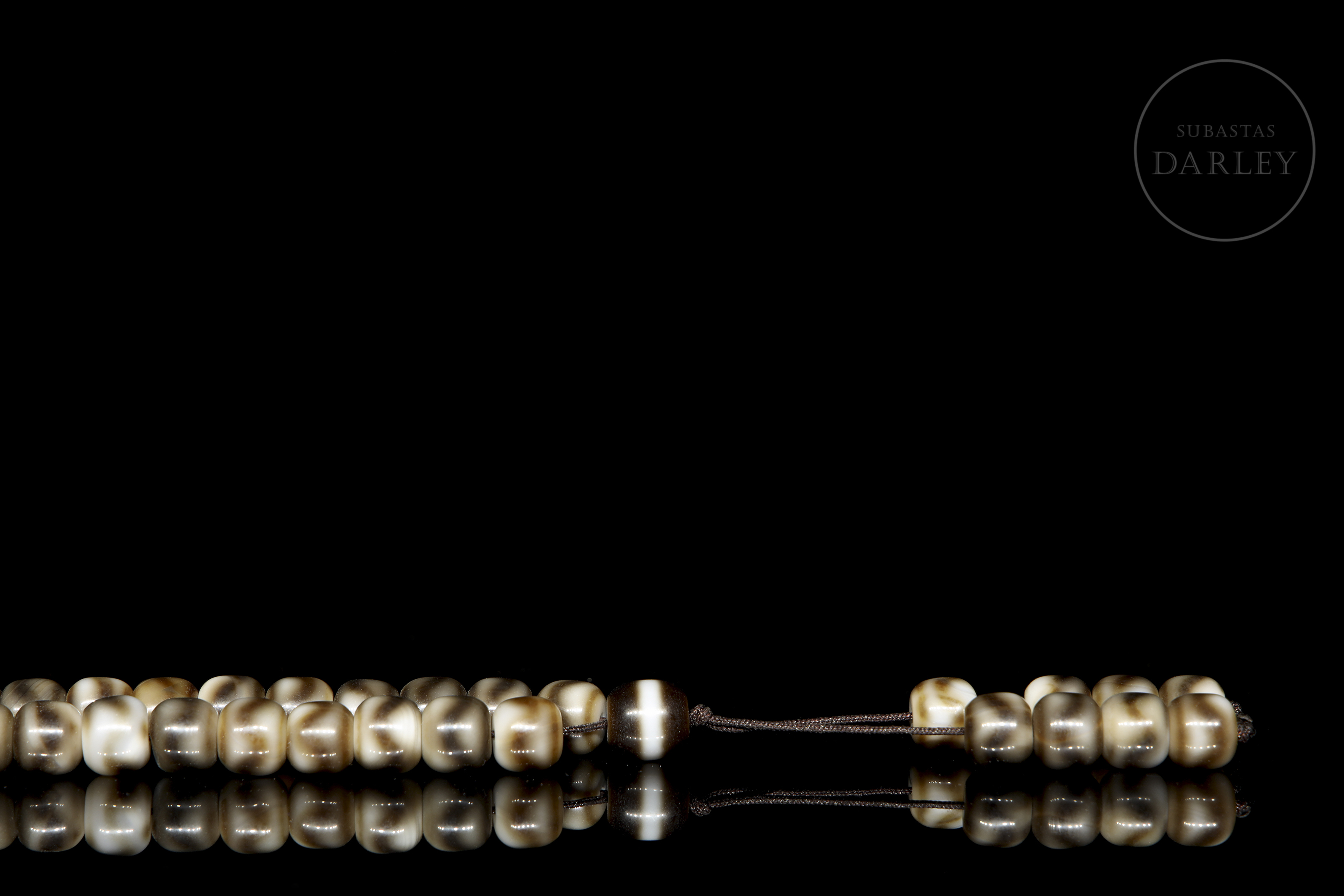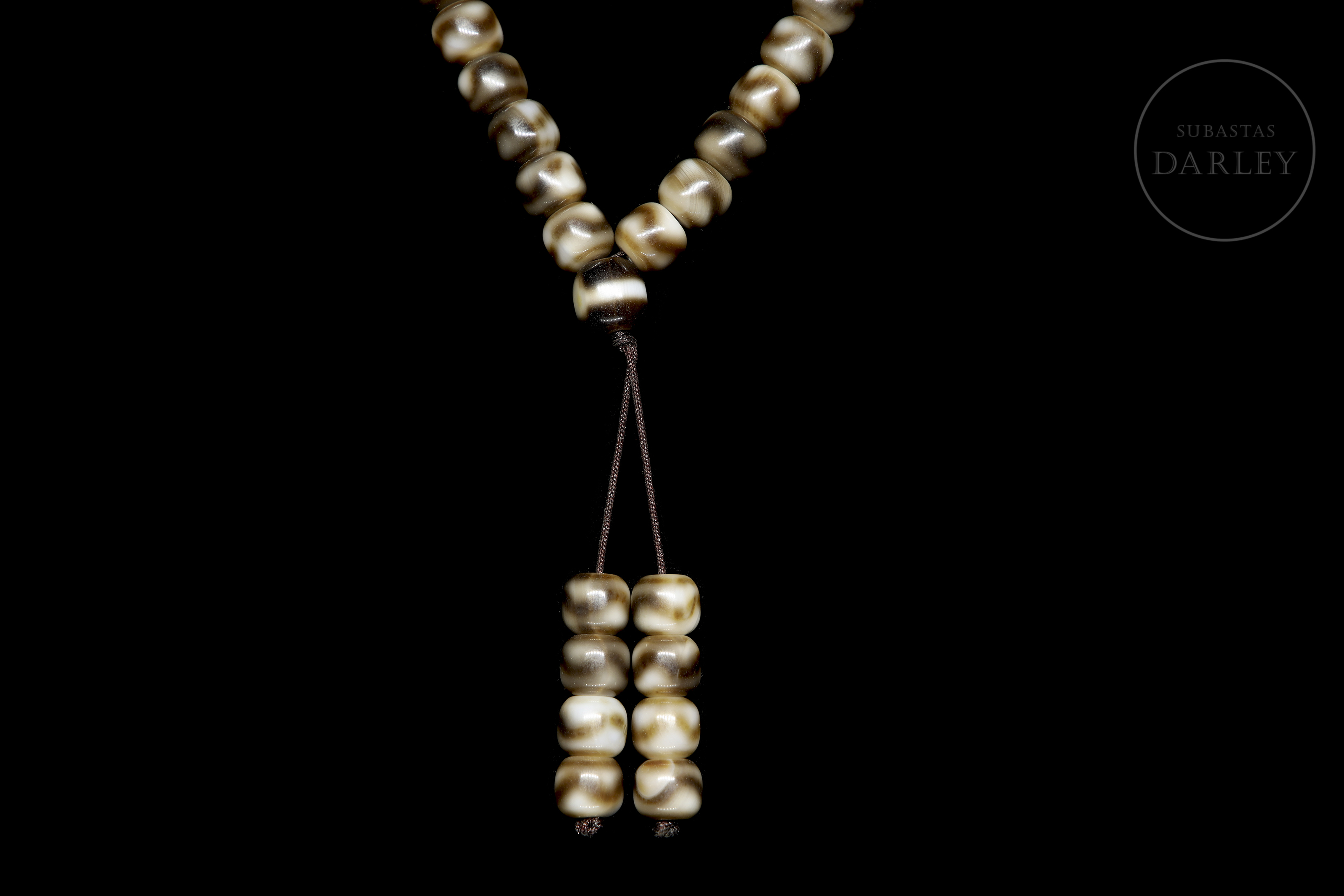 Mala necklace composed of multiple agate beads in shades of brown and beige, with natural veins that create a marbled effect and a satin sheen. The slightly domed cylindrical beads are arranged on a continuous cord with two tassels formed by groups of beads as a pendant at the end.