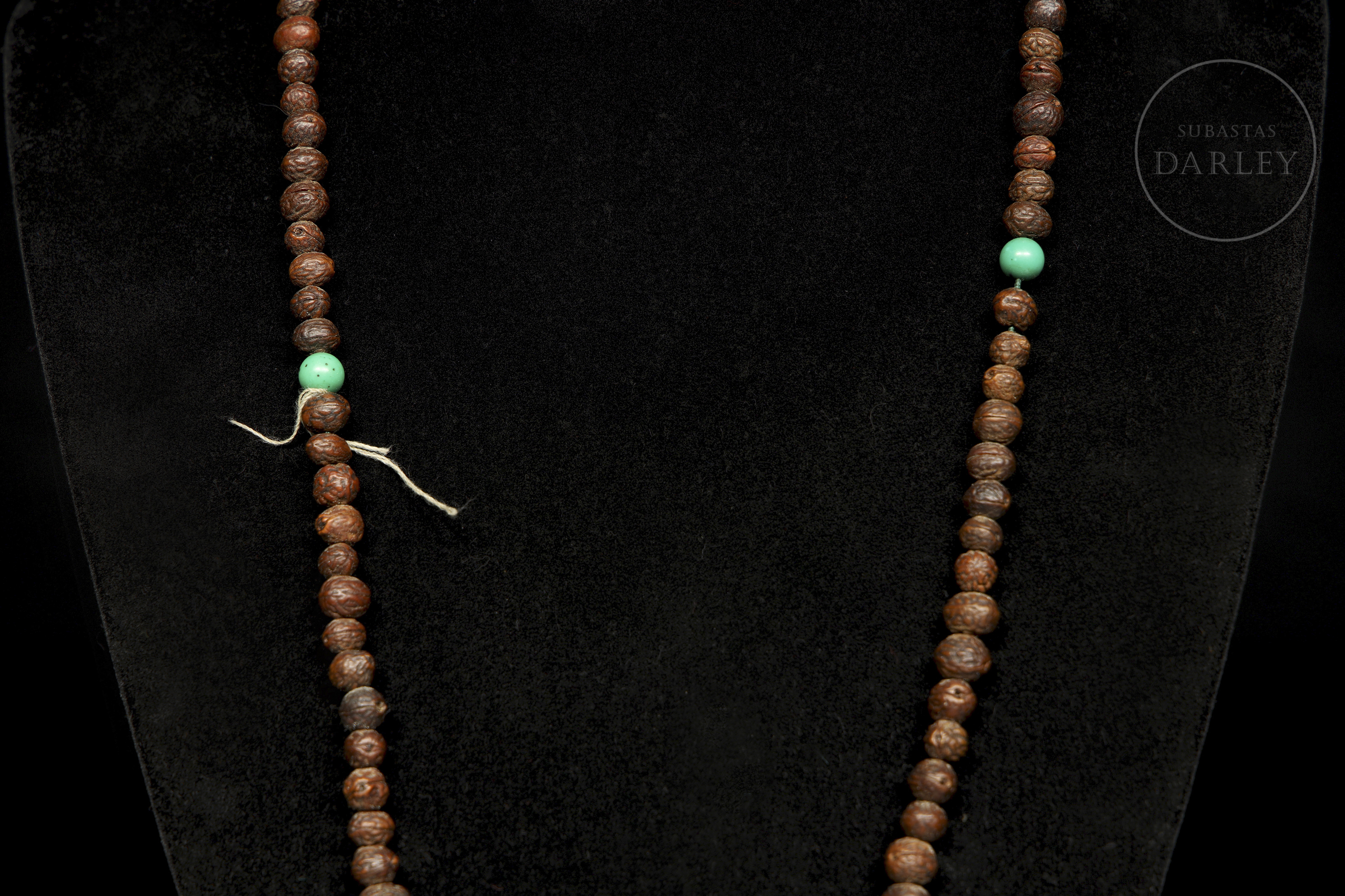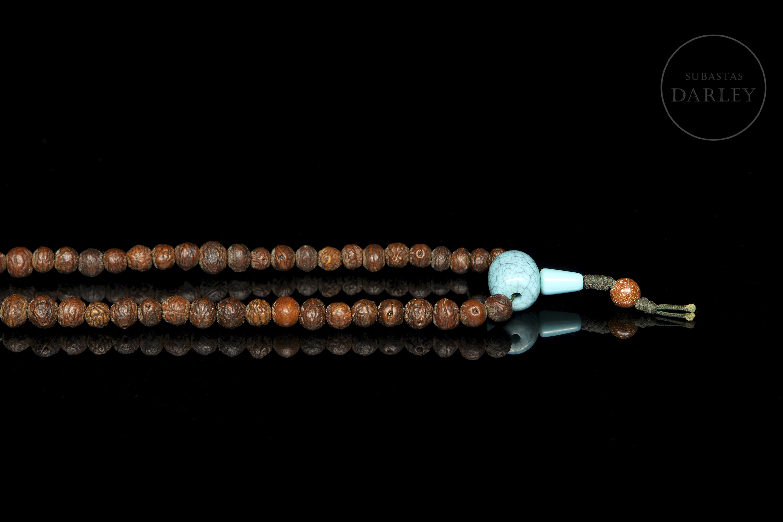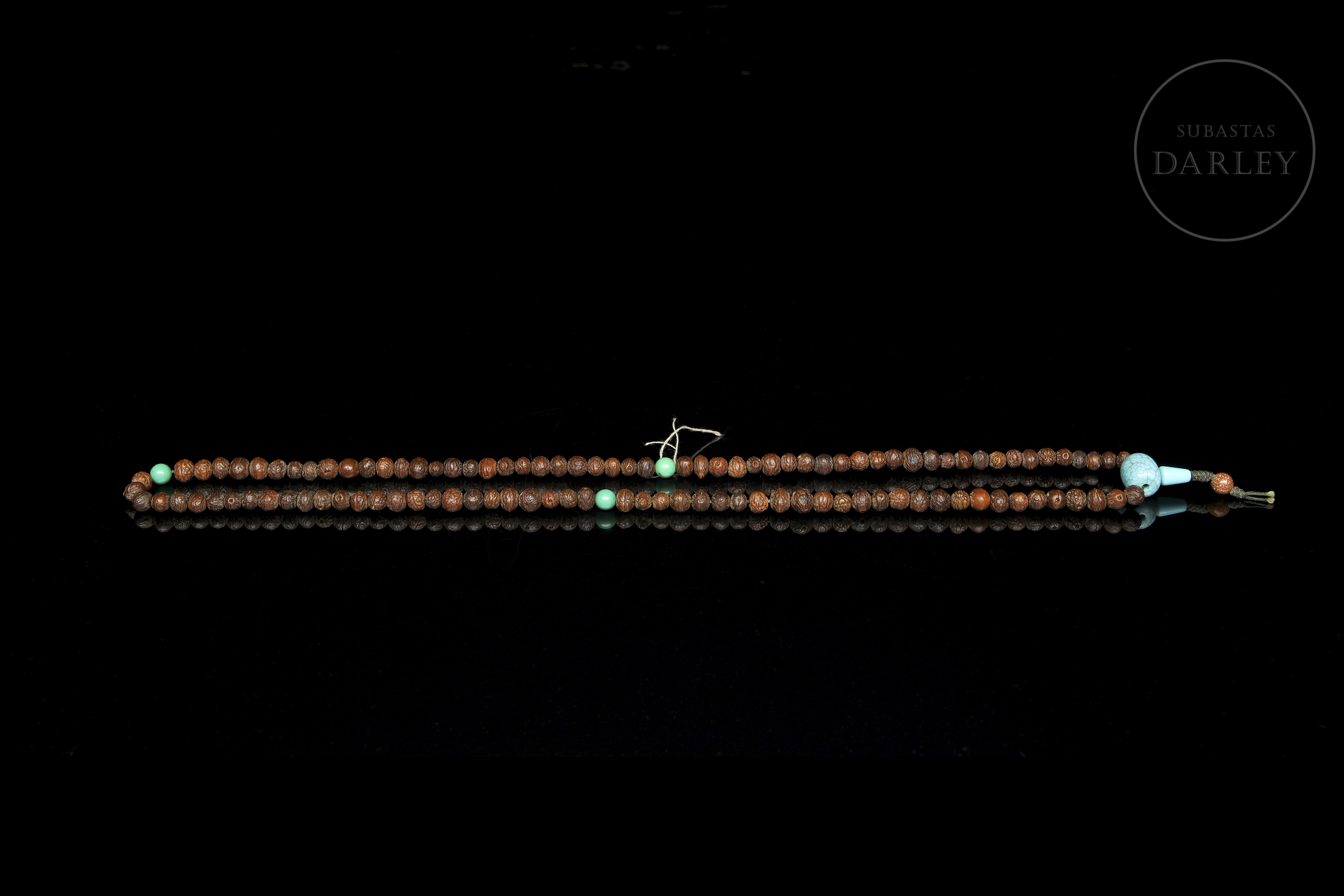 One hundred and eight spherical Bodhi seed beads, accompanied by five decorative stone beads in shades of green and turquoise blue. This type of mala is traditionally used in Buddhist spiritual practice for reciting mantras.