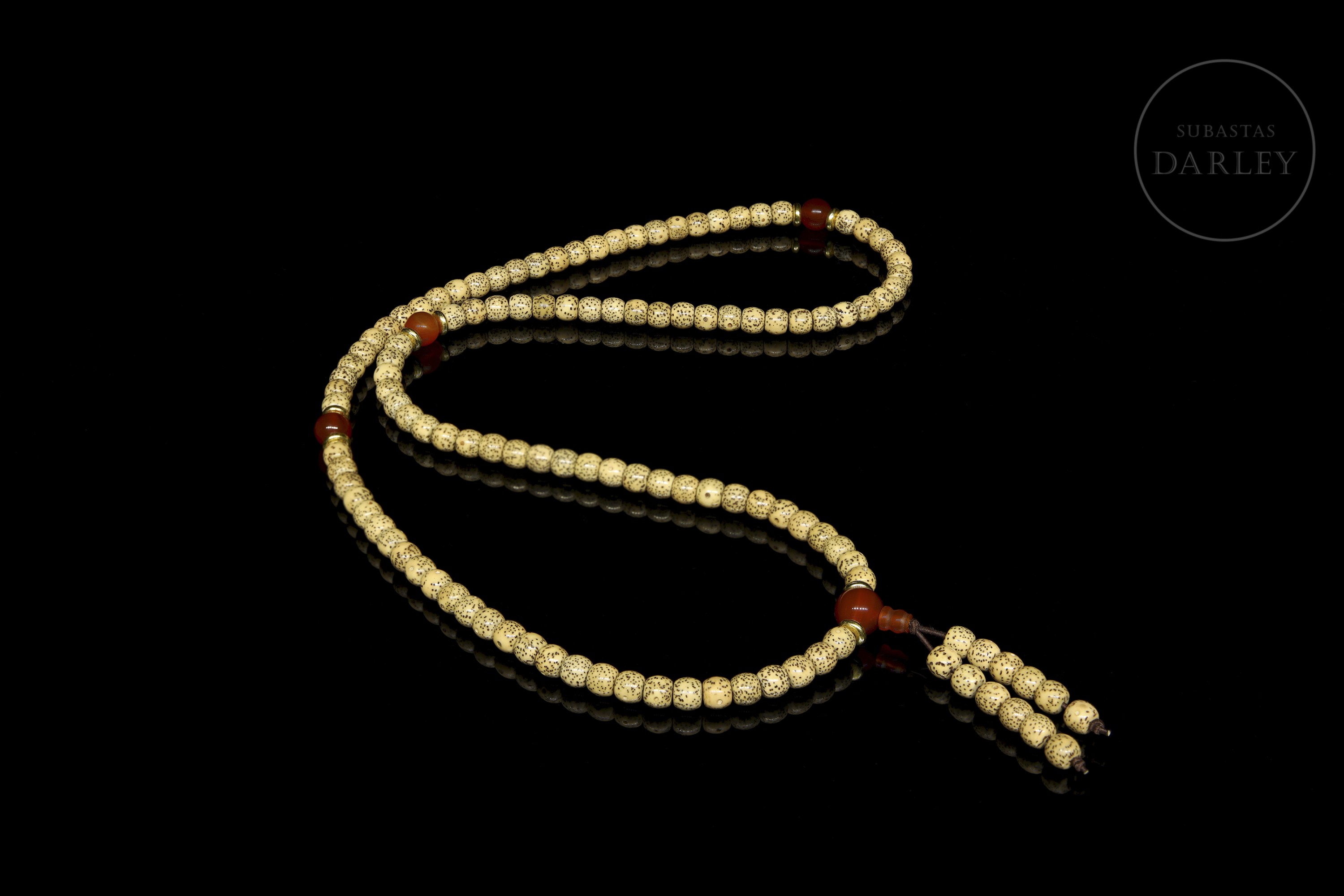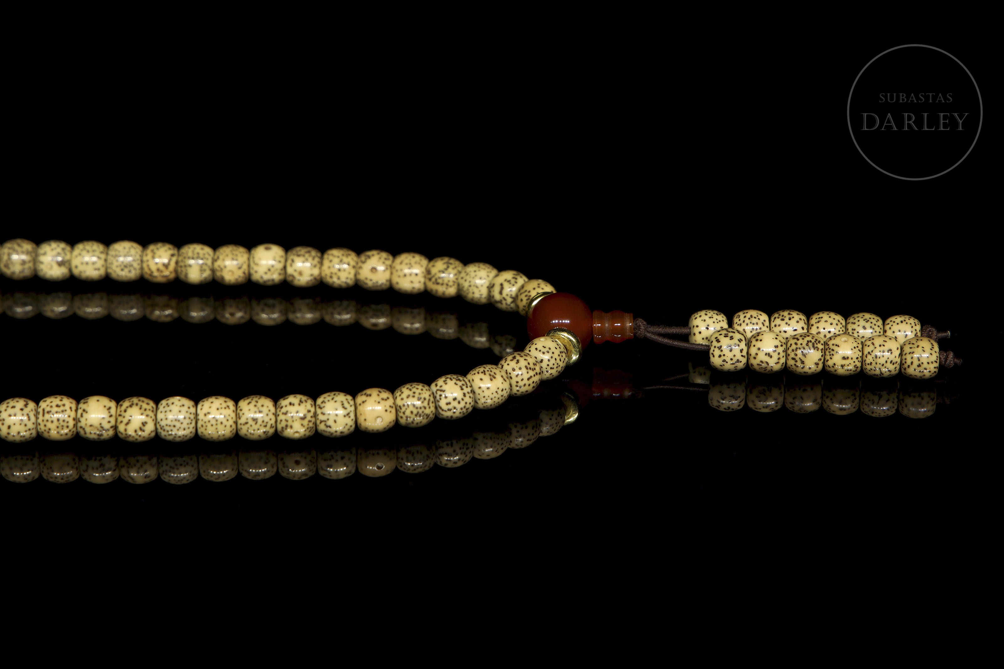 Prayer necklace or ‘mala’ composed of 125 beads, 120 of which are natural speckled seed beads and 5 are reddish agate beads. The set is assembled with a short two-row tassel finish.